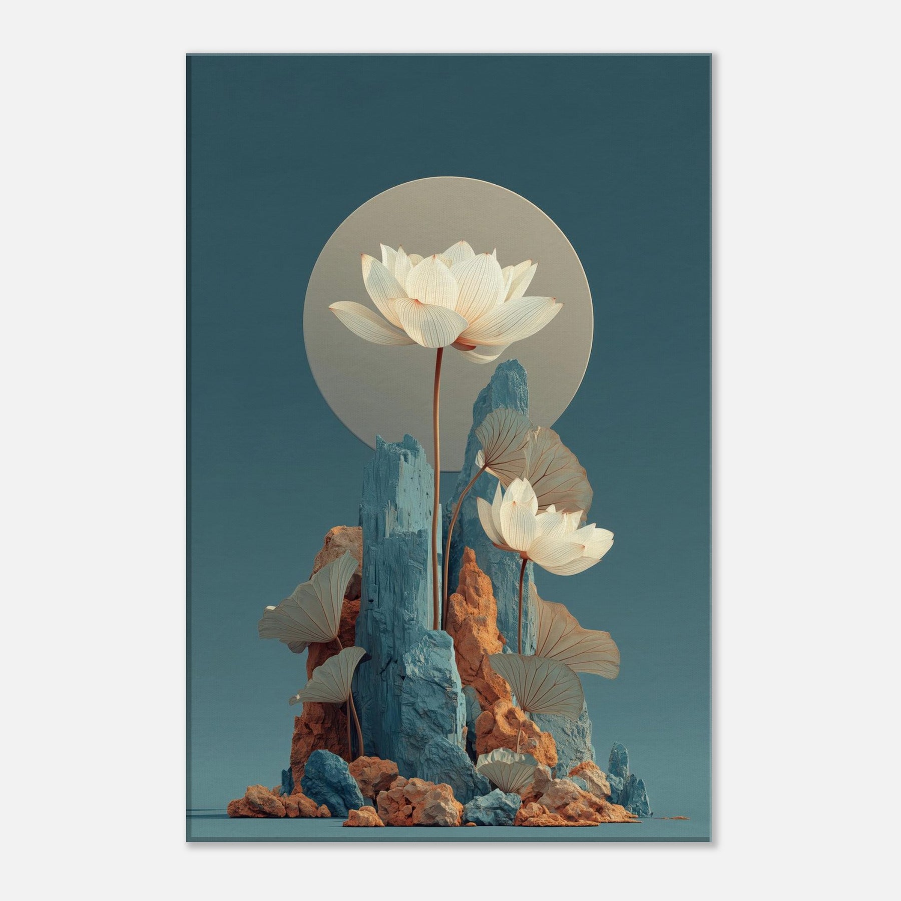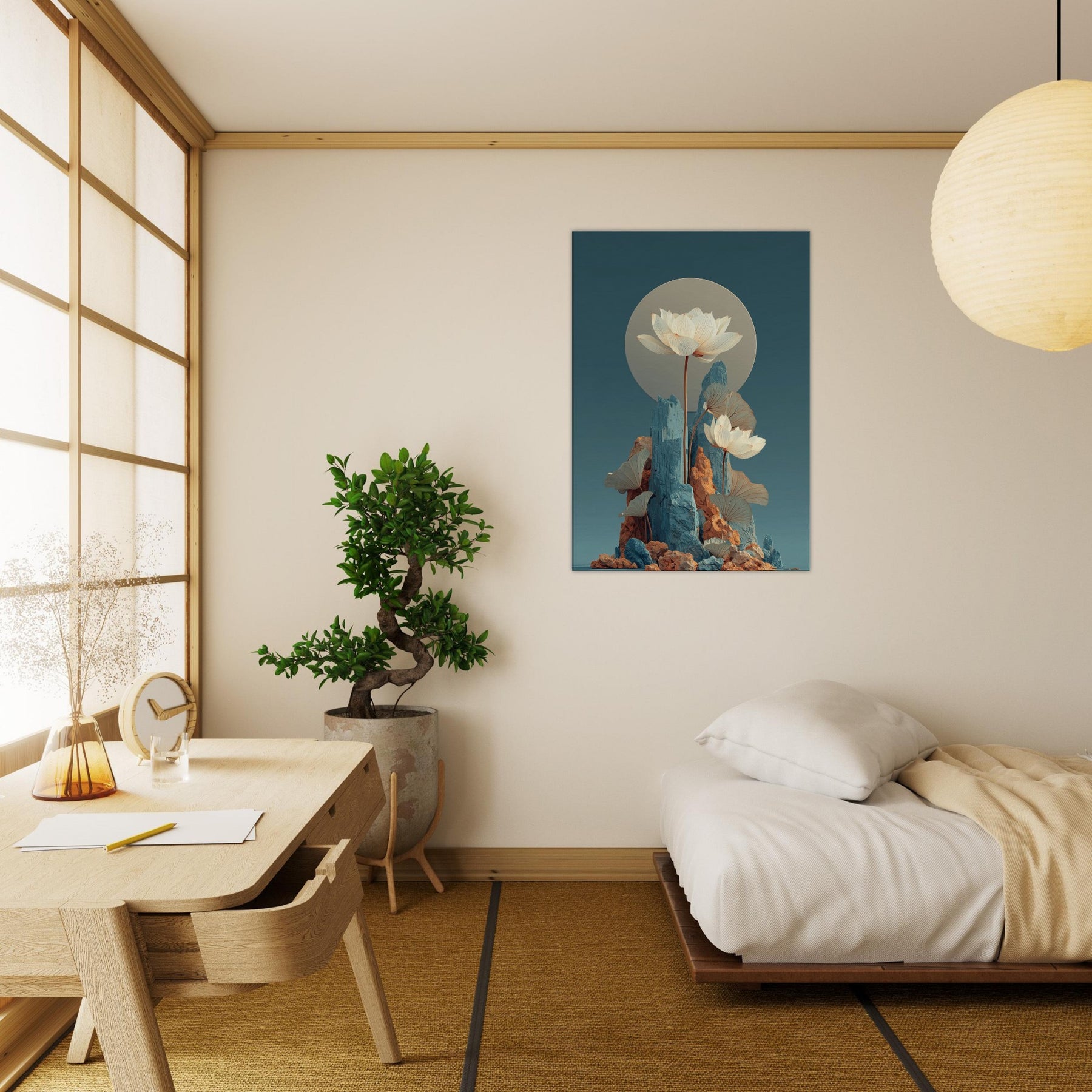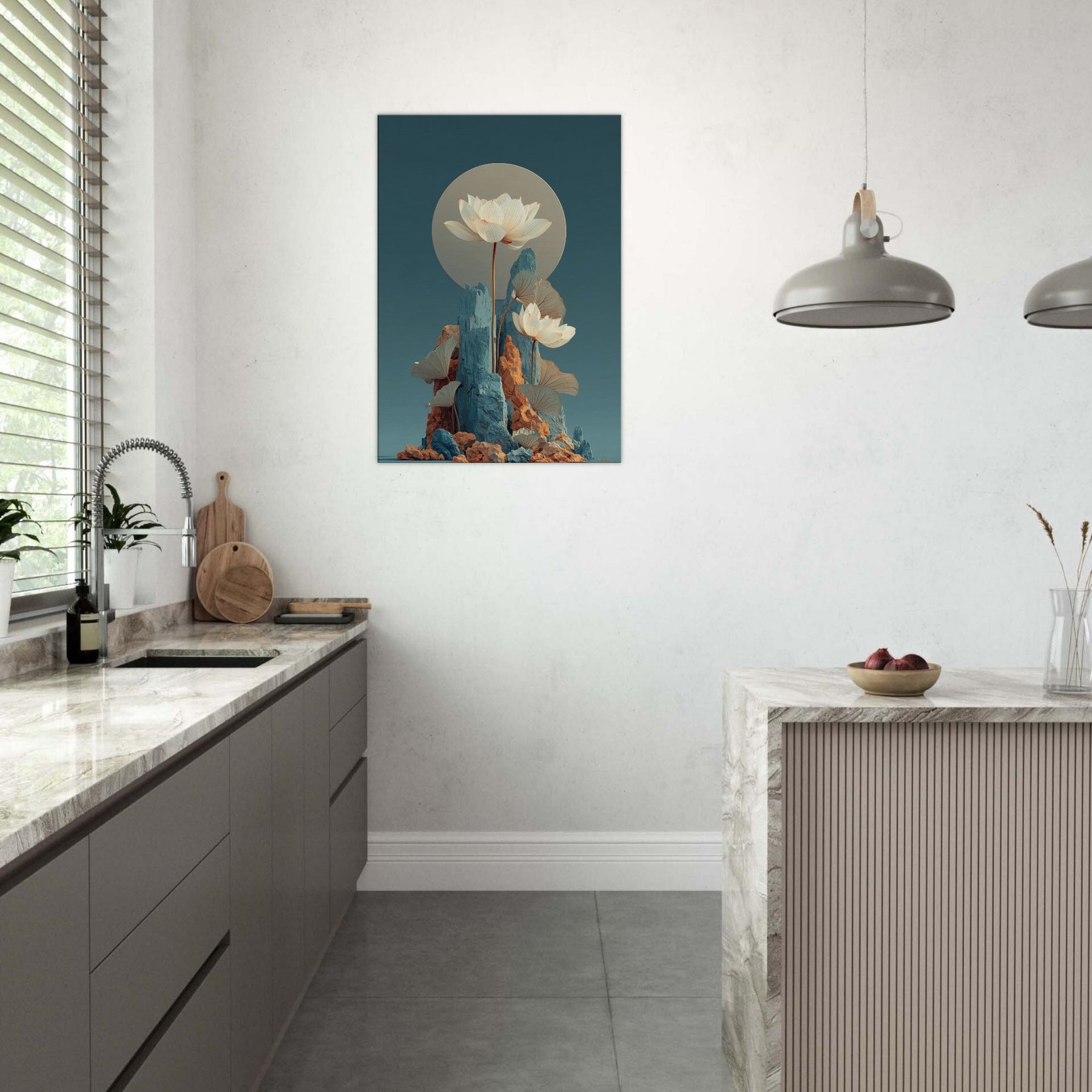 Against a tranquil horizon, the Lotus rises as the Primary Subject, unfurling its pale petals amid sculpted cliffs bathed in lunar light. Surreal rock spires loom in blue and coral, while a soft halo circles behind, casting a dreamlike glow over the scene. The Lotus exudes quiet grace, inviting stillness and reflection. This nature driven image brings a timeless, otherworldly atmosphere to a living room, enriching walls with fragrance of calm, balance, and imaginative depth.