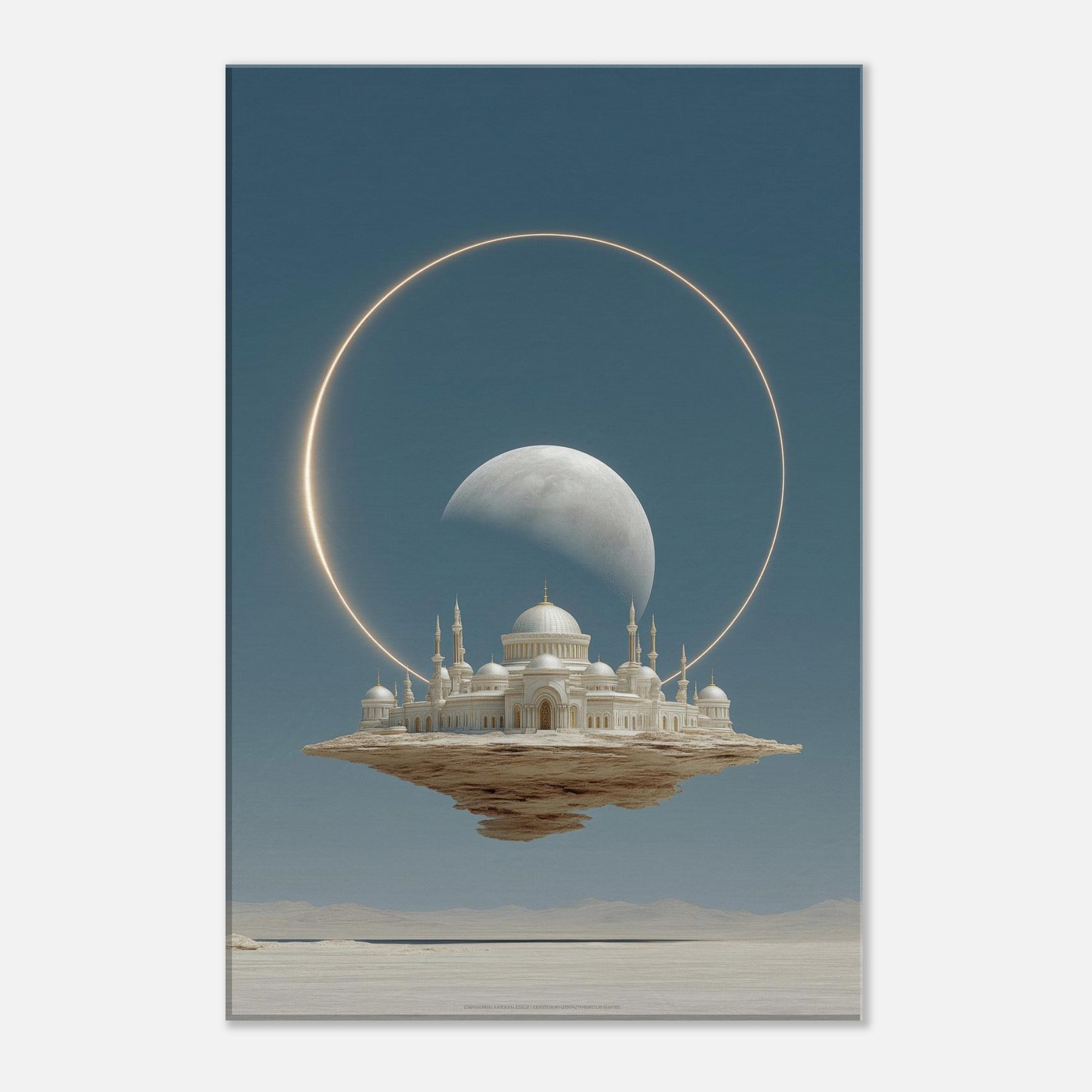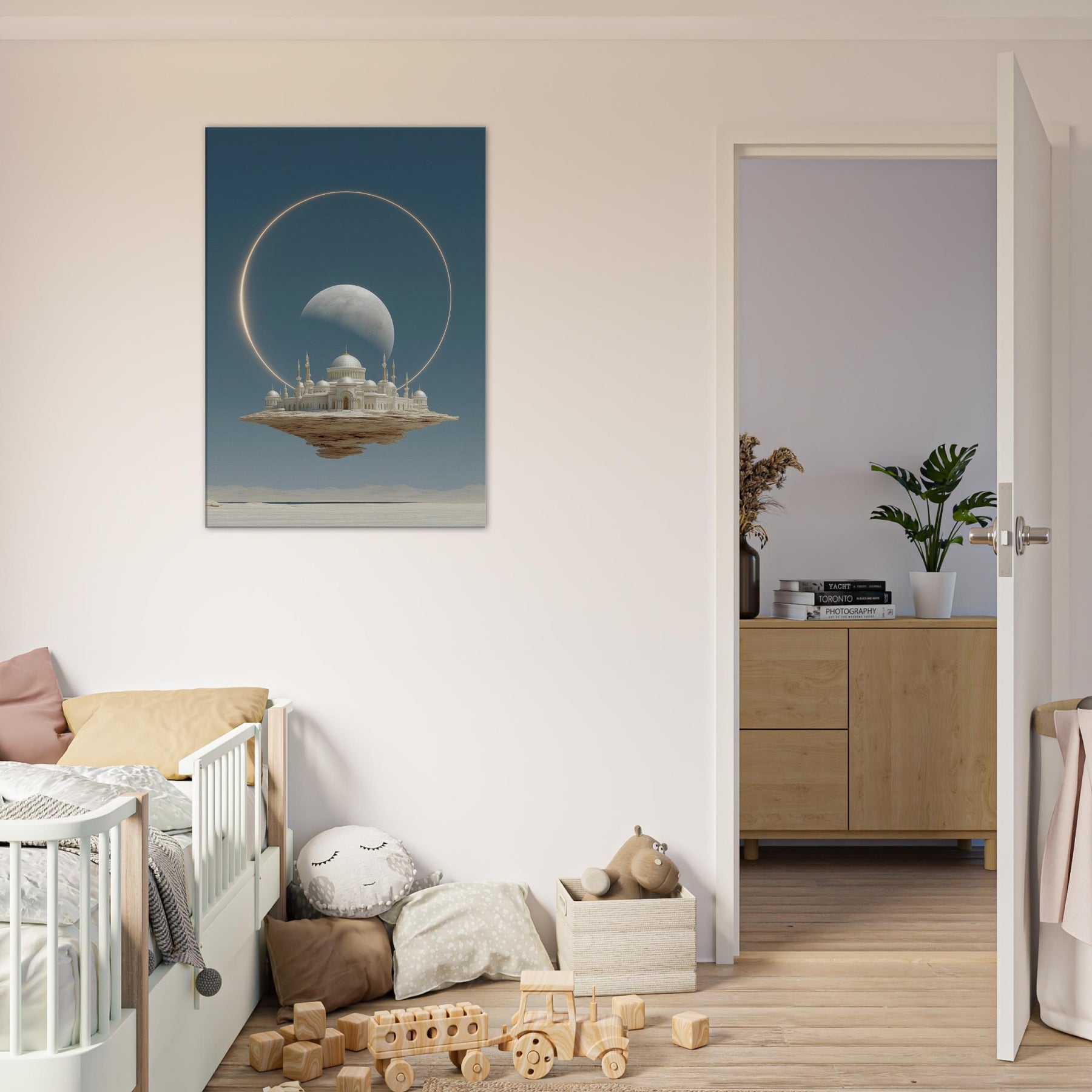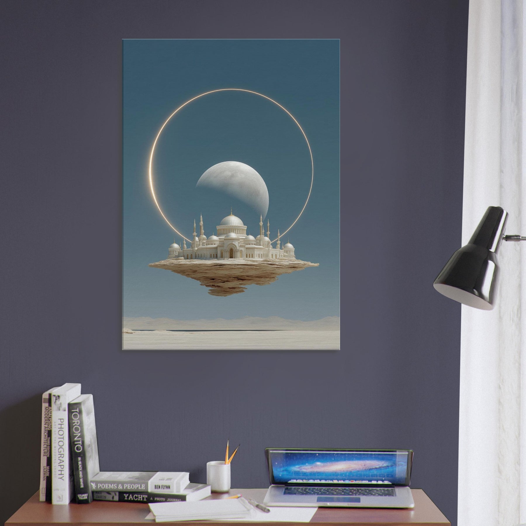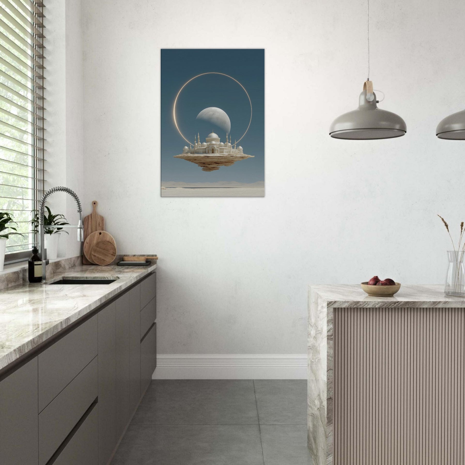 Let the Constellations descend into your living room with this moonlit surreal tableau. A pristine, cupolaed sanctuary rises on a solitary cliff, encircled by a radiant ring that glows like a waking star. The hush of desert air and the cool, marble bright surfaces invite calm reflection; it’s a moment where night textures become sculpture. Hang it to slow time, to deepen conversations, and to lend your space a mystical brightness that moves with the light through day and night.