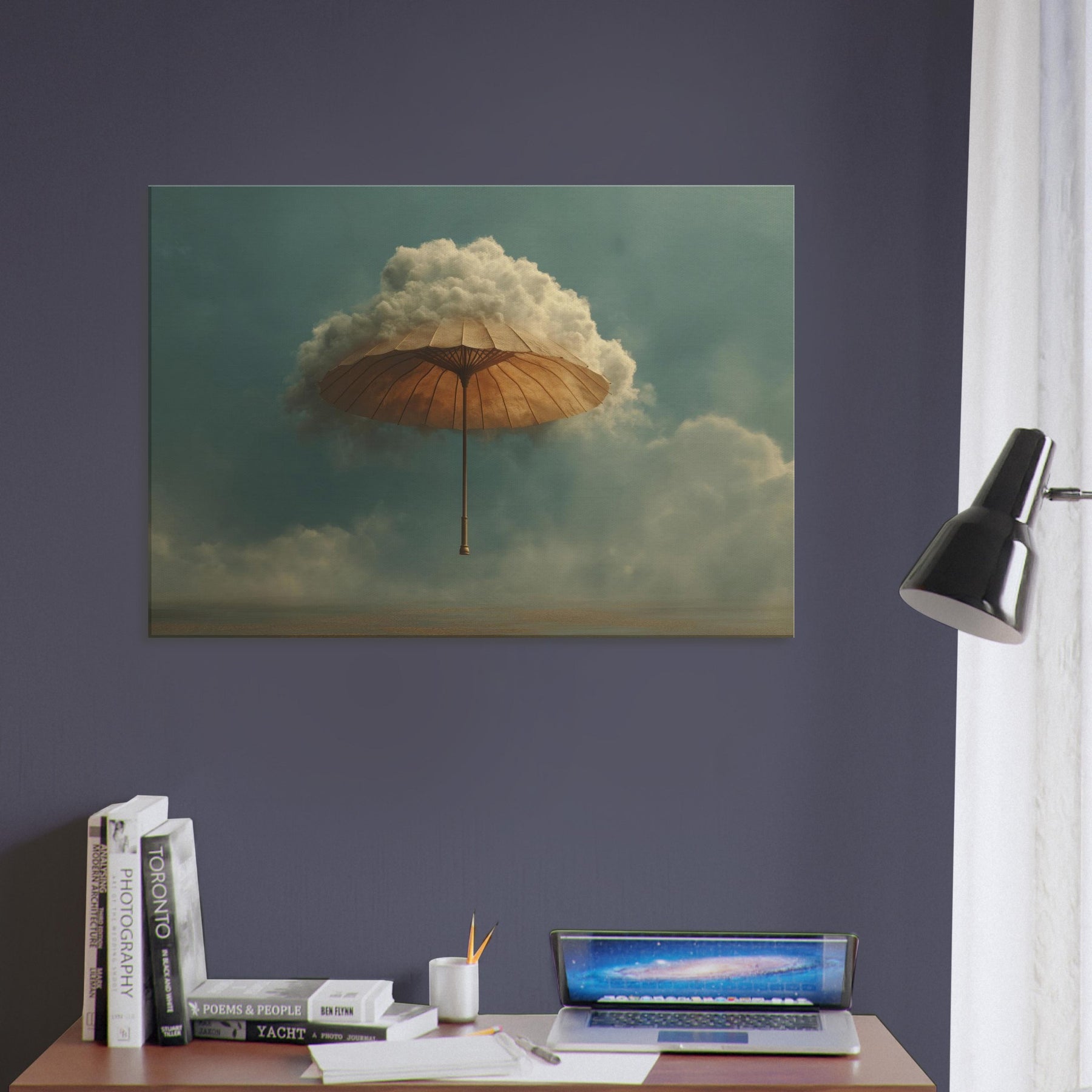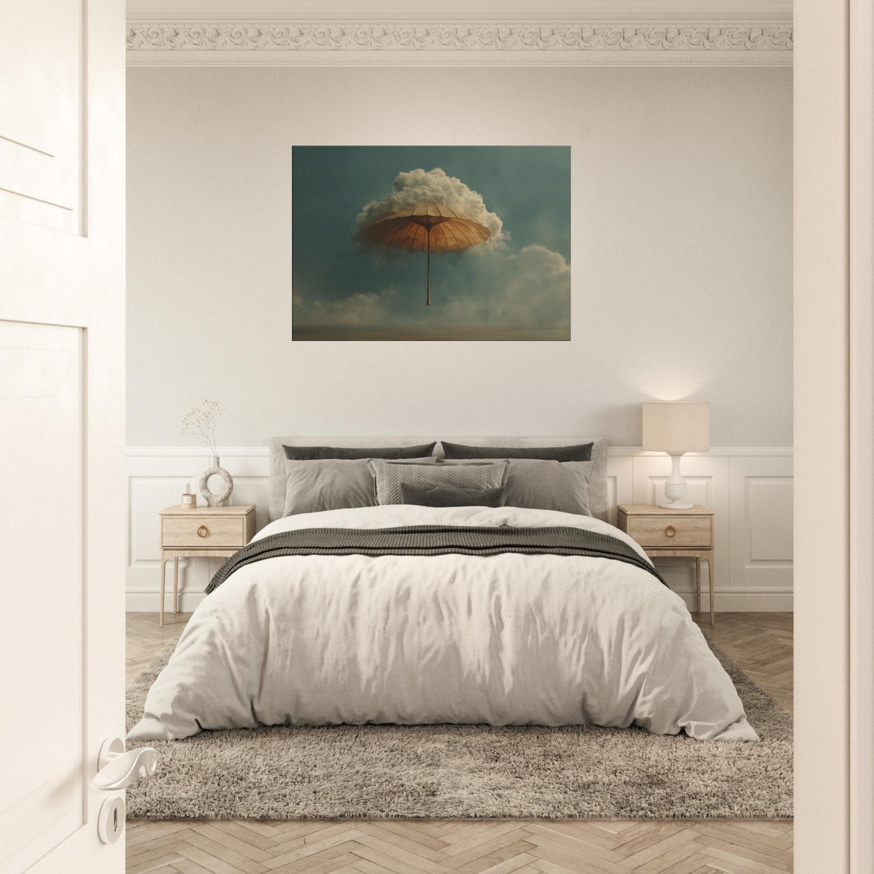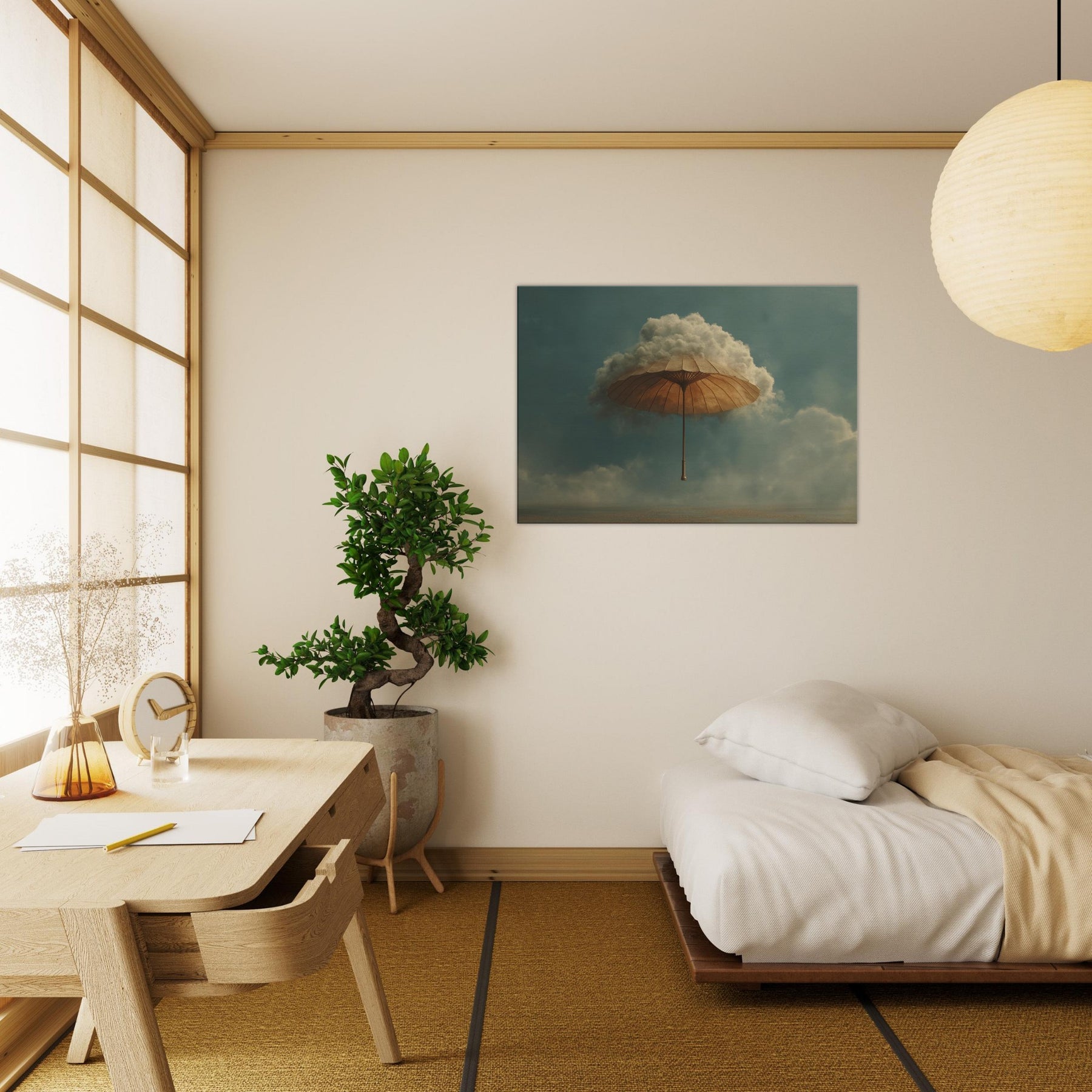 A dreamlike drift of a Paper Umbrella suspended in a turquoise sky, this surreal composition invites you to listen to the quiet hum of possibility. The umbrella becomes a tether between ground and dream, its warm ribs glowing against the soft clouds. In a living room, it anchors a conversation between whimsy and calm, casting gentle, contemplative shadows and lending a sense of limitless space. A refined, calming accent that elevates both everyday solace and imaginative moments.