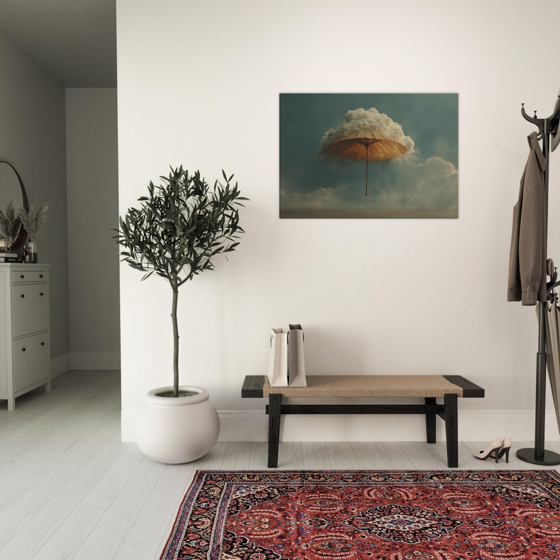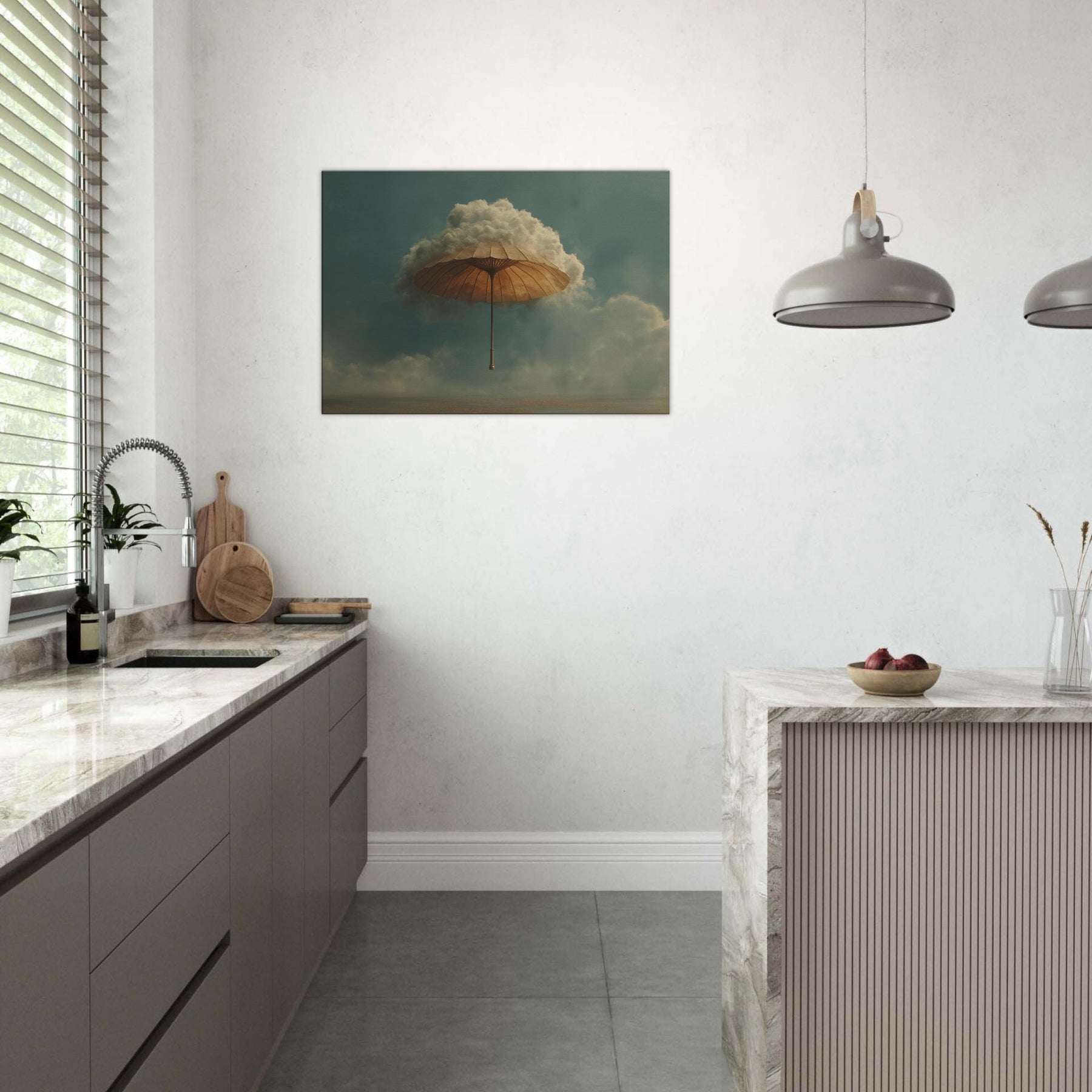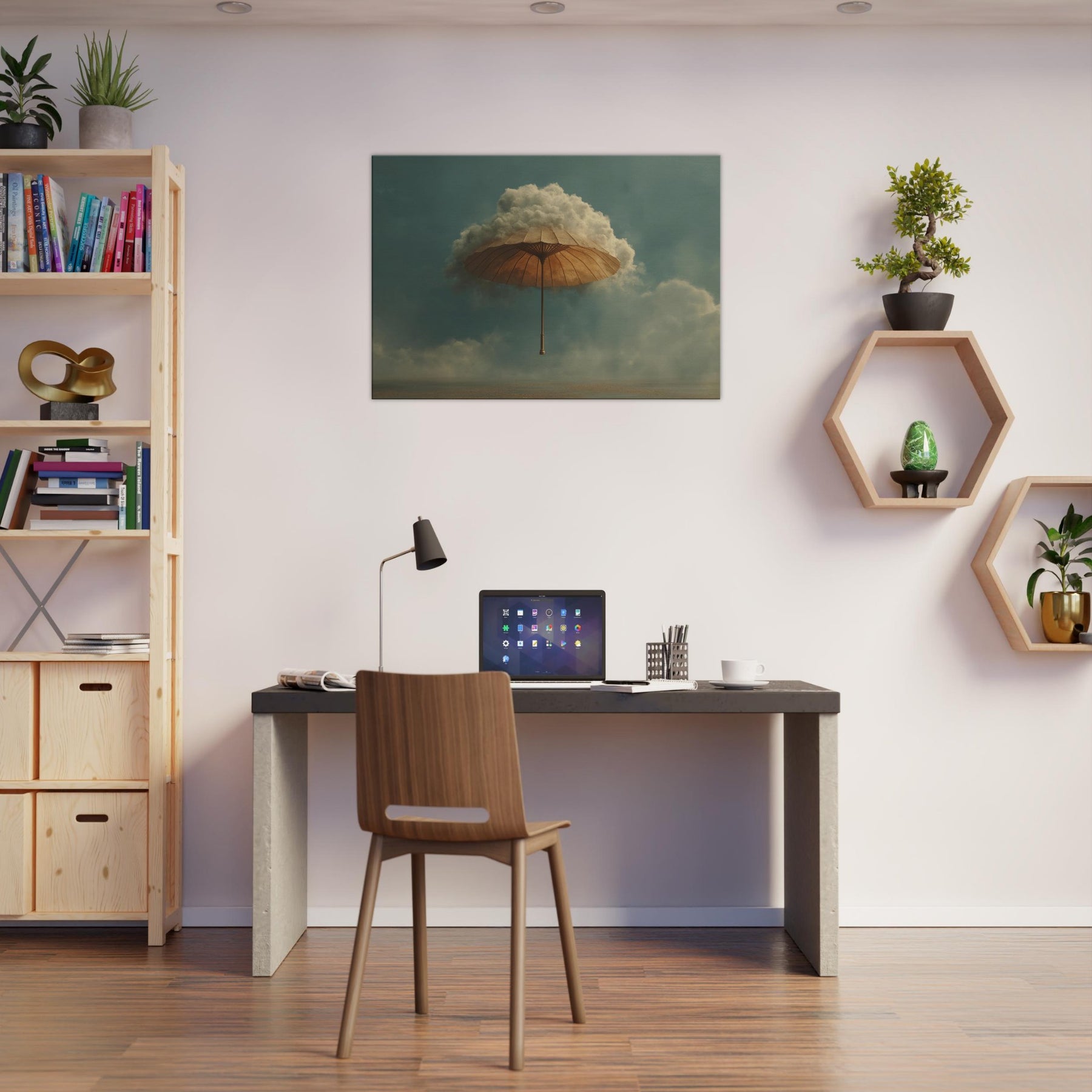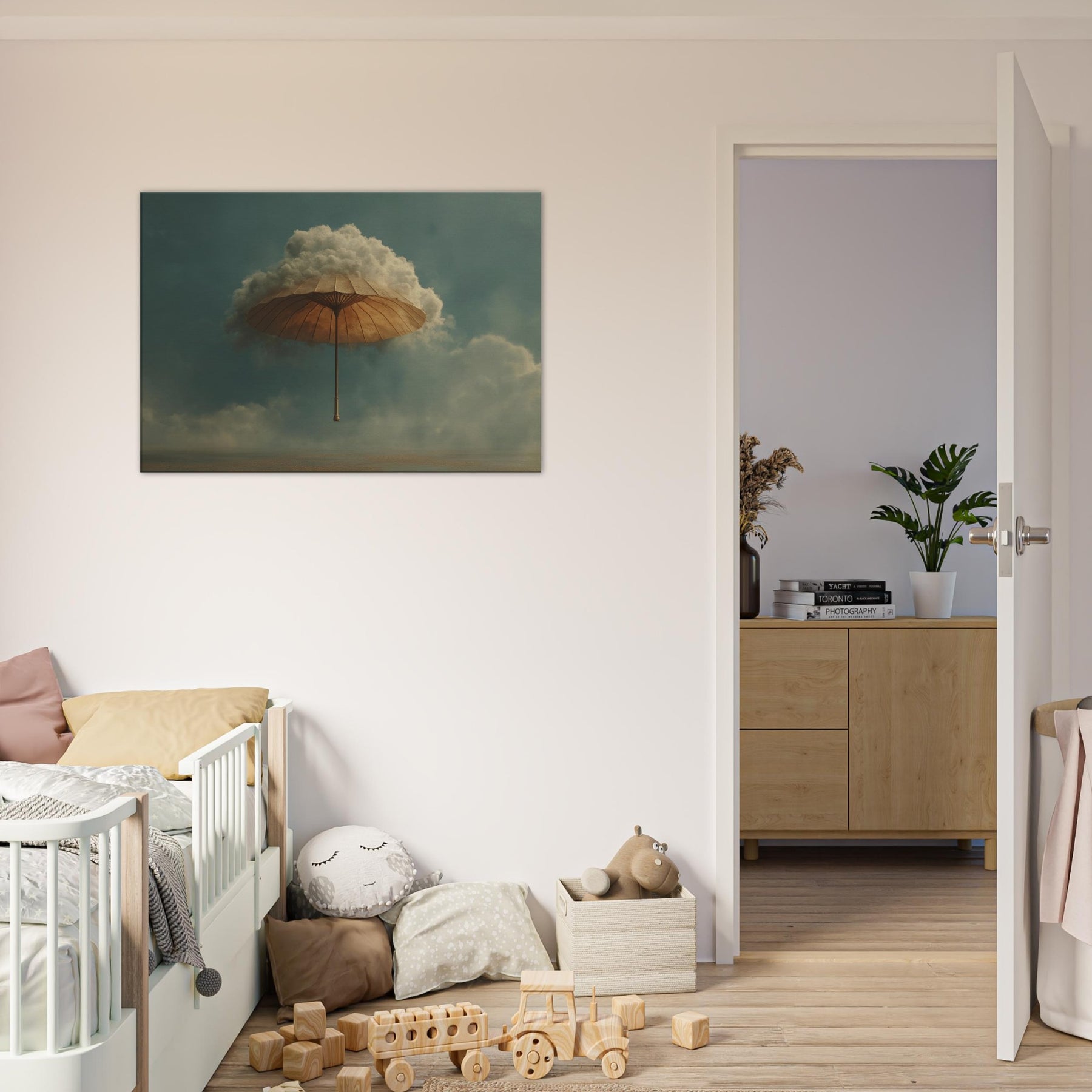 A dreamlike drift of a Paper Umbrella suspended in a turquoise sky, this surreal composition invites you to listen to the quiet hum of possibility. The umbrella becomes a tether between ground and dream, its warm ribs glowing against the soft clouds. In a living room, it anchors a conversation between whimsy and calm, casting gentle, contemplative shadows and lending a sense of limitless space. A refined, calming accent that elevates both everyday solace and imaginative moments.