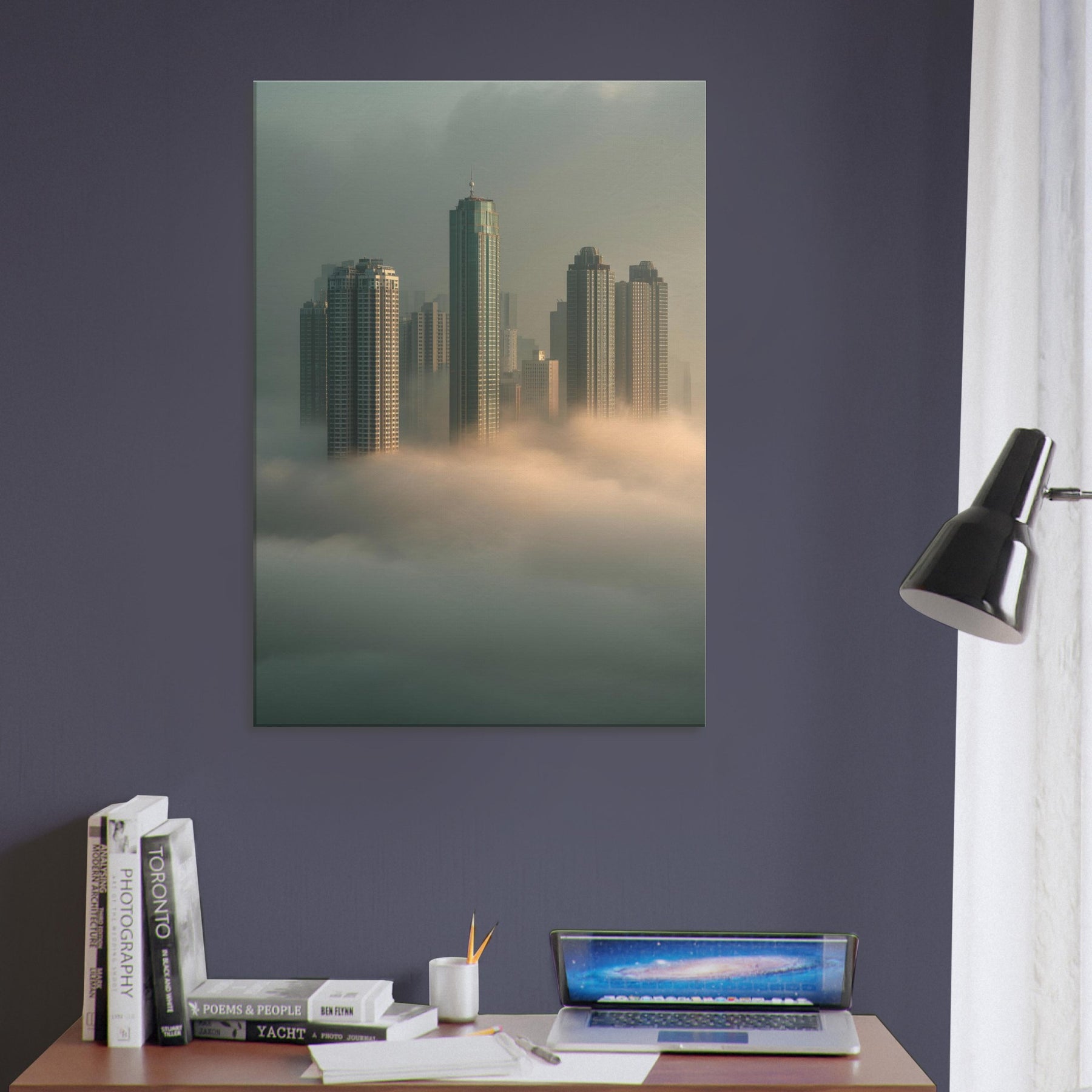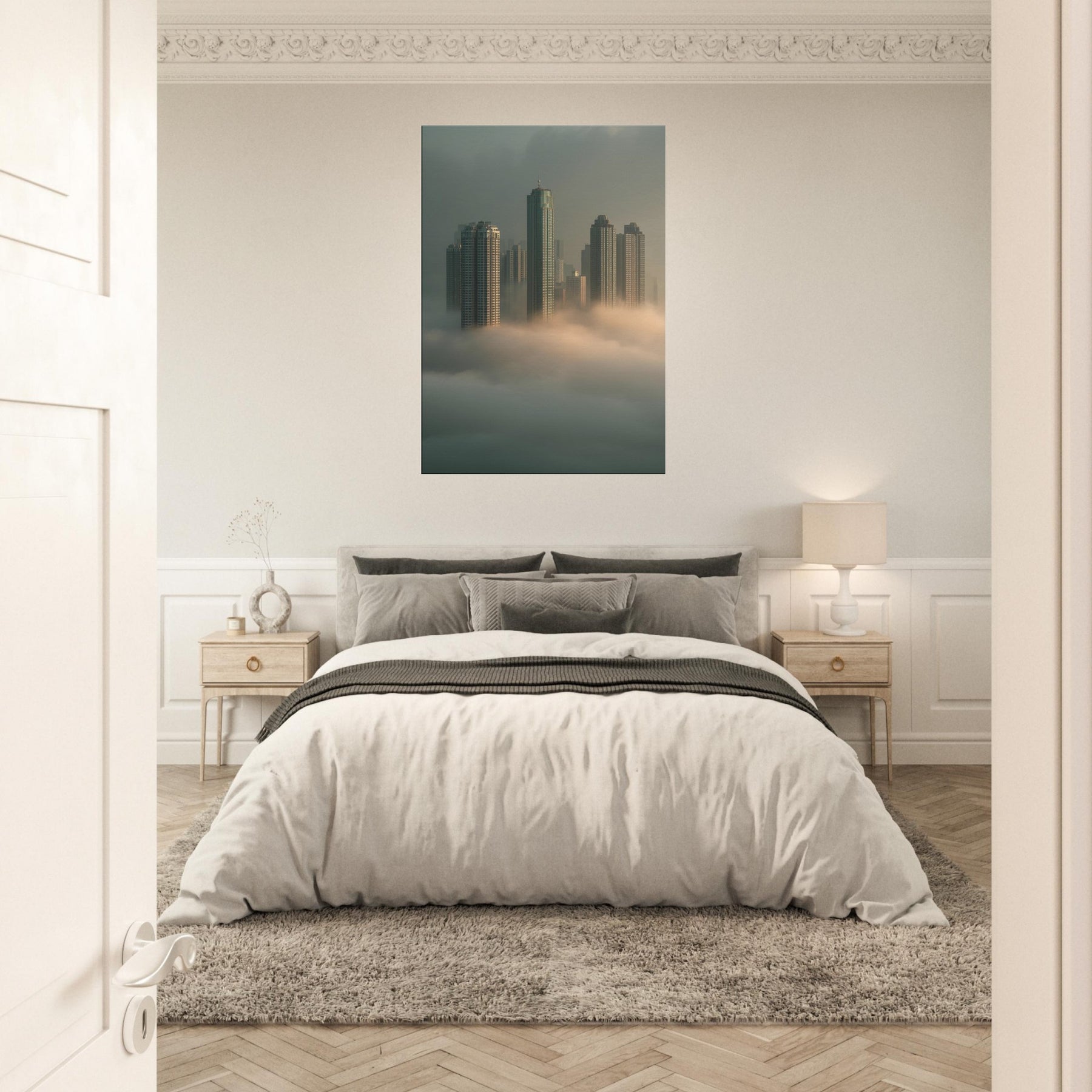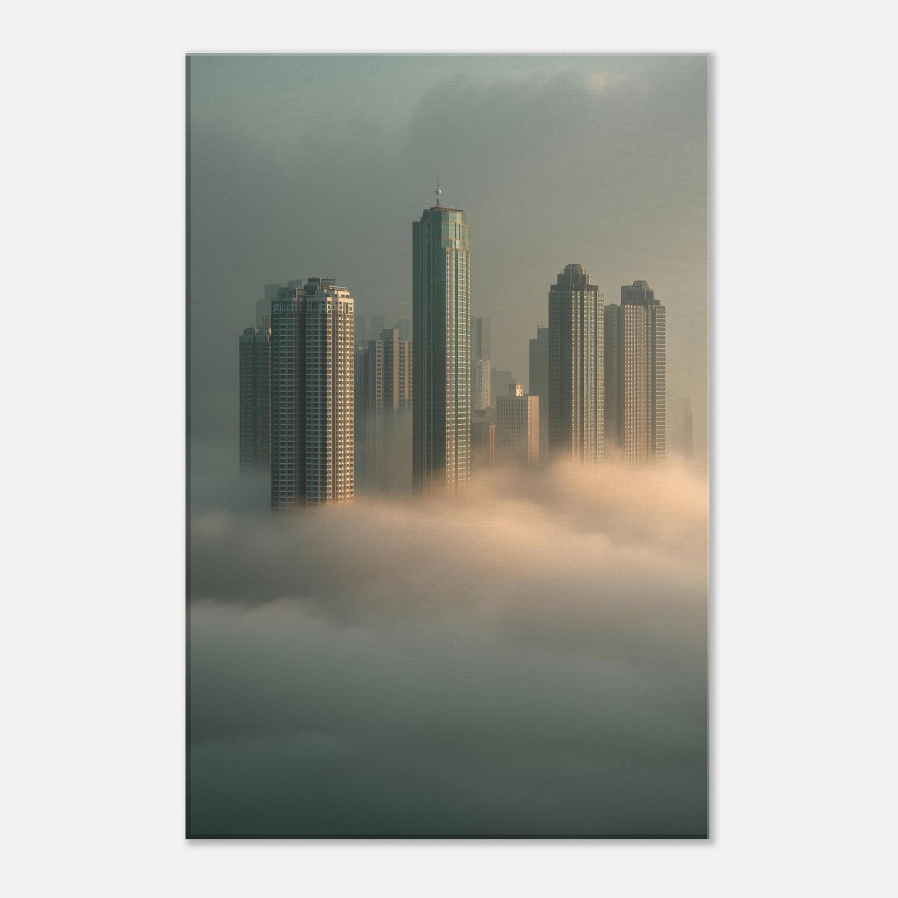 Let Hong Kong rise from sleep in a cathedral of fog, where glass and steel lean into dream. This surreal cityscape dissolves the line between cloud and skyline, inviting the observer into a quiet, meditative mood. Each tower threads light through mist like a memory you can walk through, making your living room feel expansive, intimate, and softly charged with possibility. A bold, poetic centerpiece that transforms any wall into a window on a floating metropolis.