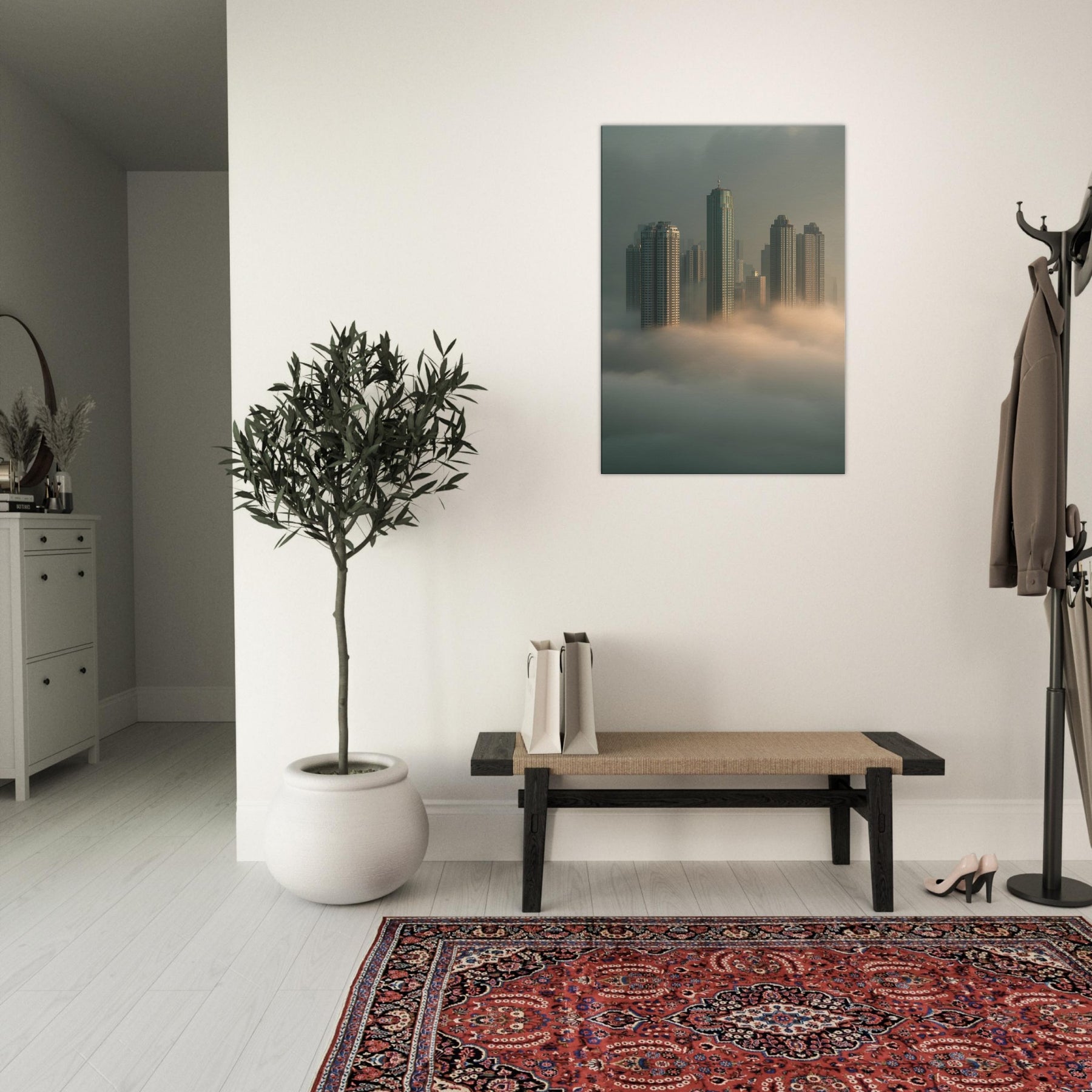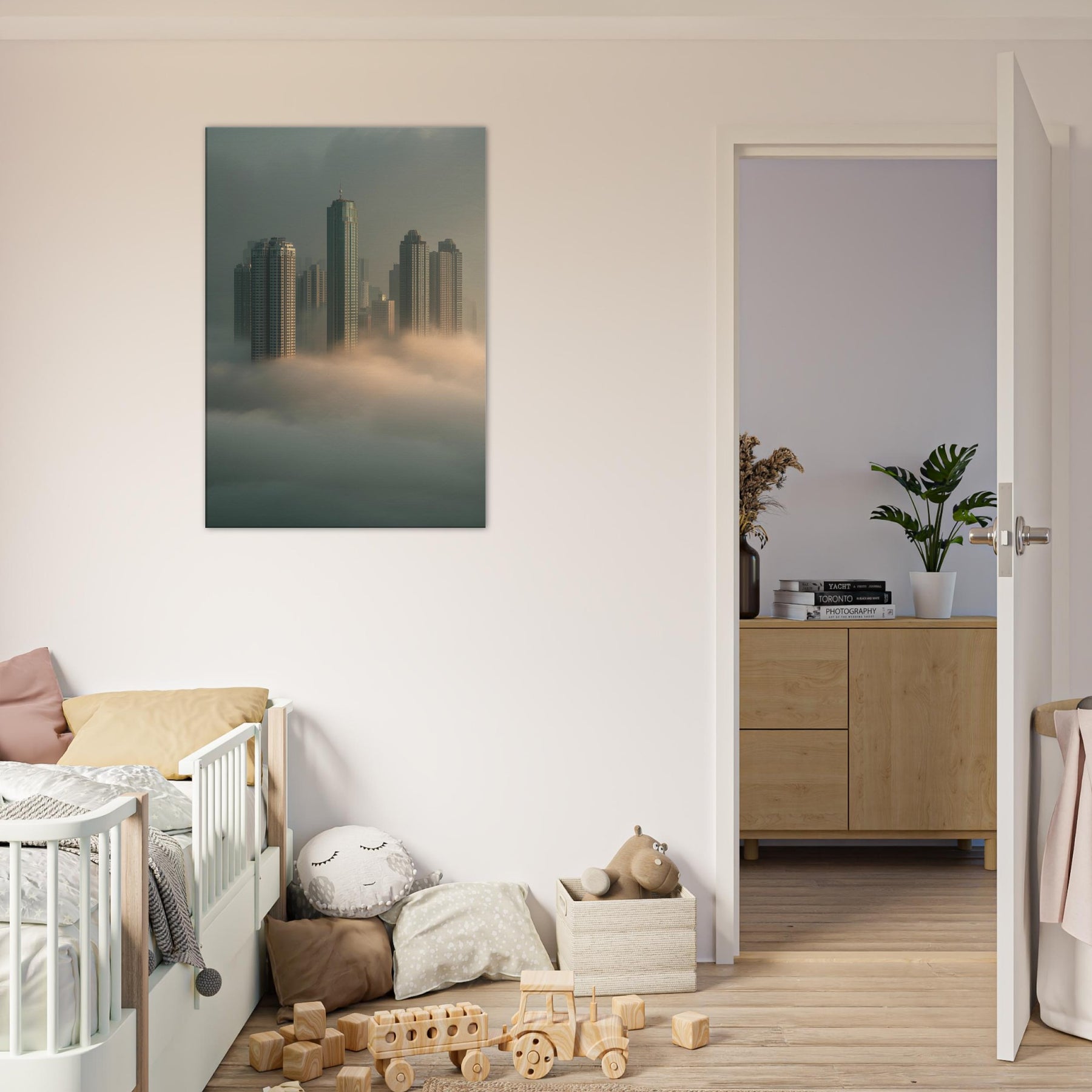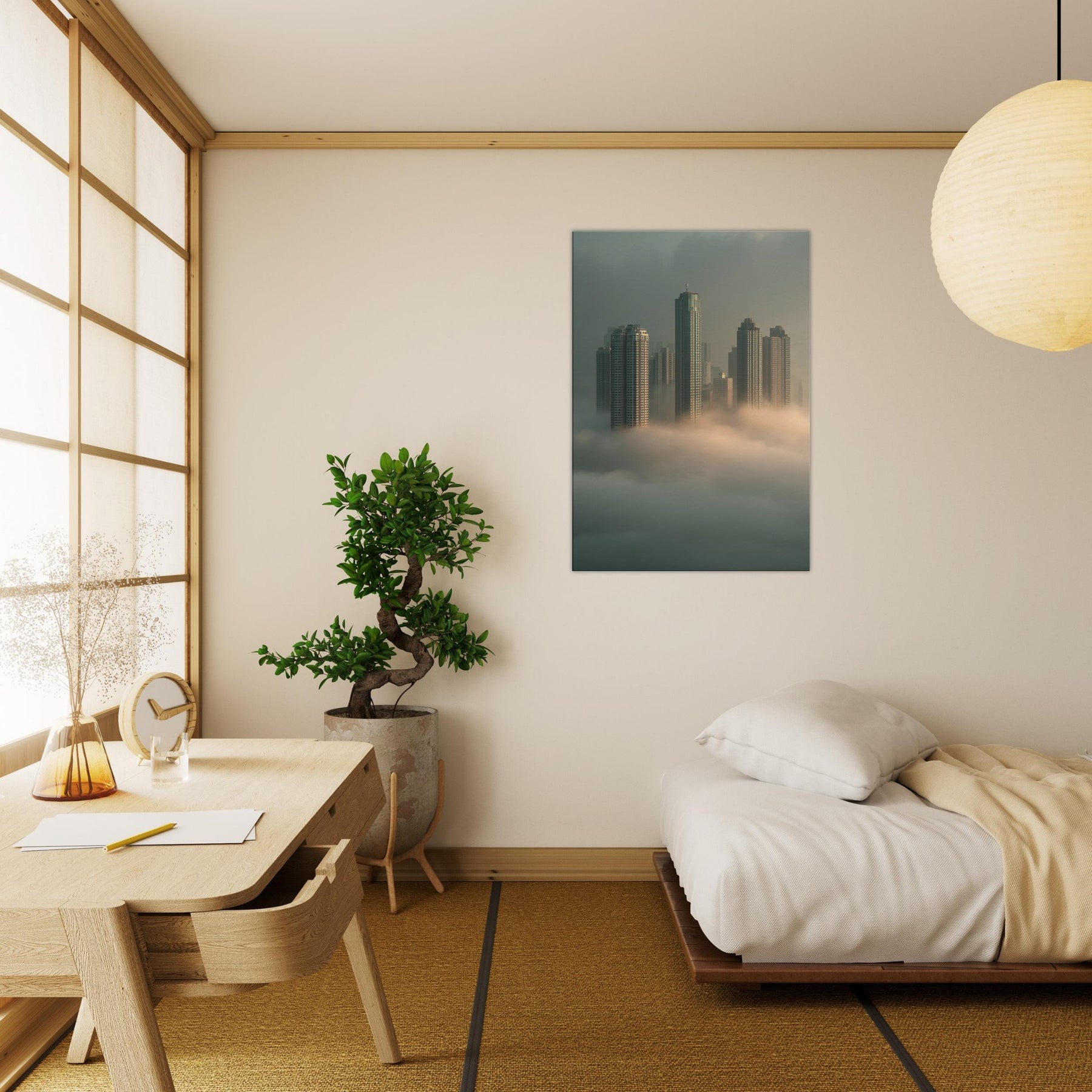 Let Hong Kong rise from sleep in a cathedral of fog, where glass and steel lean into dream. This surreal cityscape dissolves the line between cloud and skyline, inviting the observer into a quiet, meditative mood. Each tower threads light through mist like a memory you can walk through, making your living room feel expansive, intimate, and softly charged with possibility. A bold, poetic centerpiece that transforms any wall into a window on a floating metropolis.