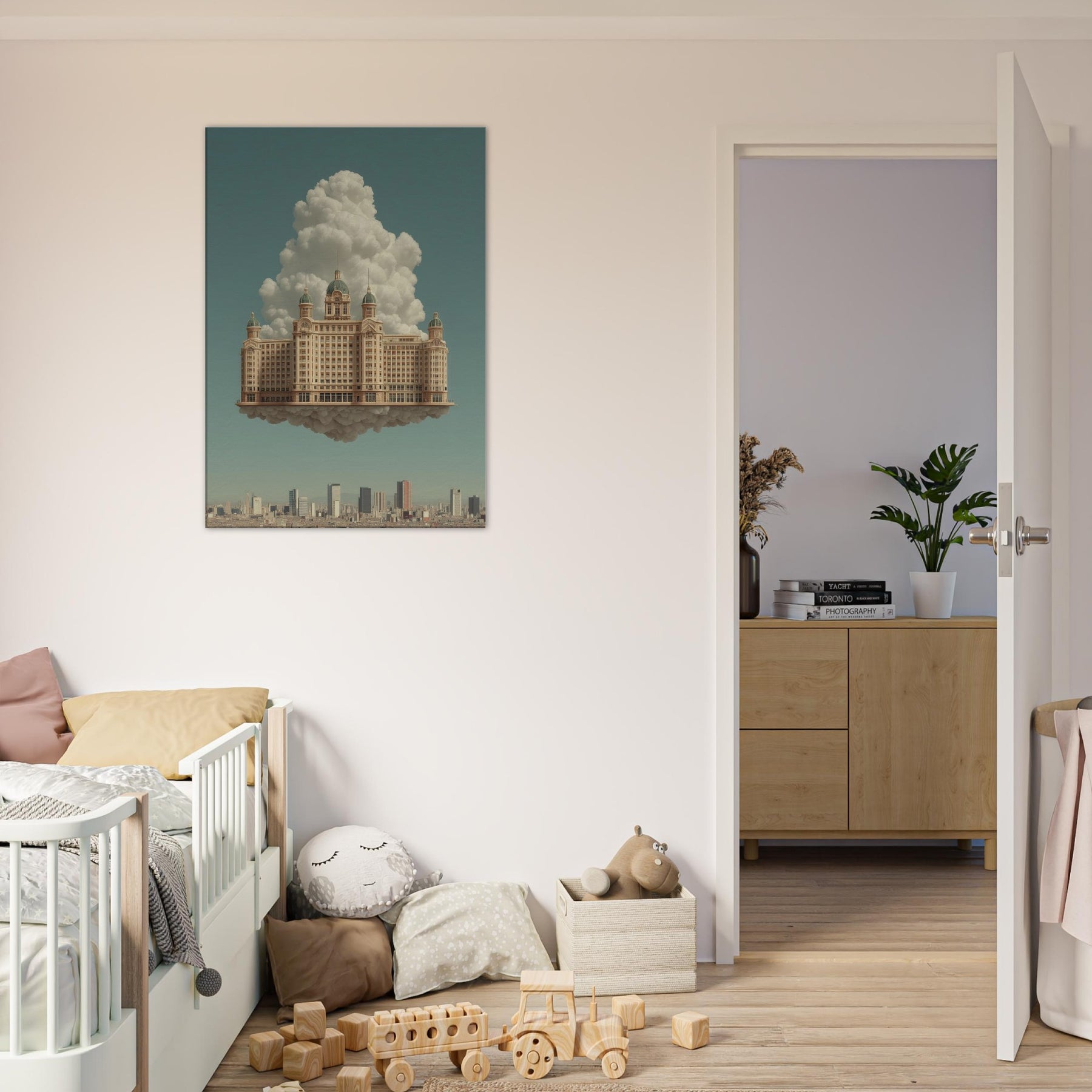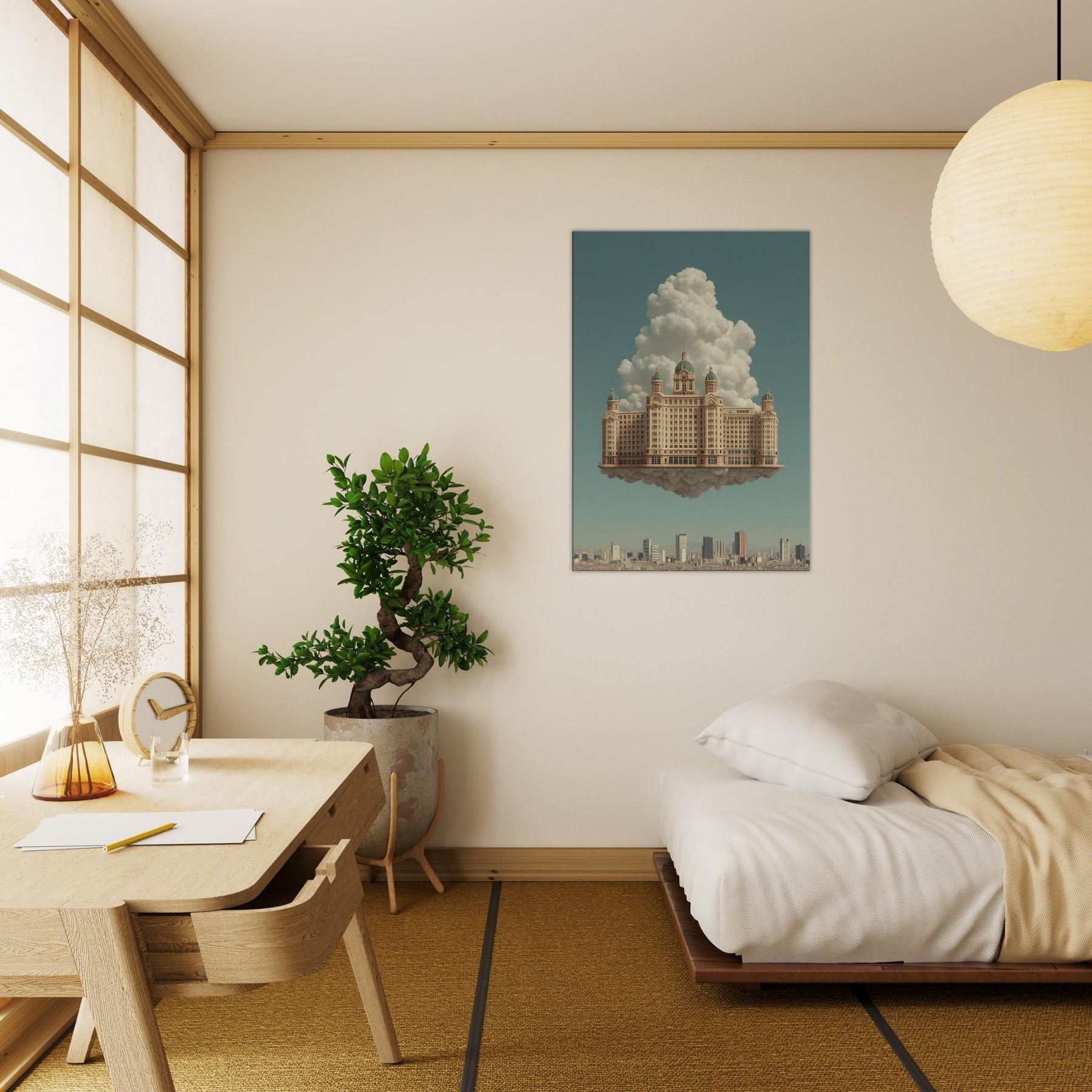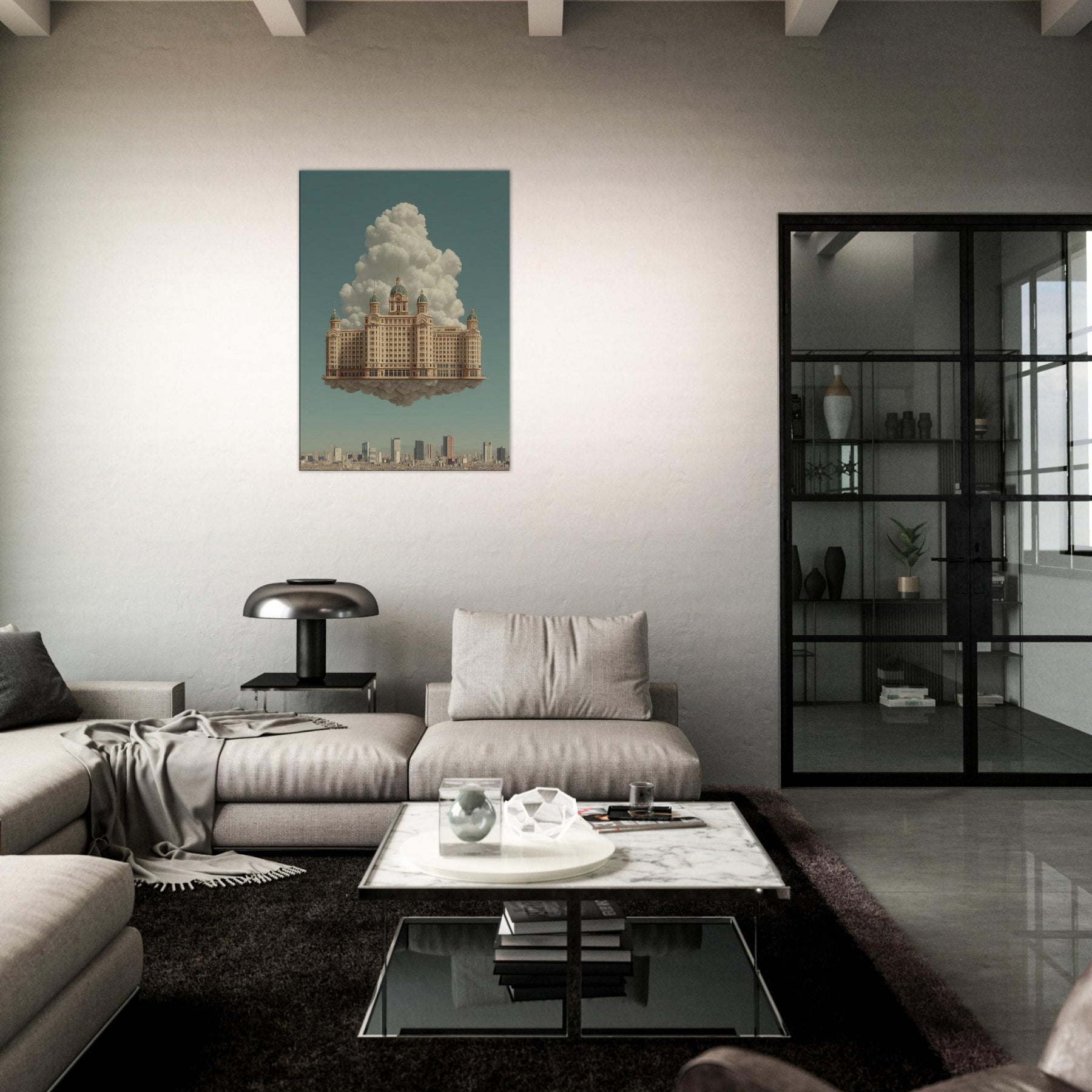An impossible palace hovers above the bustle of Mexico City, tethered to the sky by imagination. This surreal composition combines ornate grandeur with a modern urban horizon, soft sandstone tones, emerald domes, and cloud trails that cradle the skyline. The piece invites contemplative quiet in a living room or study, turning everyday walls into a window to wonder. Its dreamlike balance of scale and detail evokes memory and possibility, making space feel calmer, more expansive, and endlessly curious.