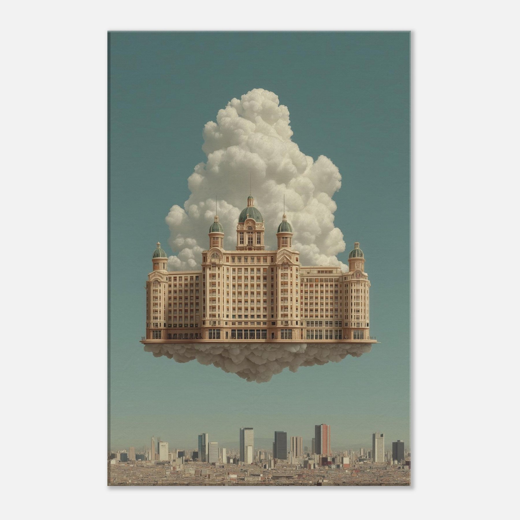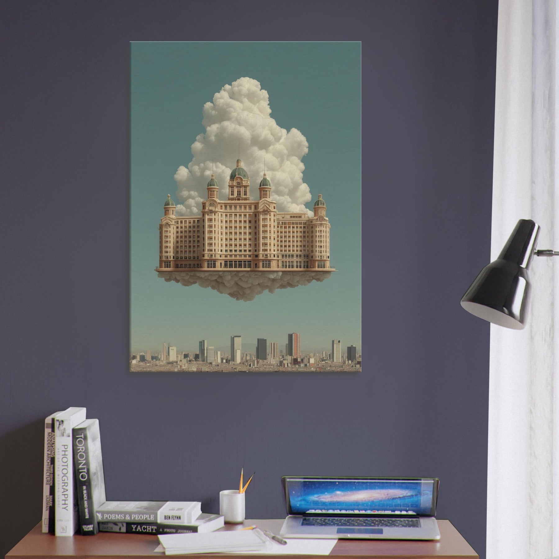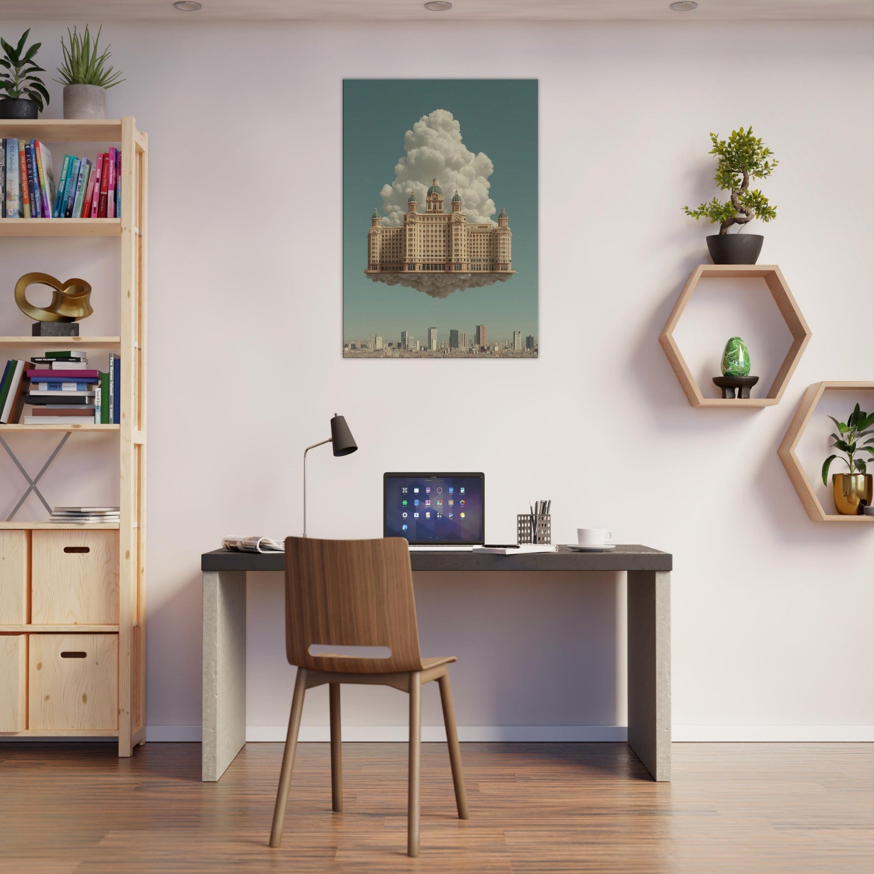 An impossible palace hovers above the bustle of Mexico City, tethered to the sky by imagination. This surreal composition combines ornate grandeur with a modern urban horizon, soft sandstone tones, emerald domes, and cloud trails that cradle the skyline. The piece invites contemplative quiet in a living room or study, turning everyday walls into a window to wonder. Its dreamlike balance of scale and detail evokes memory and possibility, making space feel calmer, more expansive, and endlessly curious.
