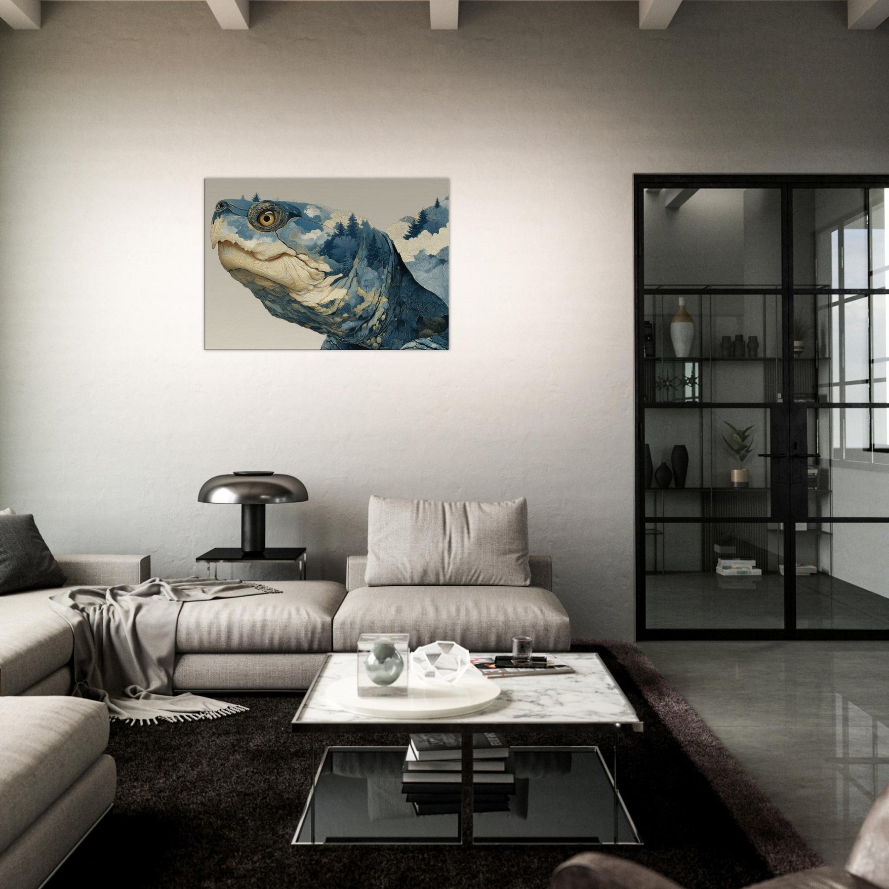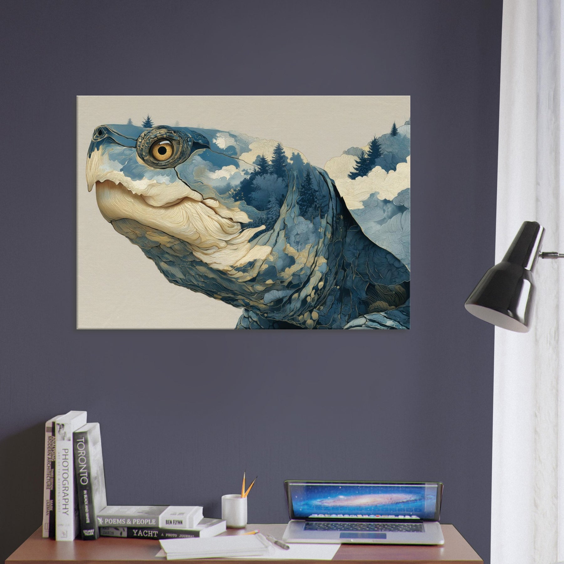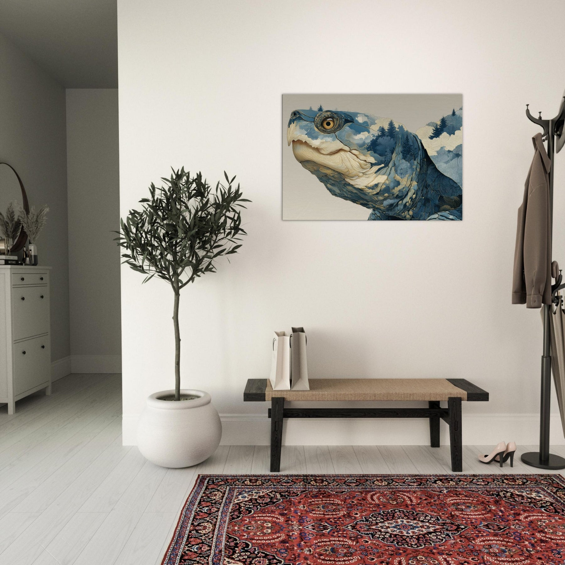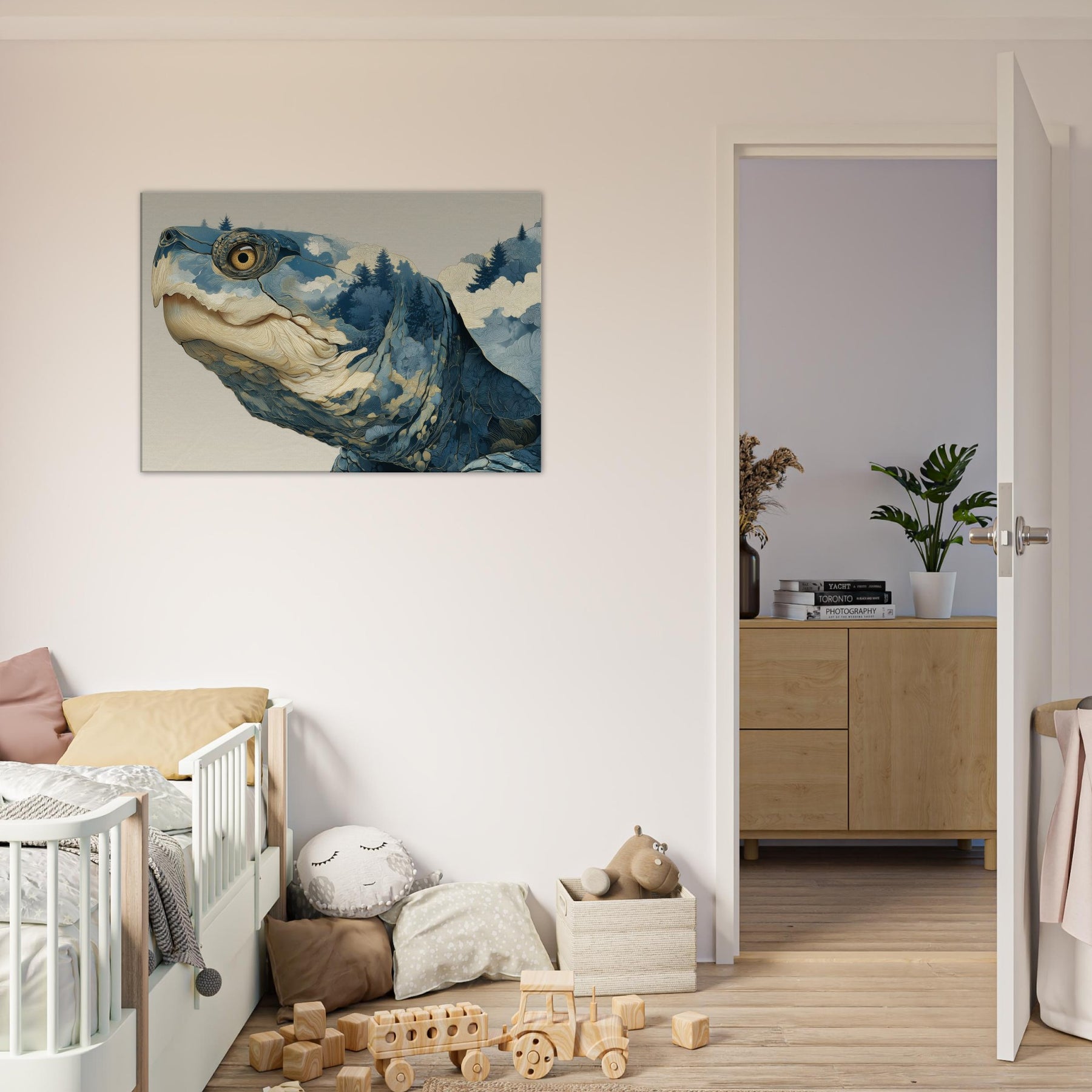 Like a dream unfurling across a quiet wall, this painting dissolves shore and sky into a tensile, meditative where a Turtle carries a forest and mountain on its shell. The textures ripple in sea blue and warm earth tones, as wind, water, and pine breathe in a single, slow current. In a living room or study, it invites reflection, curiosity, and a slow, luminous calm a surreal gateway that elevates everyday space into a contemplative horizon.