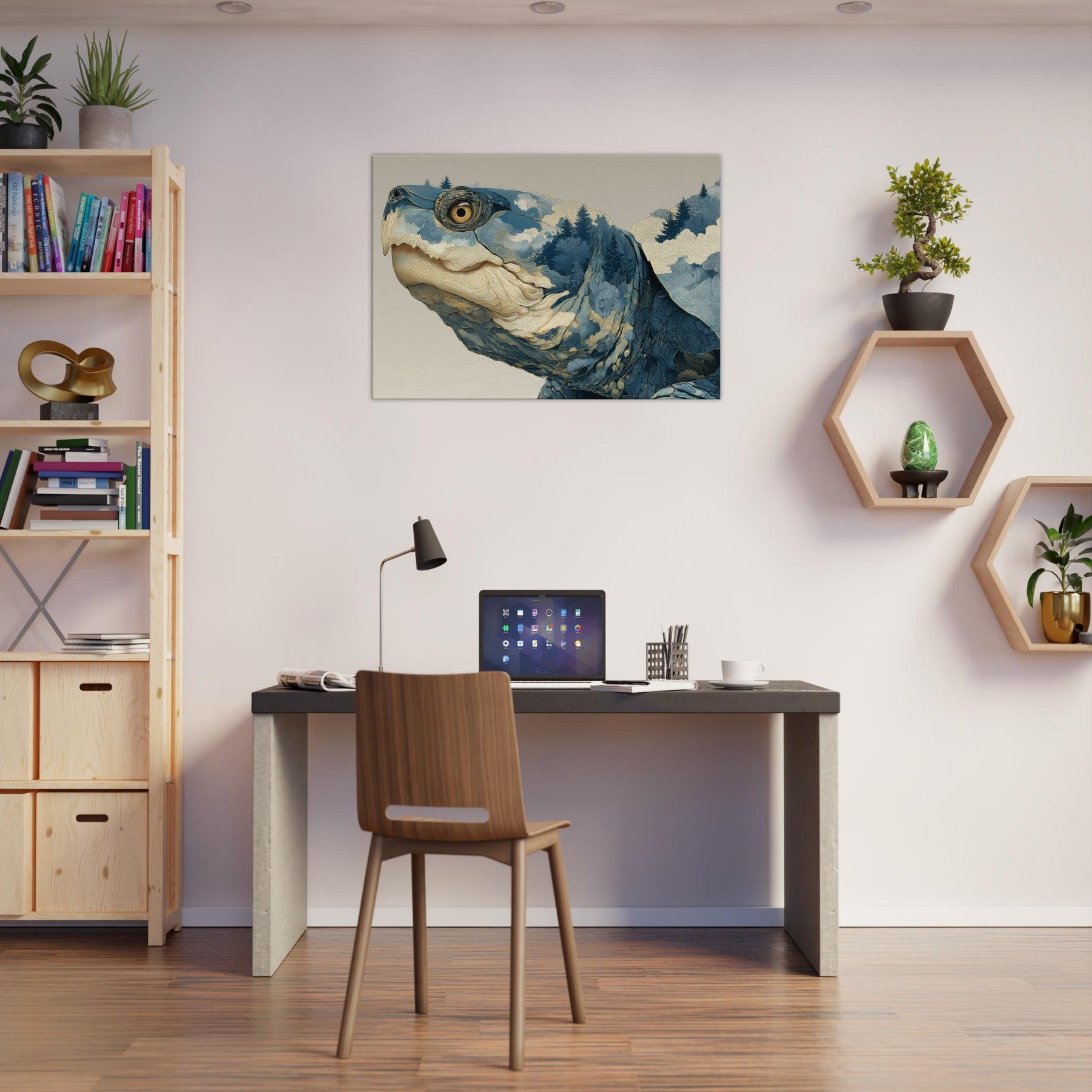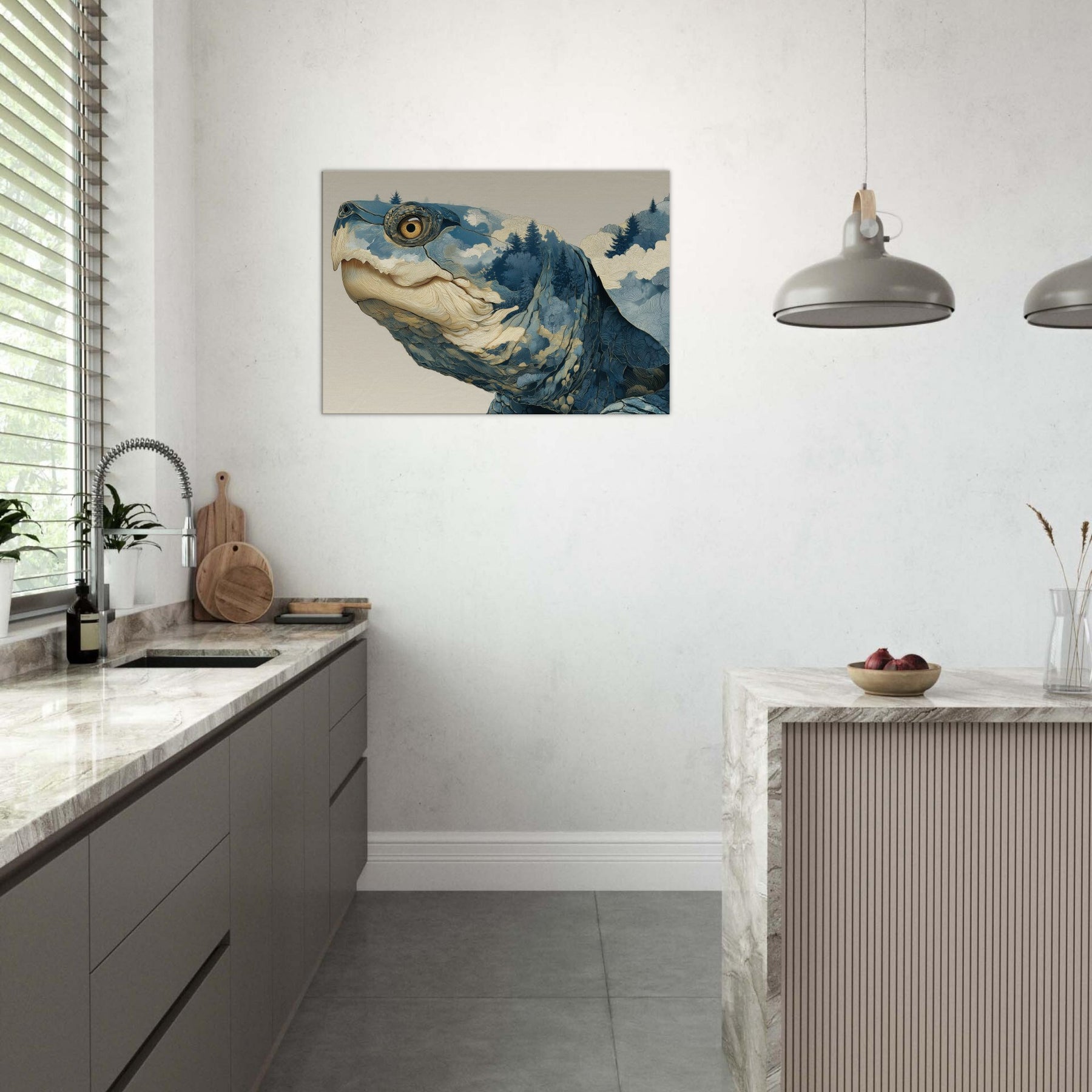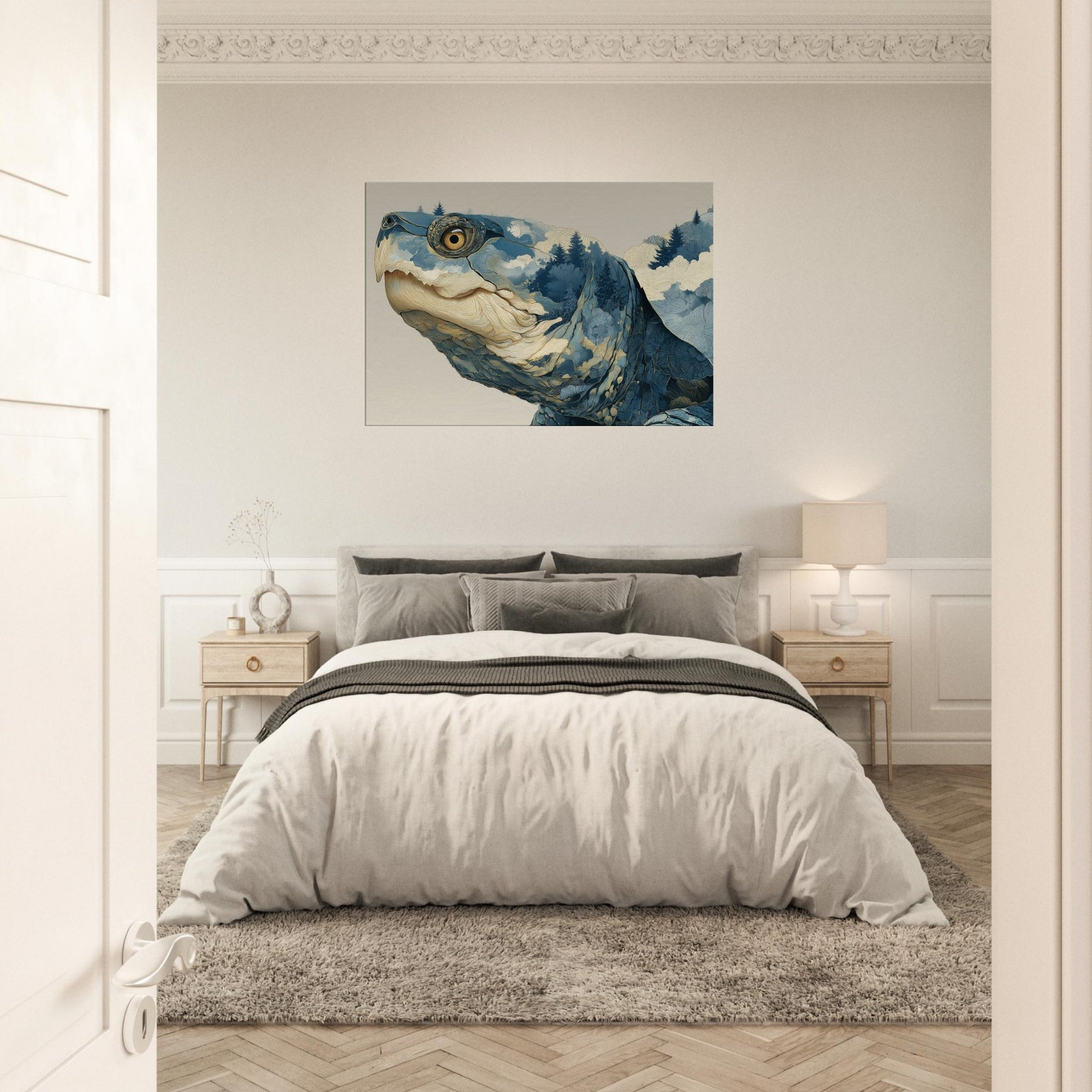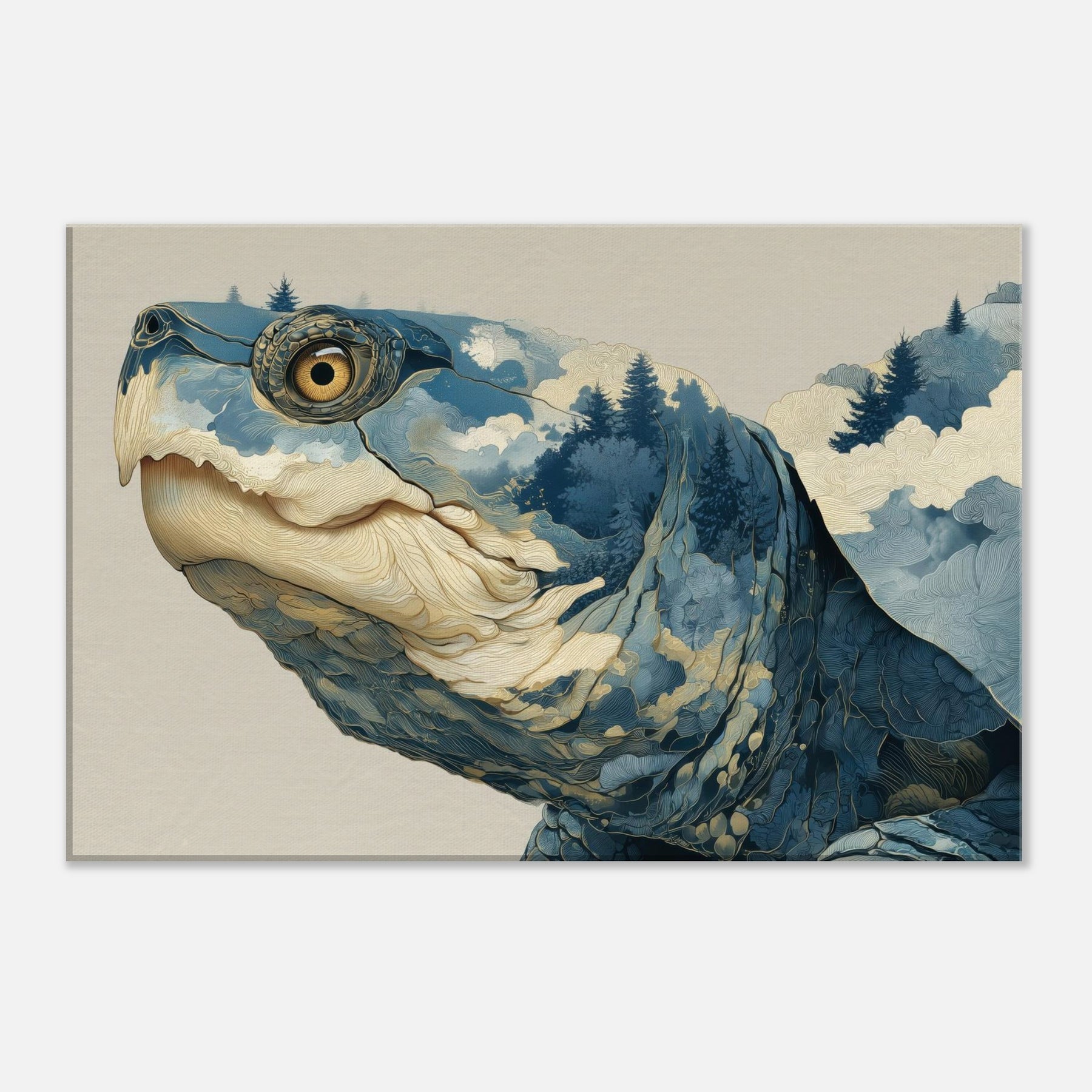 Like a dream unfurling across a quiet wall, this painting dissolves shore and sky into a tensile, meditative where a Turtle carries a forest and mountain on its shell. The textures ripple in sea blue and warm earth tones, as wind, water, and pine breathe in a single, slow current. In a living room or study, it invites reflection, curiosity, and a slow, luminous calm a surreal gateway that elevates everyday space into a contemplative horizon.