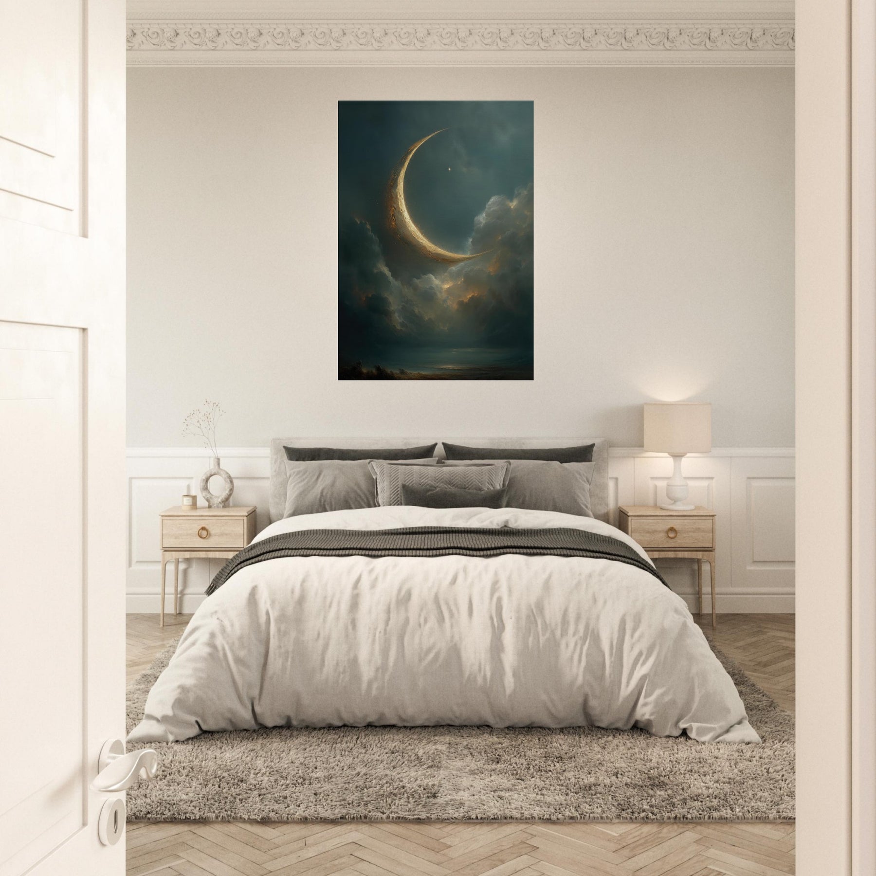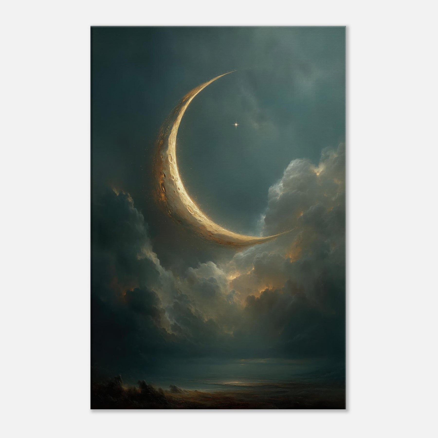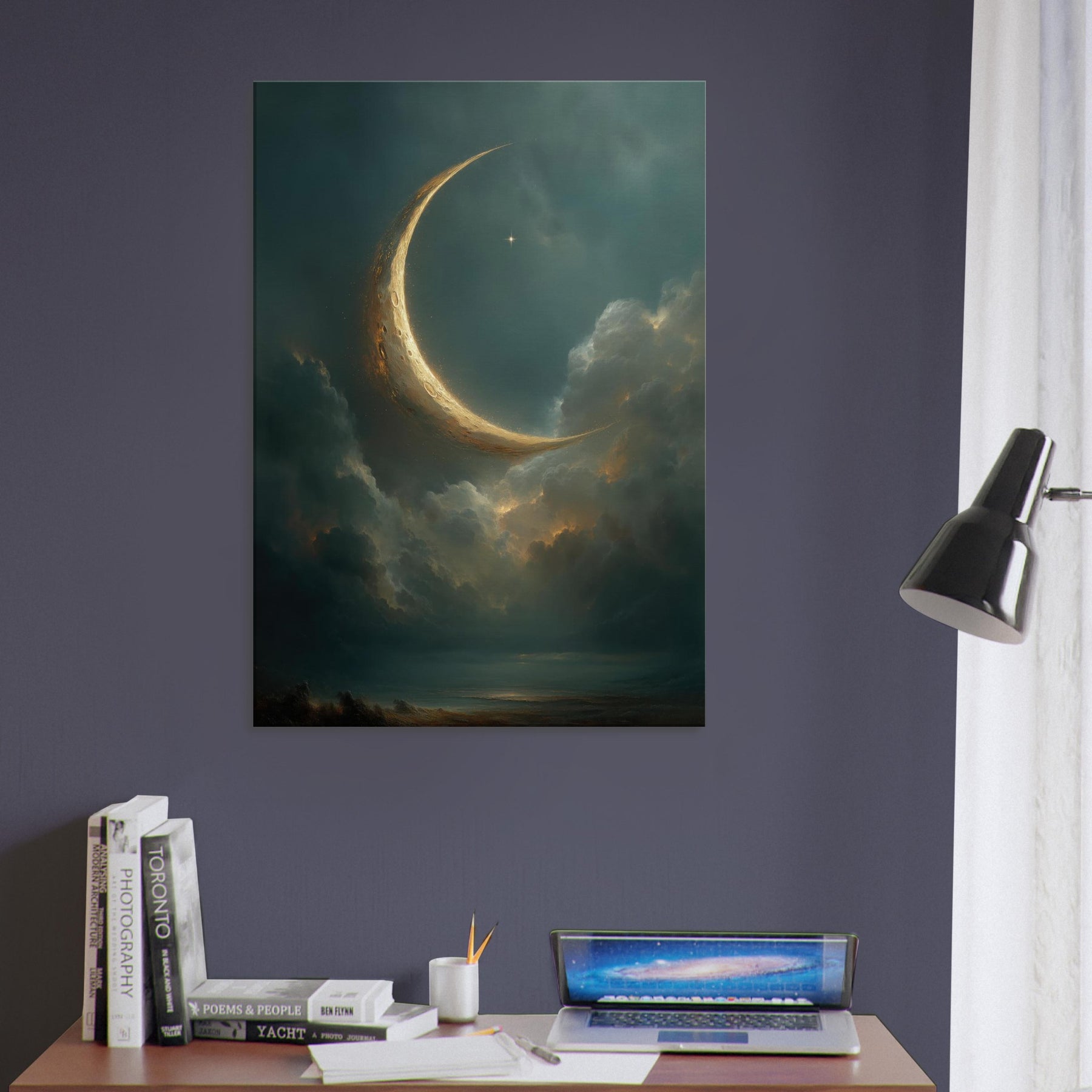 Muse in quiet awe as a solitary Crescent & Star glides through a dream soaked sky. Painted with minimal lines and luminescent edges, it invites a slower gaze, turning any wall into a window to reverie. The surreal atmosphere swells with humid clouds and a shorelit horizon, echoing the hush of late evenings. In a living room or study, this piece nourishes contemplation, softening hard angles and guiding the eye toward a gentle, luminous pause, an intimate ritual of stillness and wonder. The central subject is Crescent & Star (Minimal).
