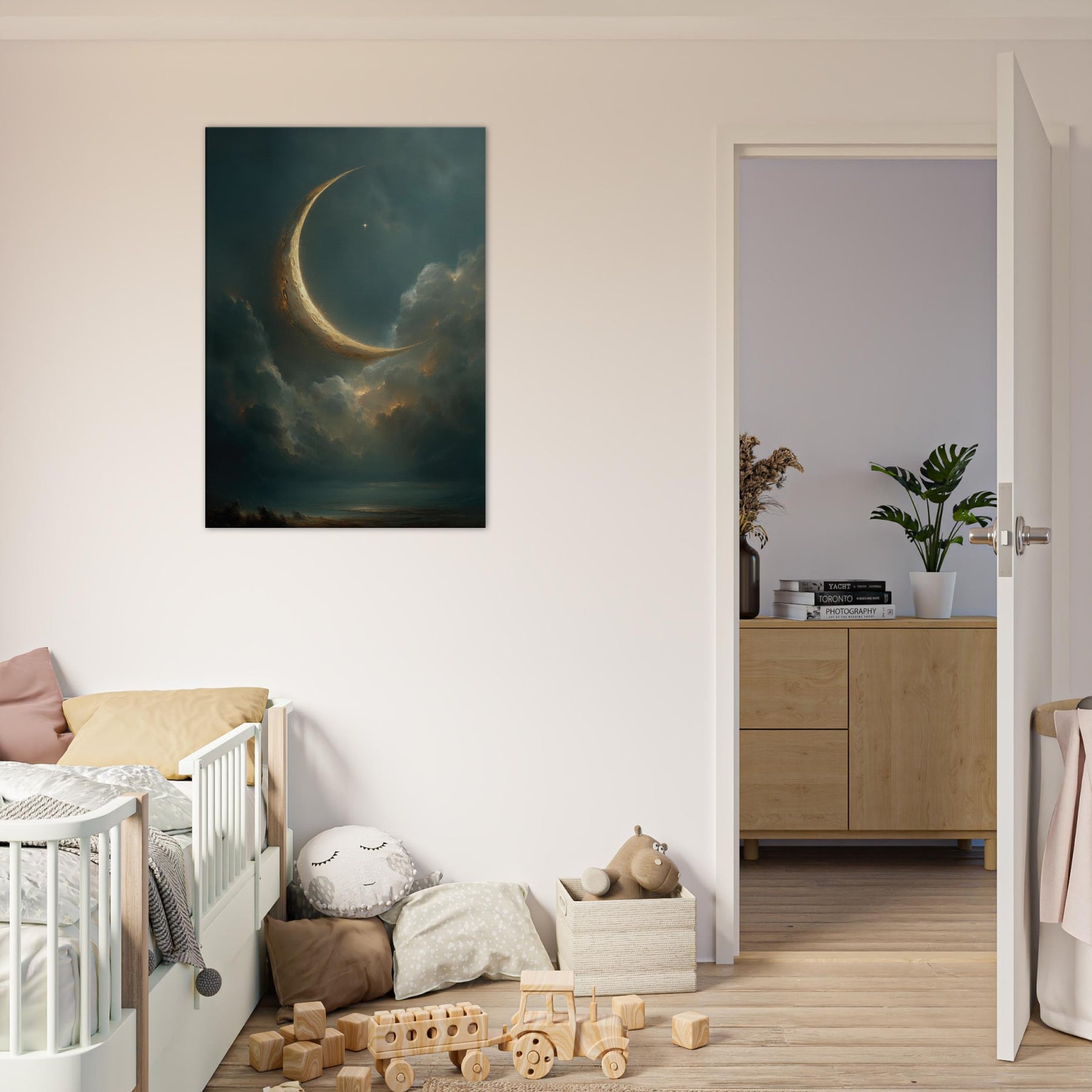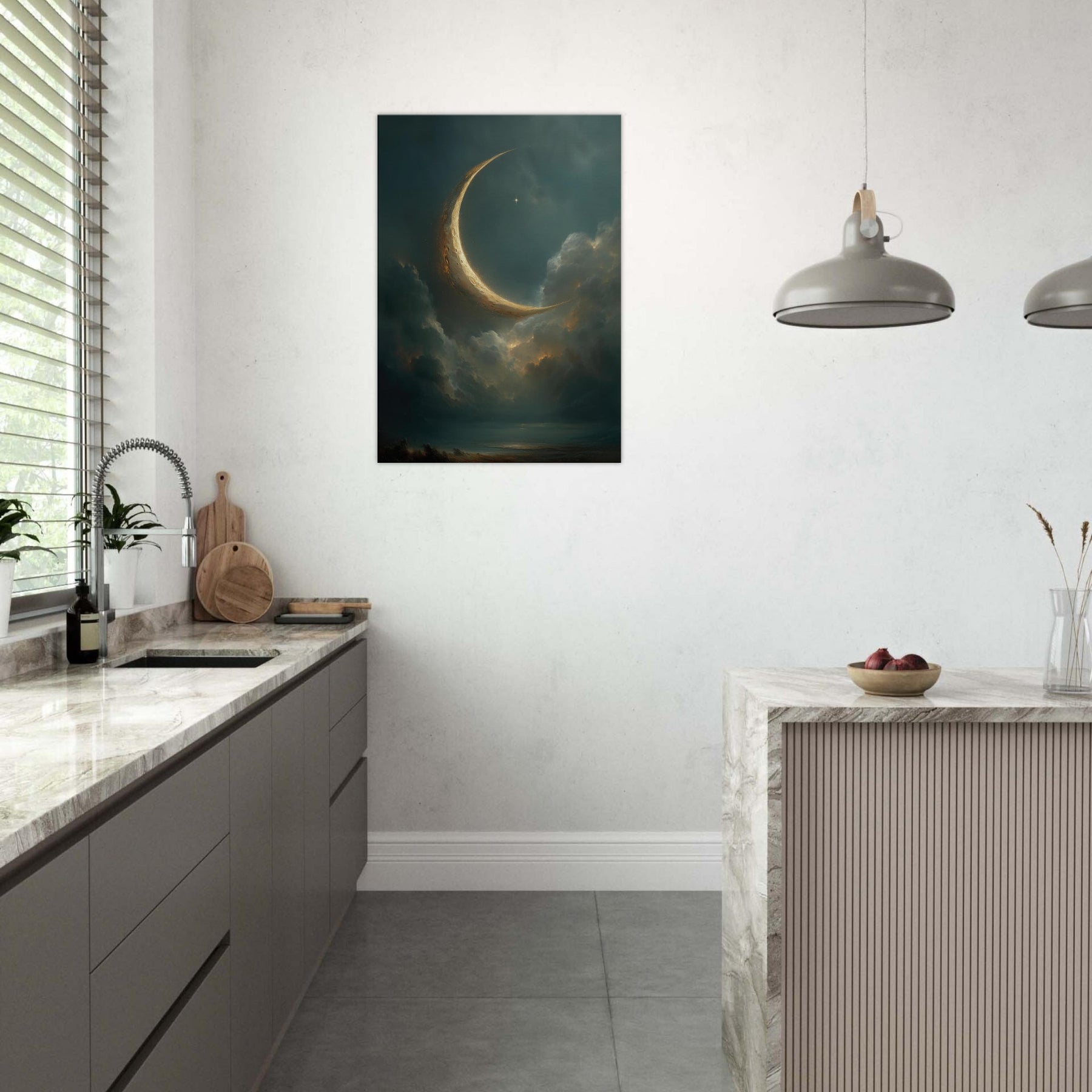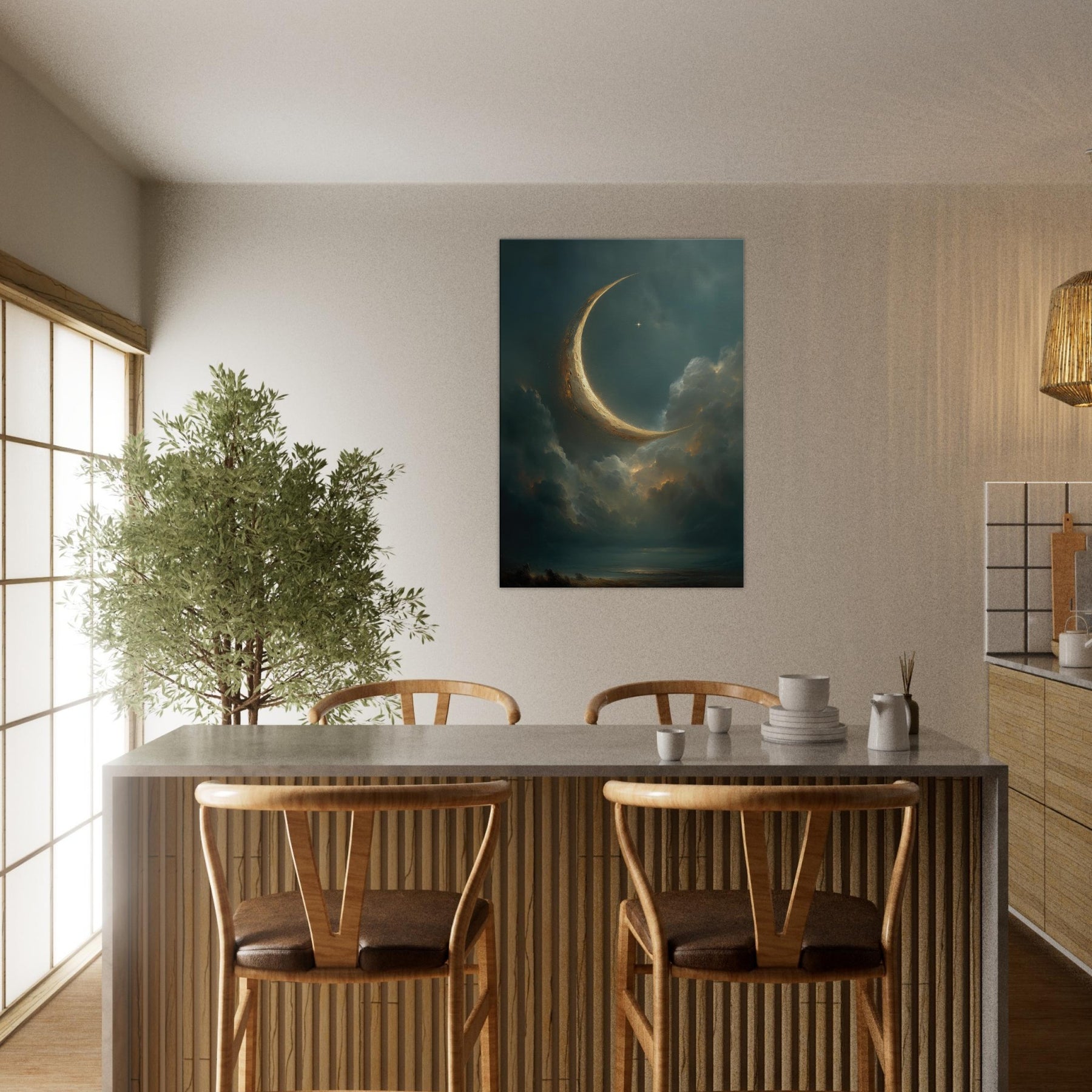 Muse in quiet awe as a solitary Crescent & Star glides through a dream soaked sky. Painted with minimal lines and luminescent edges, it invites a slower gaze, turning any wall into a window to reverie. The surreal atmosphere swells with humid clouds and a shorelit horizon, echoing the hush of late evenings. In a living room or study, this piece nourishes contemplation, softening hard angles and guiding the eye toward a gentle, luminous pause, an intimate ritual of stillness and wonder. The central subject is Crescent & Star (Minimal).