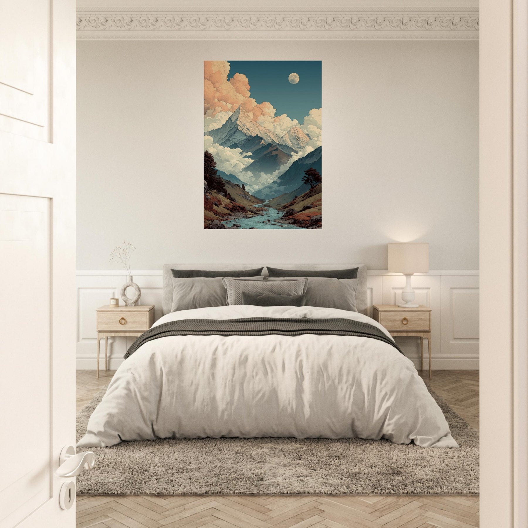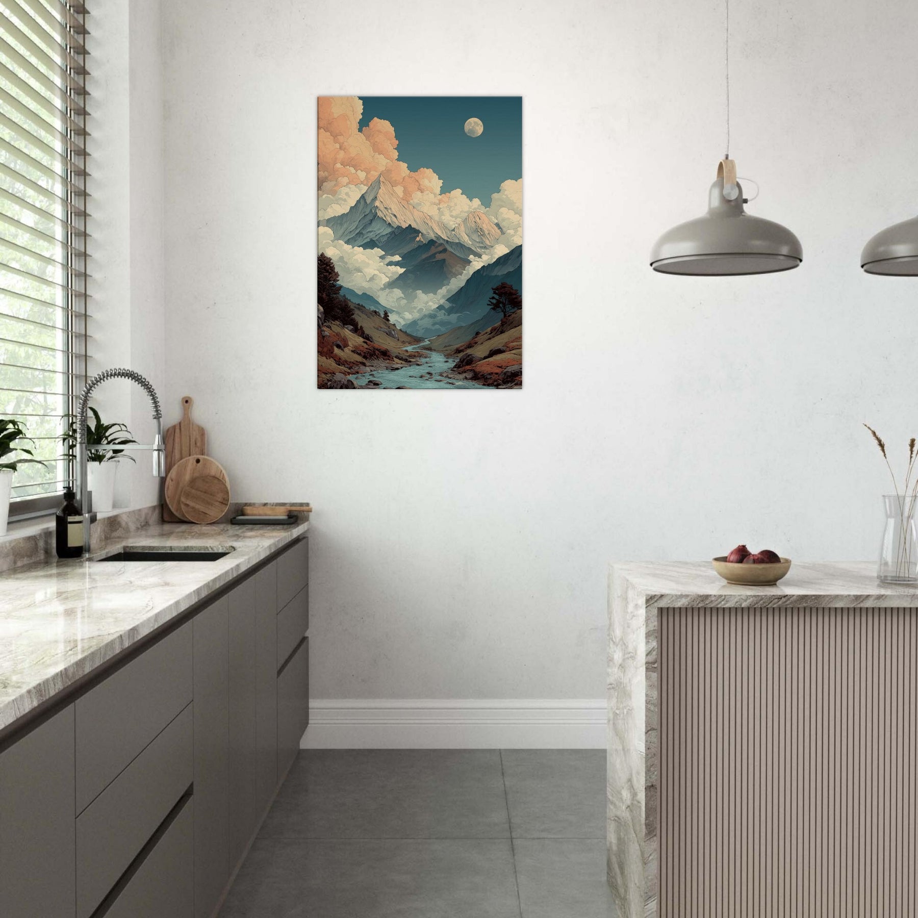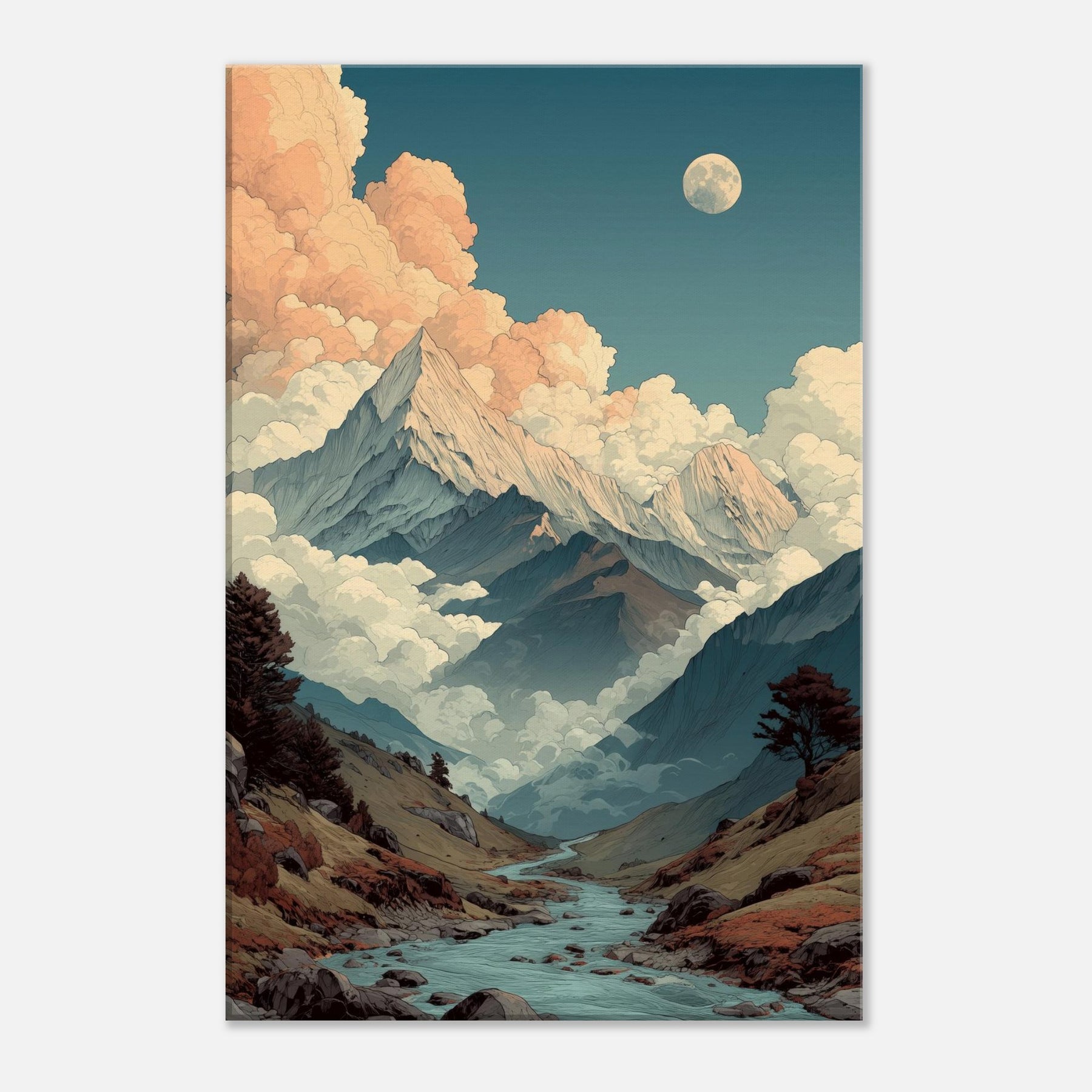 Mountains rise like pale storm scribes against a sky that shifts from teal to peach. Clouds cradle the peaks in a soft, surreal glow, while a quiet river threads through the valley, inviting a slow, contemplative gaze. This vision of mountains breathes an otherworldly calm into any room, turning walls into a window to the high country. The palette cool blues, warm apricot, earthy browns creates a mood that settles with you, steady and expansive. Hang it in a living room or study to evoke wonder and spacious, dreamlike serenity.