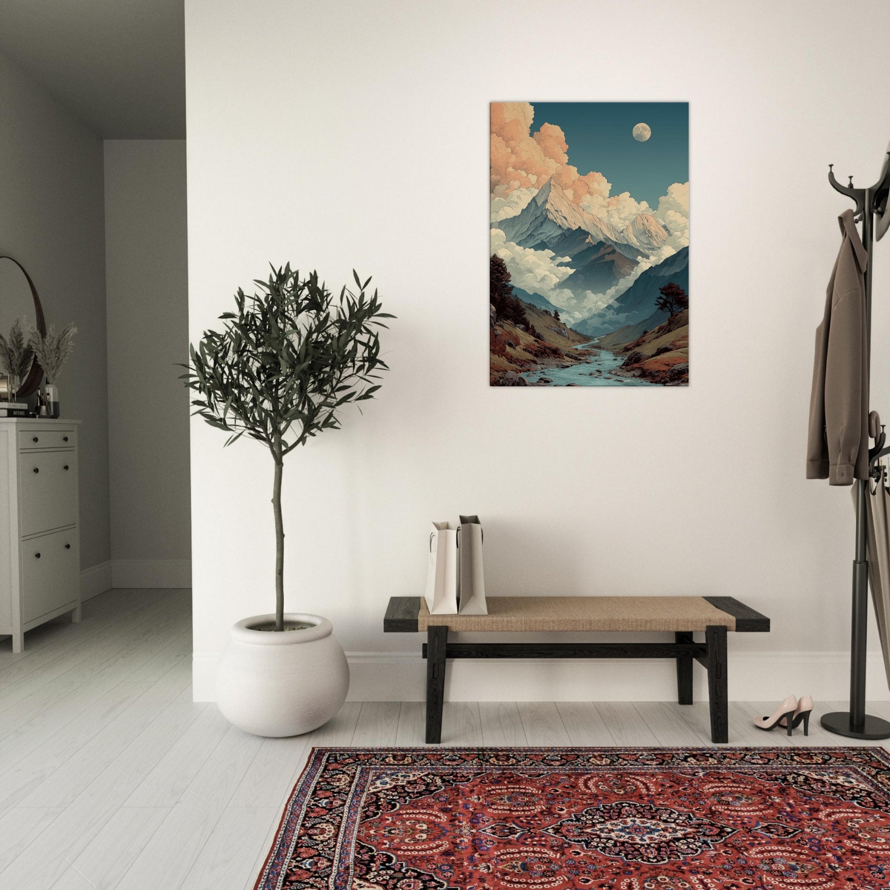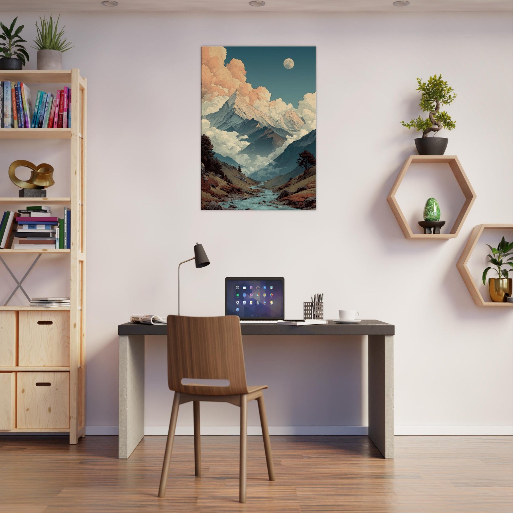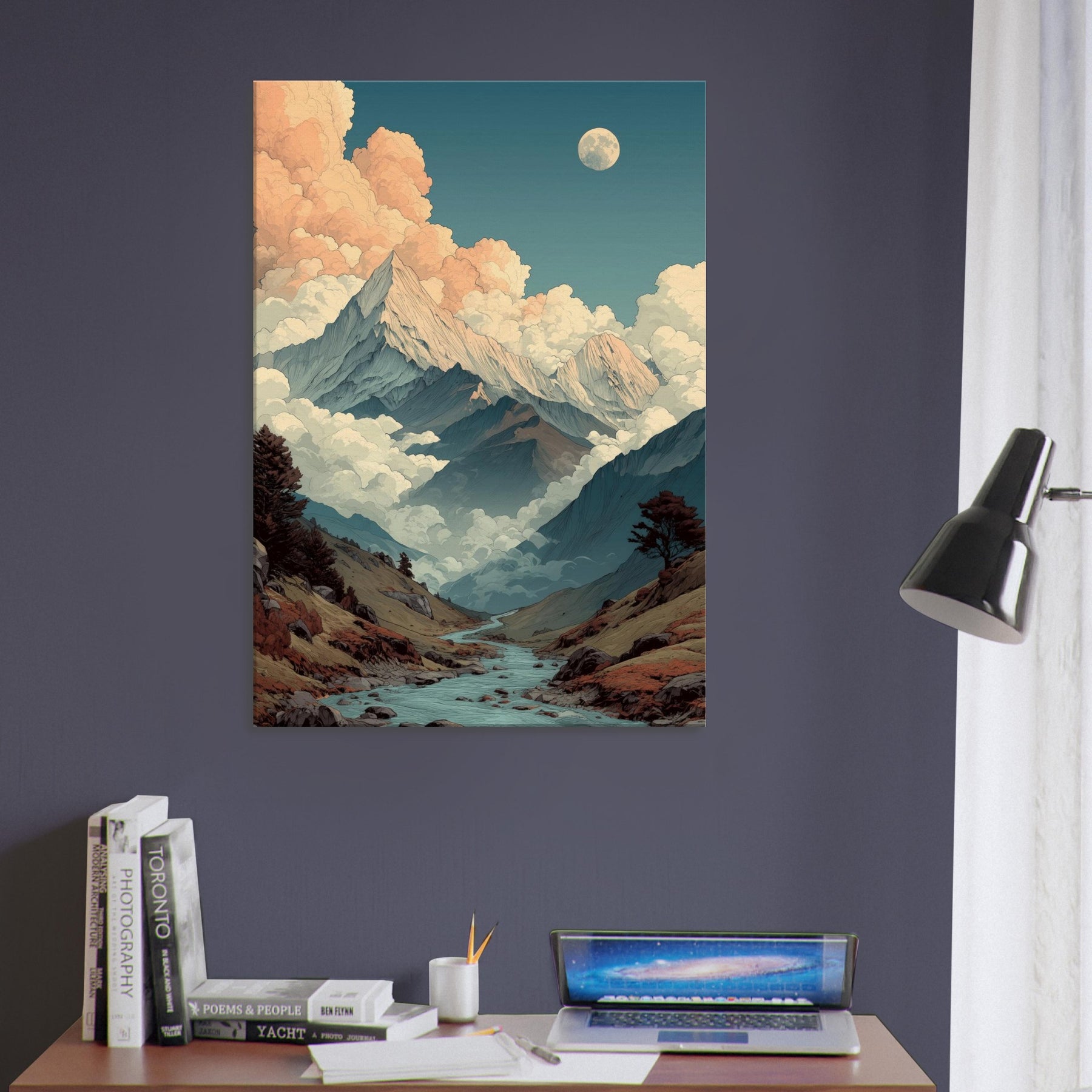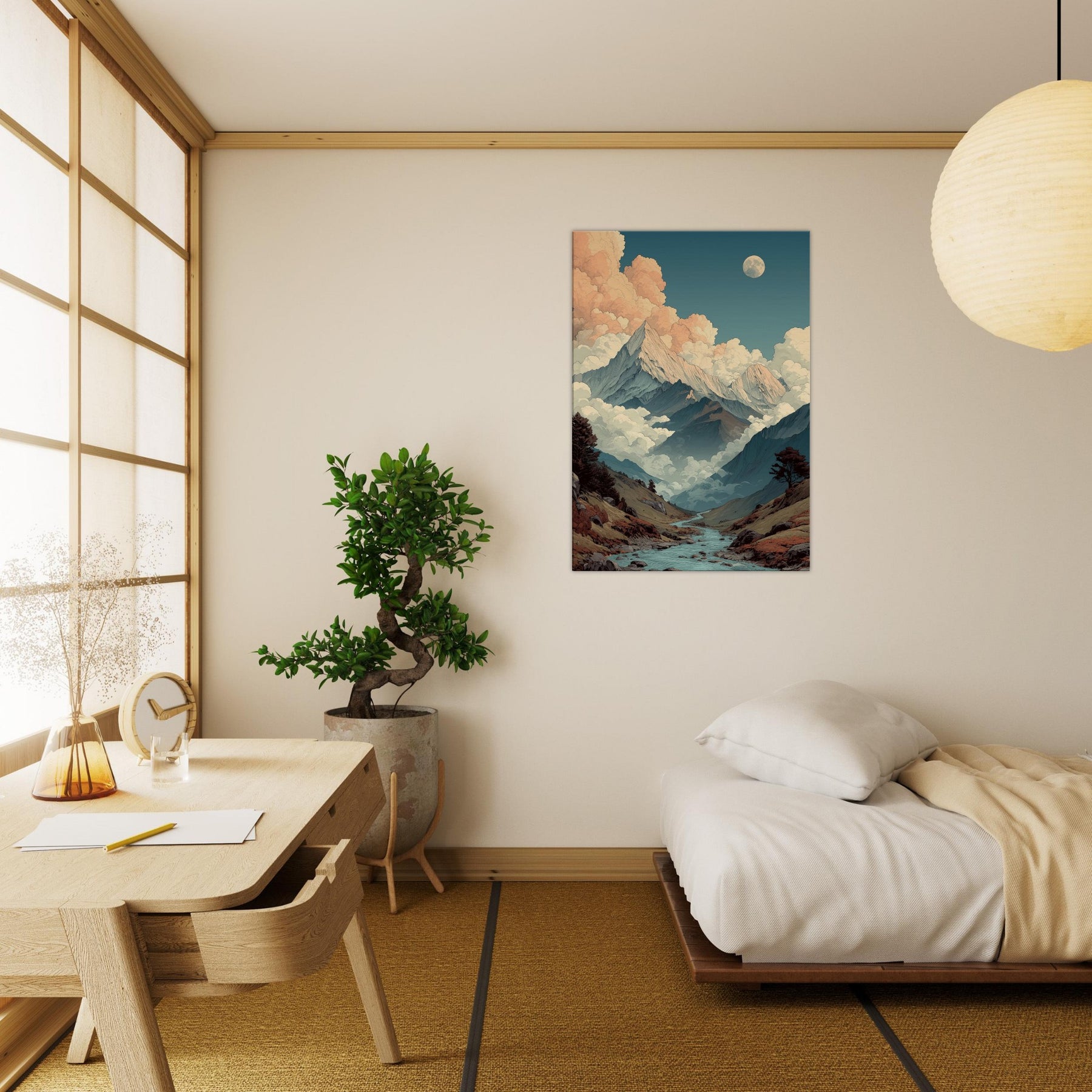 Mountains rise like pale storm scribes against a sky that shifts from teal to peach. Clouds cradle the peaks in a soft, surreal glow, while a quiet river threads through the valley, inviting a slow, contemplative gaze. This vision of mountains breathes an otherworldly calm into any room, turning walls into a window to the high country. The palette cool blues, warm apricot, earthy browns creates a mood that settles with you, steady and expansive. Hang it in a living room or study to evoke wonder and spacious, dreamlike serenity.
