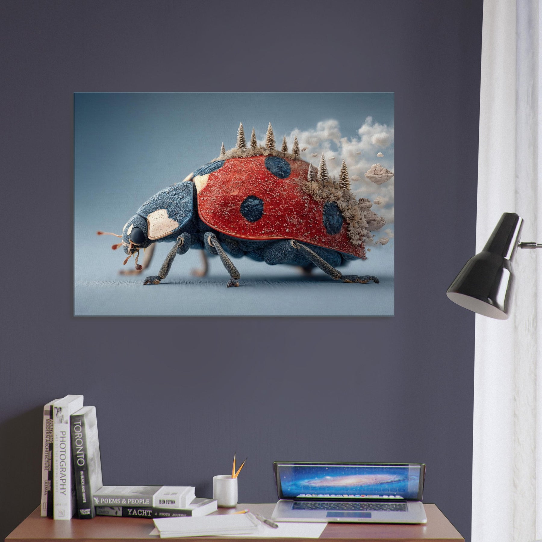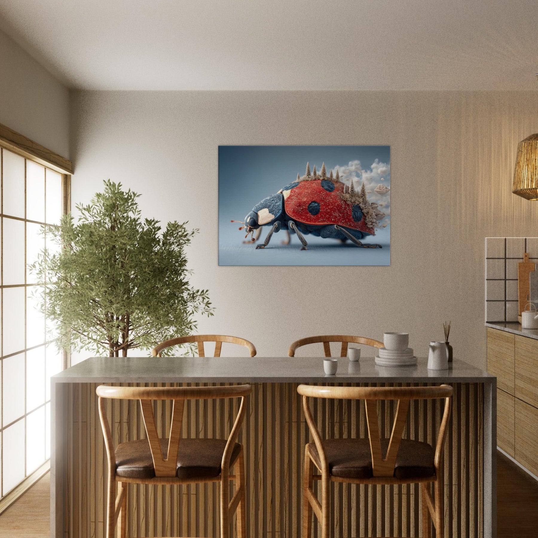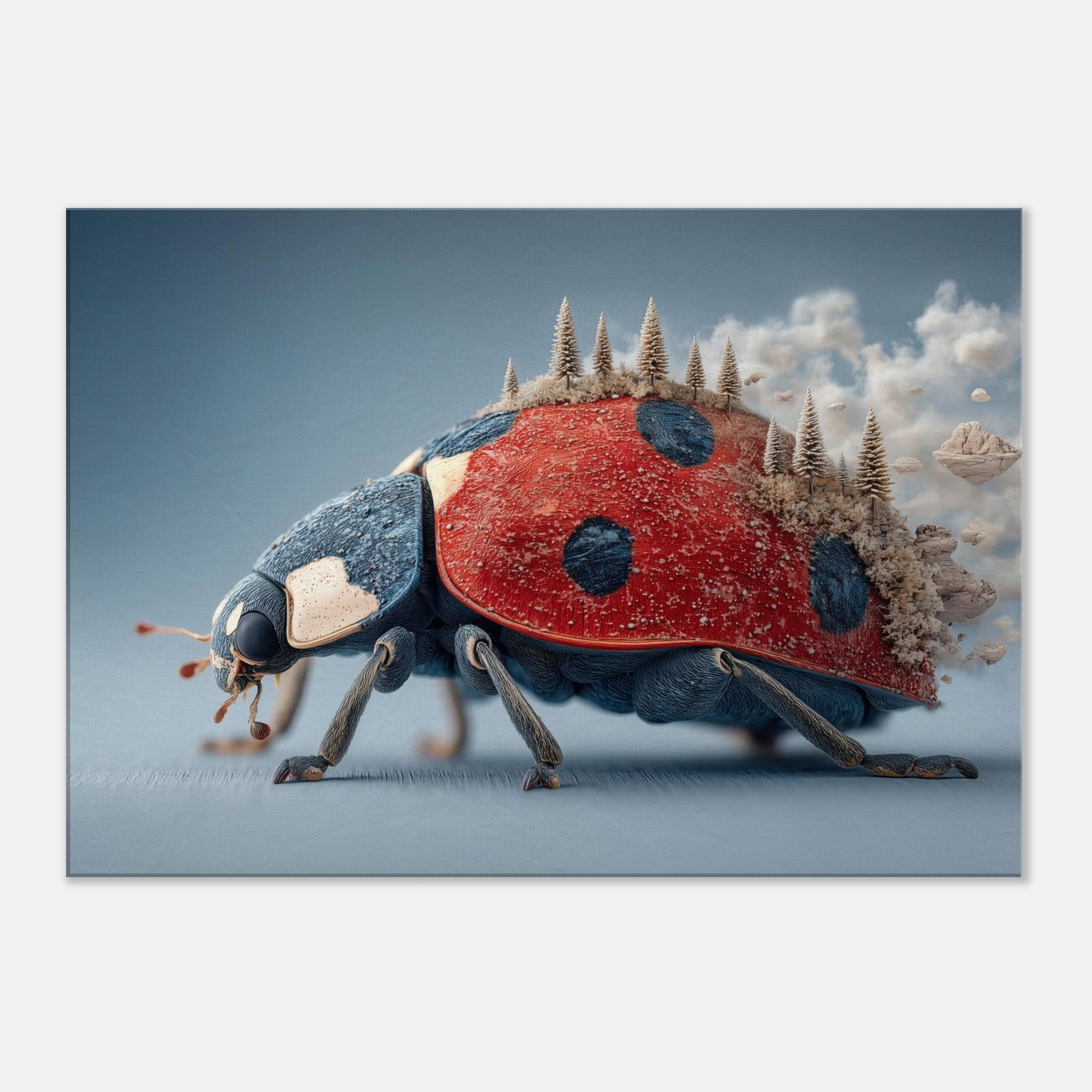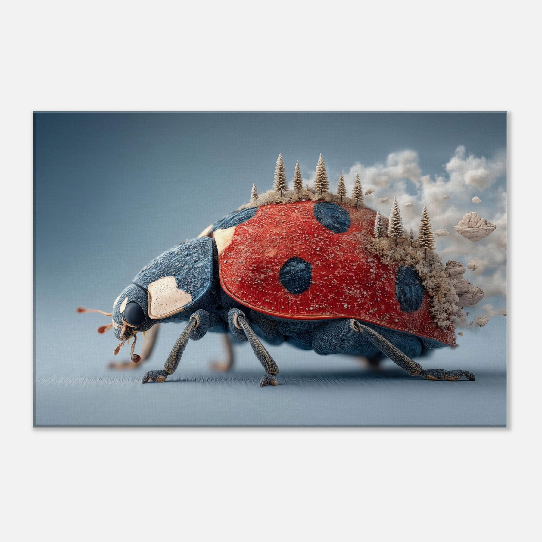 Step into a dream where a towering Ladybug carries a forest of frosted pines across its back. The surreal, salt air blues meet radiant red in a tactile that feels both playful and profound. Light skitters along enamel like textures, casting quiet shadows as if the room itself breathes. Hang this piece in a living room or study to invite curiosity, warmth, and a whisper of otherworldly calm the Ladybug becomes a gentle traveler lighting your space with imagination.