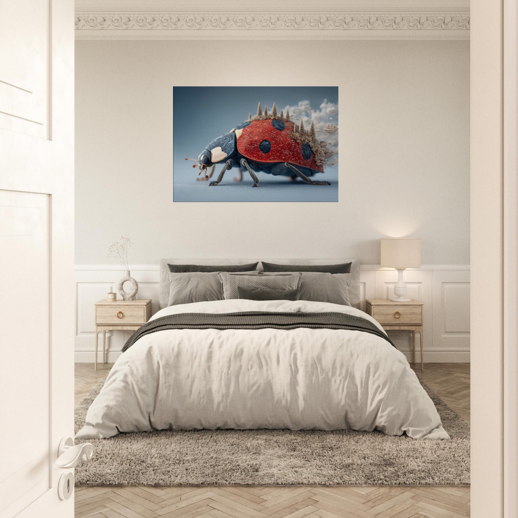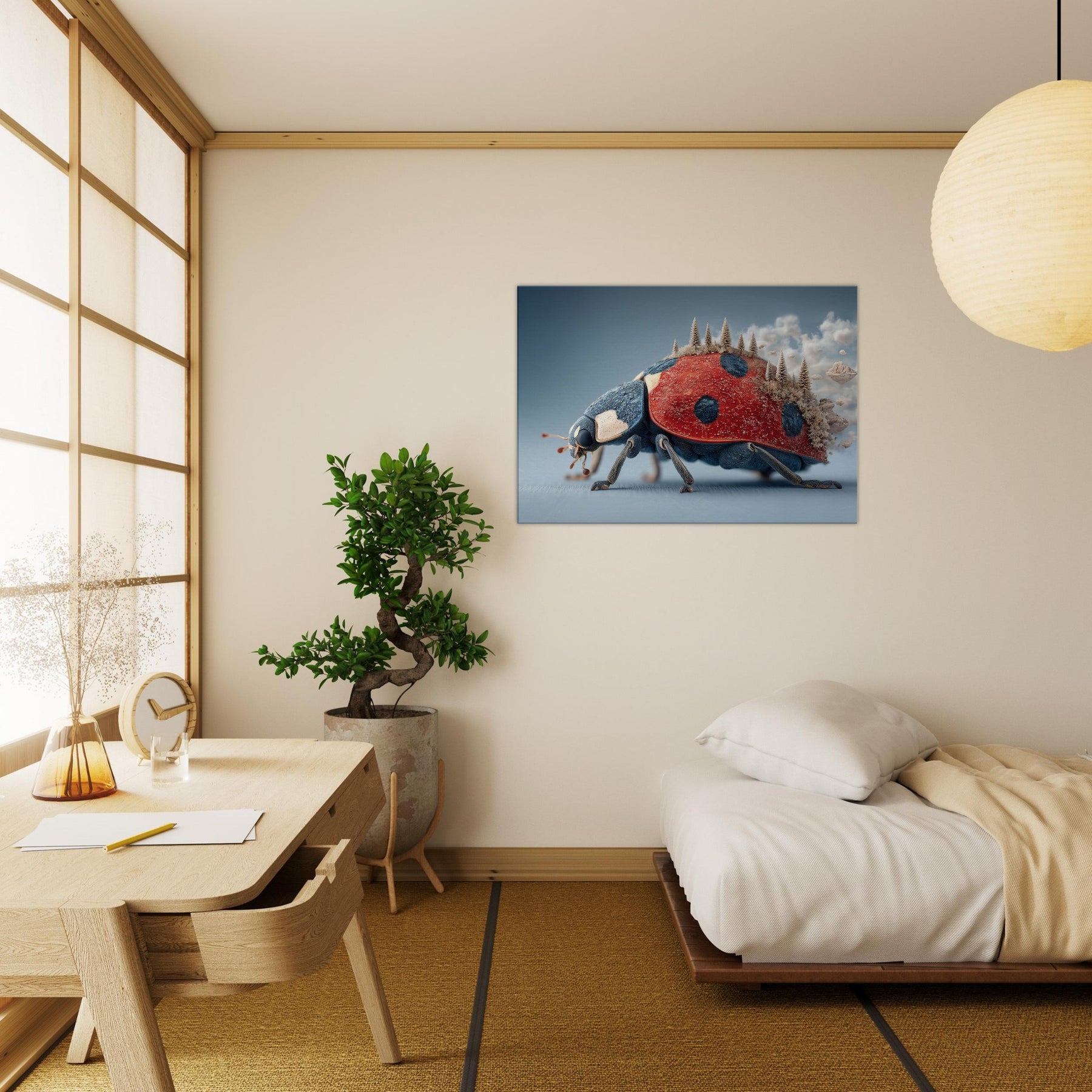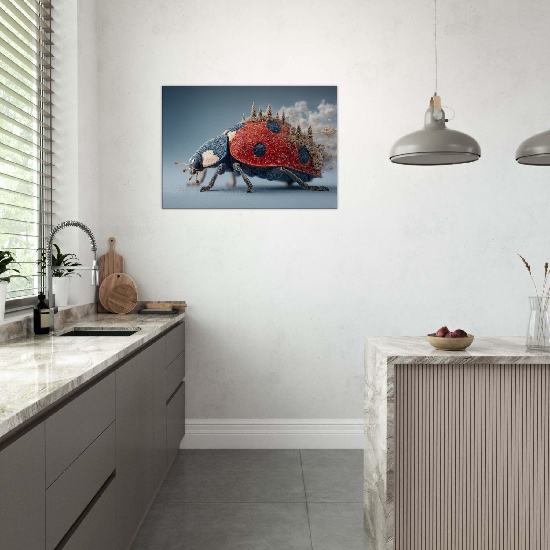 Step into a dream where a towering Ladybug carries a forest of frosted pines across its back. The surreal, salt air blues meet radiant red in a tactile that feels both playful and profound. Light skitters along enamel like textures, casting quiet shadows as if the room itself breathes. Hang this piece in a living room or study to invite curiosity, warmth, and a whisper of otherworldly calm the Ladybug becomes a gentle traveler lighting your space with imagination.