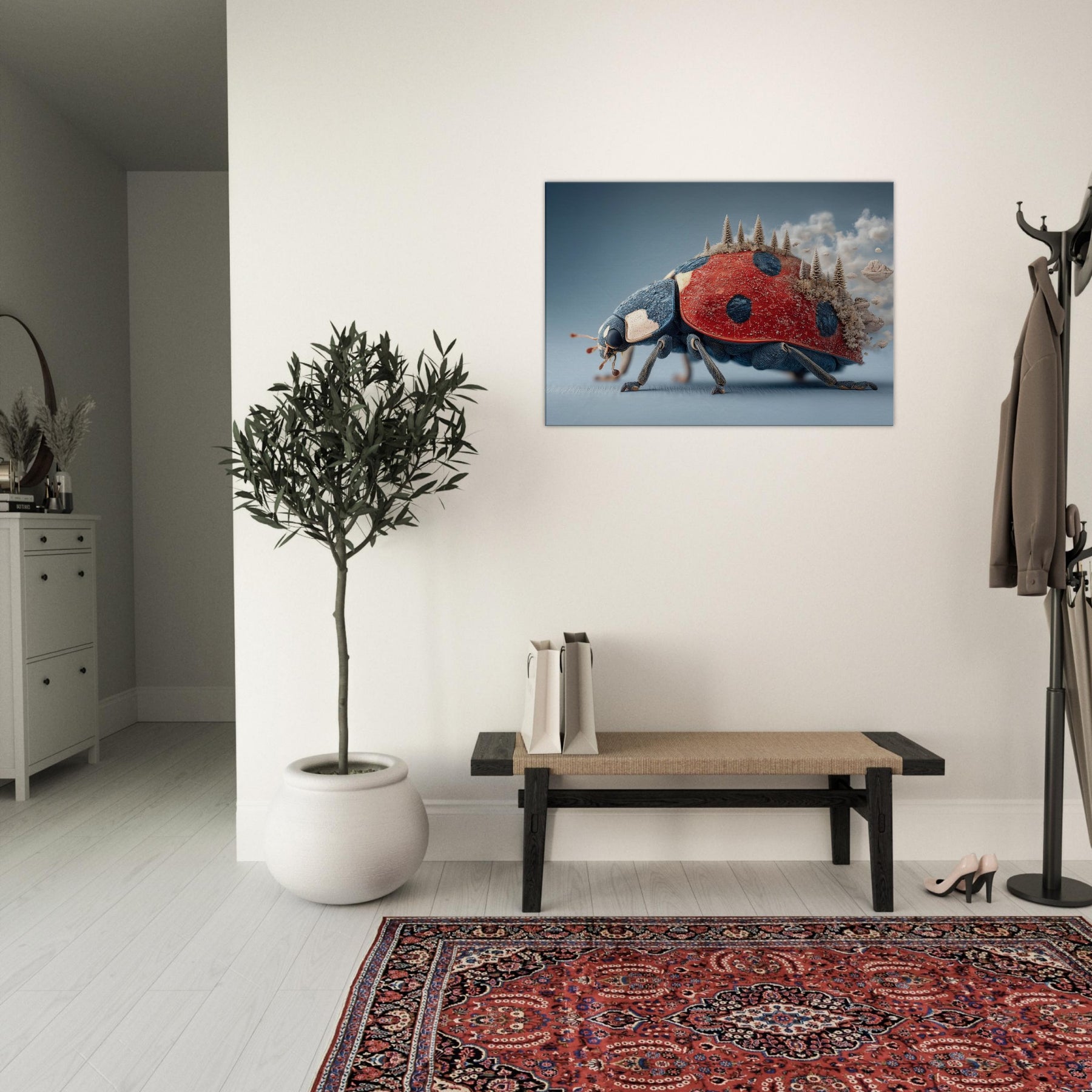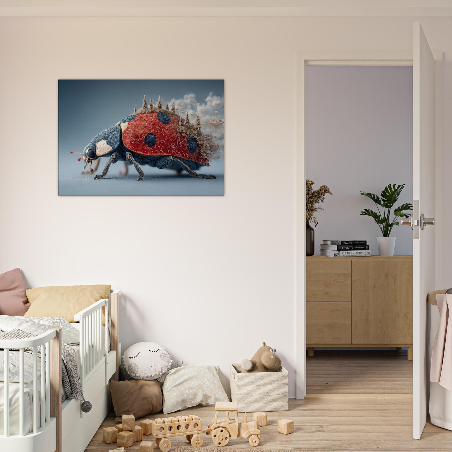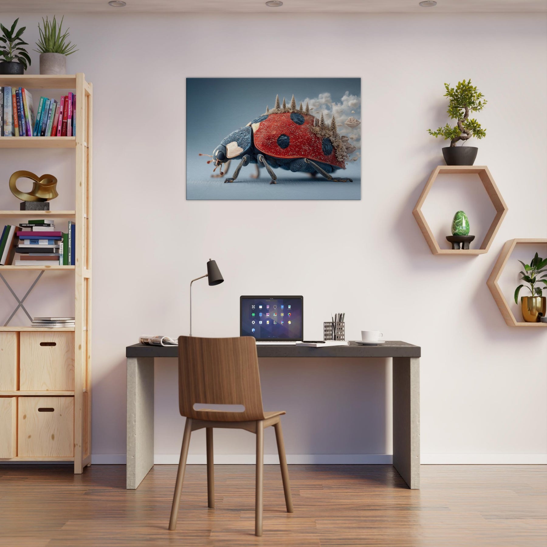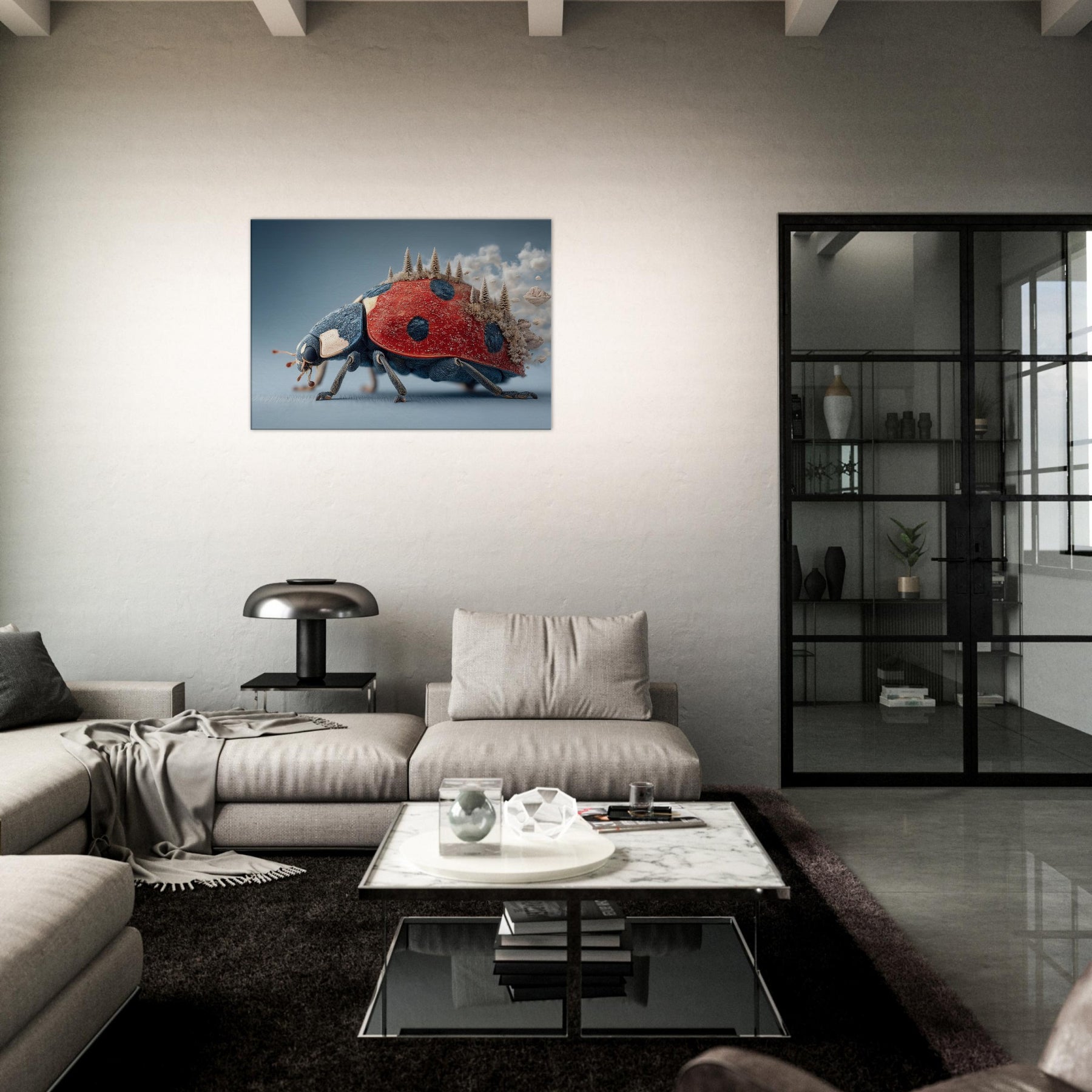 Step into a dream where a towering Ladybug carries a forest of frosted pines across its back. The surreal, salt air blues meet radiant red in a tactile that feels both playful and profound. Light skitters along enamel like textures, casting quiet shadows as if the room itself breathes. Hang this piece in a living room or study to invite curiosity, warmth, and a whisper of otherworldly calm the Ladybug becomes a gentle traveler lighting your space with imagination.