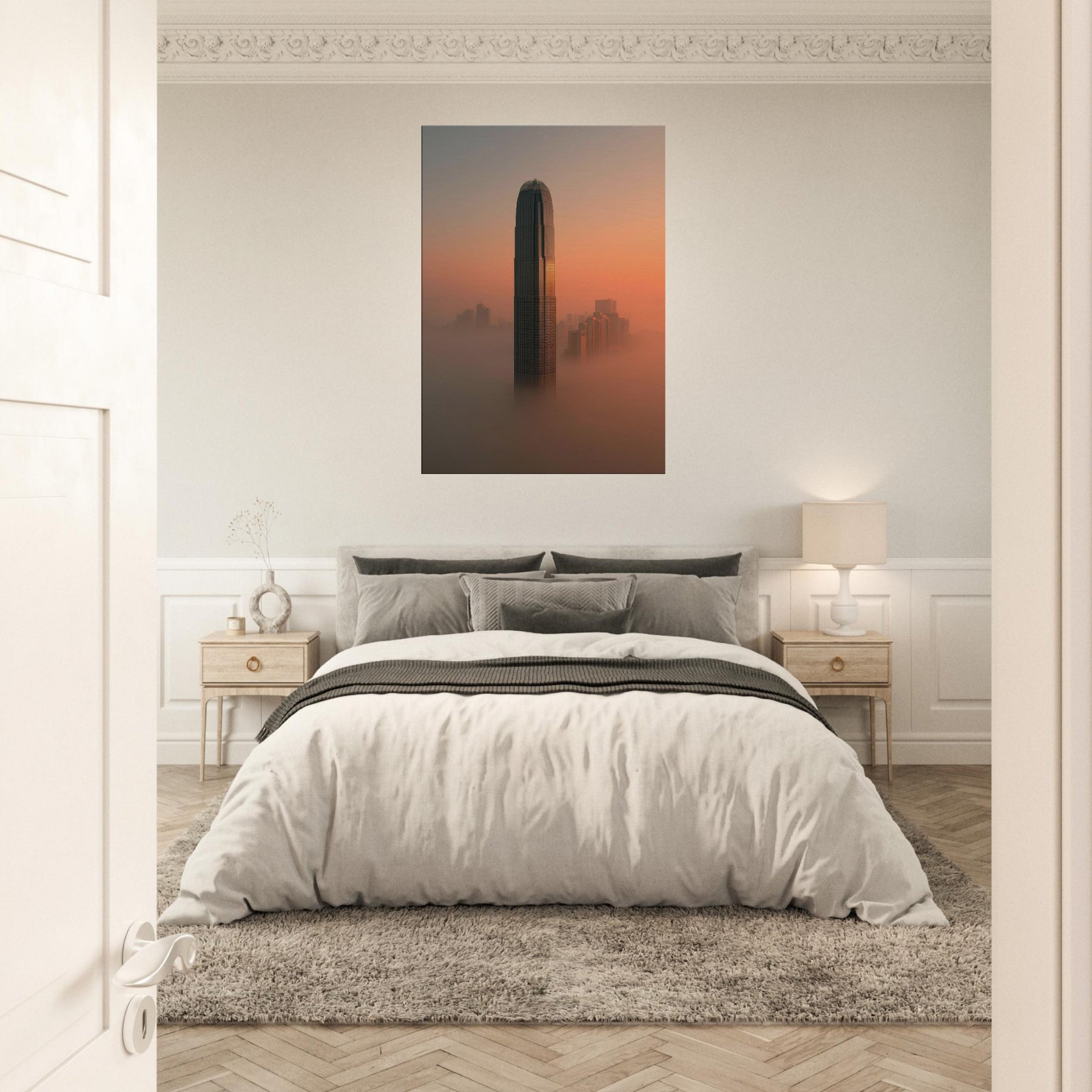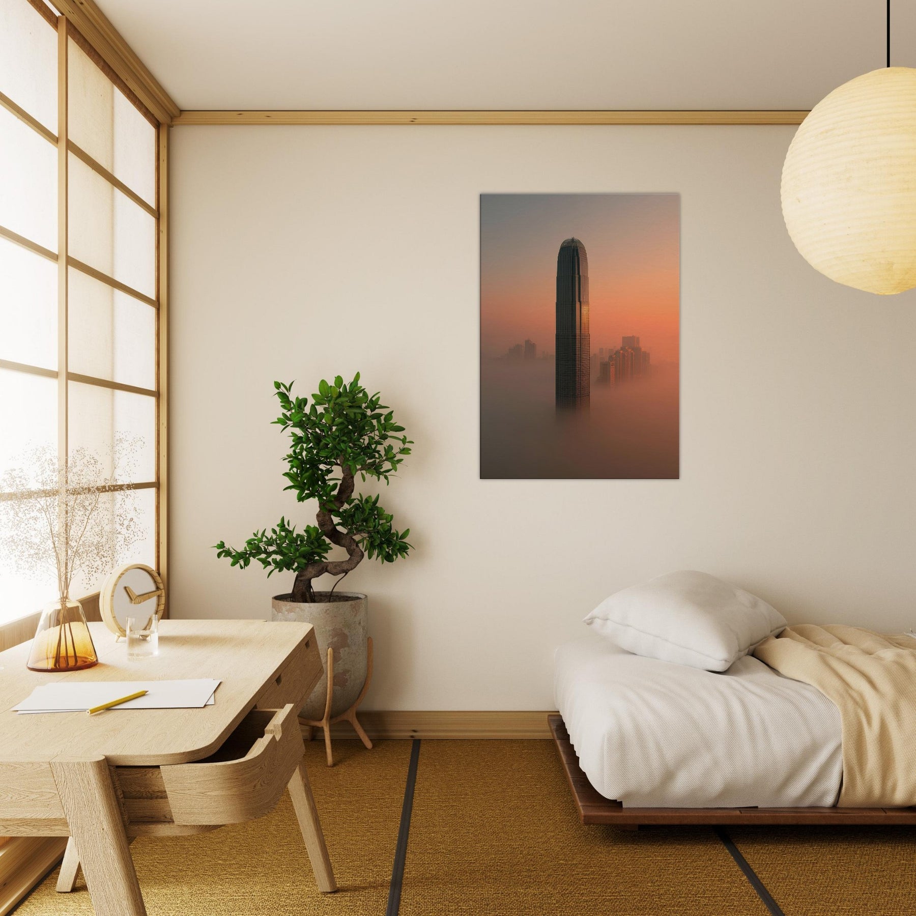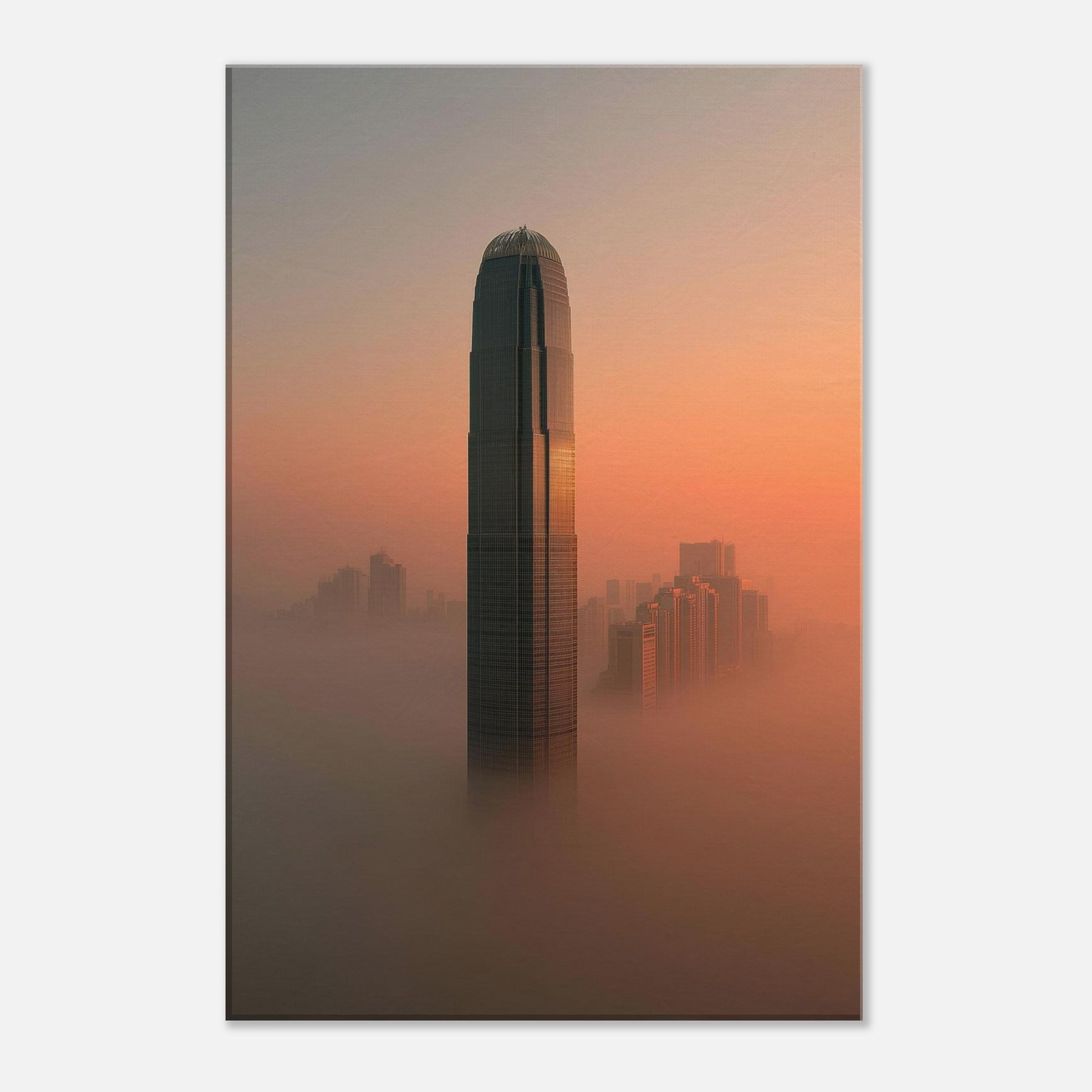 Where fog clings to towering facades and sunset spills along the harbor, this surreal view reimagines Hong Kong as a dream. A solitary tower rises through a coppered sky, while the streets fall away into a luminous mist that softens edges and slows time. The scene invites contemplation: a quiet, meditative space for modern living, where light, texture, and distance mingle. Hang it and the room breathes, hushed, expansive, and endlessly curious, a reminder that cities can dream beside us at night.