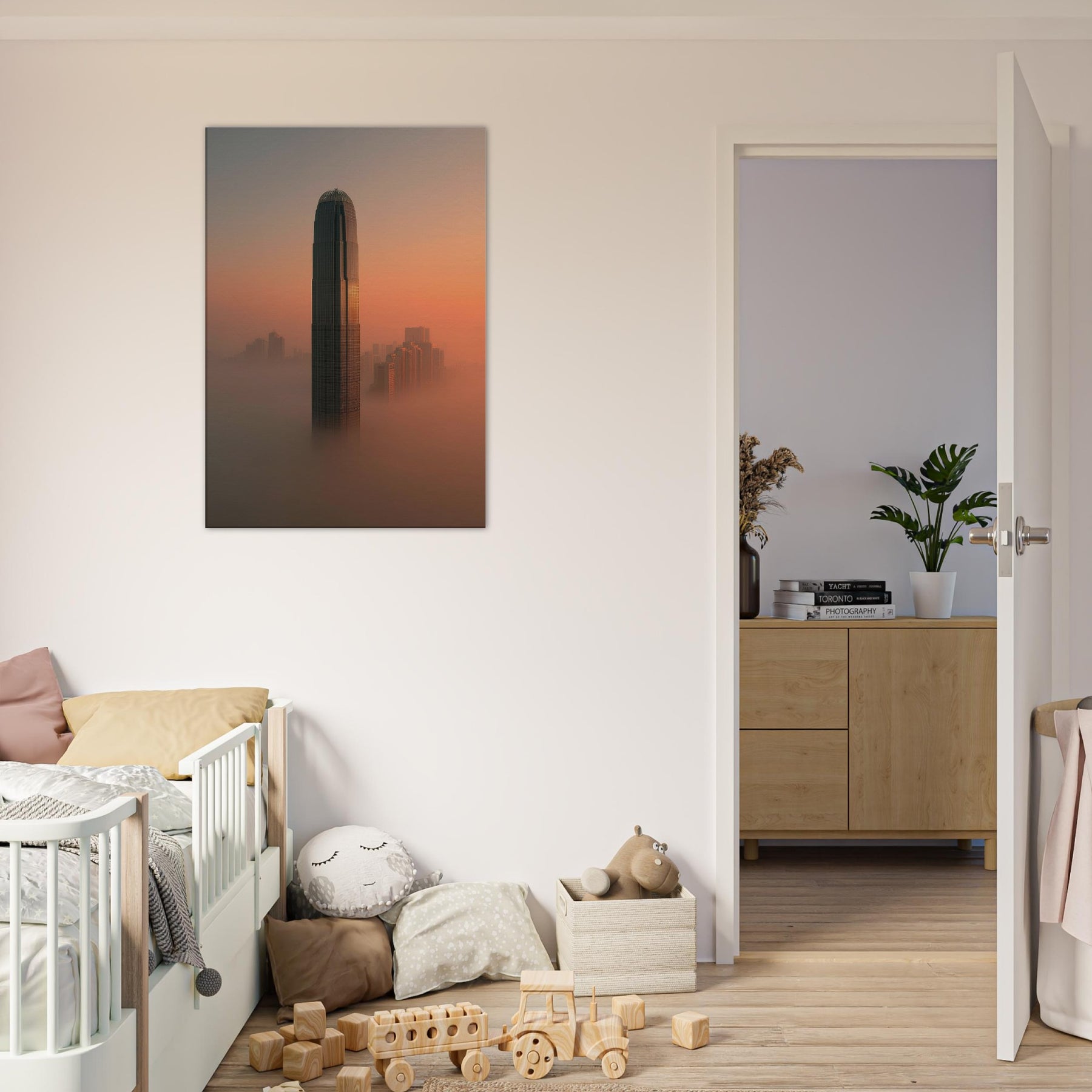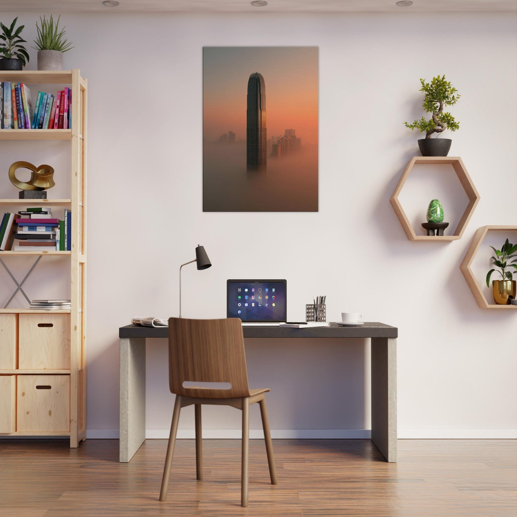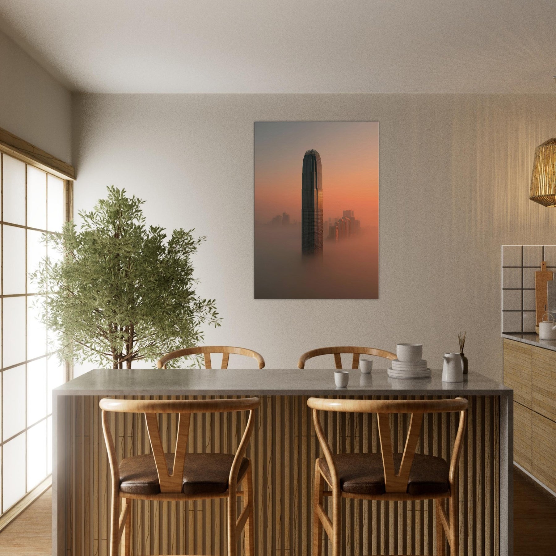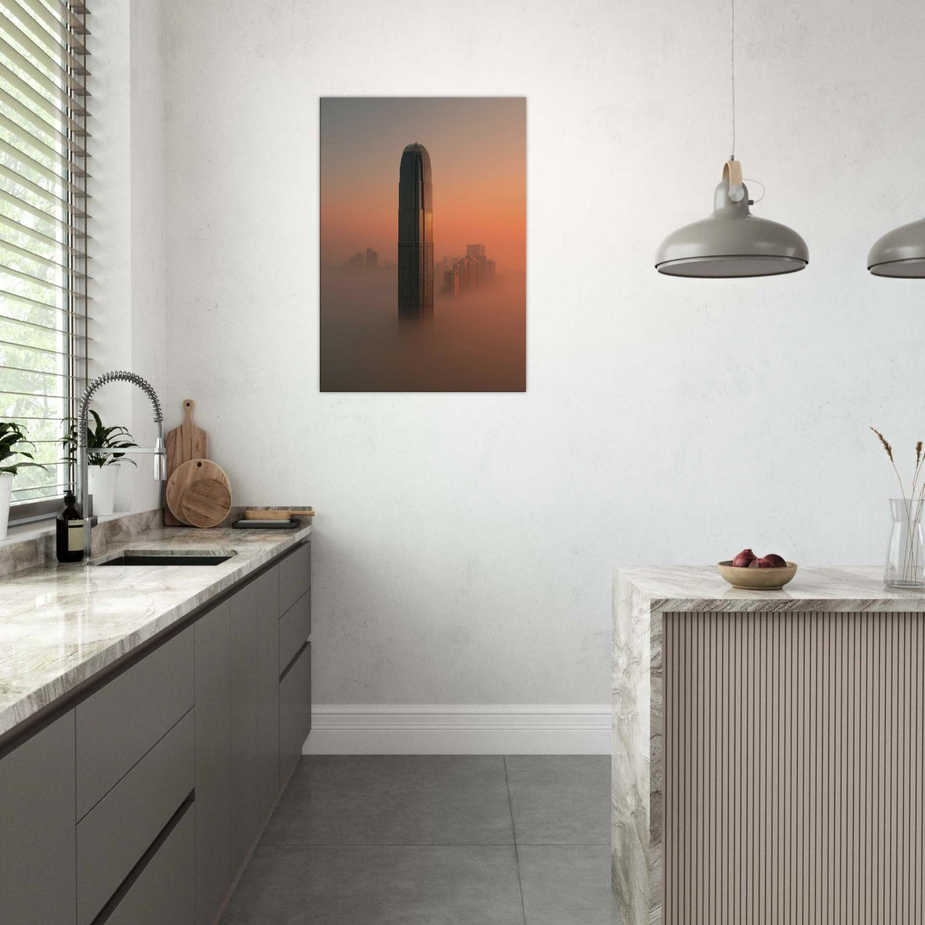 Where fog clings to towering facades and sunset spills along the harbor, this surreal view reimagines Hong Kong as a dream. A solitary tower rises through a coppered sky, while the streets fall away into a luminous mist that softens edges and slows time. The scene invites contemplation: a quiet, meditative space for modern living, where light, texture, and distance mingle. Hang it and the room breathes, hushed, expansive, and endlessly curious, a reminder that cities can dream beside us at night.