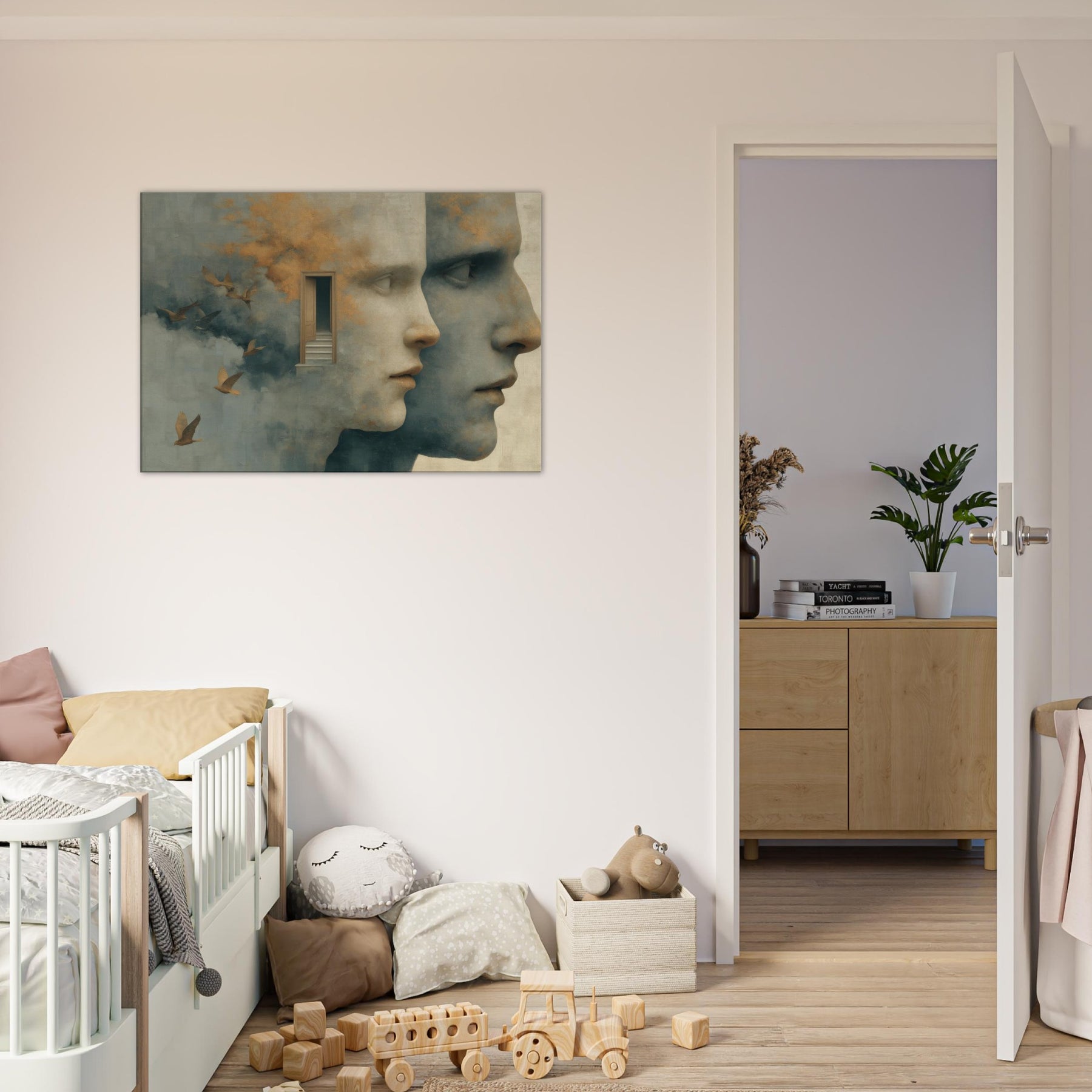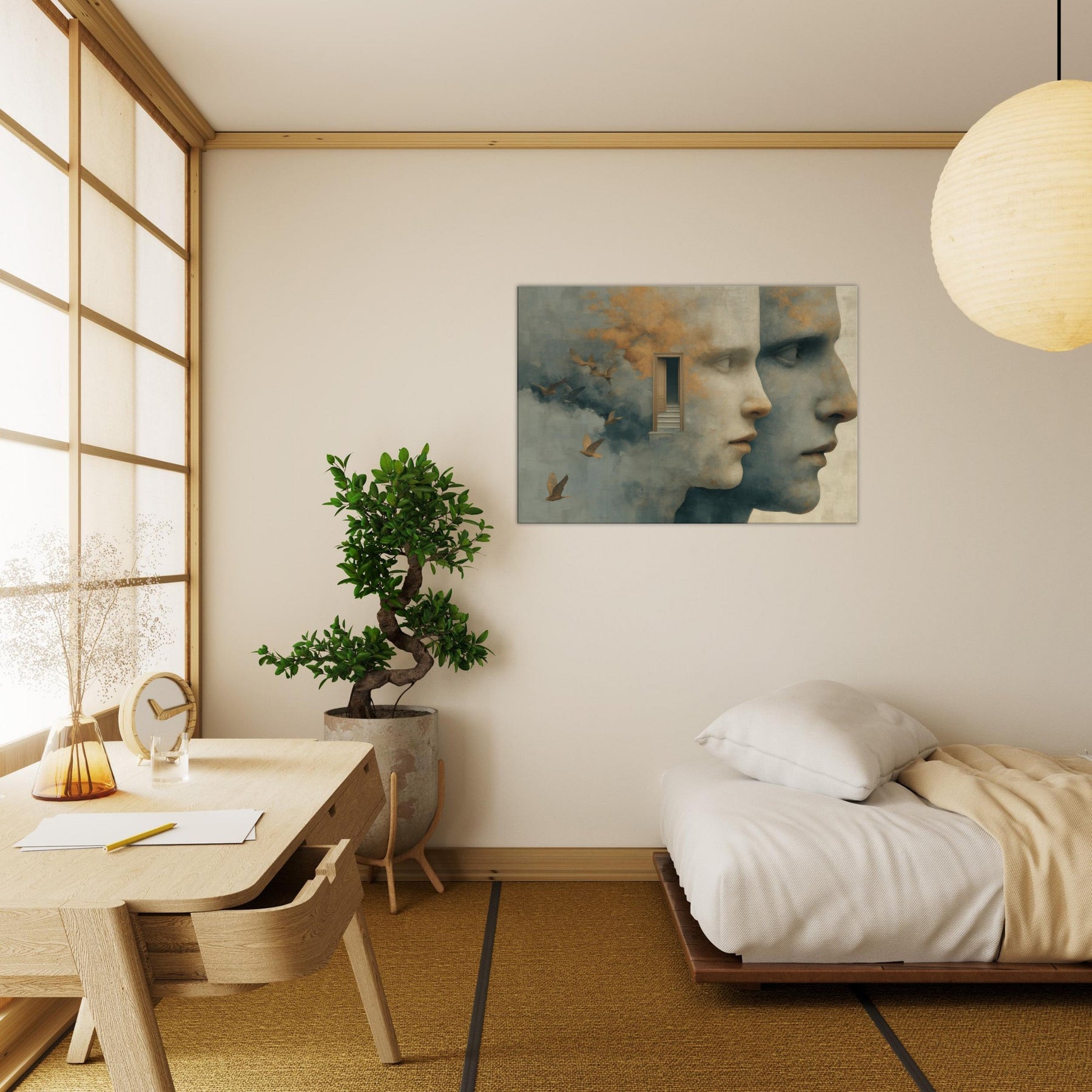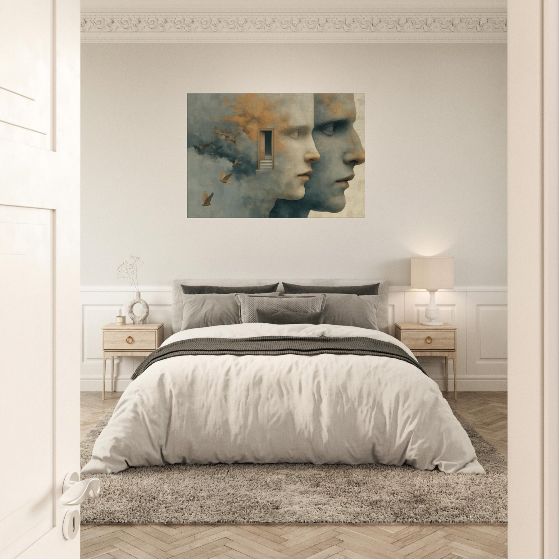 From Mythical Figures (Venus, David) emerges a tranquil chorus of profiles and air: faces drift through a sky of warm ochre and cool blue, while a doorway opens to another realm. Birds wheel by, and the atmosphere takes on a tactile hush. The image invites quiet contemplation and generous shade for conversation. Hang this canvas where light shifts through the day, and let the room soften into a sanctuary of dreamlike presence and refined calm.