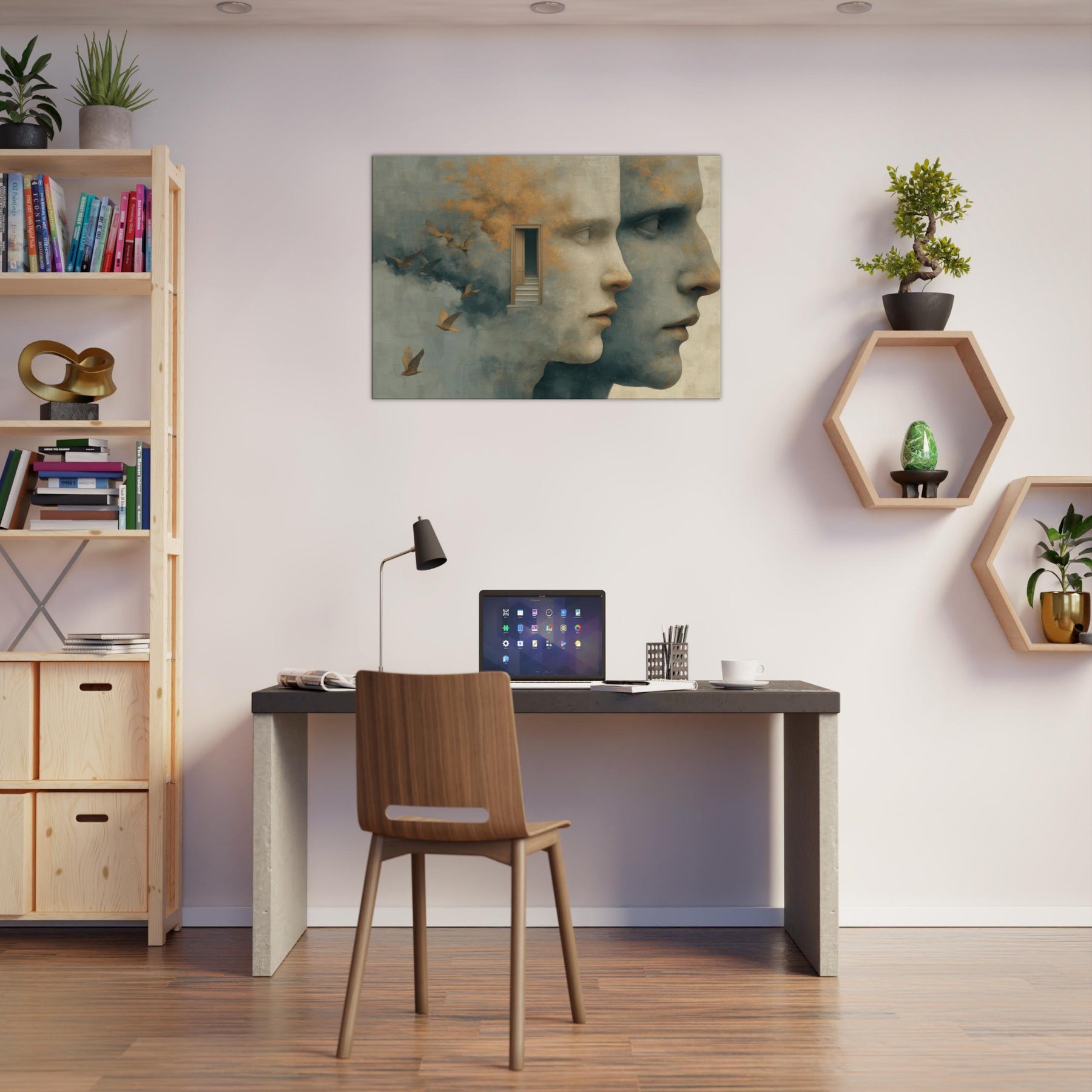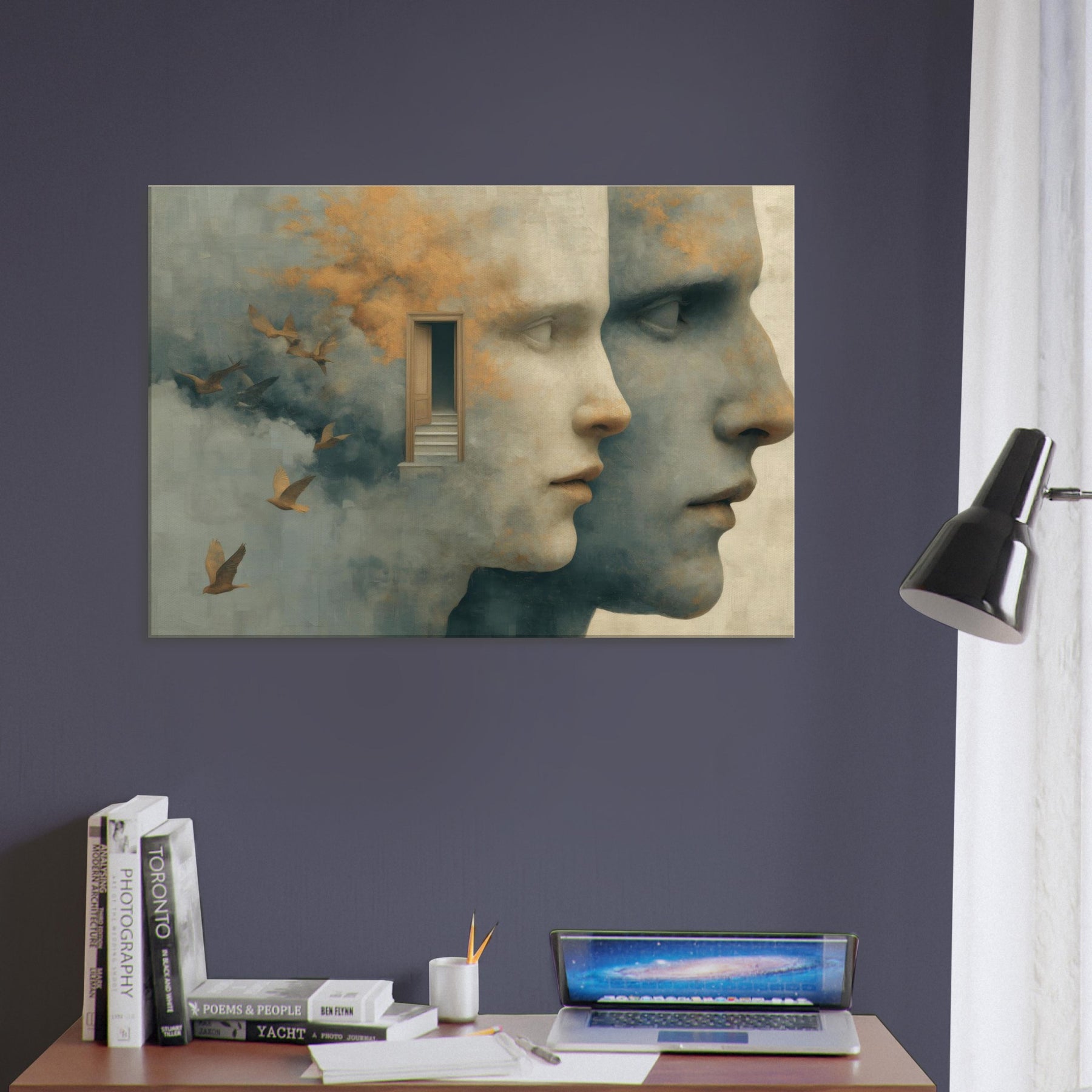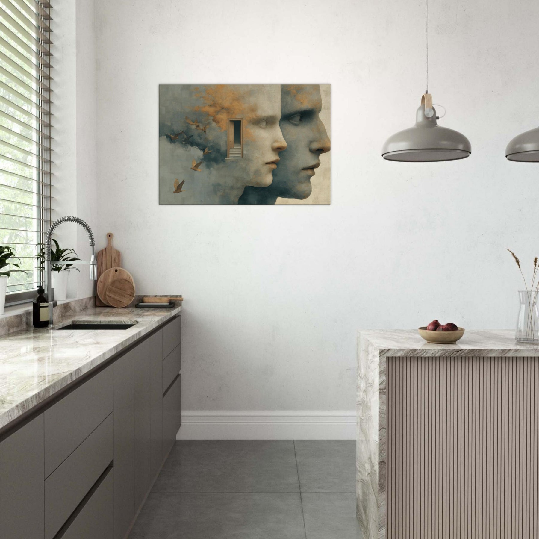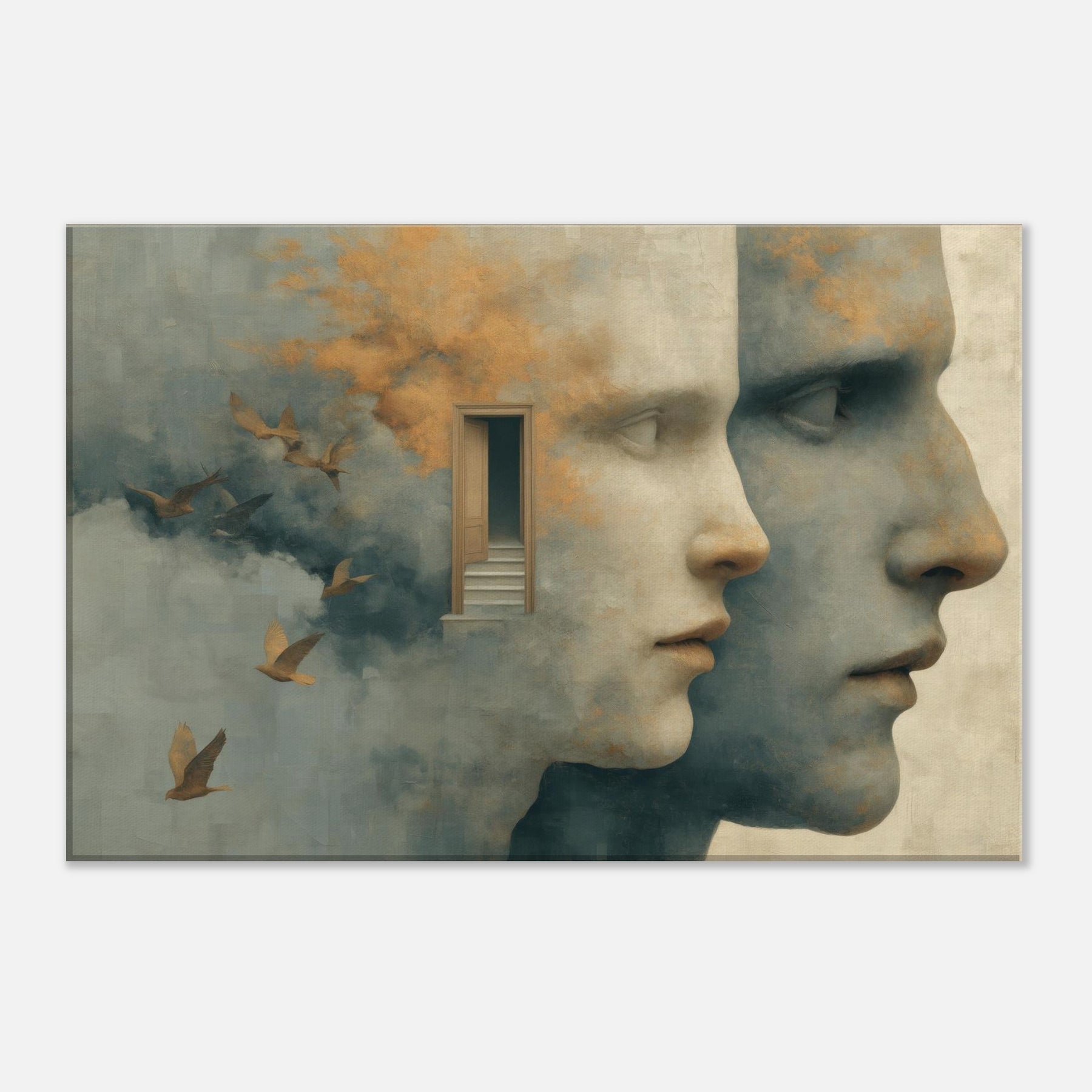 From Mythical Figures (Venus, David) emerges a tranquil chorus of profiles and air: faces drift through a sky of warm ochre and cool blue, while a doorway opens to another realm. Birds wheel by, and the atmosphere takes on a tactile hush. The image invites quiet contemplation and generous shade for conversation. Hang this canvas where light shifts through the day, and let the room soften into a sanctuary of dreamlike presence and refined calm.