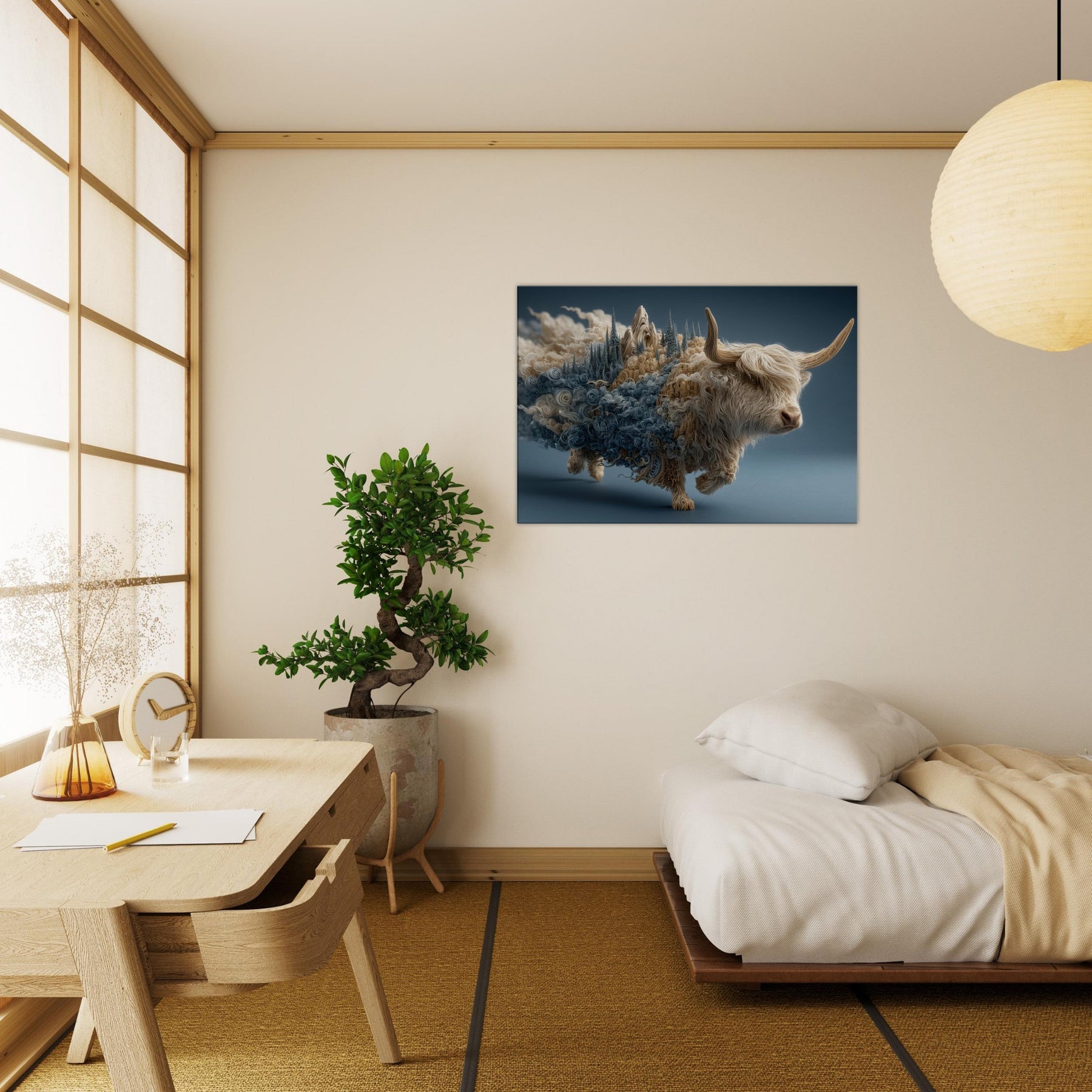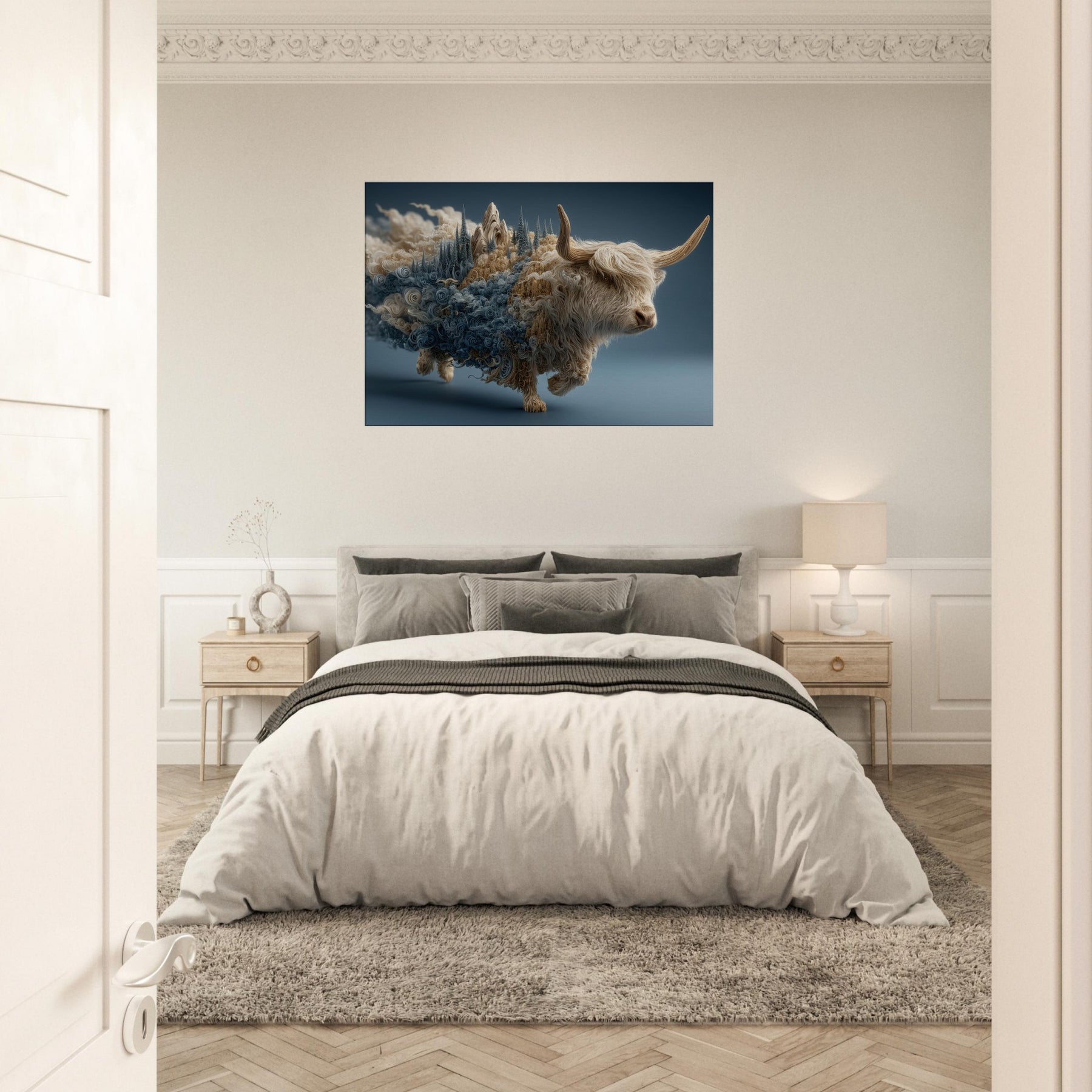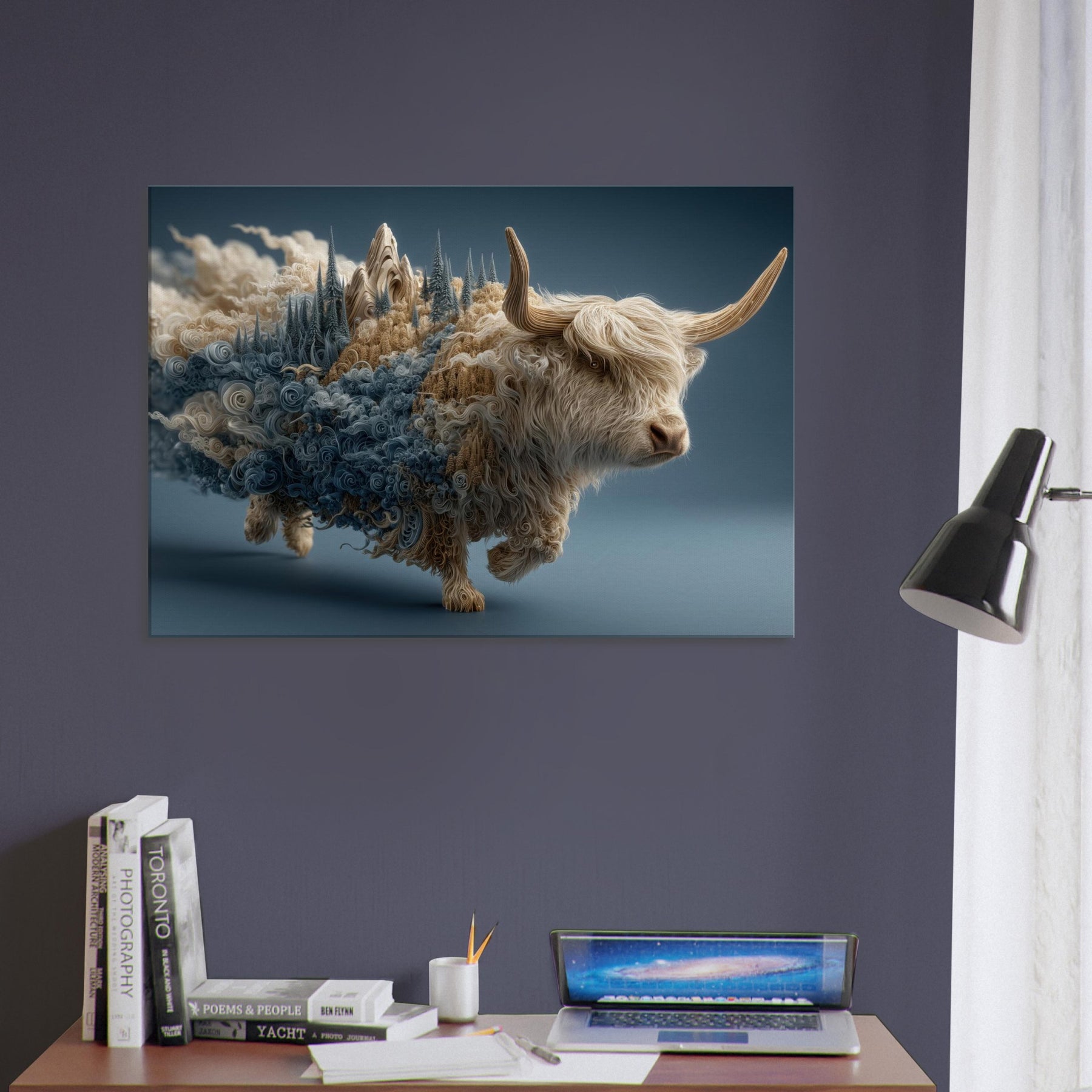 This surreal of a Highland Cow strides through a dreamscape where forests become curls of cloud and mountain forms rise like sculpted waves. The fur blazes with copper and cream, textures weaving landscapes you can almost touch. Dawn Horns sweep across the scene, turning fur into shifting topography. It invites quiet, reflective spaces living rooms, bedrooms, studios where atmosphere matters as much as art. Hang it to slow the pace of daily life, letting light skim the horn and reveal new details in the woolly terrain.