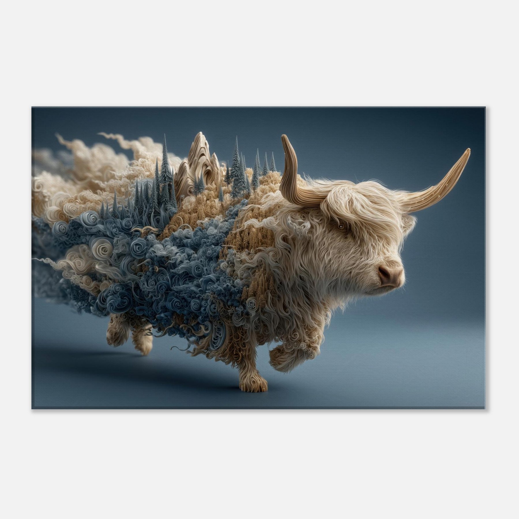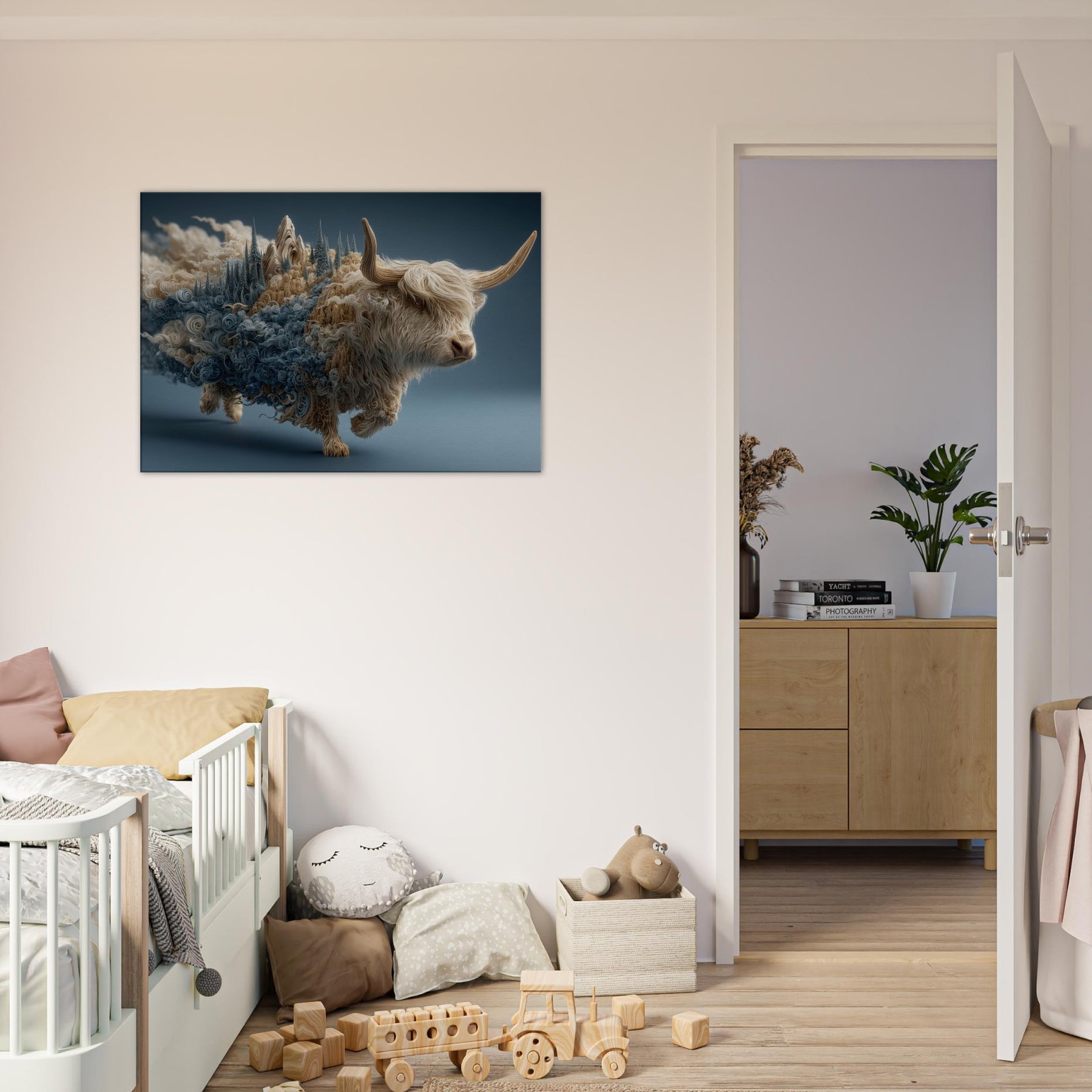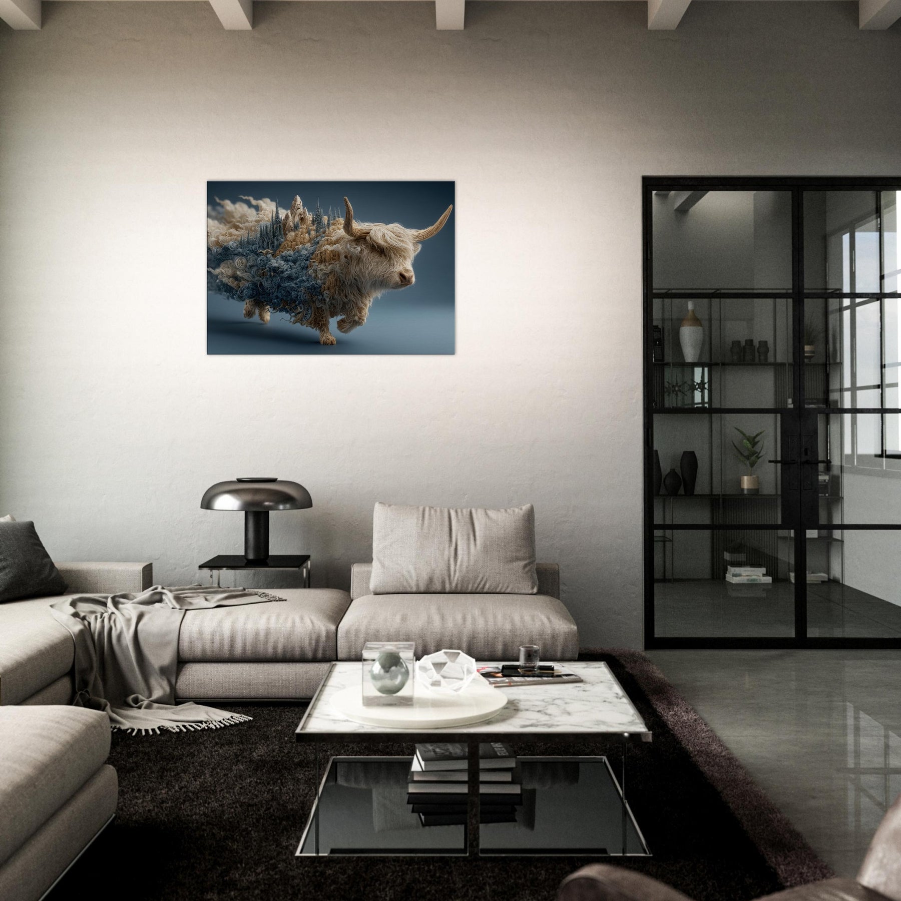 This surreal of a Highland Cow strides through a dreamscape where forests become curls of cloud and mountain forms rise like sculpted waves. The fur blazes with copper and cream, textures weaving landscapes you can almost touch. Dawn Horns sweep across the scene, turning fur into shifting topography. It invites quiet, reflective spaces living rooms, bedrooms, studios where atmosphere matters as much as art. Hang it to slow the pace of daily life, letting light skim the horn and reveal new details in the woolly terrain.