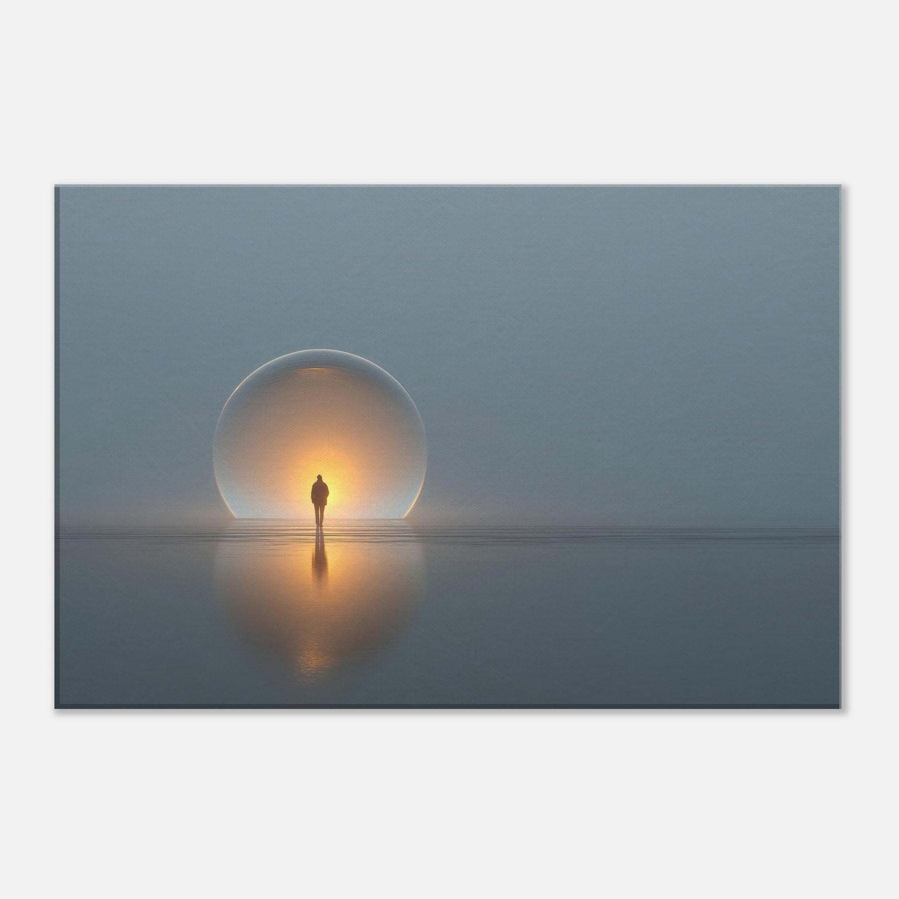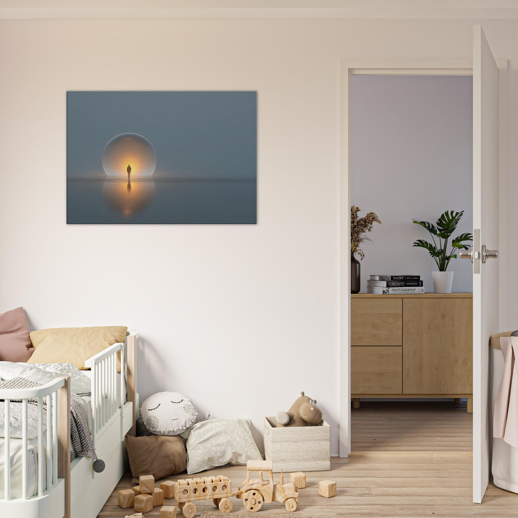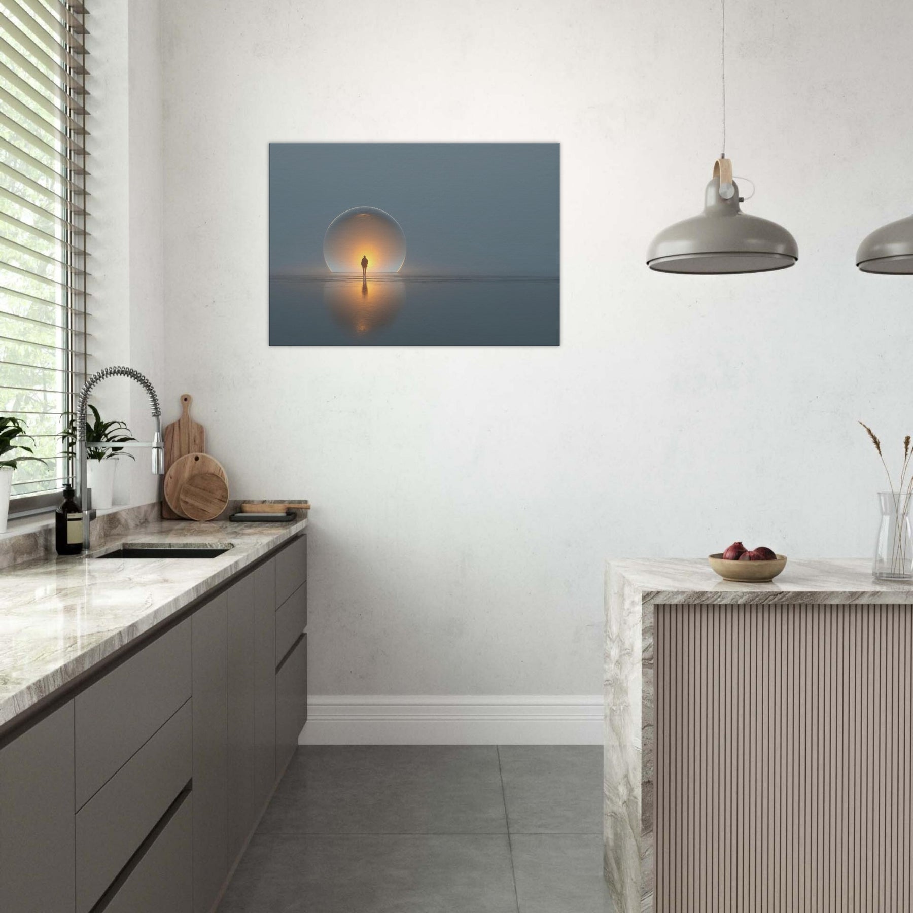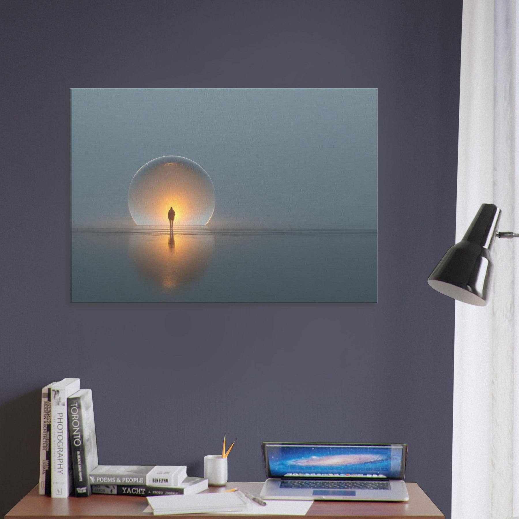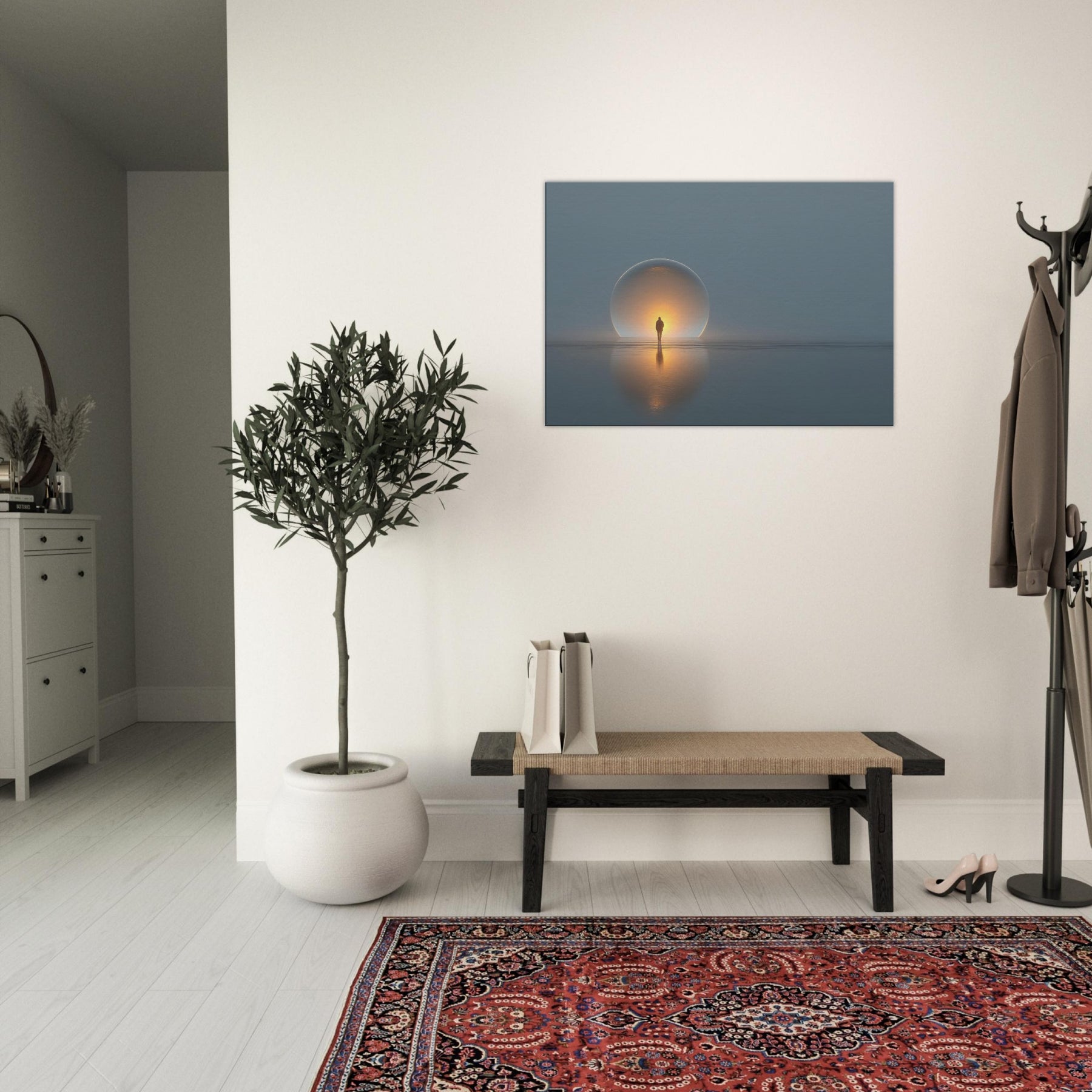 A hush of light gathers around a single figure as a glowing globe silhouette rests on the horizon, a mirror world orbiting the ordinary. This Surrealism inspired piece invites the eye to wander across a calm blue expanse, where warmth blooms from within the sphere and spills into the room. The image feels like a tender encounter between gravity and dream, turning any living space into a quiet sanctuary. Let the Globe Silhouette glow beside you, elevating evenings with reflective serenity.