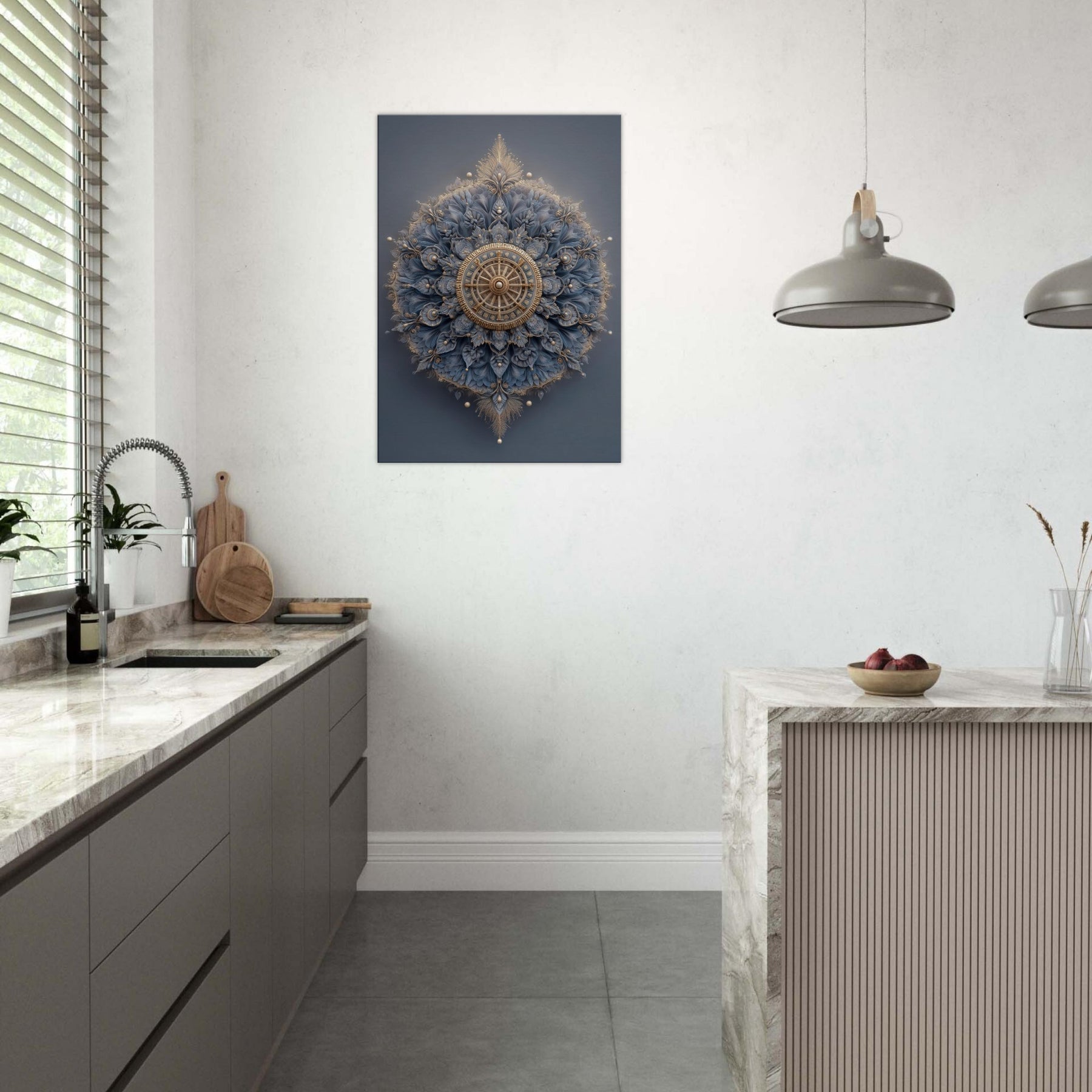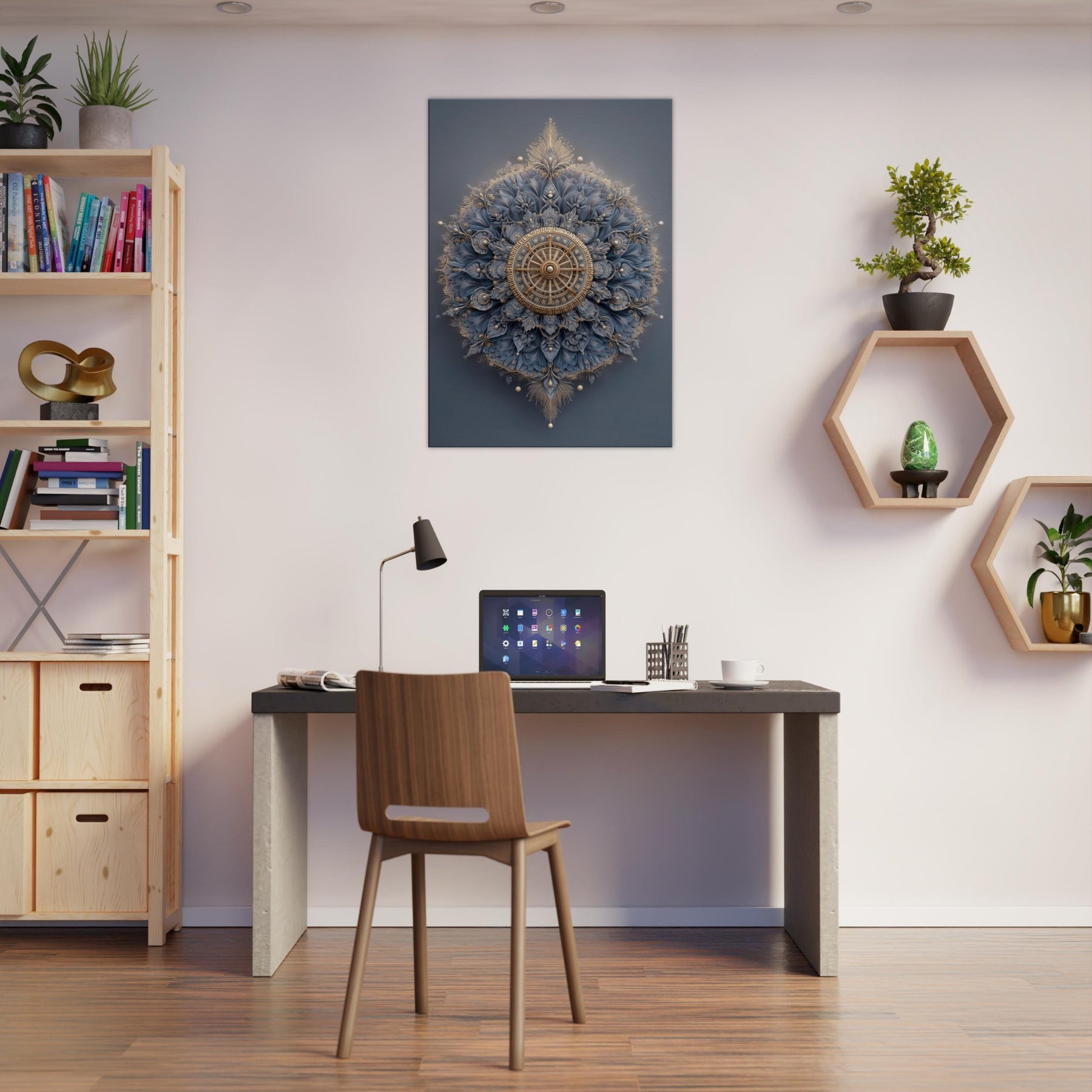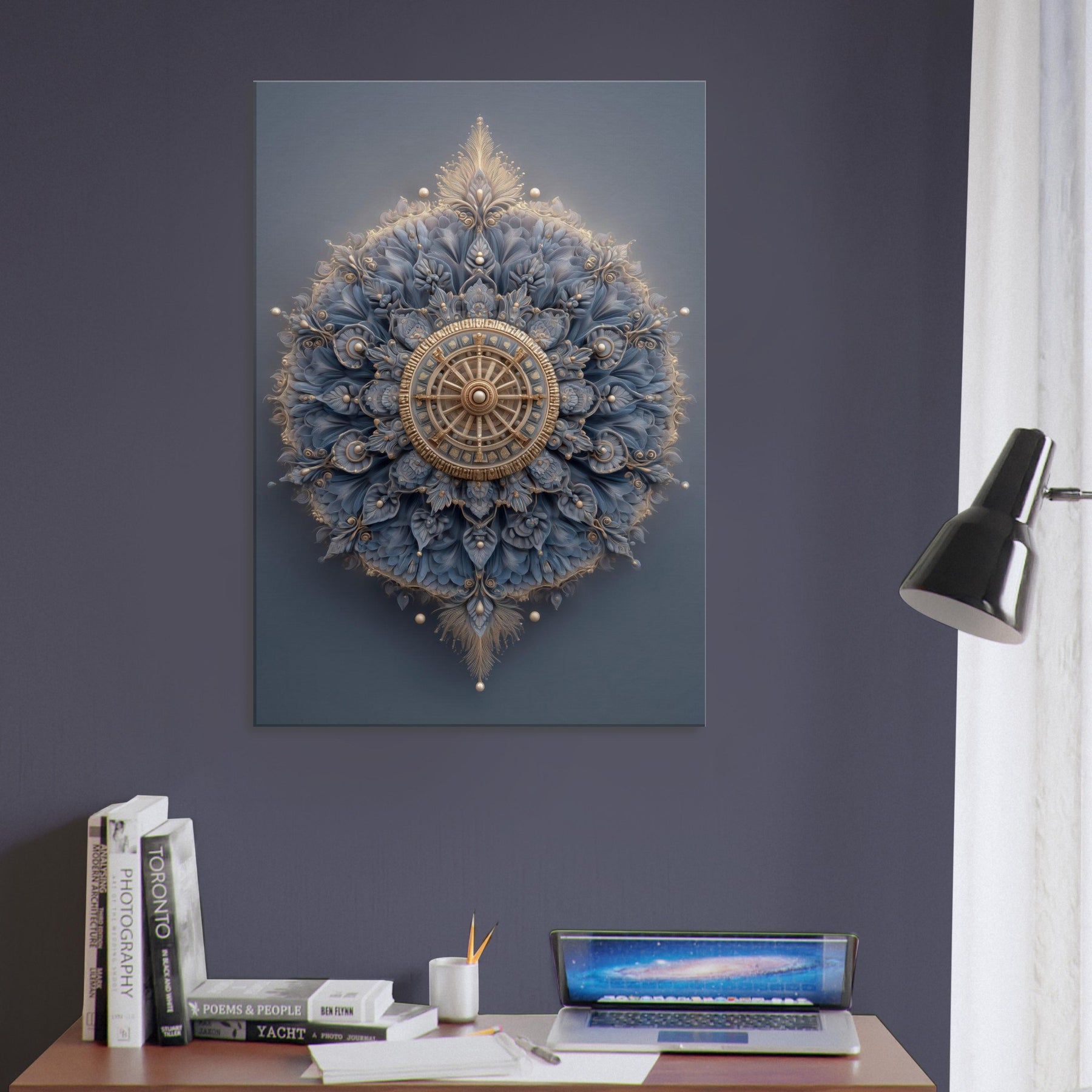 Immerse your space in a meditative orbit where the Dharma Wheel unfolds through dreamlike petals and gilded gears. The blue silver palette glows with quiet radiance, inviting stillness as light traces its celestial patterns. This piece transforms a room into a sanctuary of contemplation, where the rhythm of circles suggests time dissolving into breath. Hang it above a sofa or console to evoke a mystical mood an elegant focal point that nurtures calm, curiosity, and mindful presence in daily life. The central subject is Dharma Wheel (Dharmachakra).