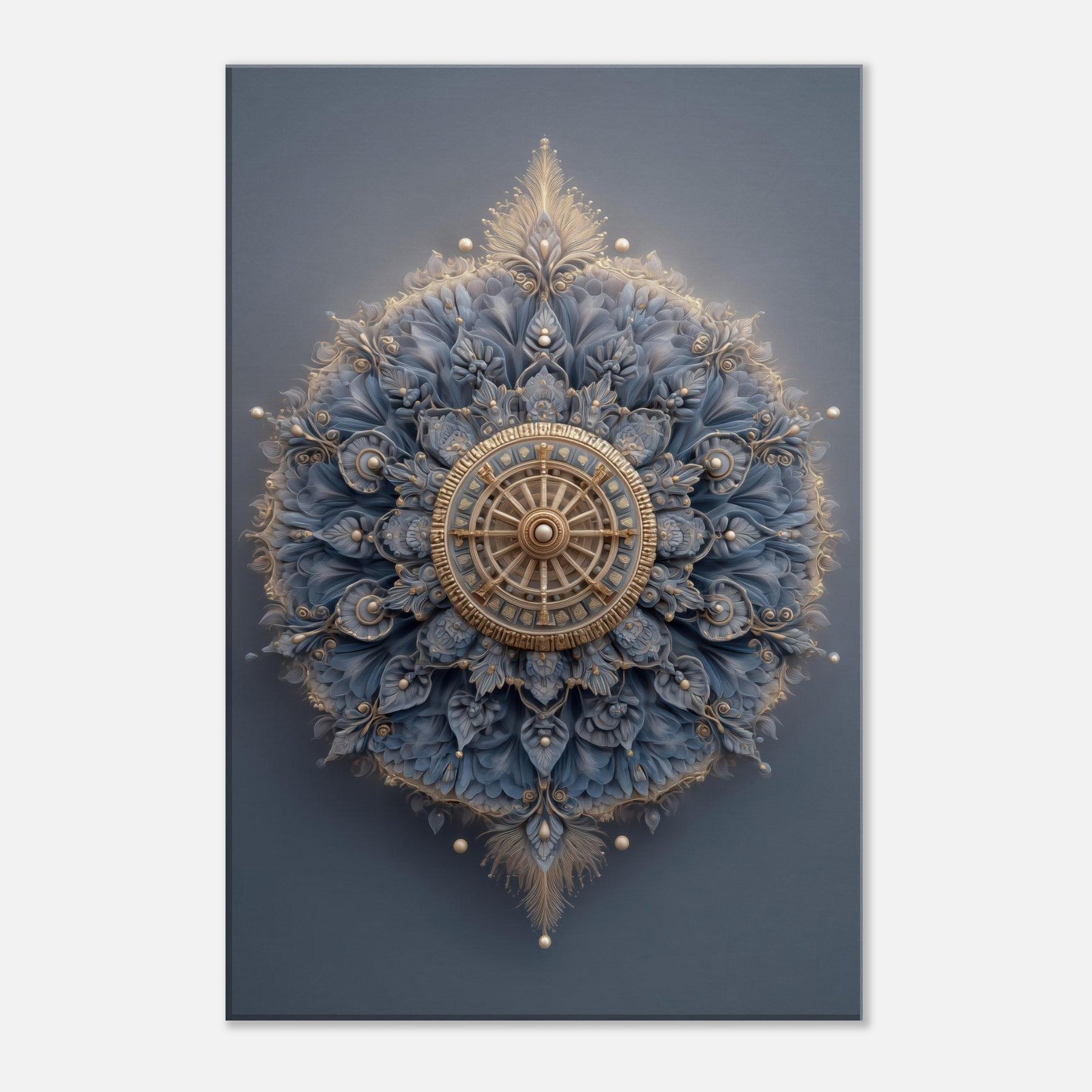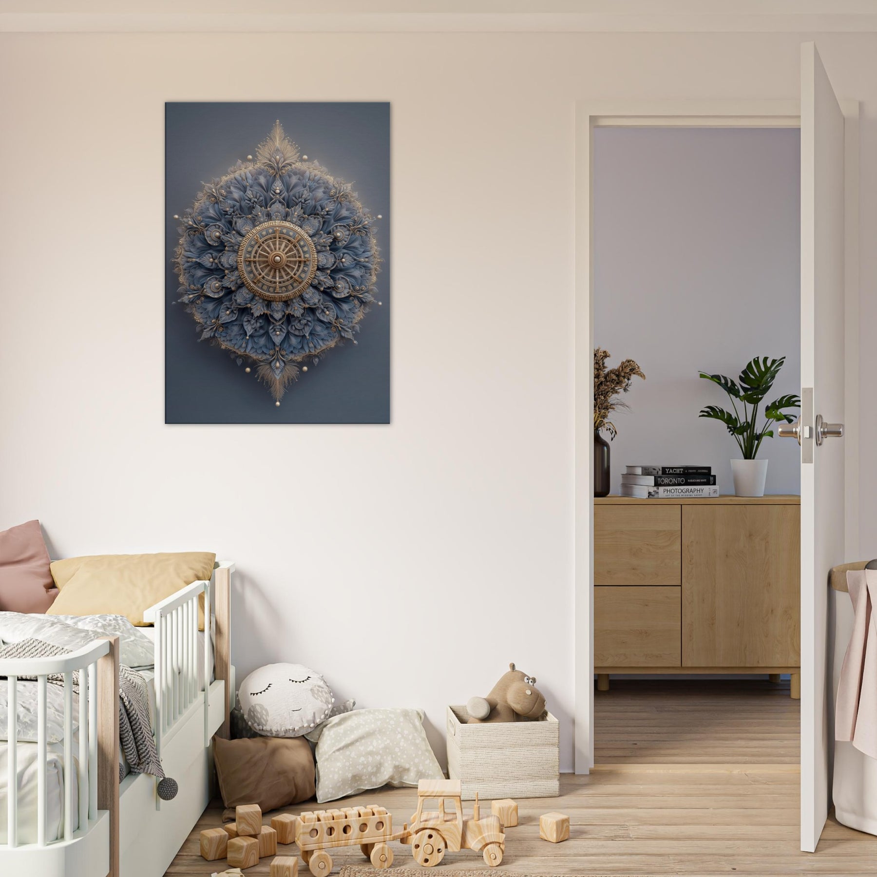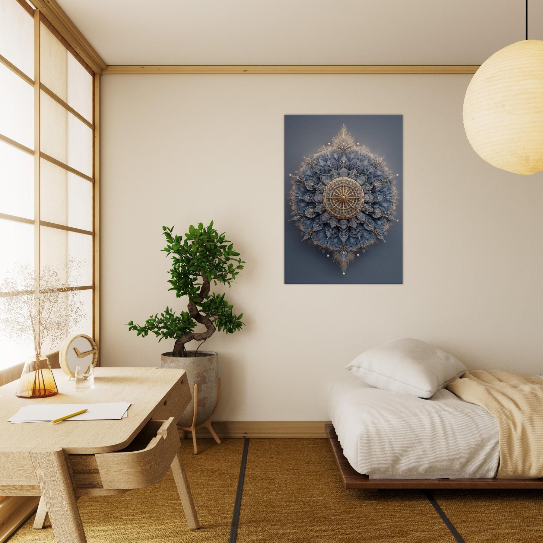 Immerse your space in a meditative orbit where the Dharma Wheel unfolds through dreamlike petals and gilded gears. The blue silver palette glows with quiet radiance, inviting stillness as light traces its celestial patterns. This piece transforms a room into a sanctuary of contemplation, where the rhythm of circles suggests time dissolving into breath. Hang it above a sofa or console to evoke a mystical mood an elegant focal point that nurtures calm, curiosity, and mindful presence in daily life. The central subject is Dharma Wheel (Dharmachakra).