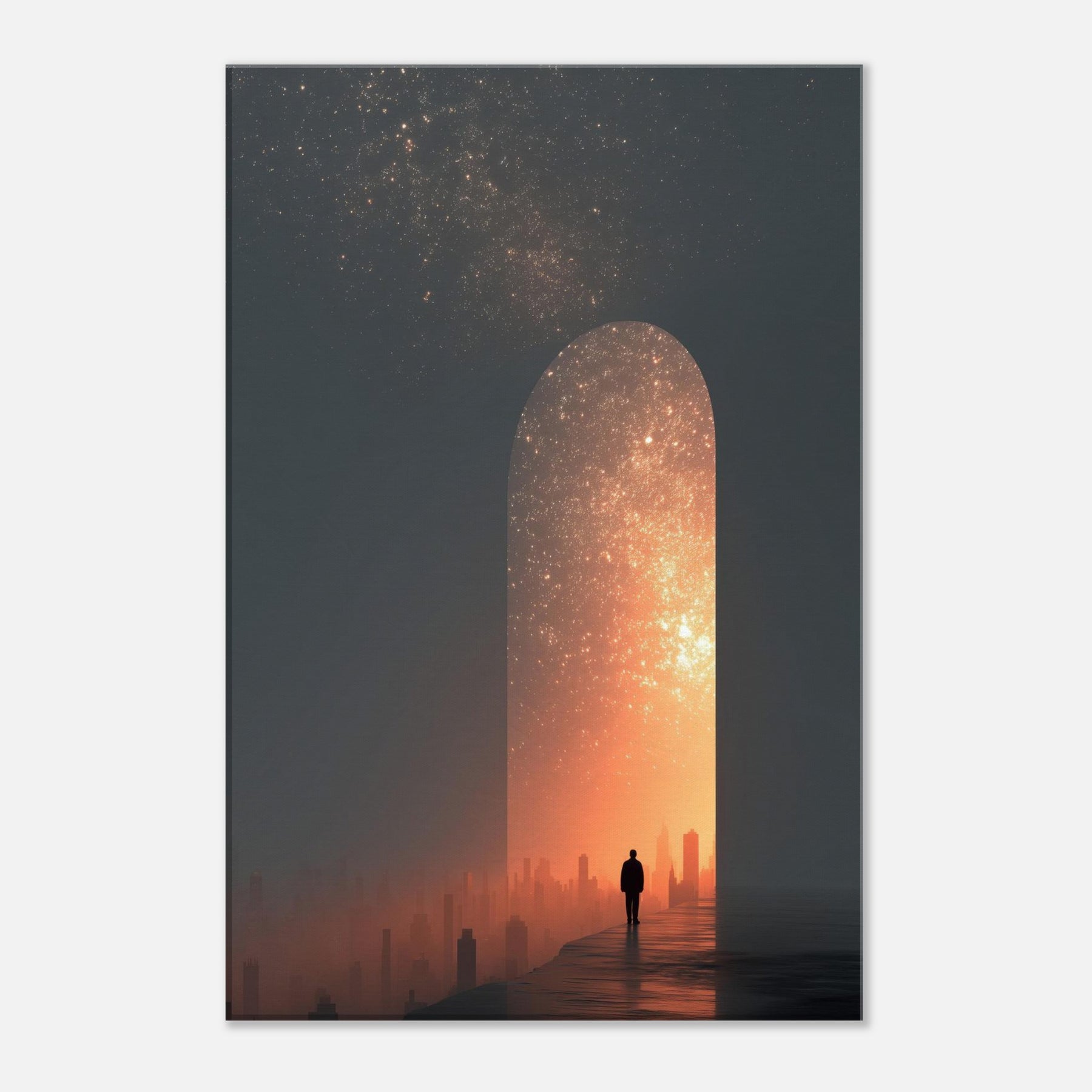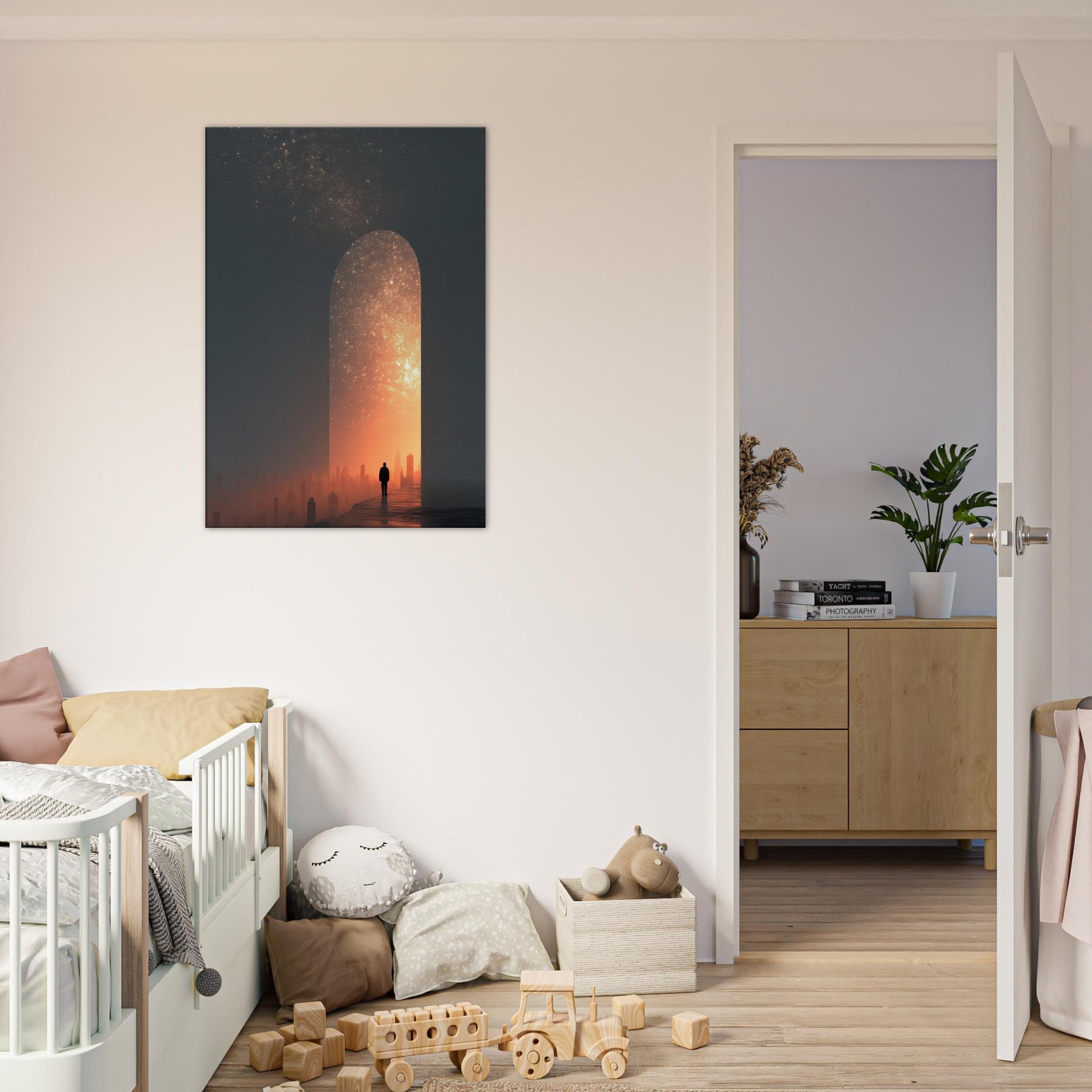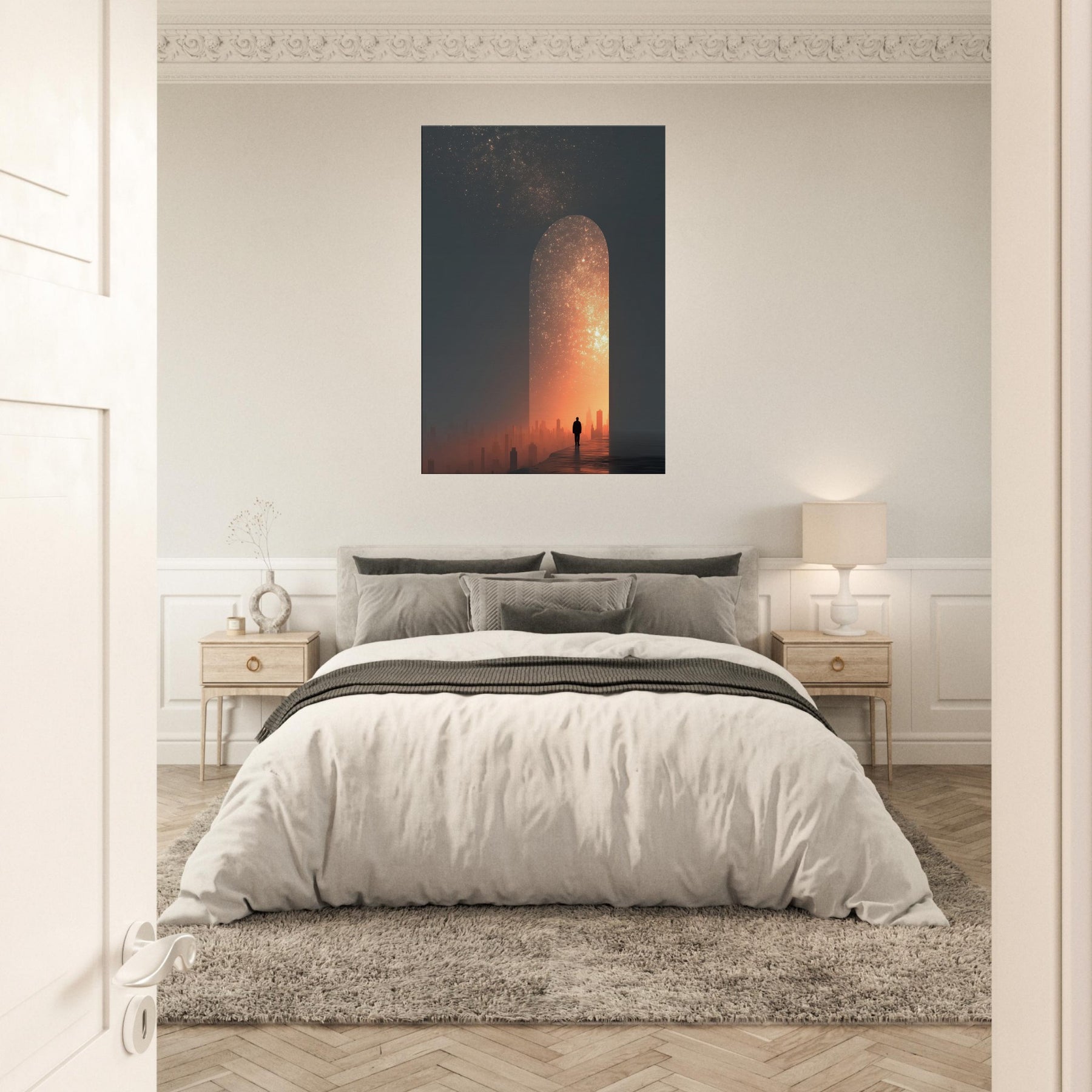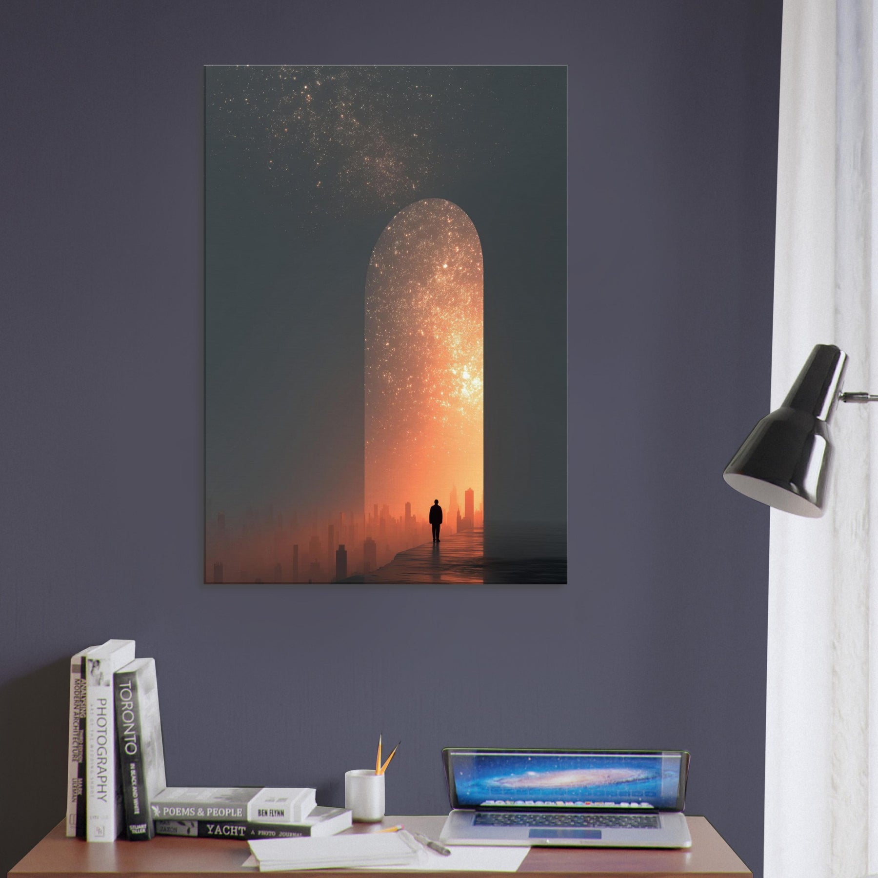 Step into a reverie where a solitary figure meets a luminous arch that folds the skyline into a dream. The Old City Doorway glows with ember and ash, refracting memory into stars as if time itself loosened its grip. Surreal light pools along shadowed streets, inviting quiet reflection and a sense of expansive space. This piece sinks into living rooms with a soft warmth, pairing metal and velvet tones with modern furnishings to spark conversation and calm, day or night.