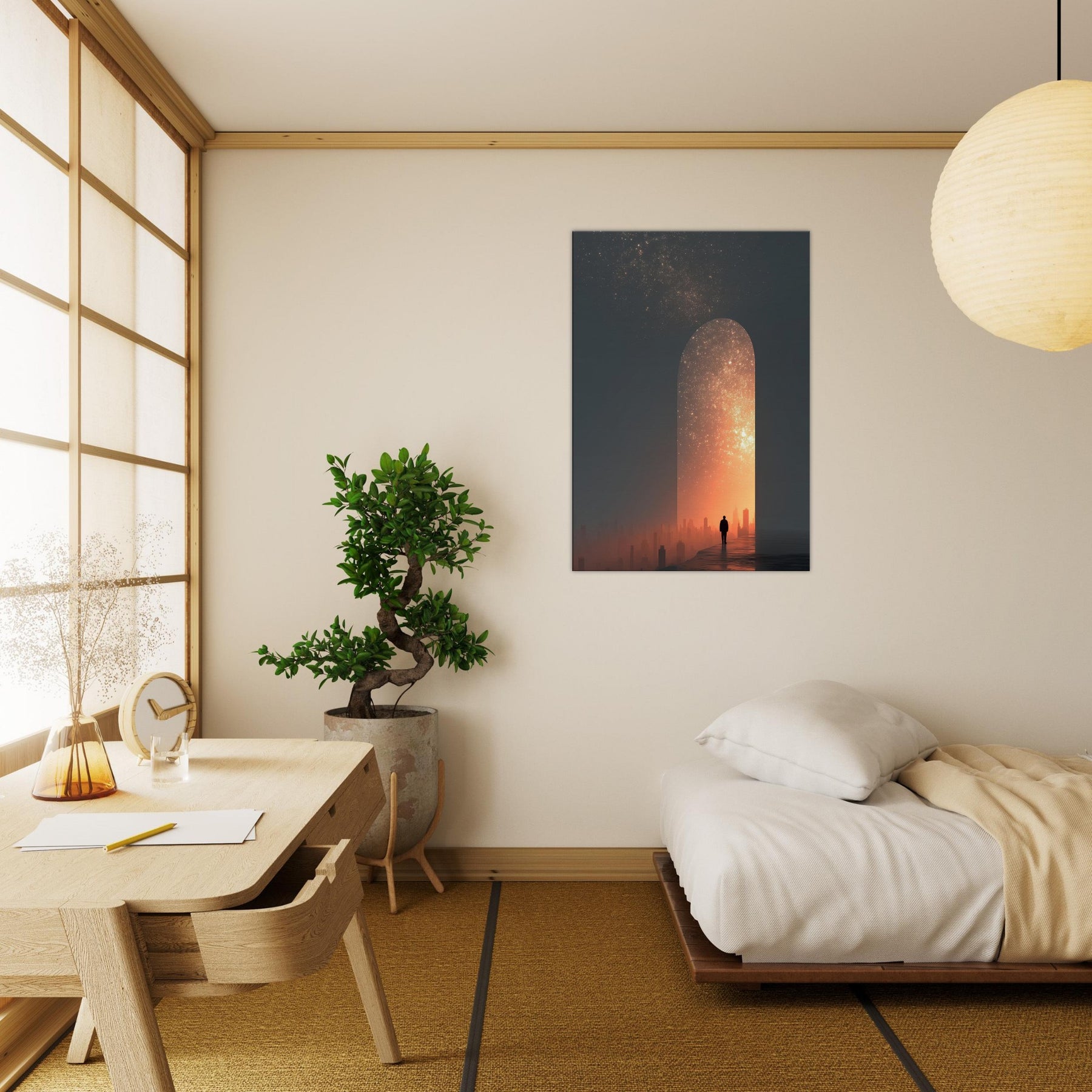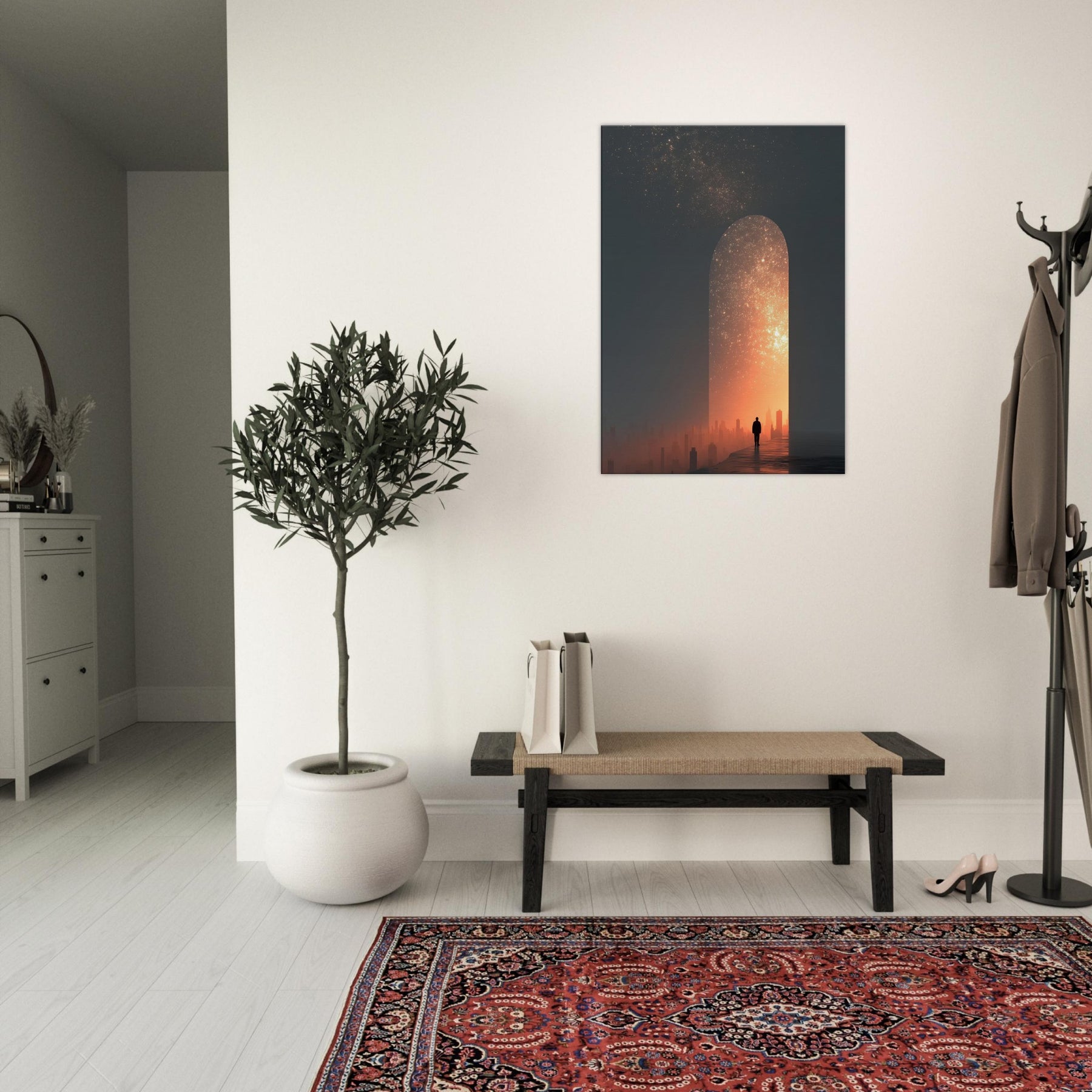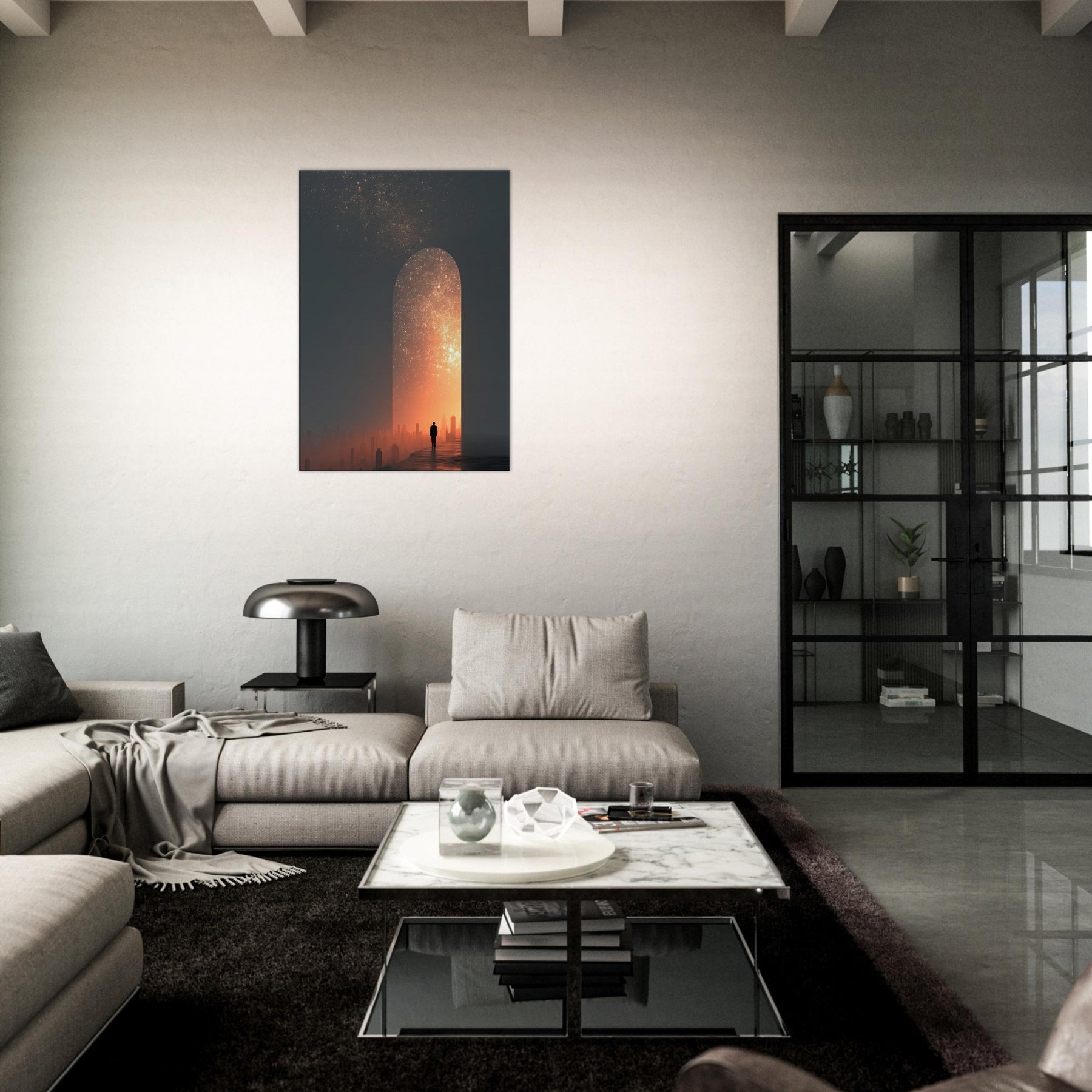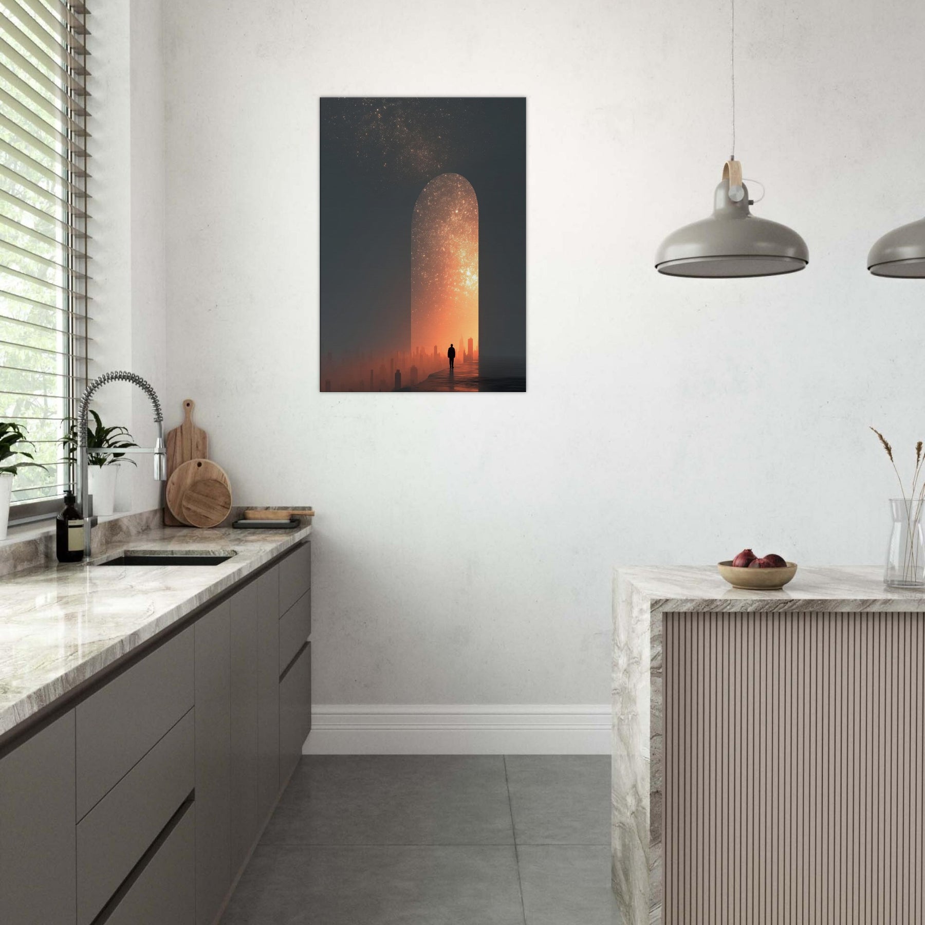 Step into a reverie where a solitary figure meets a luminous arch that folds the skyline into a dream. The Old City Doorway glows with ember and ash, refracting memory into stars as if time itself loosened its grip. Surreal light pools along shadowed streets, inviting quiet reflection and a sense of expansive space. This piece sinks into living rooms with a soft warmth, pairing metal and velvet tones with modern furnishings to spark conversation and calm, day or night.