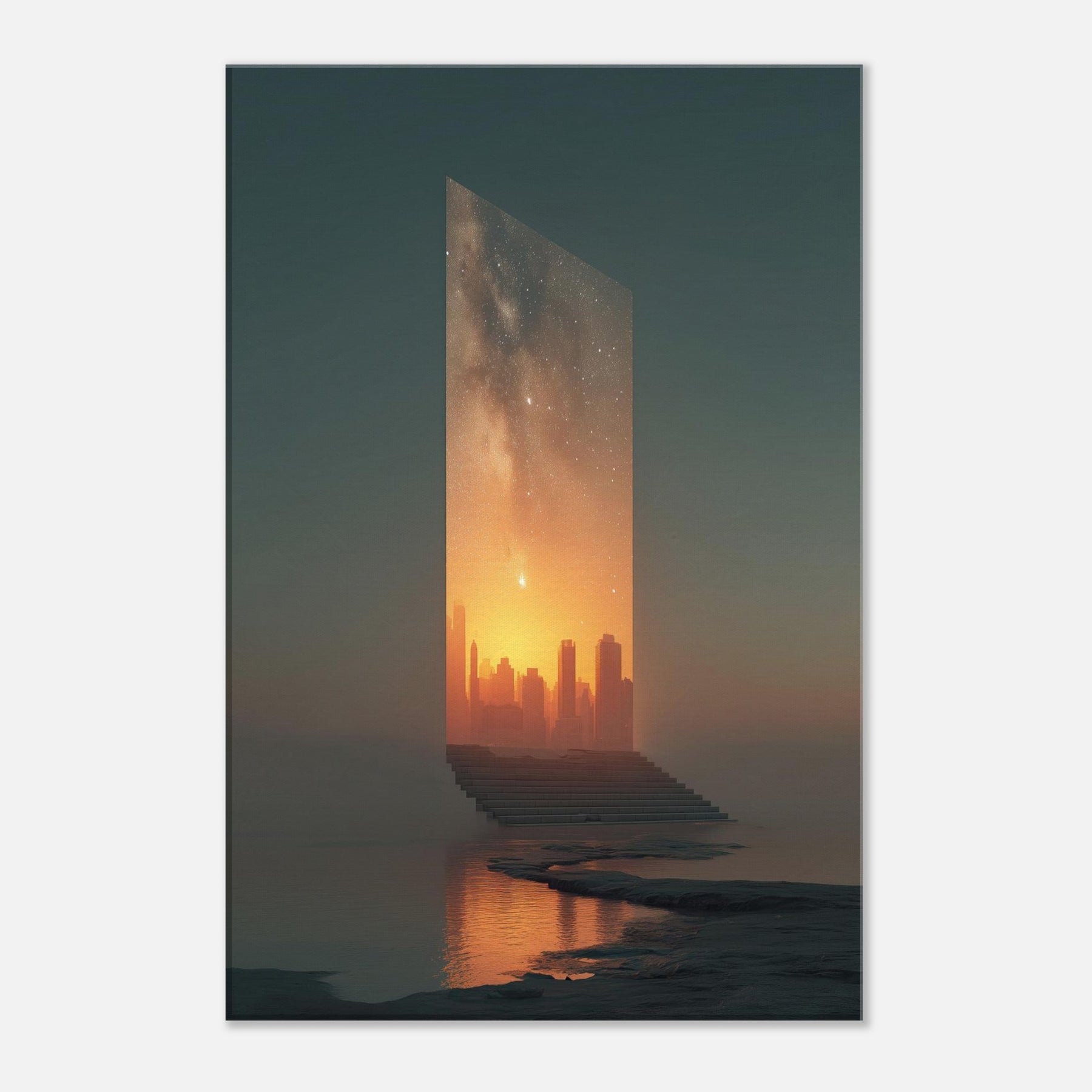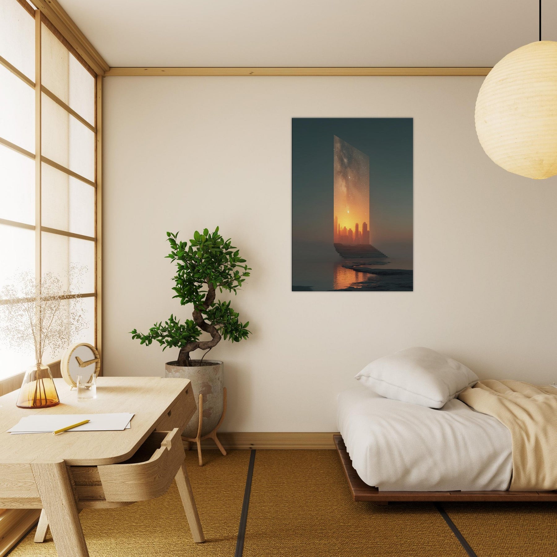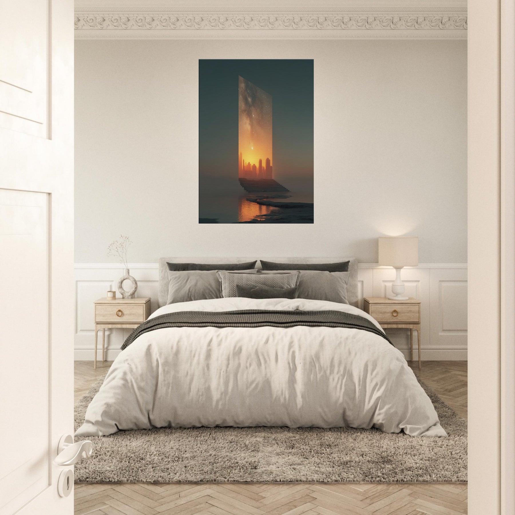 New York stands transformed as a dreamlike beacon, a portal drifting above still water. Inside the gleaming frame, the skyline glows with sunset gold while a starry sky spills into the air, inviting quiet awe. This surreal composition bathes a room in warmth and possibility, where footsteps echo on invisible stairs and the city breathes behind glass. Hang it to anchor a living space with mystery, texture, and a cinematic, double exposure atmosphere.