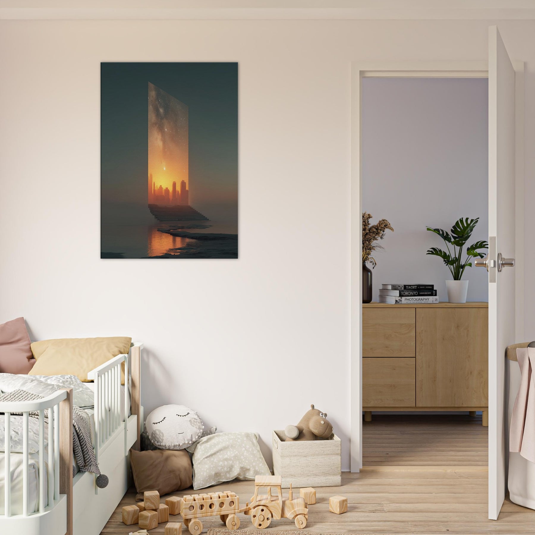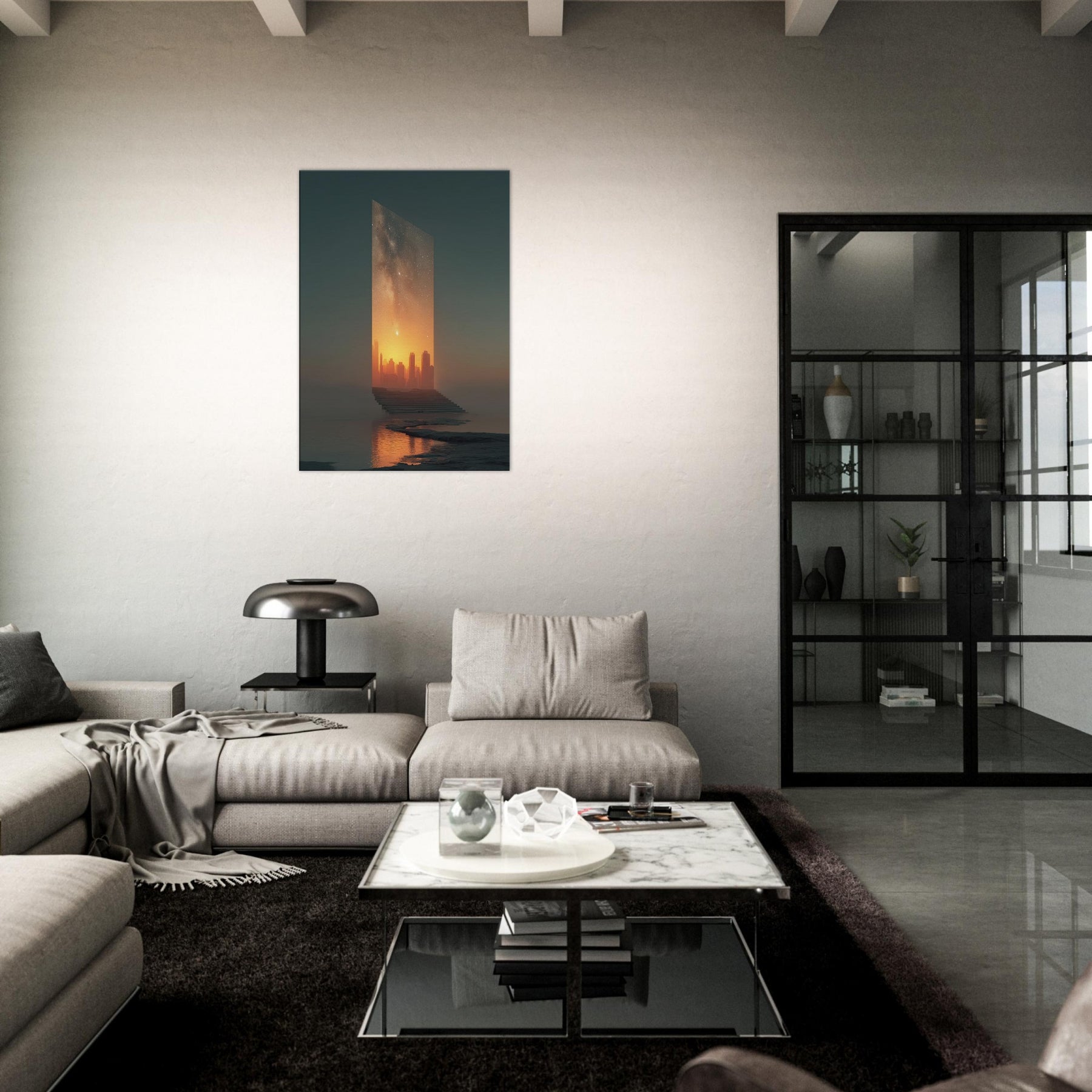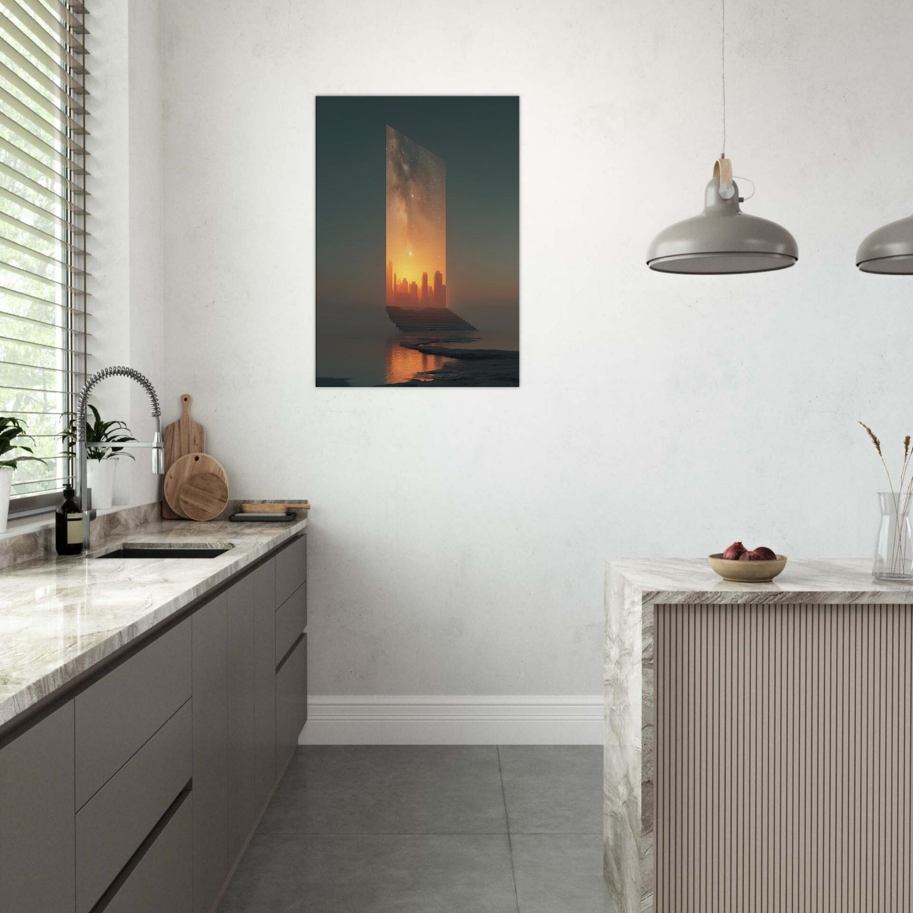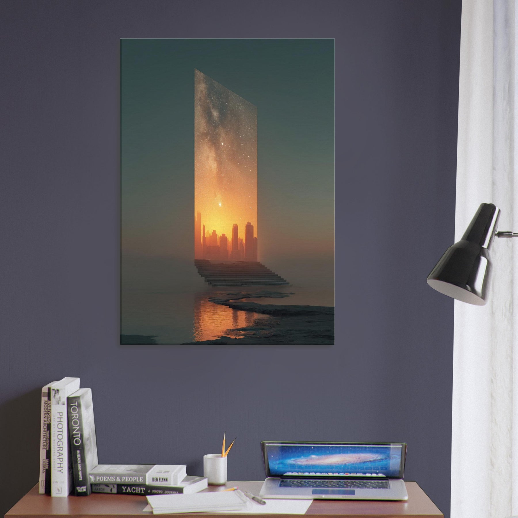 New York stands transformed as a dreamlike beacon, a portal drifting above still water. Inside the gleaming frame, the skyline glows with sunset gold while a starry sky spills into the air, inviting quiet awe. This surreal composition bathes a room in warmth and possibility, where footsteps echo on invisible stairs and the city breathes behind glass. Hang it to anchor a living space with mystery, texture, and a cinematic, double exposure atmosphere.