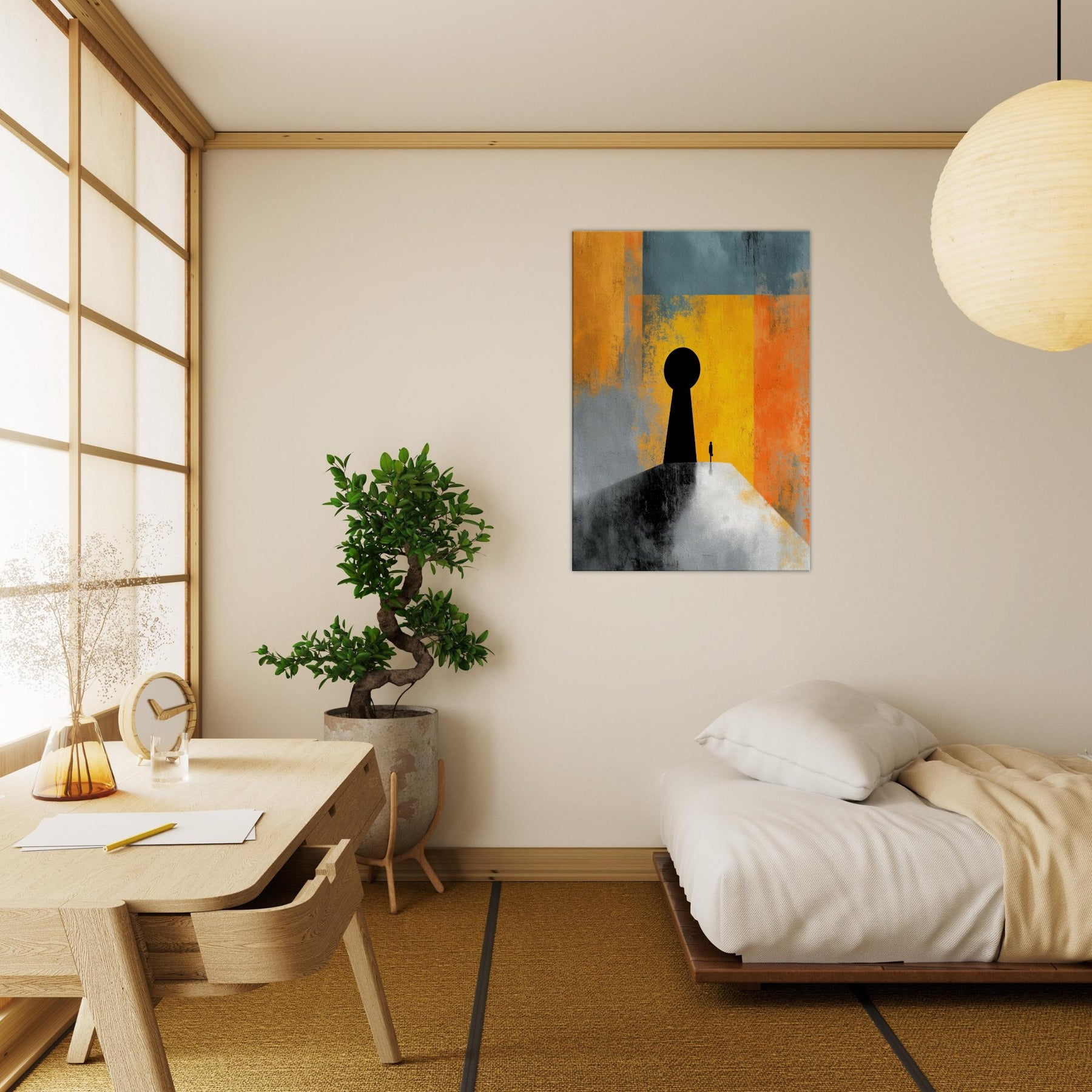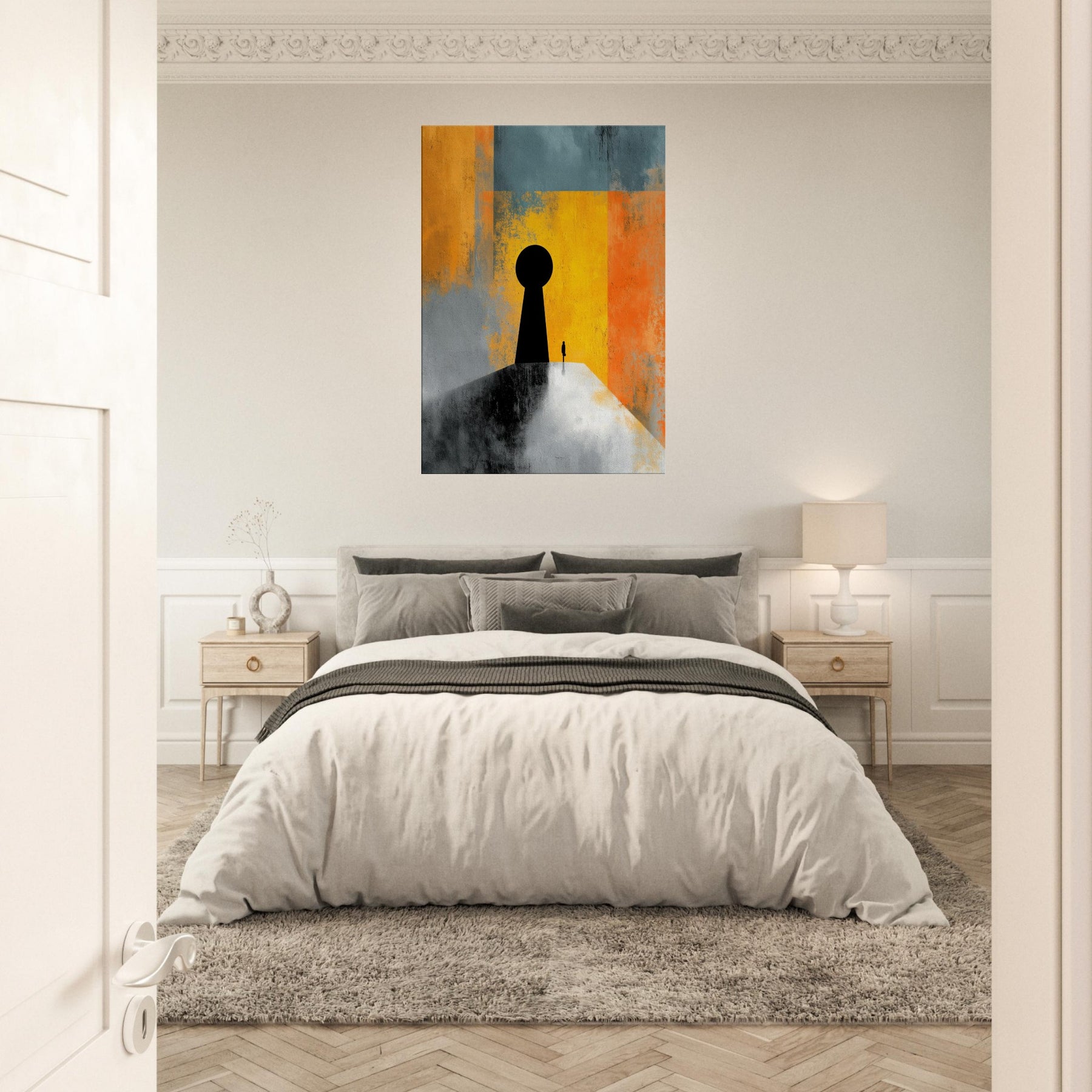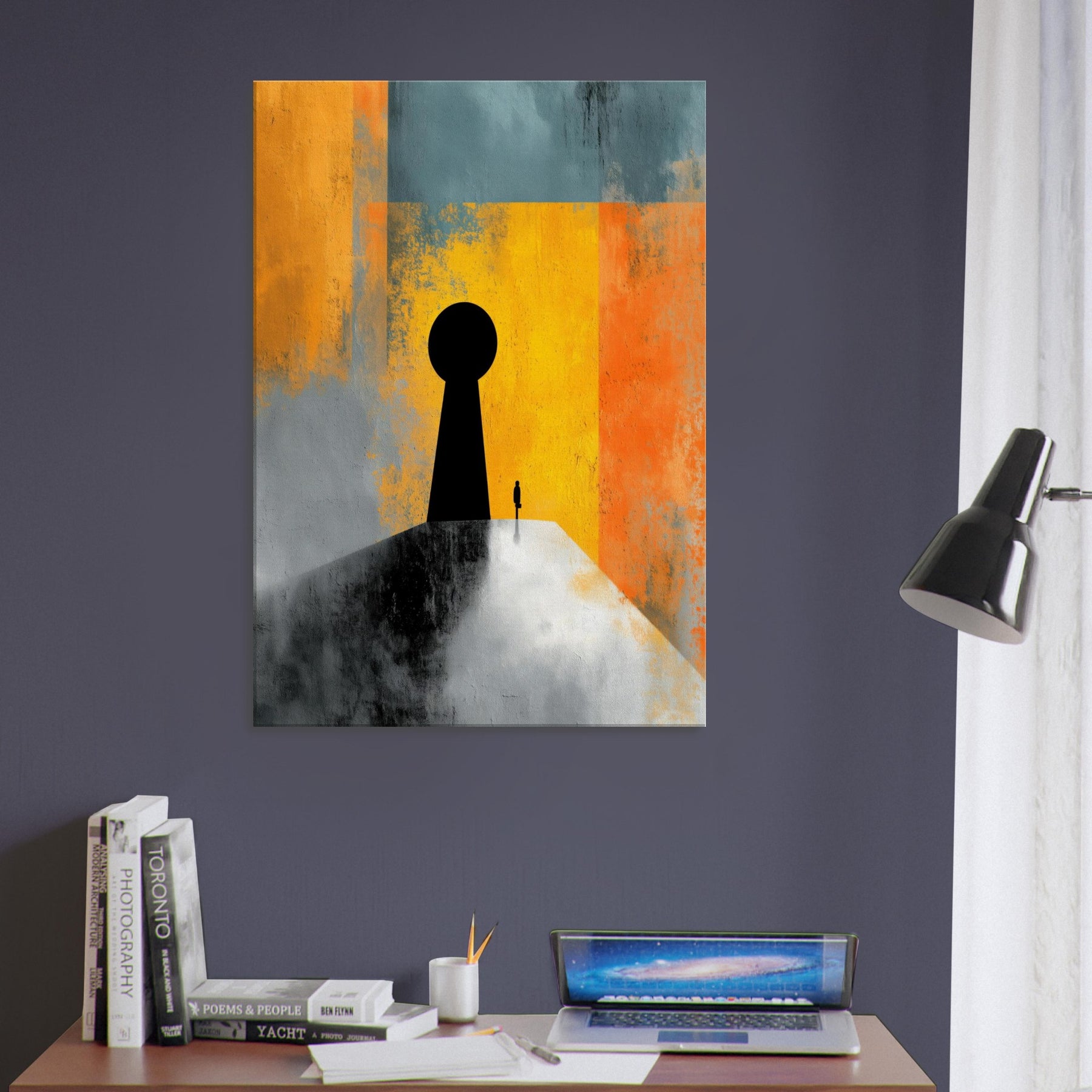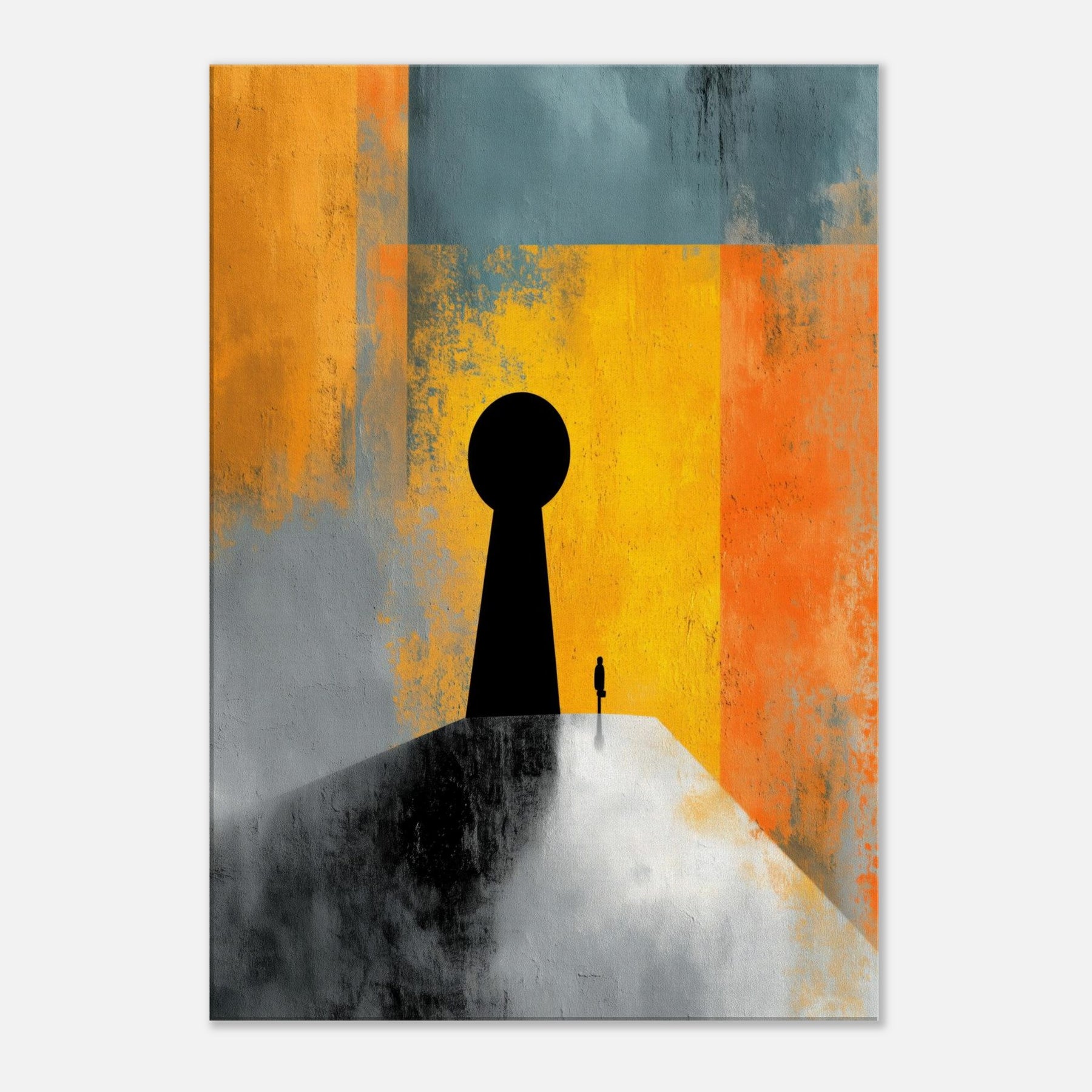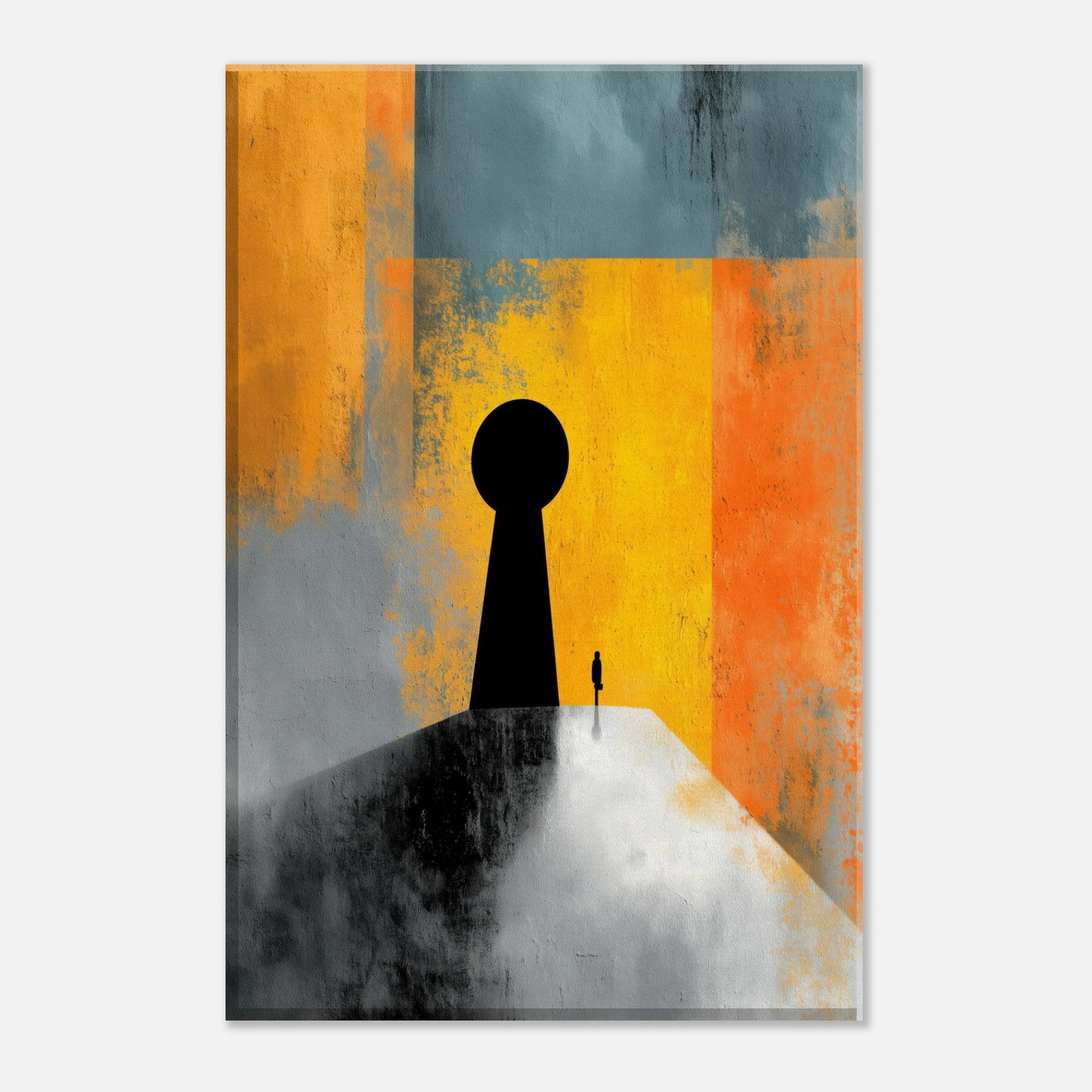 Key & Keyhole rises as a quiet portal in a storm of color, a surreal beacon that bridges private space and distant possibility. A towering black silhouette anchors a lone figure before a vast keyhole, while bands of sunlit yellow, orange, and teal dissolve into memory and dream. This painting invites stillness, inviting you to pause at thresholds of imagination. In a living space it becomes a dramatic focal point an intimate light in the room's rhythm, guiding conversation and contemplation.