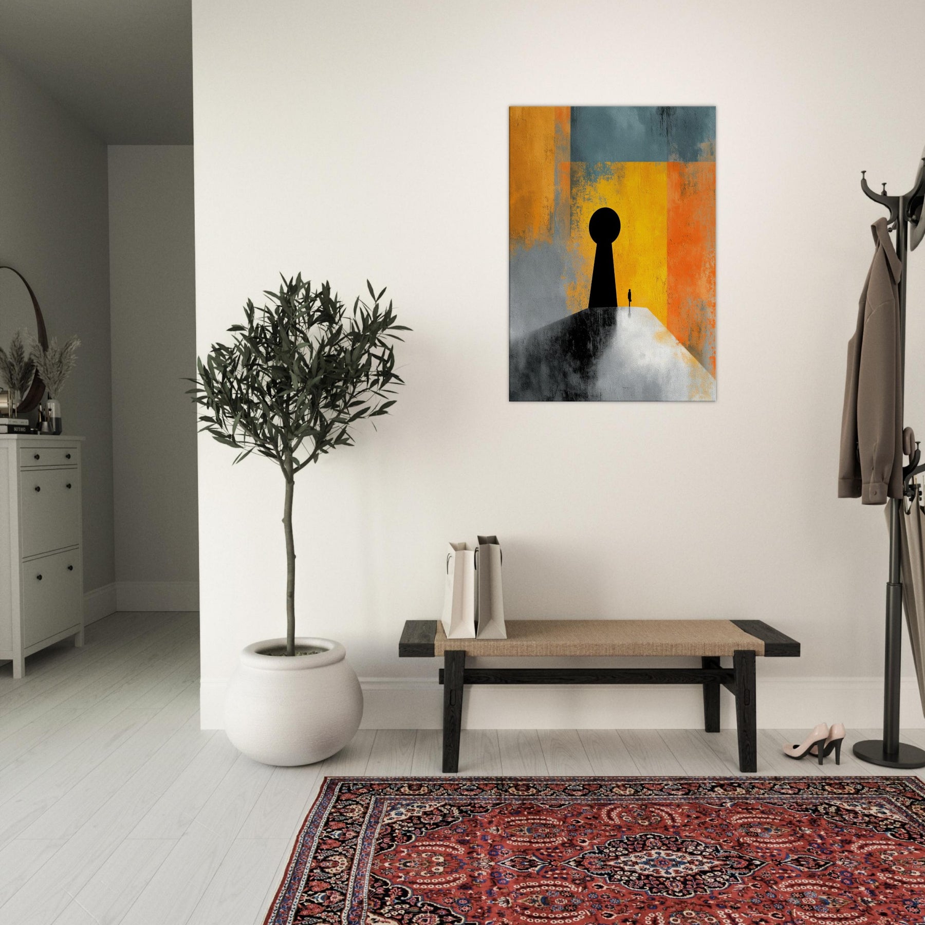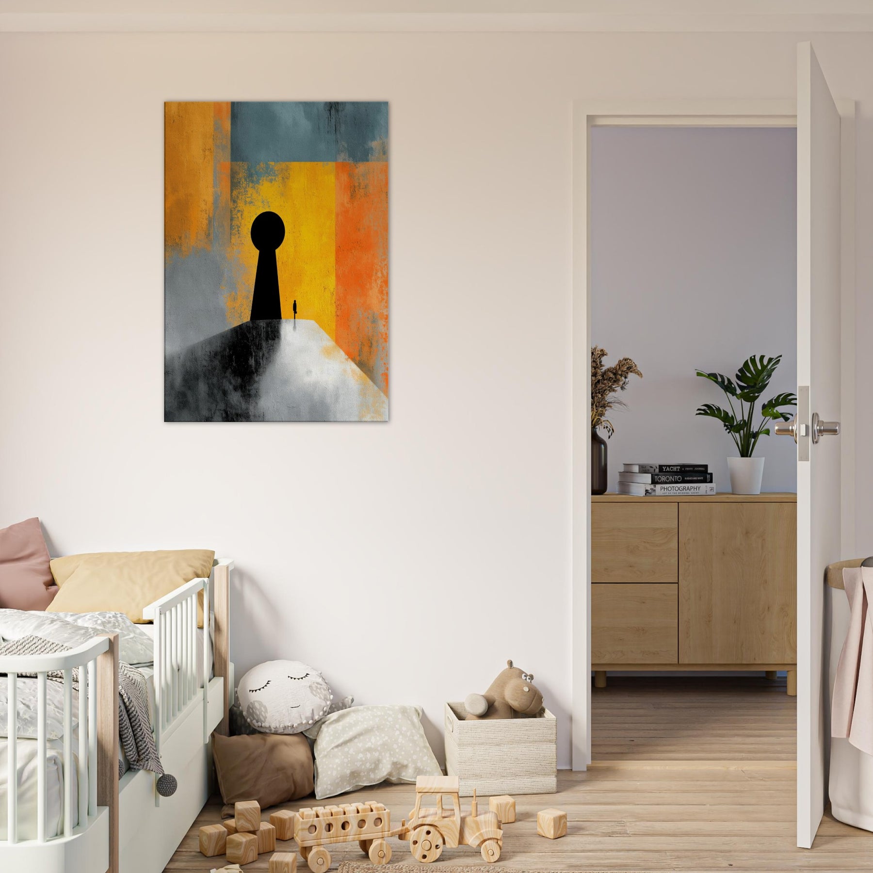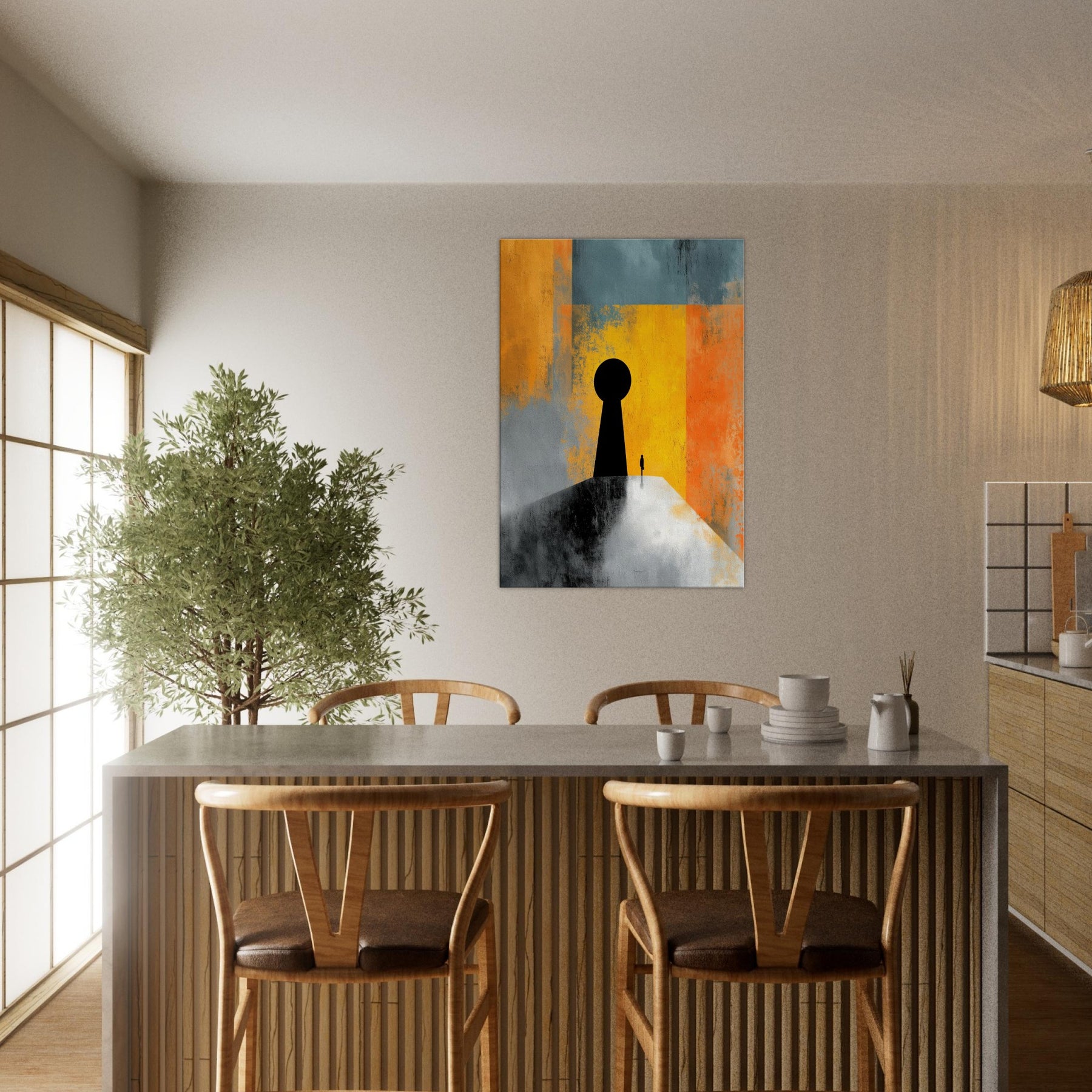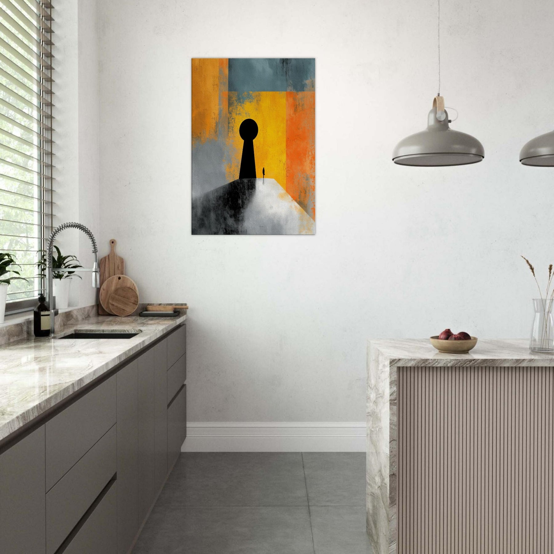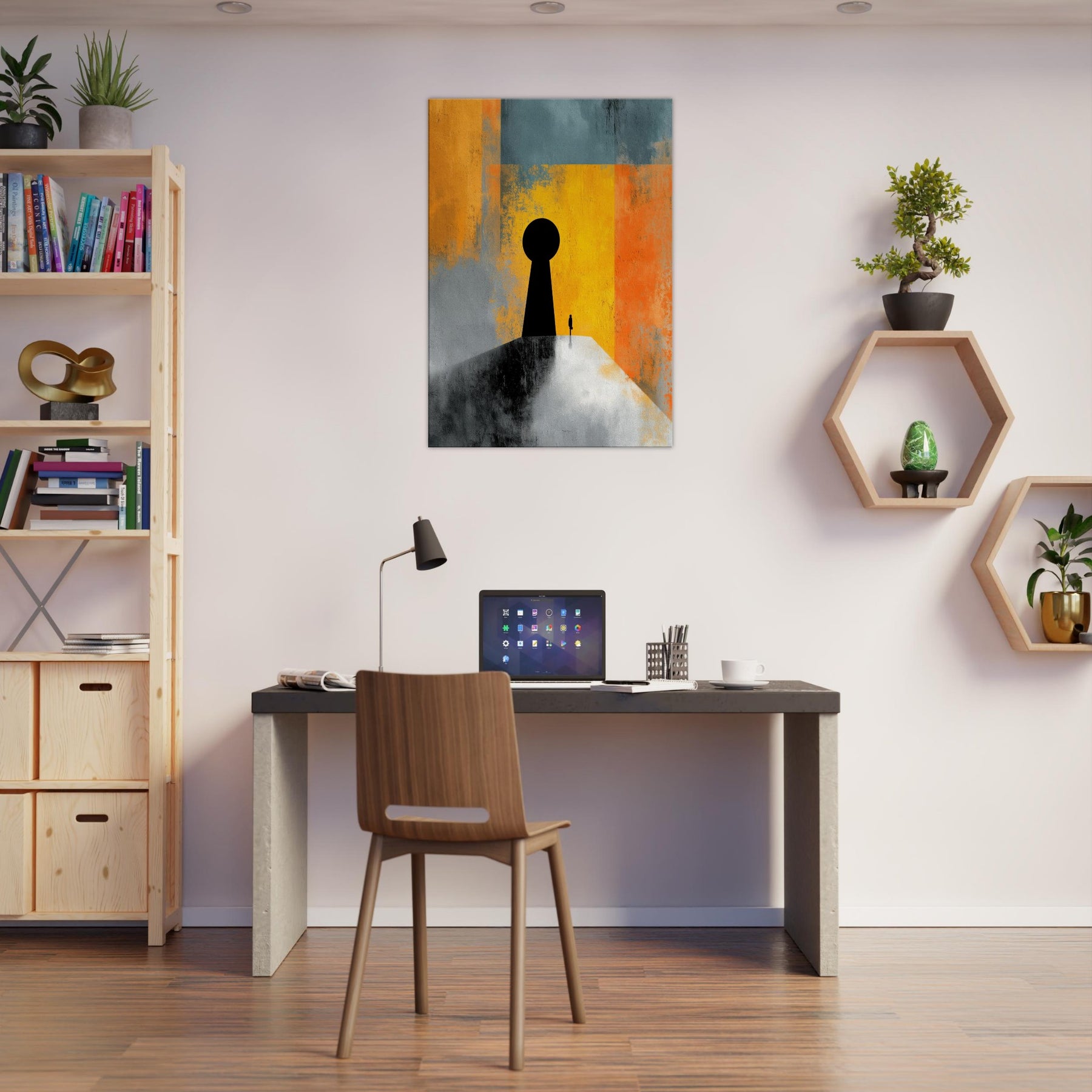 Key & Keyhole rises as a quiet portal in a storm of color, a surreal beacon that bridges private space and distant possibility. A towering black silhouette anchors a lone figure before a vast keyhole, while bands of sunlit yellow, orange, and teal dissolve into memory and dream. This painting invites stillness, inviting you to pause at thresholds of imagination. In a living space it becomes a dramatic focal point an intimate light in the room's rhythm, guiding conversation and contemplation.