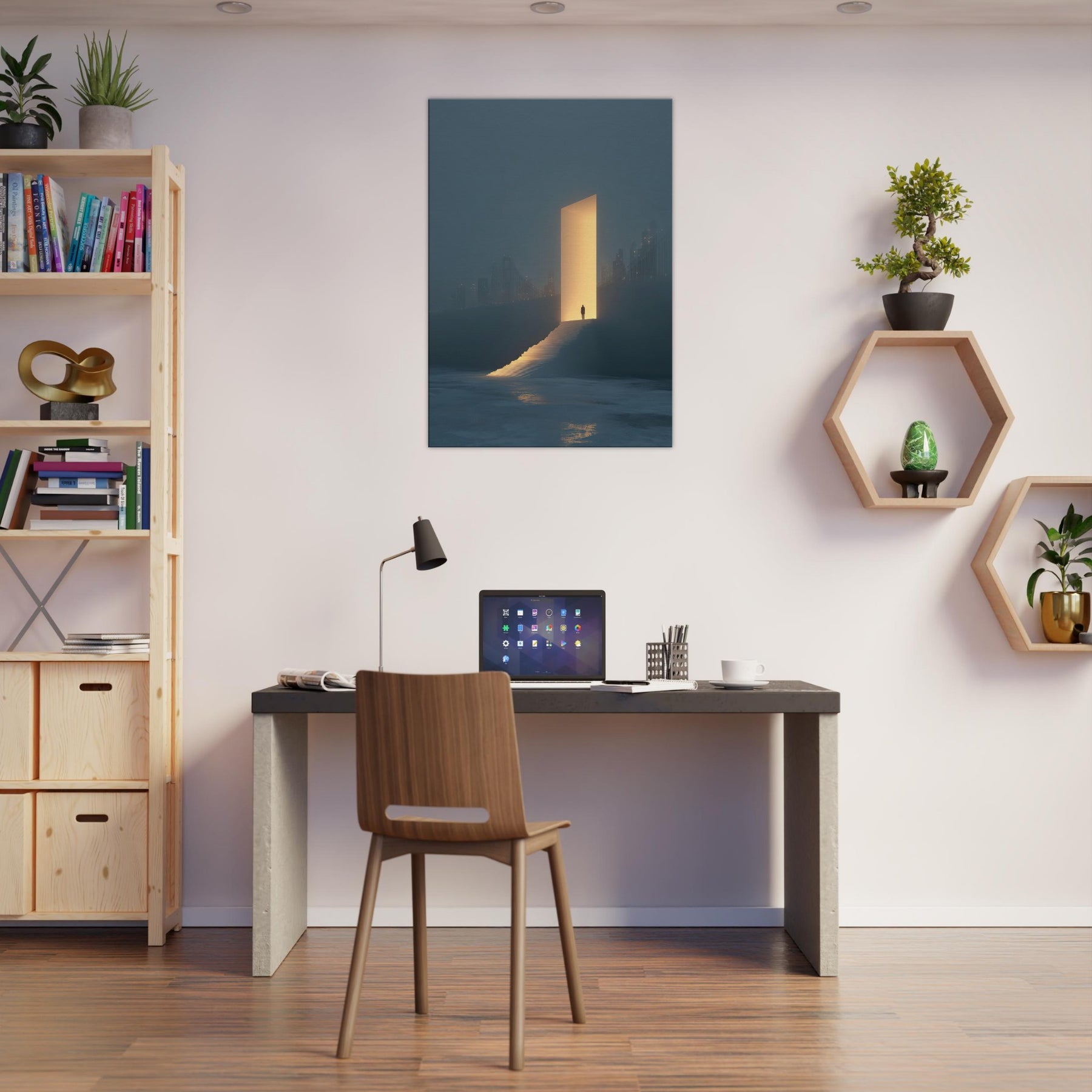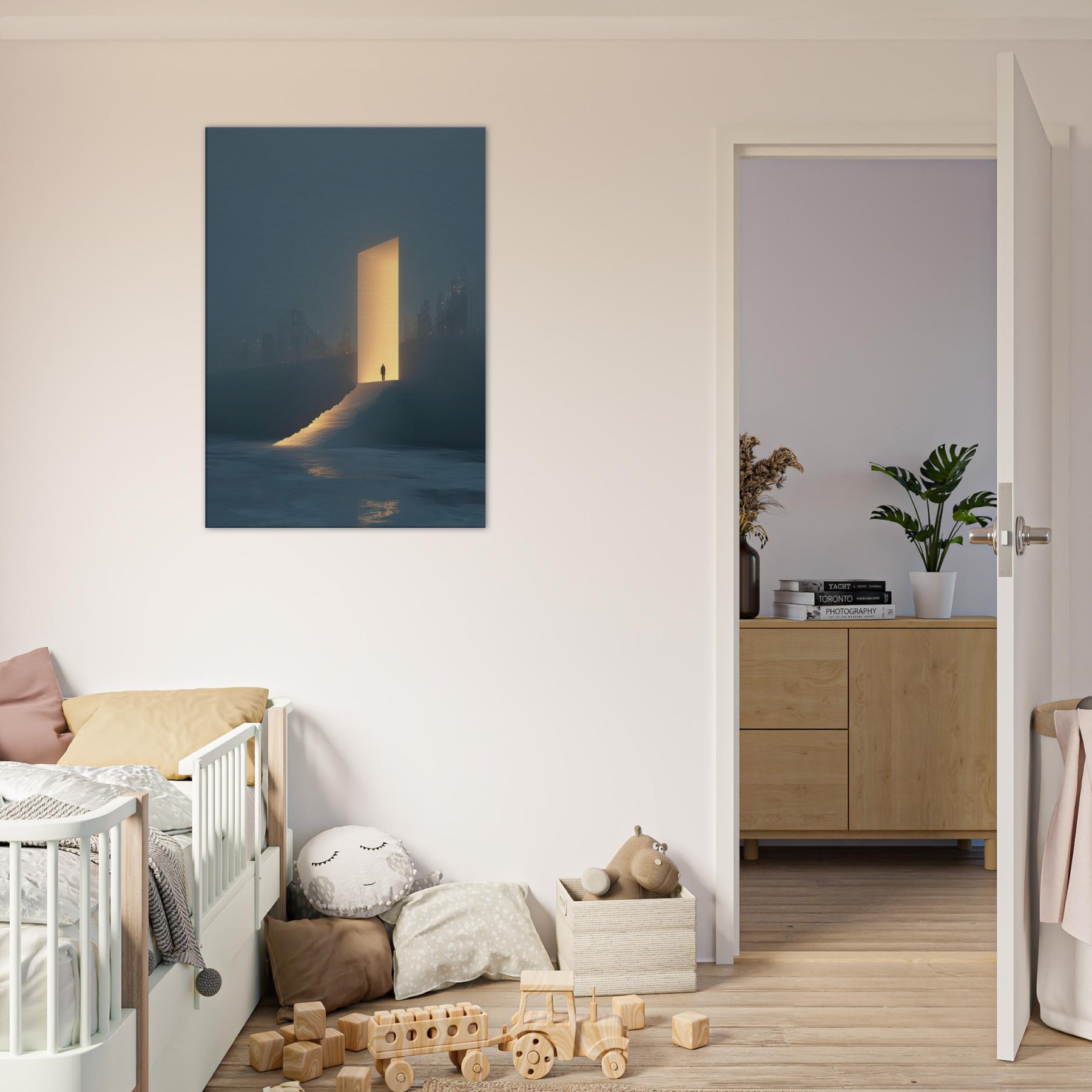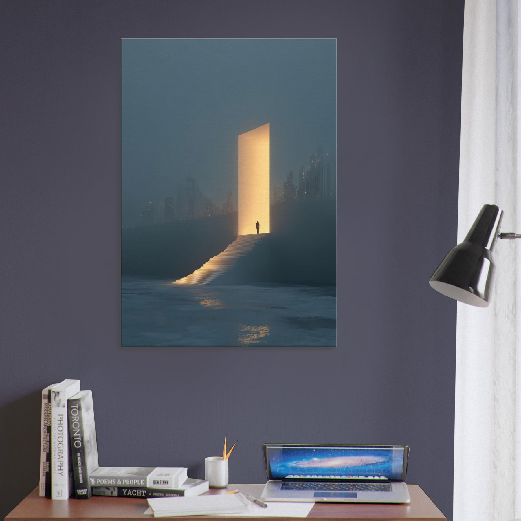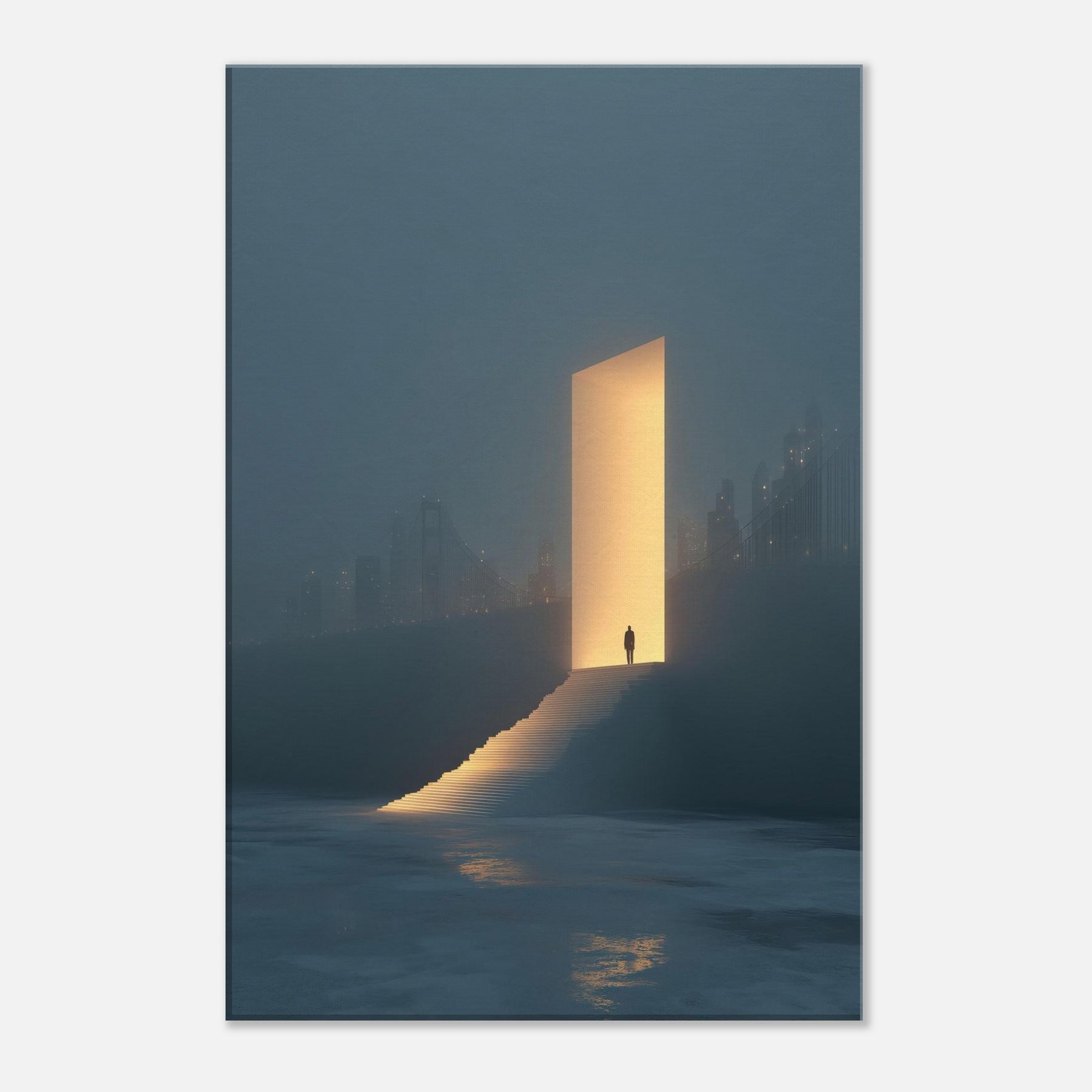 Step into a dream where the Golden Gate Bridge dissolves into a warm, ember hued doorway. This surreal composition places a solitary figure at the threshold, ascending a glowing stair toward an inviting light that promises new perspective. Fog softened city silhouettes, distant bridges, and a quiet, reflecting sea ground the moment in contemplative stillness. In any living space, it adds luminous atmosphere, transforming walls into a nocturnal panorama of possibility and serene wonder.