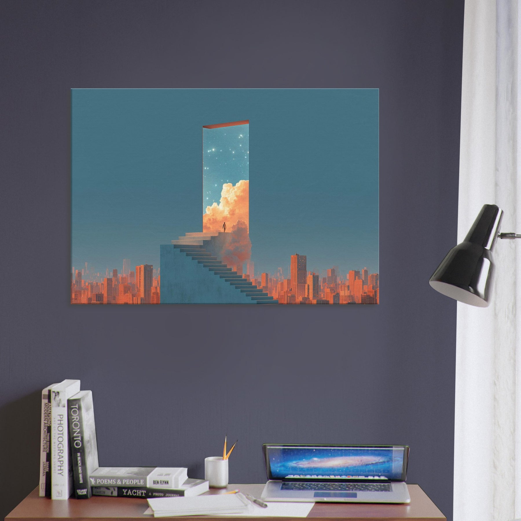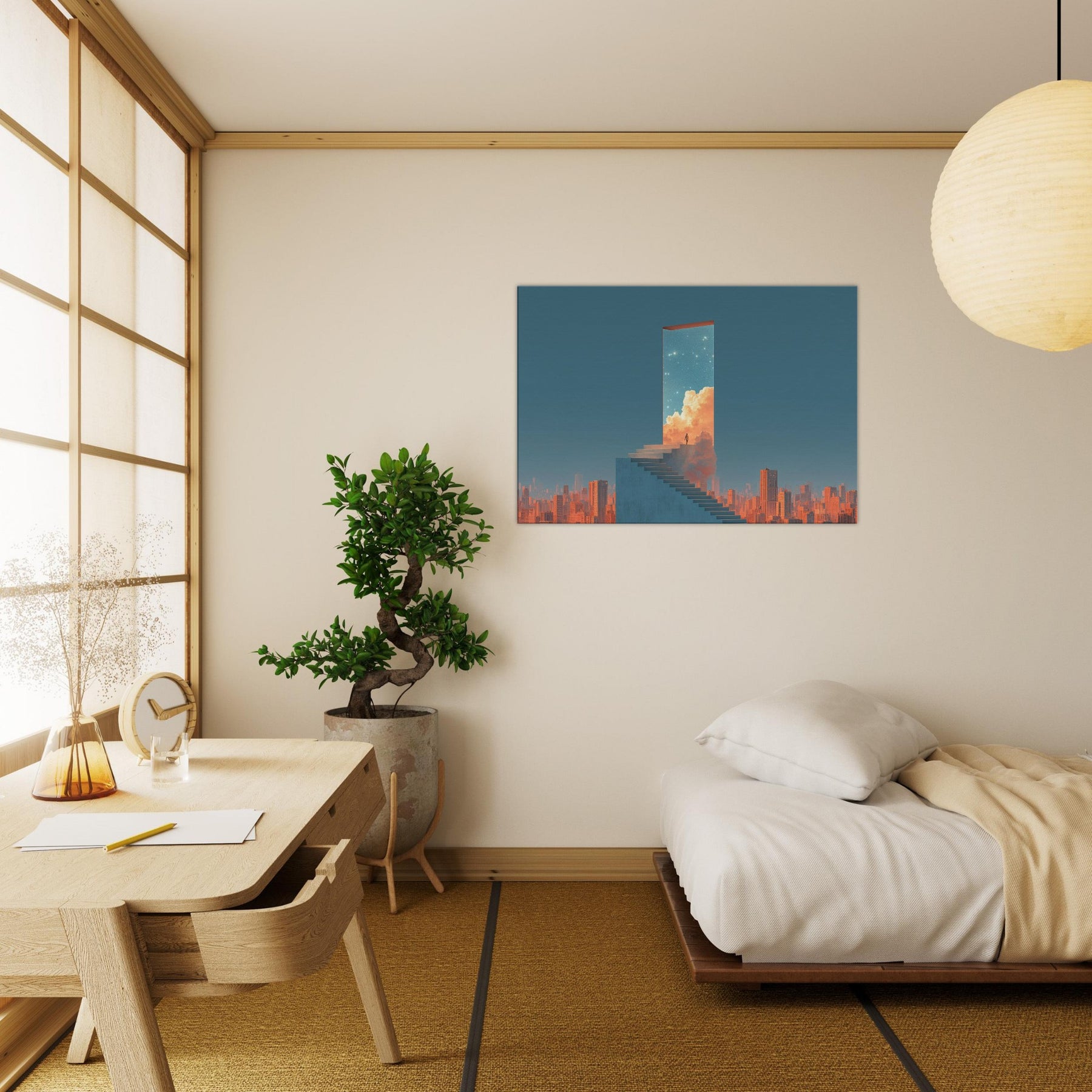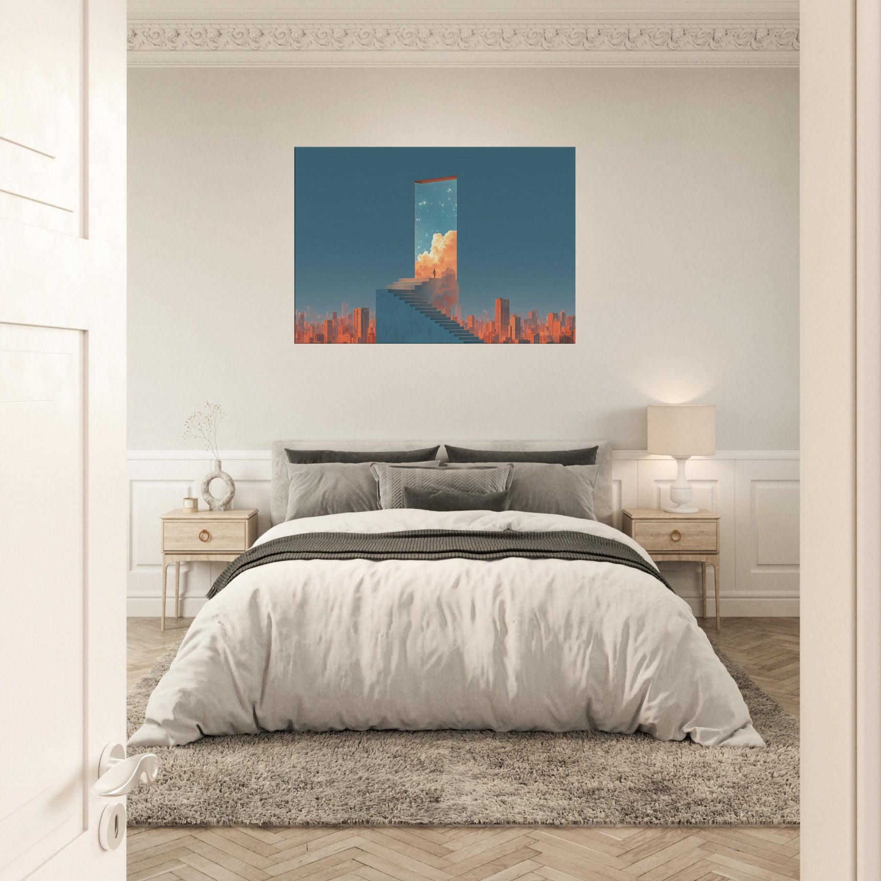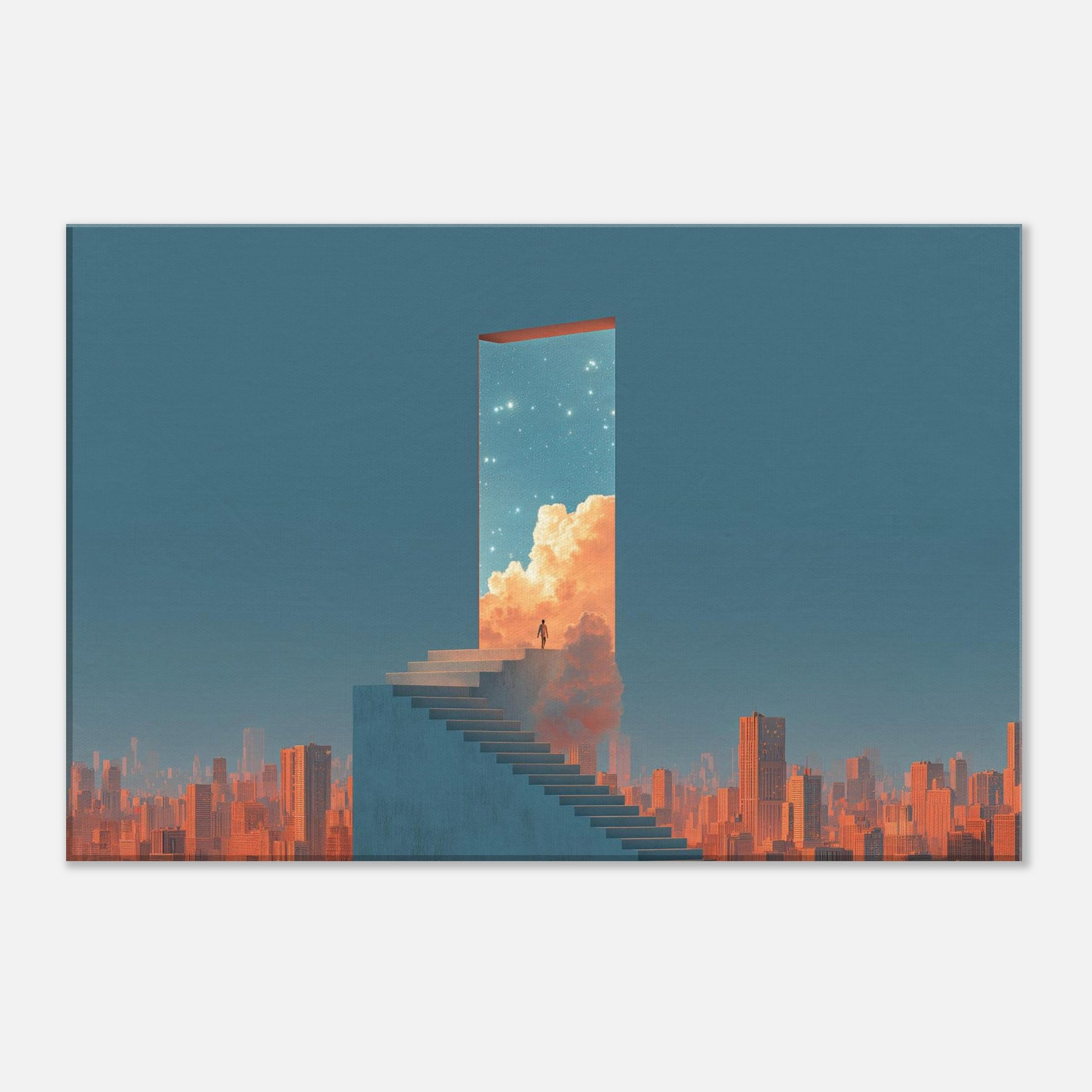 Step into a doorway that floats above a sleeping metropolis. This surreal composition renders Futuristic Skyscrapers as a luminous portal a horizon of clean lines, warm clouds, and a starry sky that invites quiet awe. A lone figure on the staircase becomes a hinge between concrete and celestial possibility, turning a living room into a contemplative promenade. Hang this piece to evoke wonder, soften urban edges, and invite luminous stillness a serene backdrop for conversation, reading, and slow, inspired evenings at home.