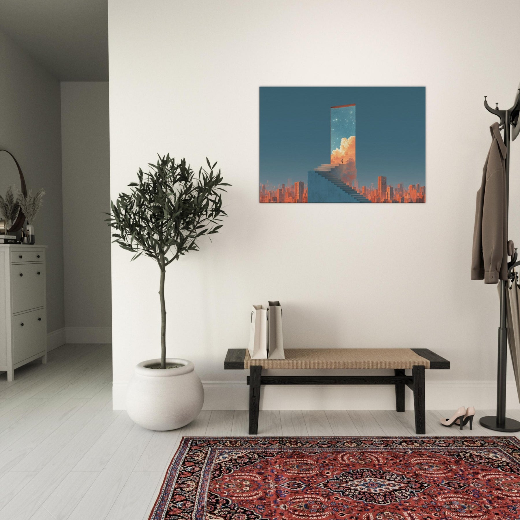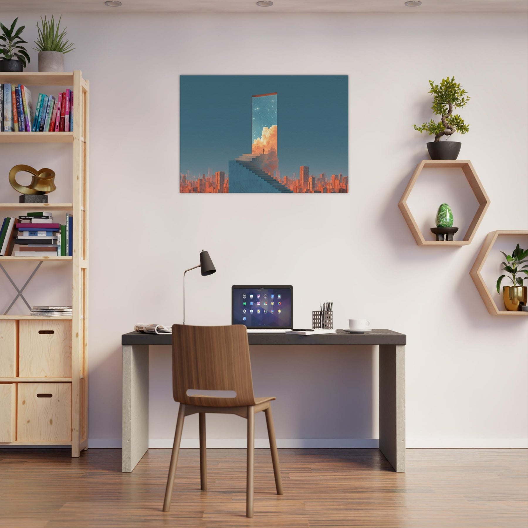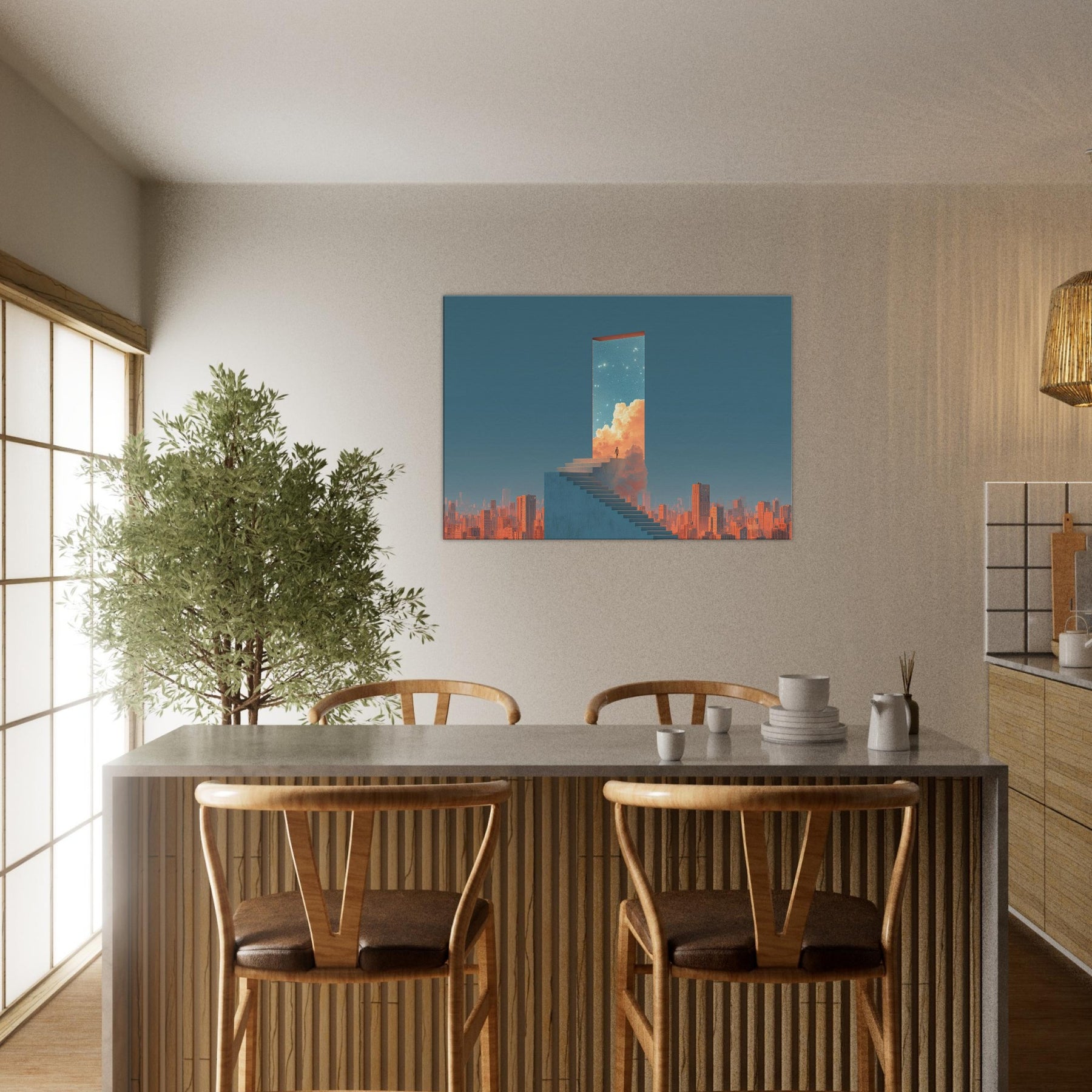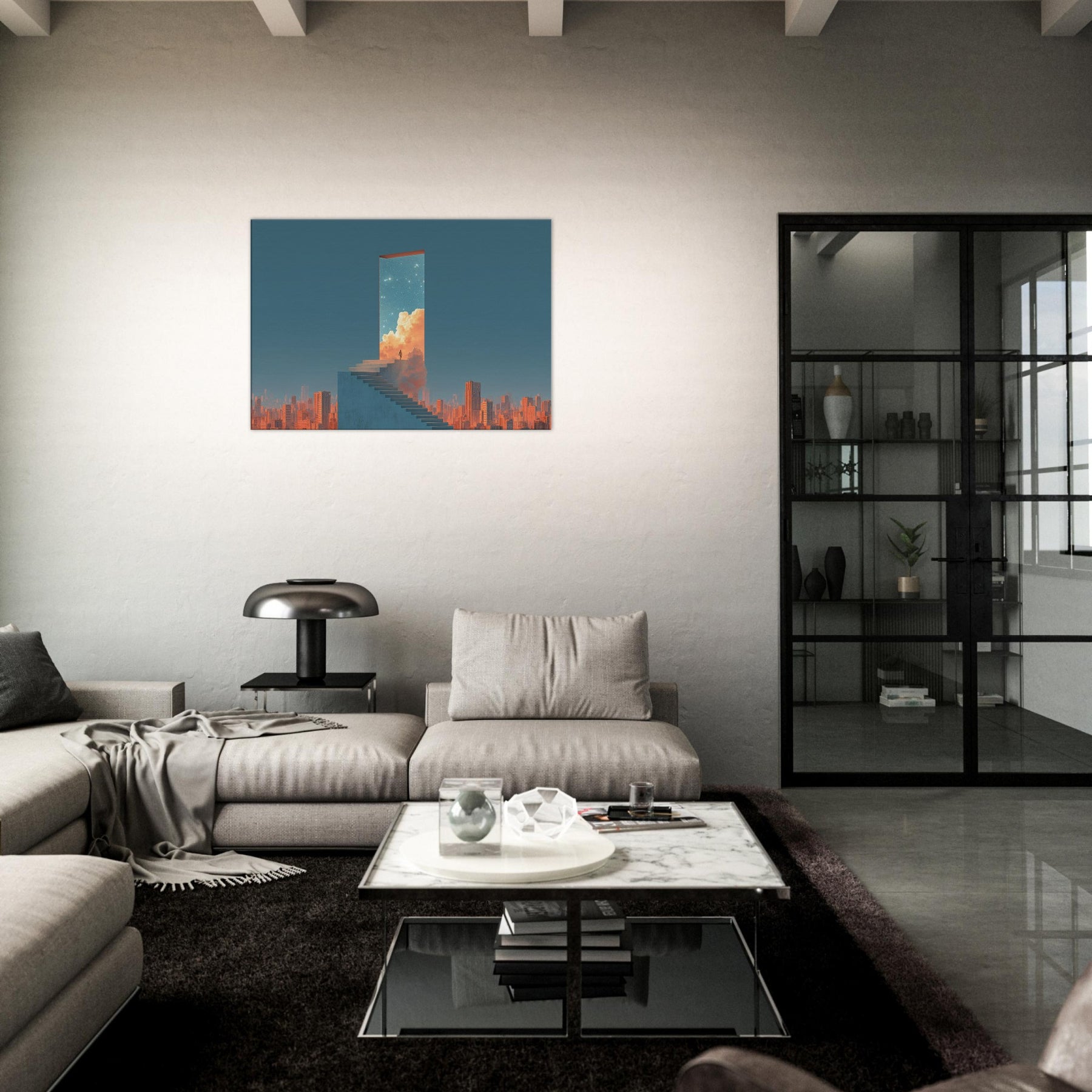 Step into a doorway that floats above a sleeping metropolis. This surreal composition renders Futuristic Skyscrapers as a luminous portal a horizon of clean lines, warm clouds, and a starry sky that invites quiet awe. A lone figure on the staircase becomes a hinge between concrete and celestial possibility, turning a living room into a contemplative promenade. Hang this piece to evoke wonder, soften urban edges, and invite luminous stillness a serene backdrop for conversation, reading, and slow, inspired evenings at home.