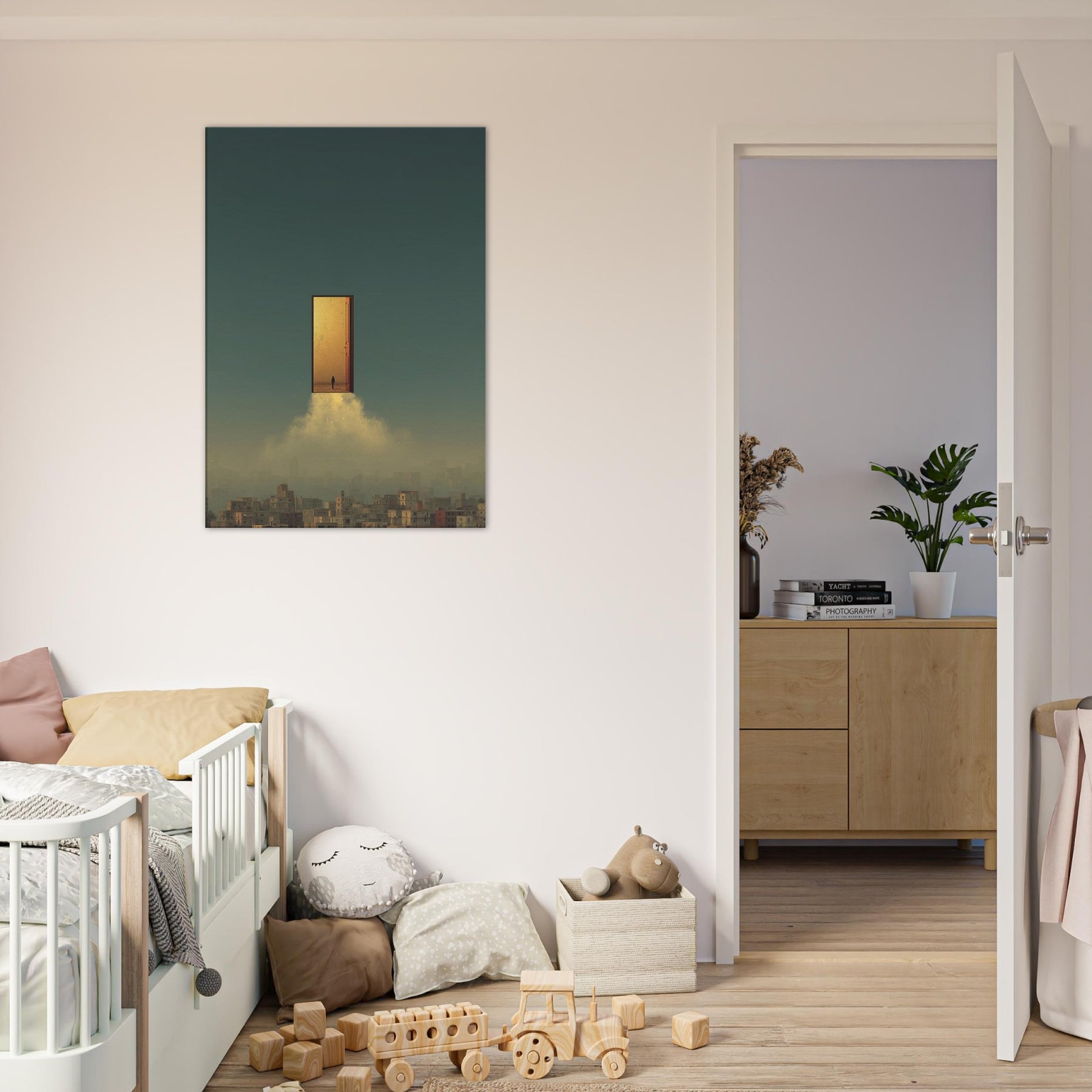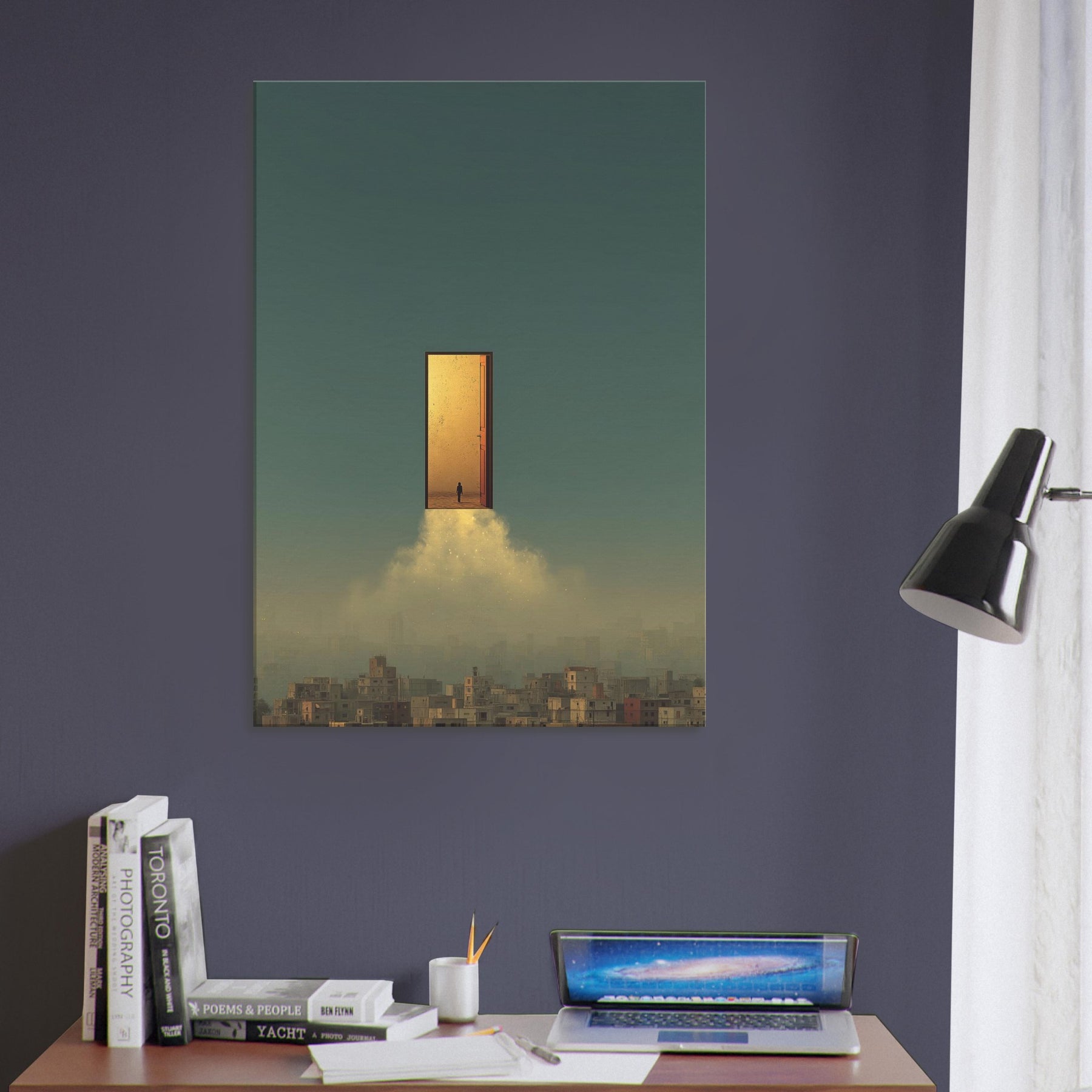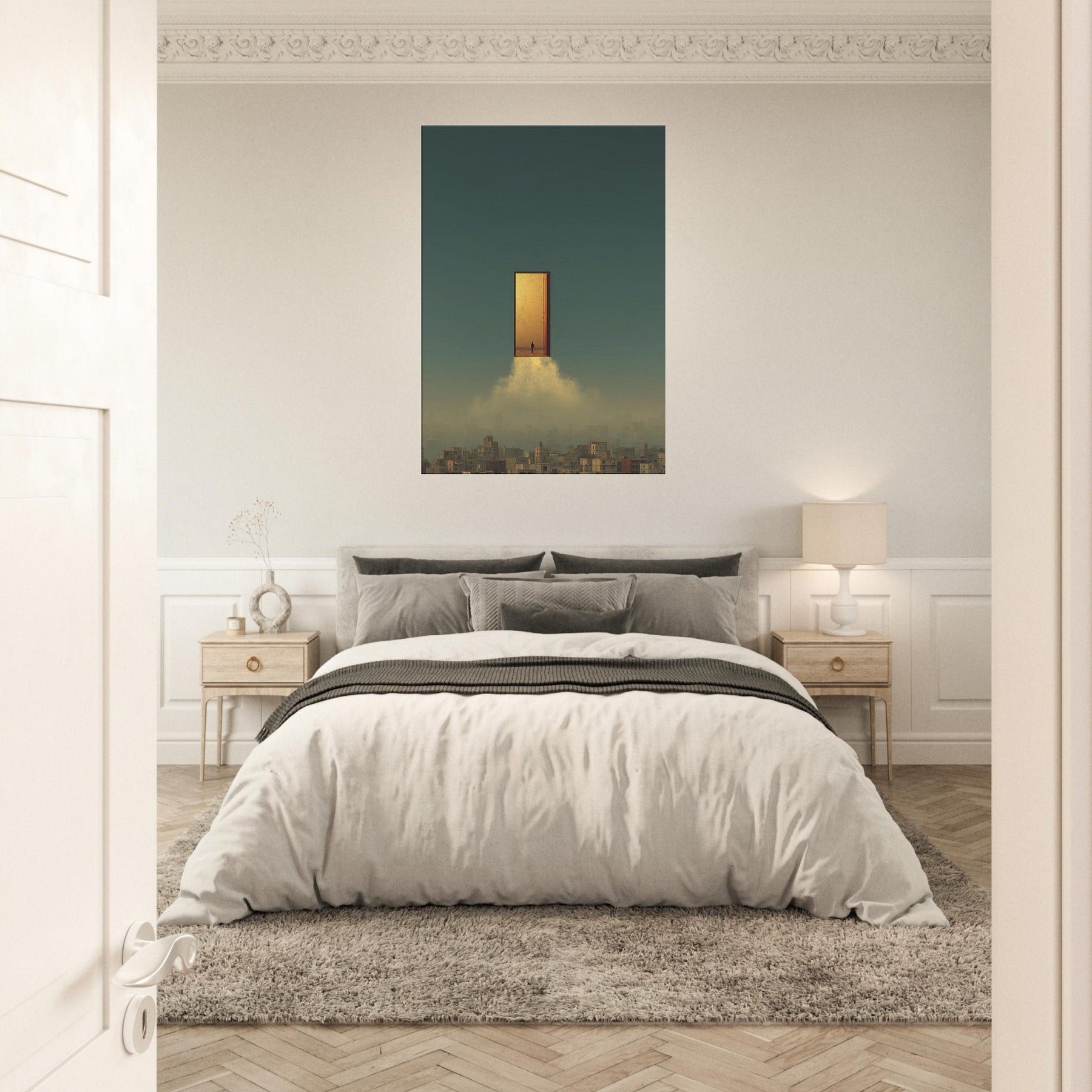 Barcelona unfolds in a dreamscape where architecture becomes a breath and the ordinary grows extraordinary. This surreal composition invites a doorway to hover above rooftops, spilling warm light and a cloud soft horizon into your living room. The piece balances quiet intimacy with generous possibility, turning walls into portals and streets into memory. Hang it to elongate evenings, spark conversation, and invite a sense of wonder as the city's imagination drifts softly into your space.