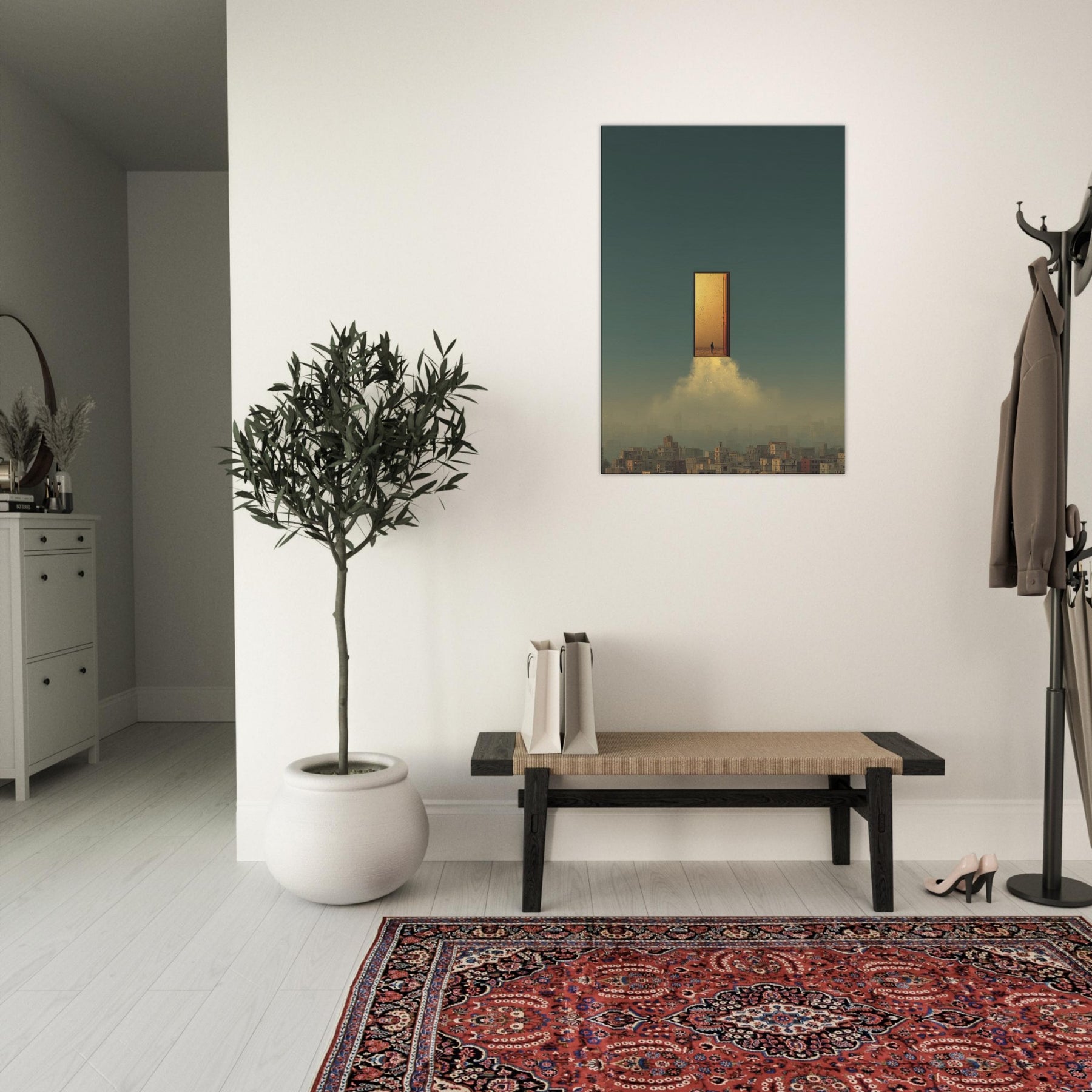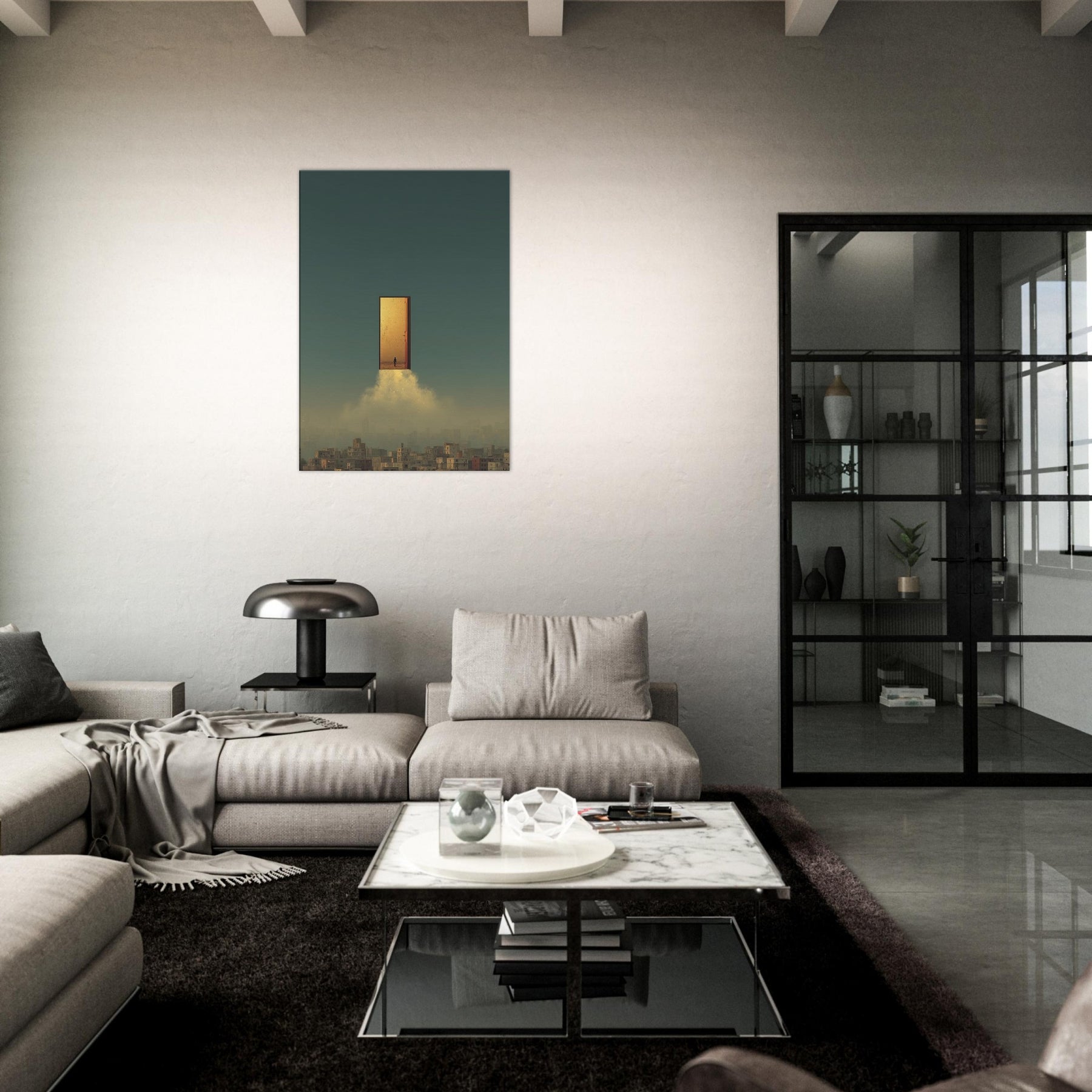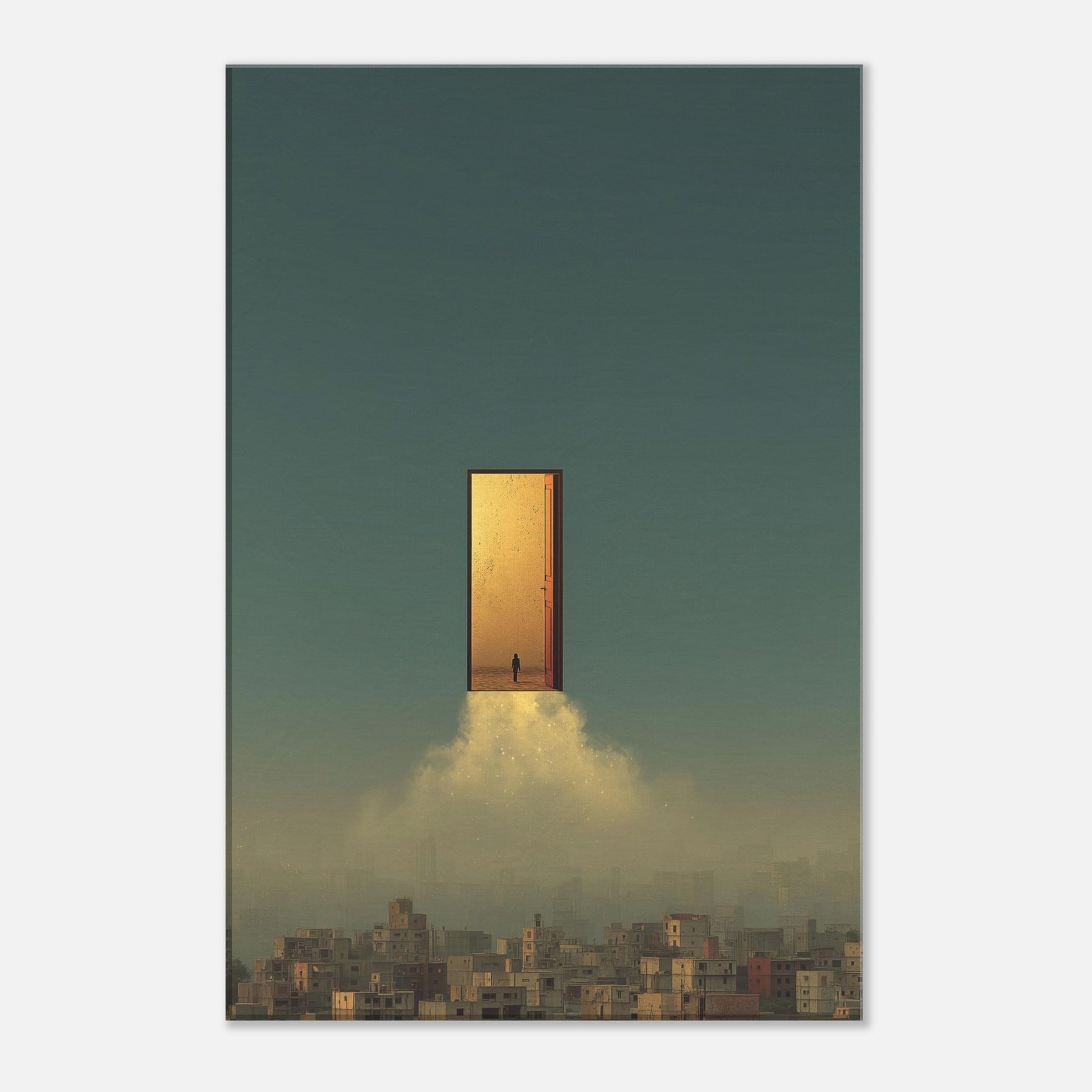 Barcelona unfolds in a dreamscape where architecture becomes a breath and the ordinary grows extraordinary. This surreal composition invites a doorway to hover above rooftops, spilling warm light and a cloud soft horizon into your living room. The piece balances quiet intimacy with generous possibility, turning walls into portals and streets into memory. Hang it to elongate evenings, spark conversation, and invite a sense of wonder as the city's imagination drifts softly into your space.