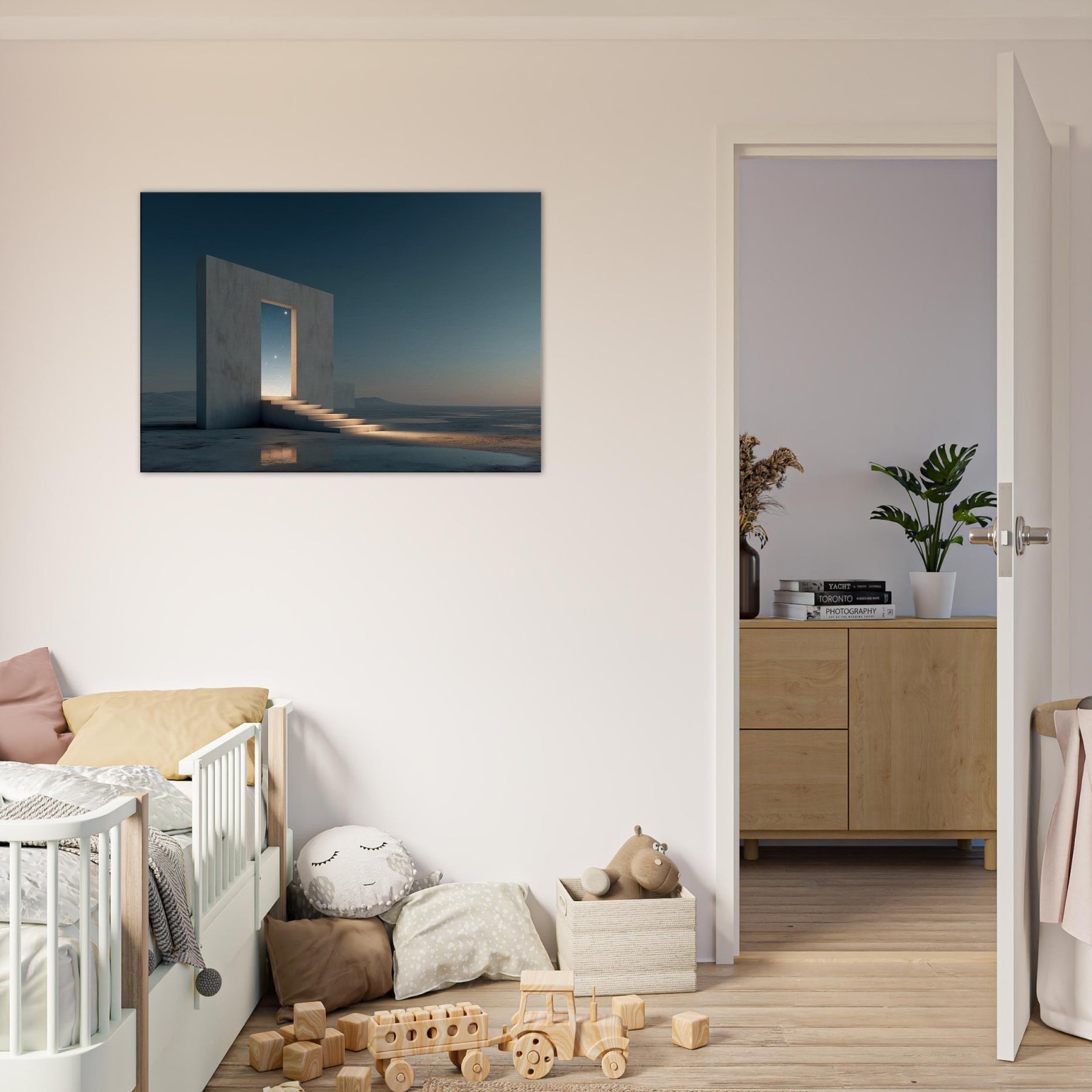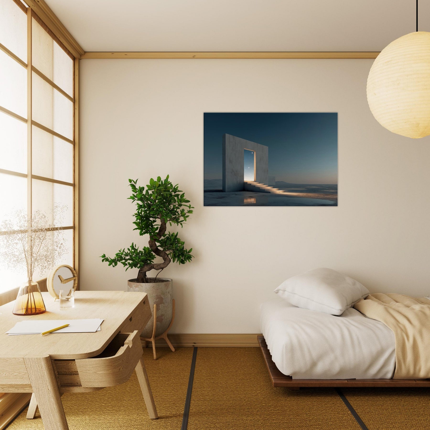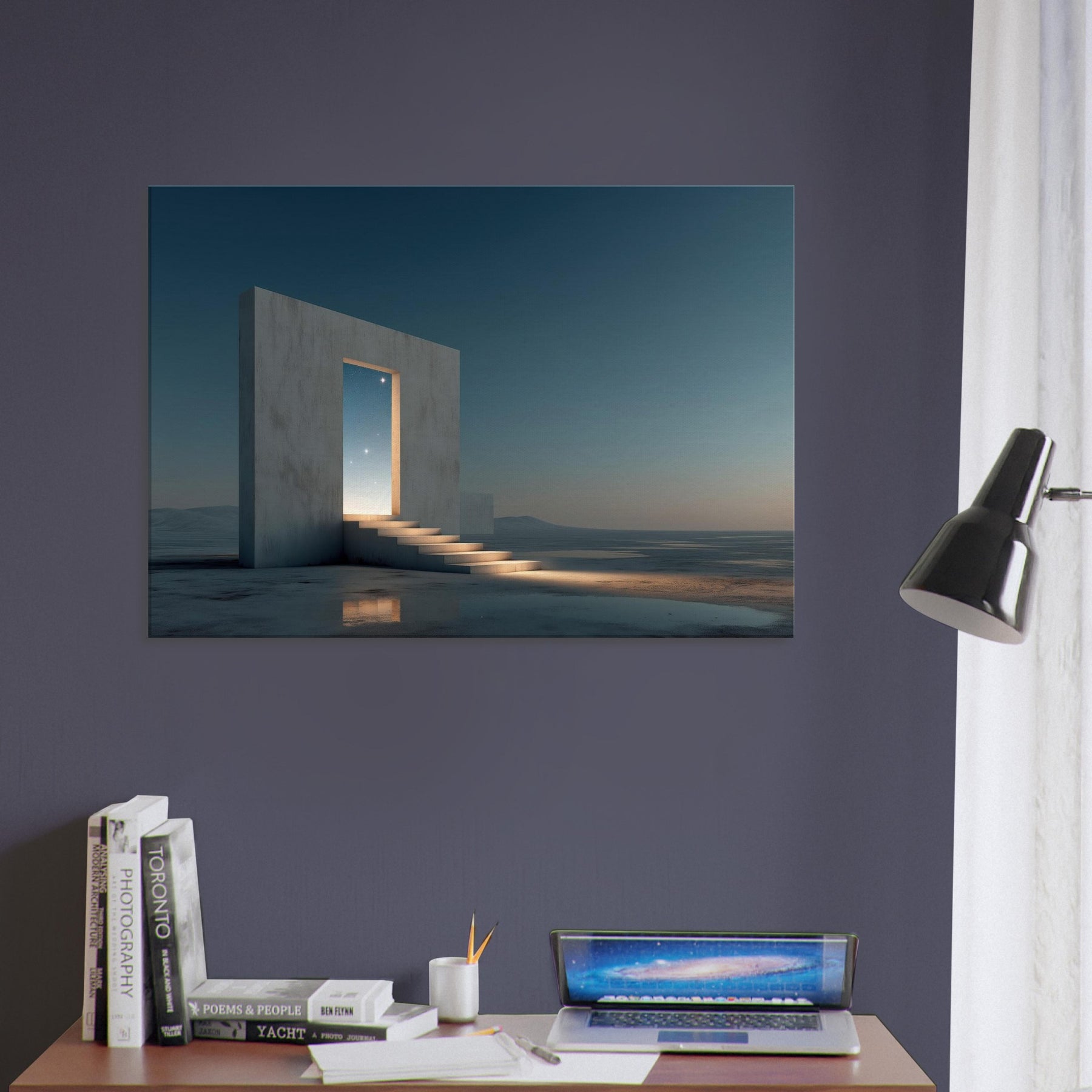 Chicago rises as a dream in concrete and light, where a monumental doorway frames a sky brushed with stars and a waking horizon. This surreal composition invites quiet wonder, turning a living space into a nocturnal promenade. The softly lit steps curve toward possibility, casting gentle reflections on a still, glassy floor. With its cool blues and warm amber glow, the piece whispers of memory, travel, and the hush between dusk and dawn a serene anchor for any room.