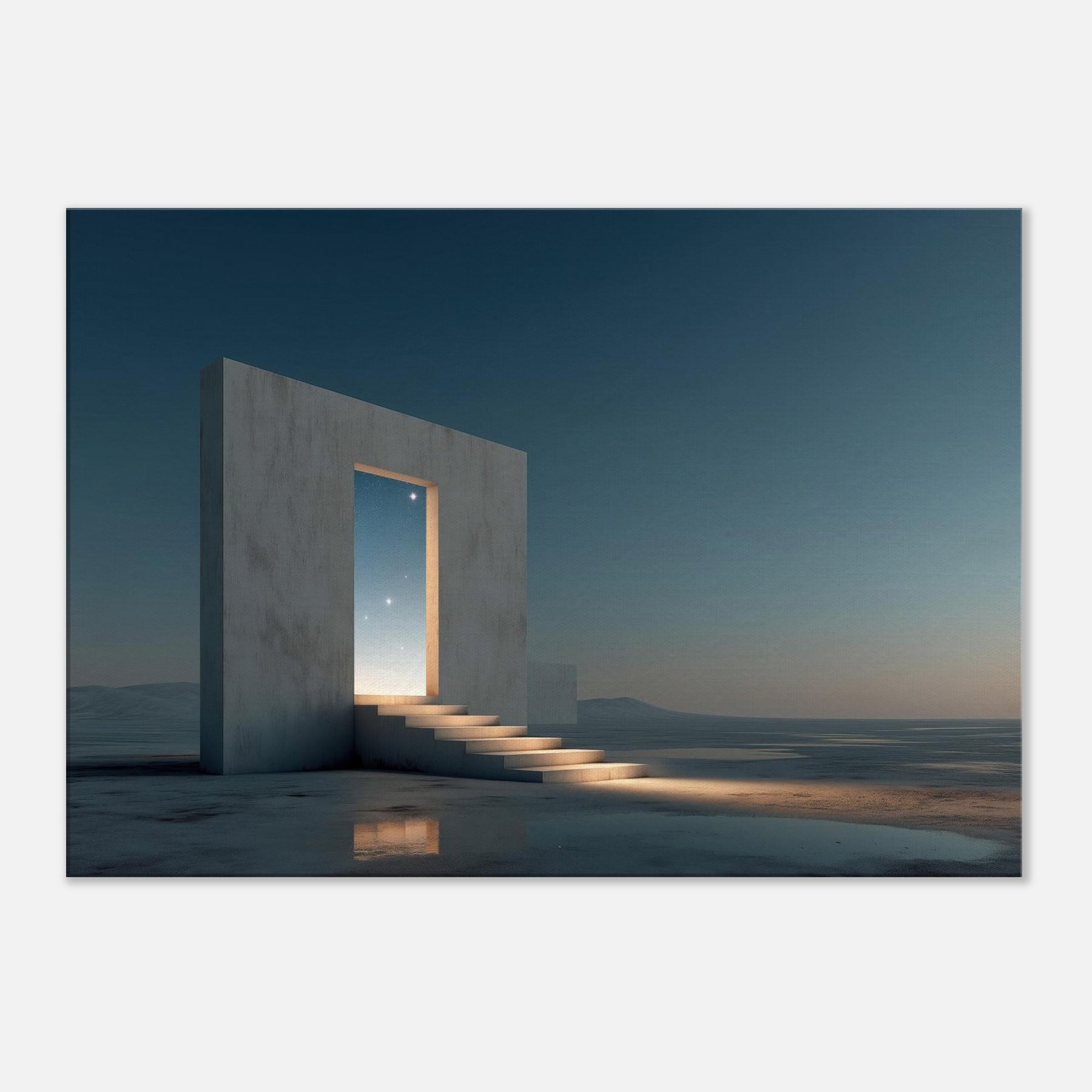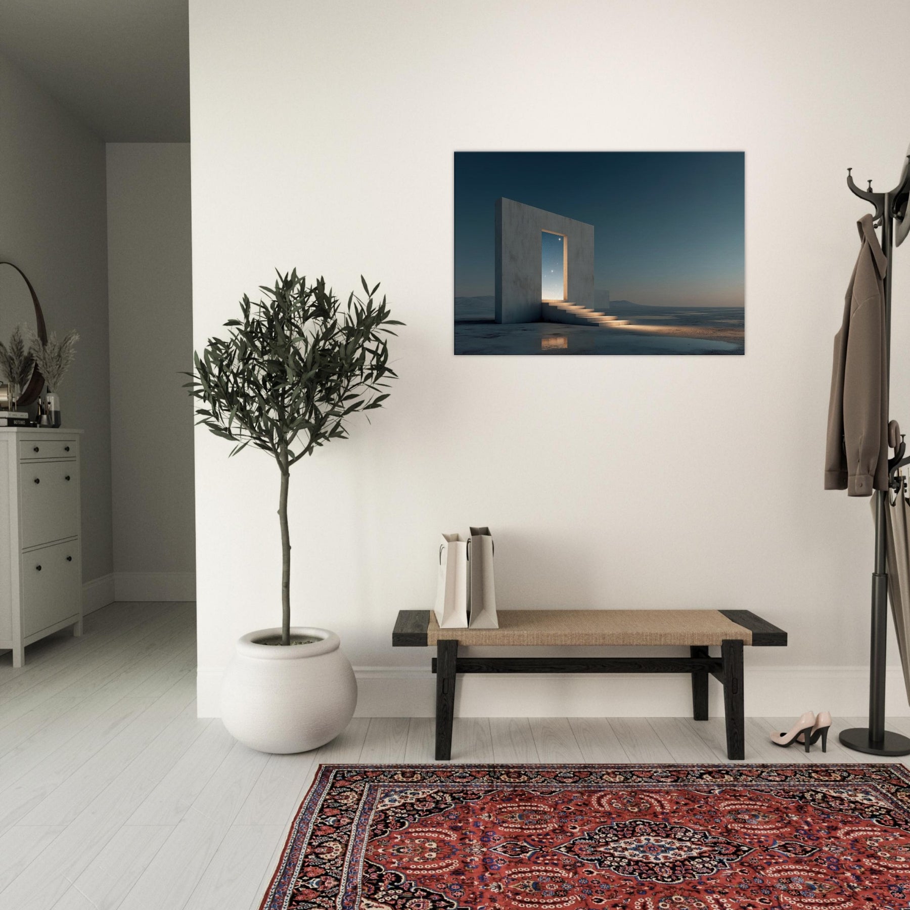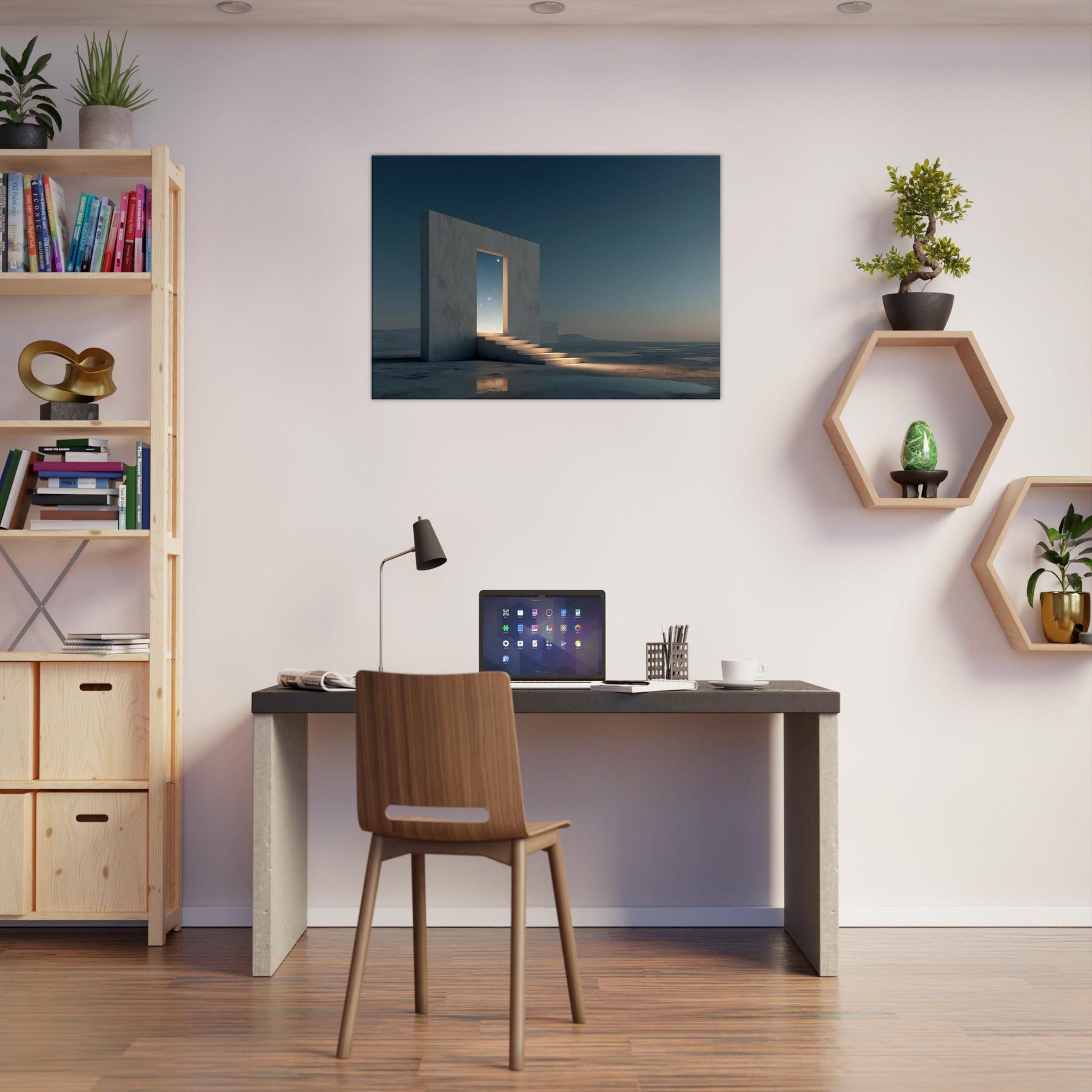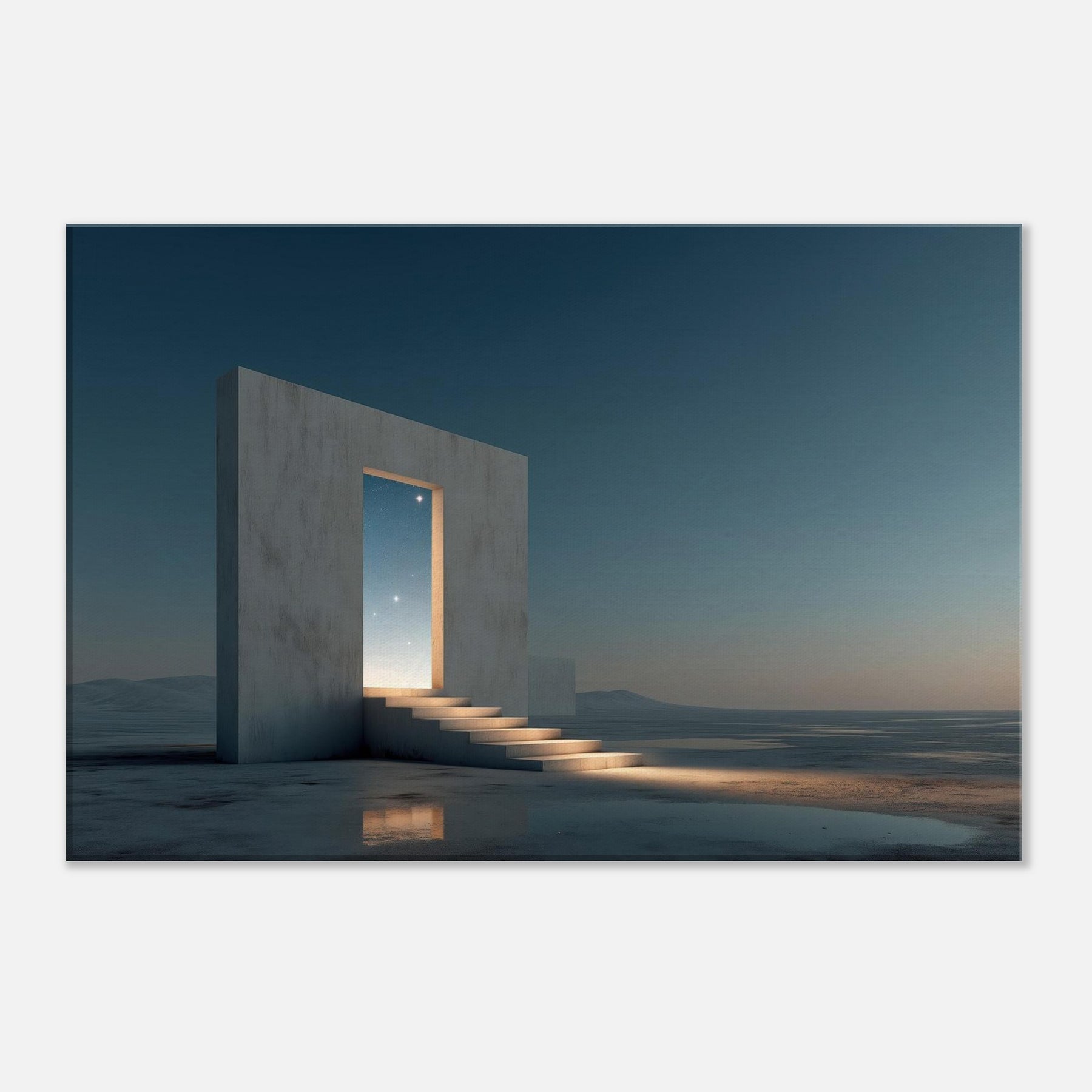 Chicago rises as a dream in concrete and light, where a monumental doorway frames a sky brushed with stars and a waking horizon. This surreal composition invites quiet wonder, turning a living space into a nocturnal promenade. The softly lit steps curve toward possibility, casting gentle reflections on a still, glassy floor. With its cool blues and warm amber glow, the piece whispers of memory, travel, and the hush between dusk and dawn a serene anchor for any room.