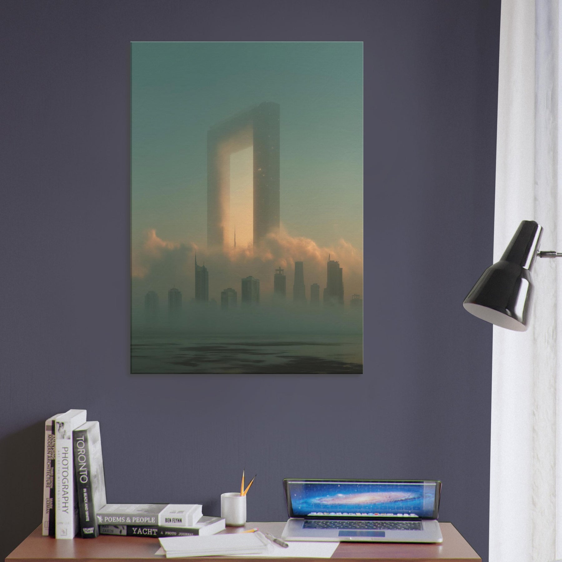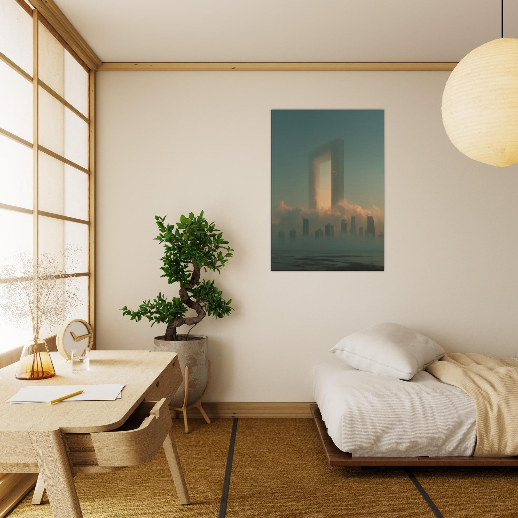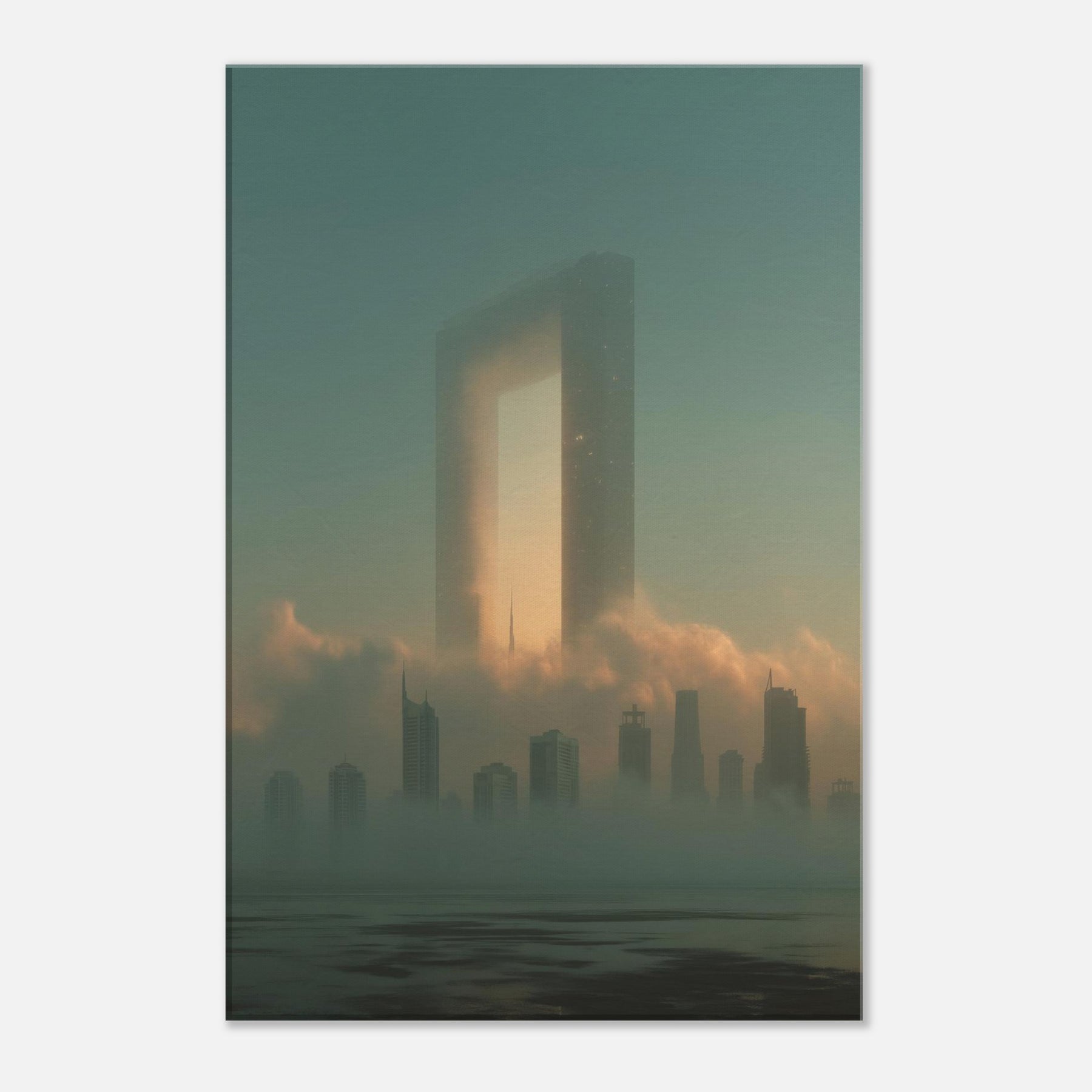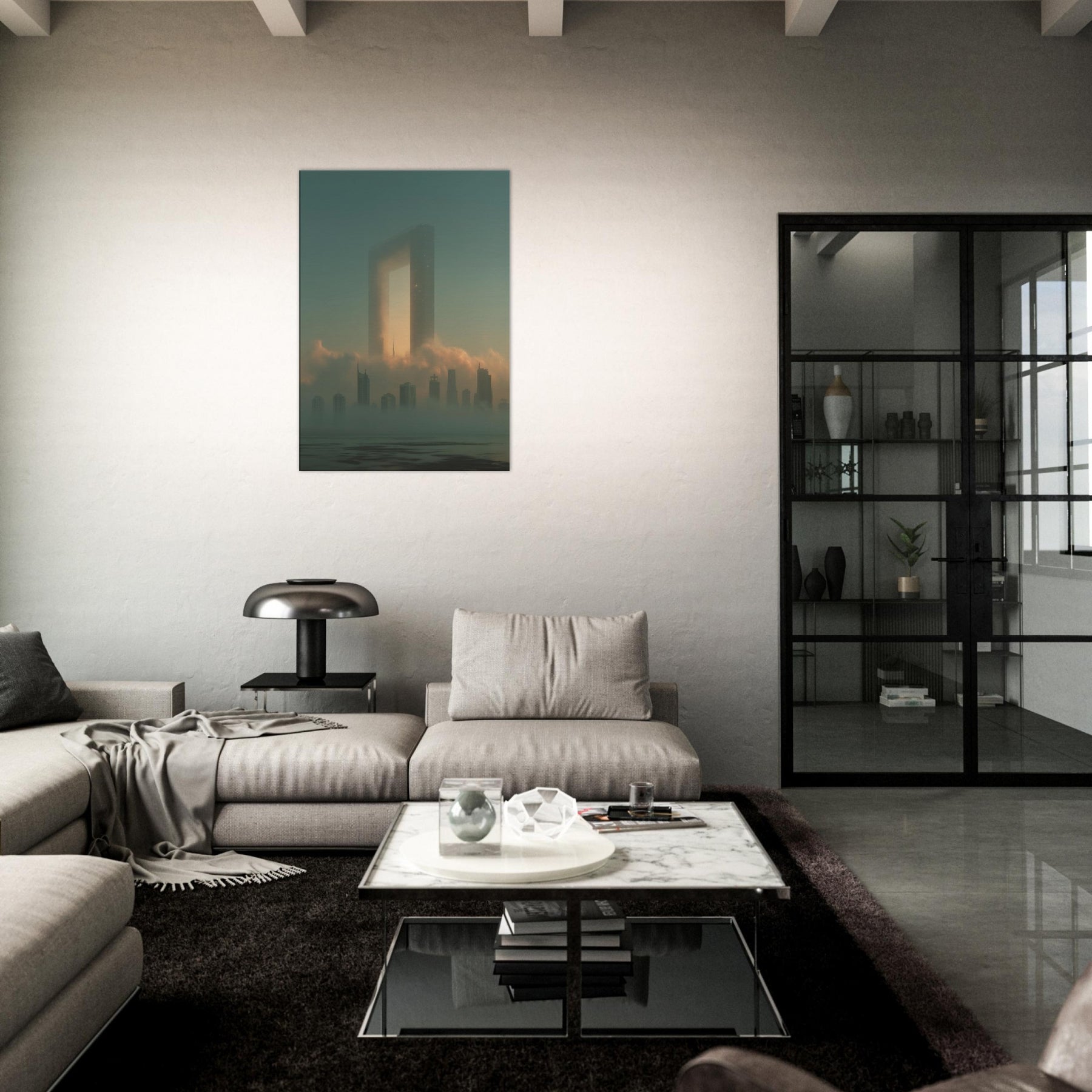 In this shimmering dreamscape, a monumental doorway carves a glow through the clouds above Dubai, a surreal invitation poured into the waking hour. The towering frame acts as a window to possibility, suspending the skyline in a warm, copper rose light that dissolves the ordinary into memory. The soft mist and ethereal horizon cradle your living space with a calm, cinematic presence, perfect for rooms that crave quiet drama, refined texture, and a sense of otherworldly scale.