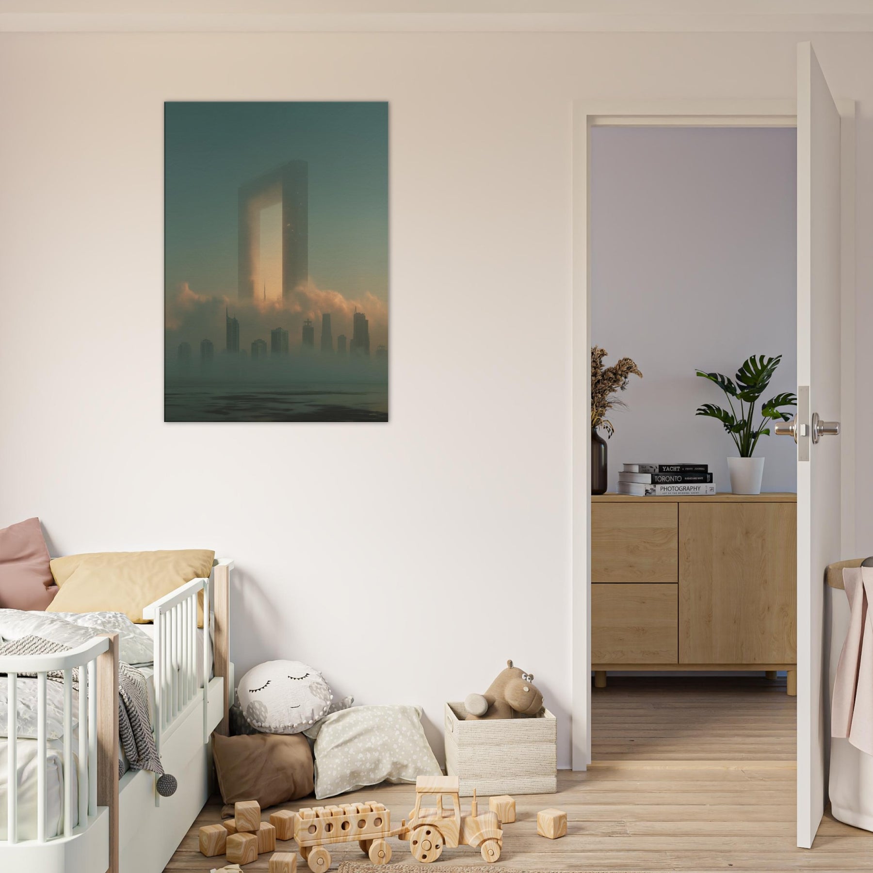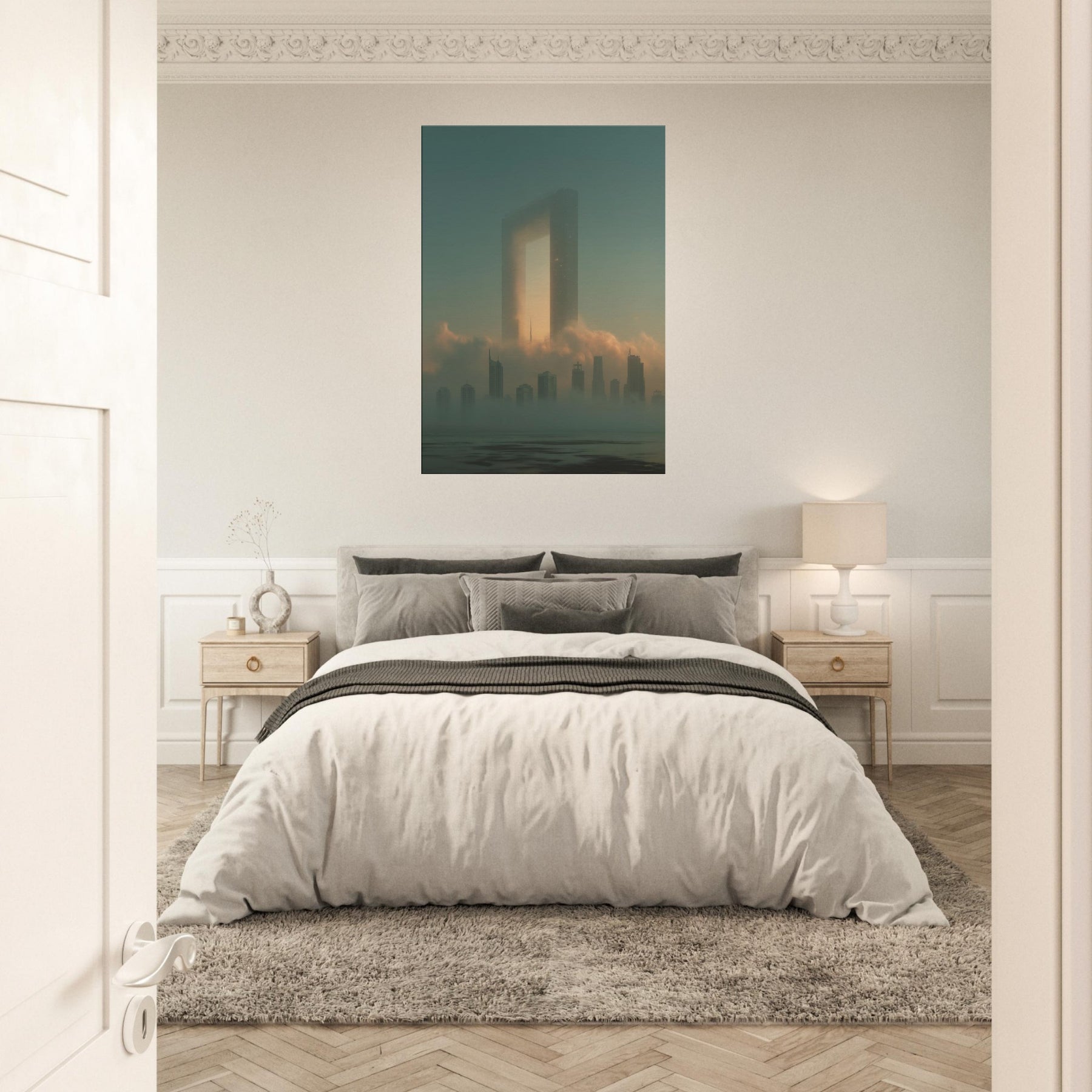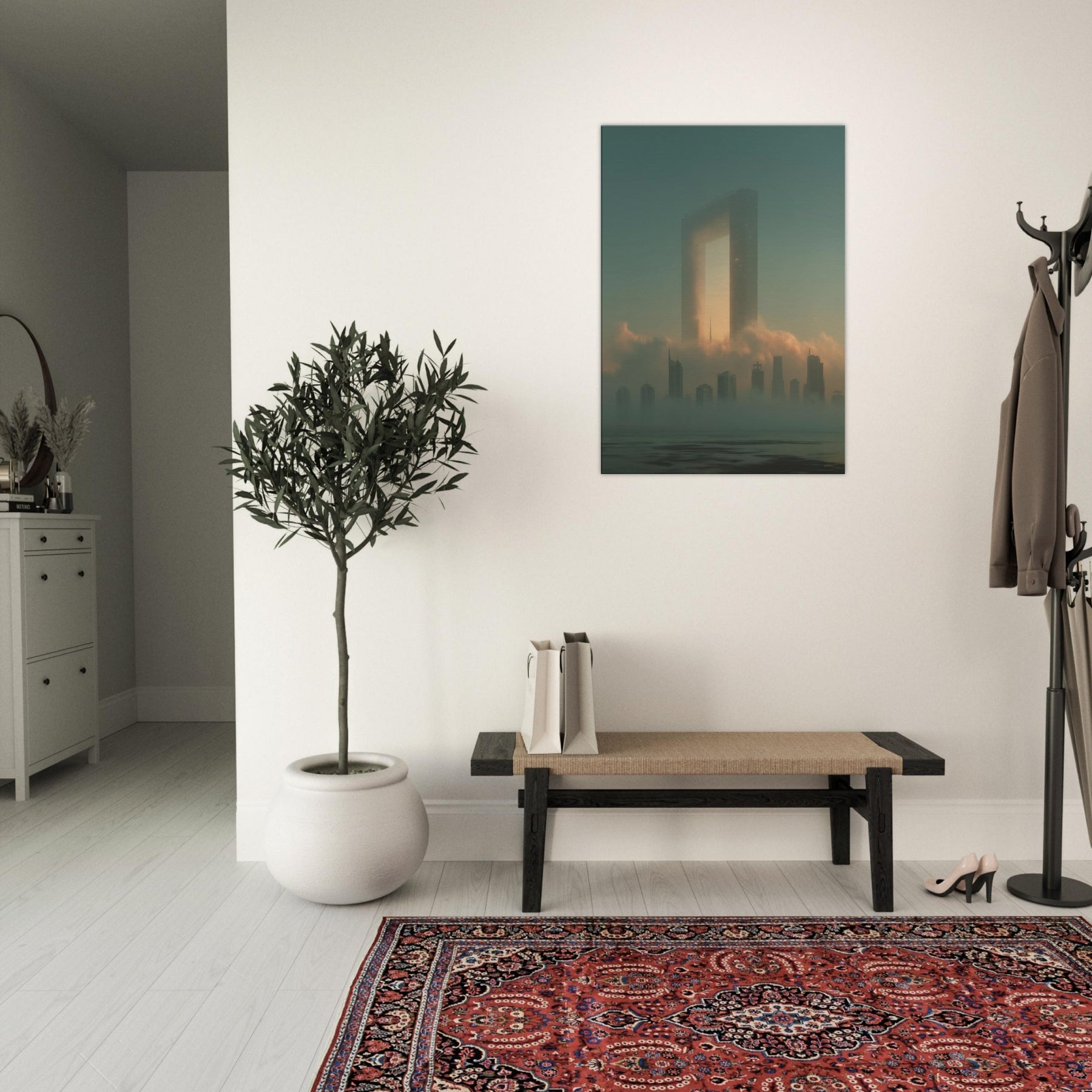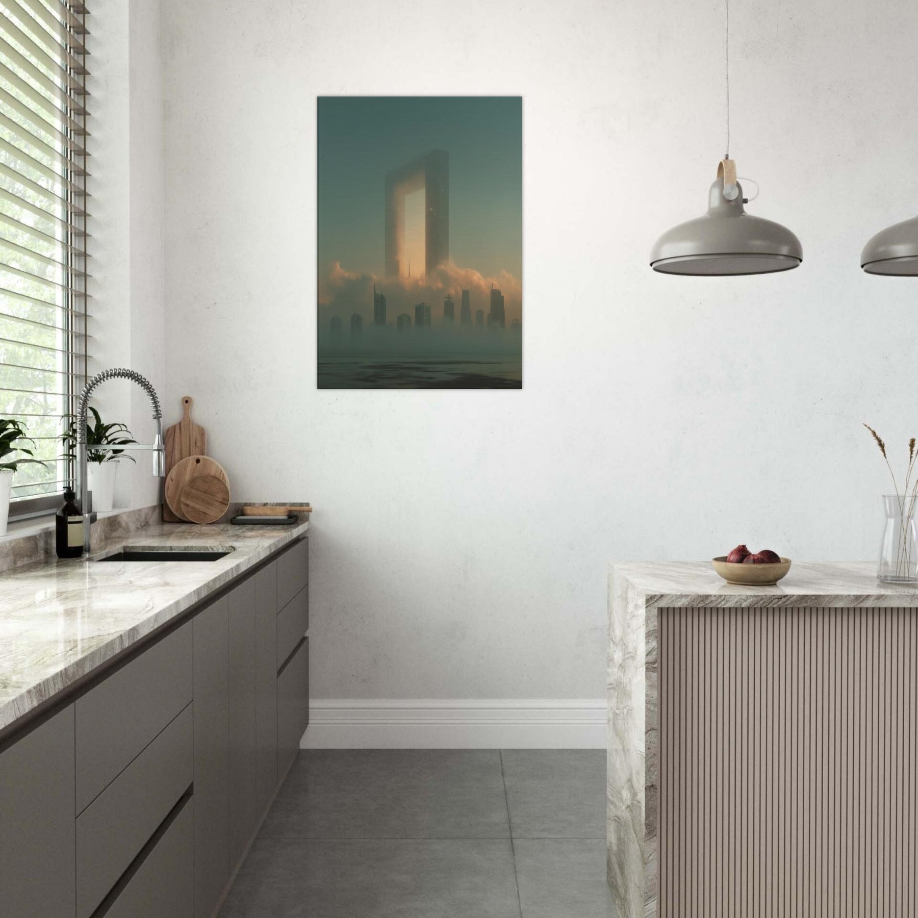 In this shimmering dreamscape, a monumental doorway carves a glow through the clouds above Dubai, a surreal invitation poured into the waking hour. The towering frame acts as a window to possibility, suspending the skyline in a warm, copper rose light that dissolves the ordinary into memory. The soft mist and ethereal horizon cradle your living space with a calm, cinematic presence, perfect for rooms that crave quiet drama, refined texture, and a sense of otherworldly scale.