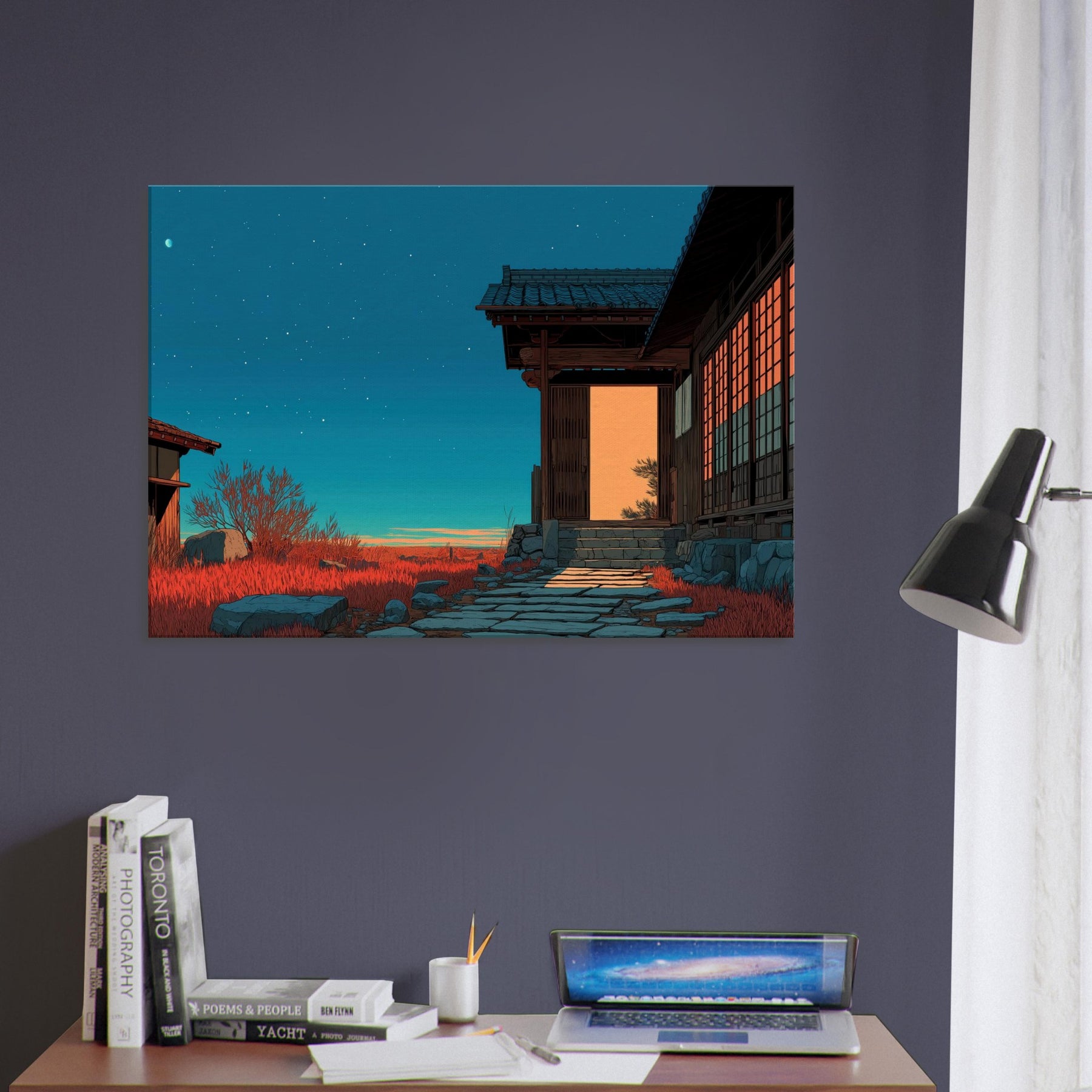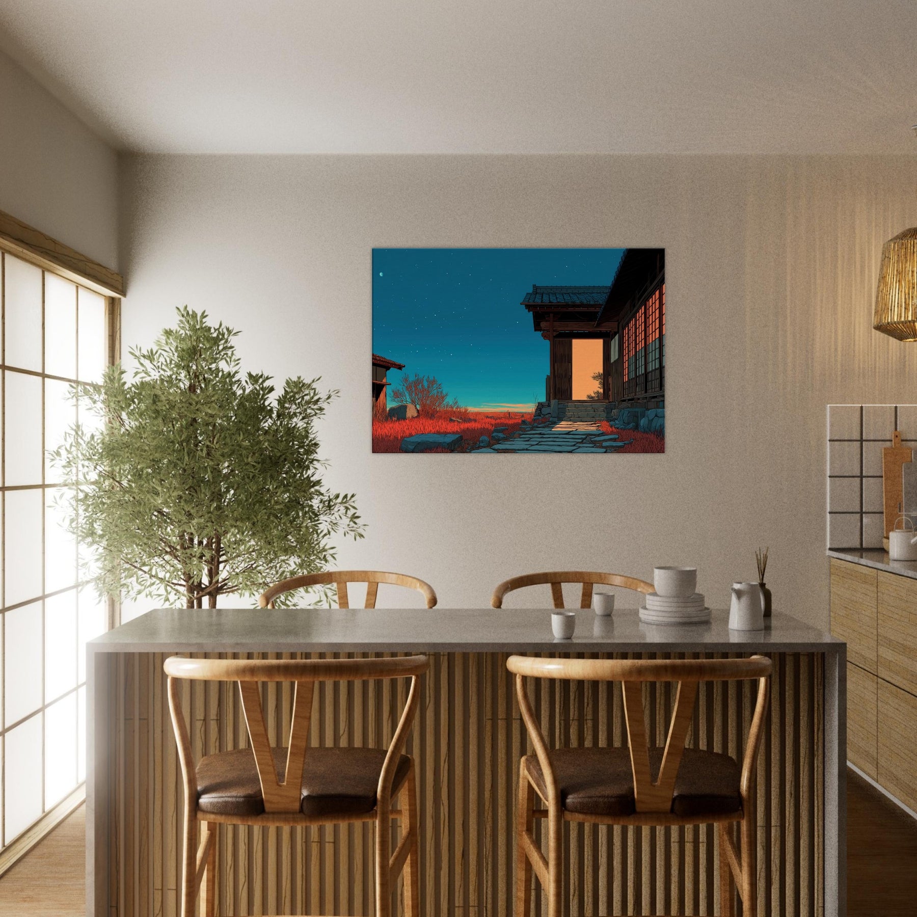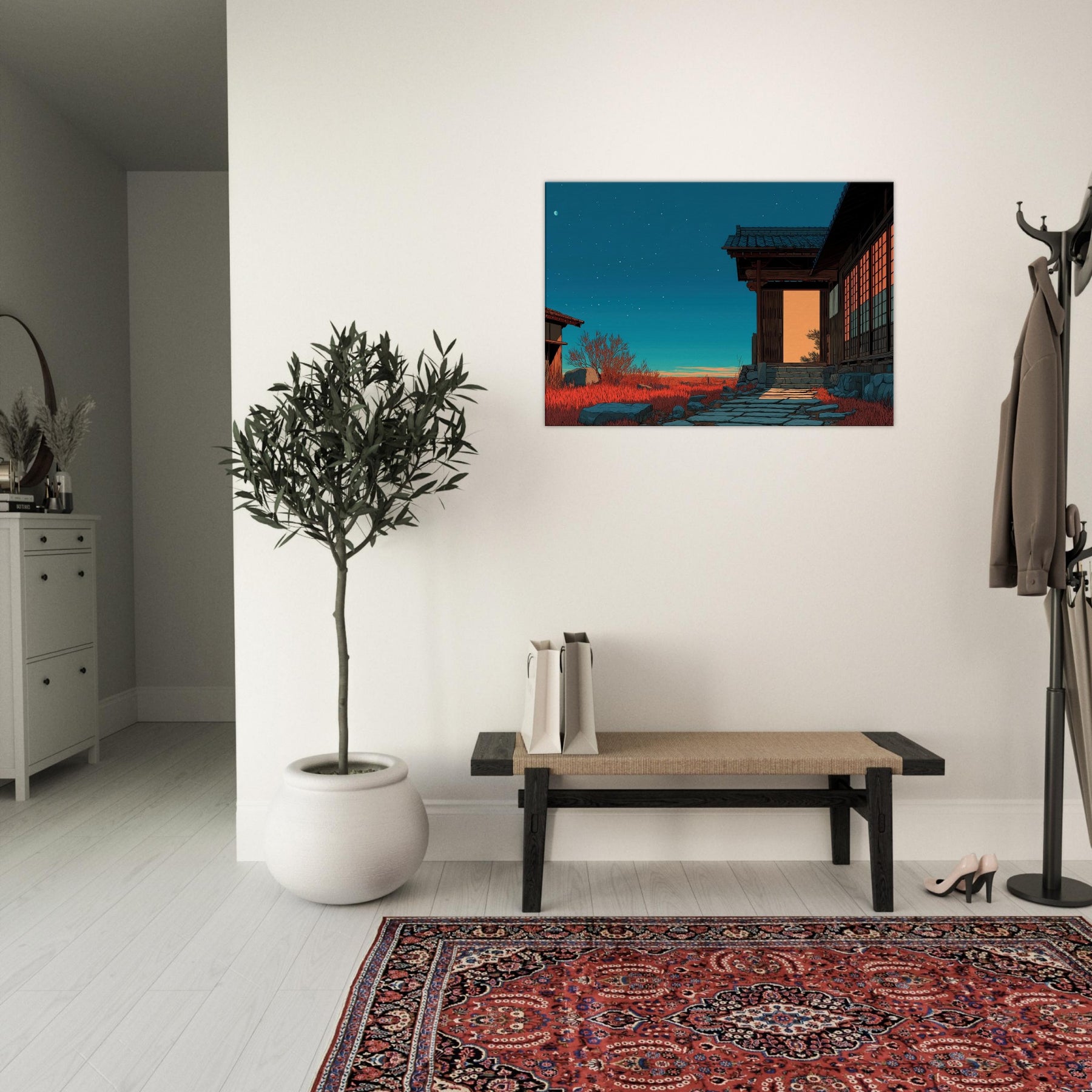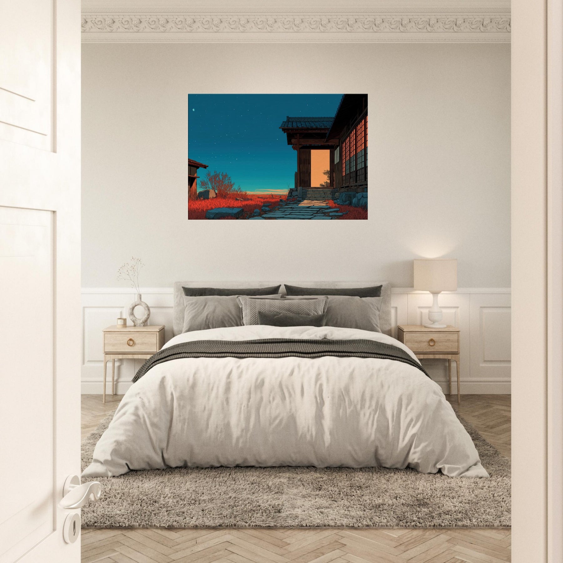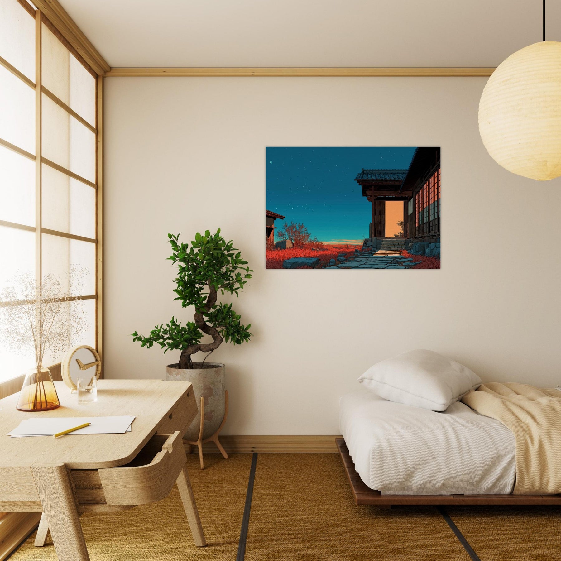Step into a quiet, dream washed street where Japanese Houses unfold like a memory in motion. This surreal composition drifts across a twilight , where the warm doorway glows as if inviting the viewer to step inside and listen to the wind through wooden lattices. The vibrant red grasses and starlit sky create a tranquil tension that lingers in a living room, lifting conversations and quiet evenings with a sense of otherworldly intimacy. A doorway to memory, a horizon of calm.