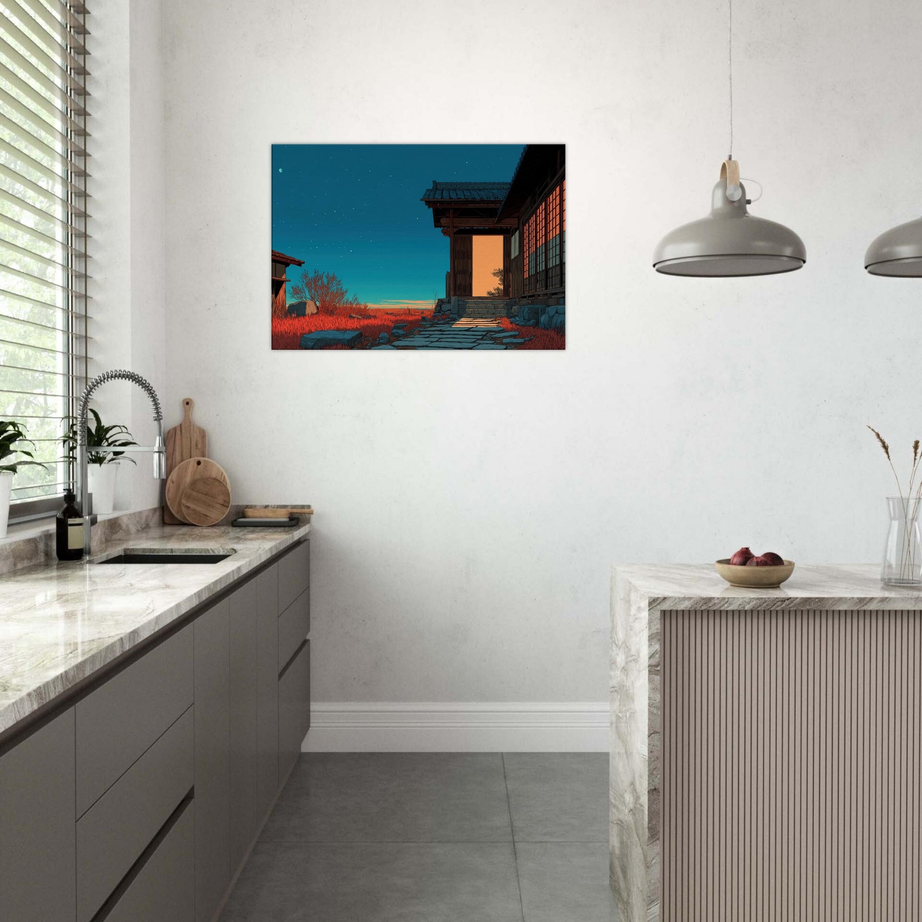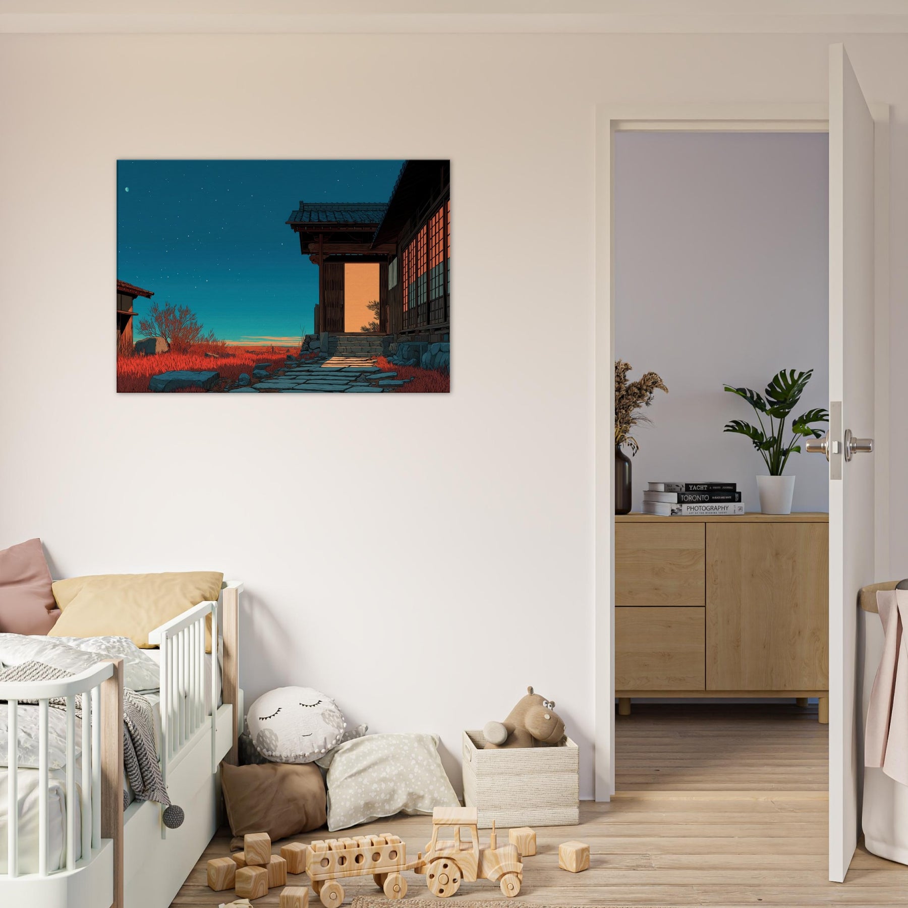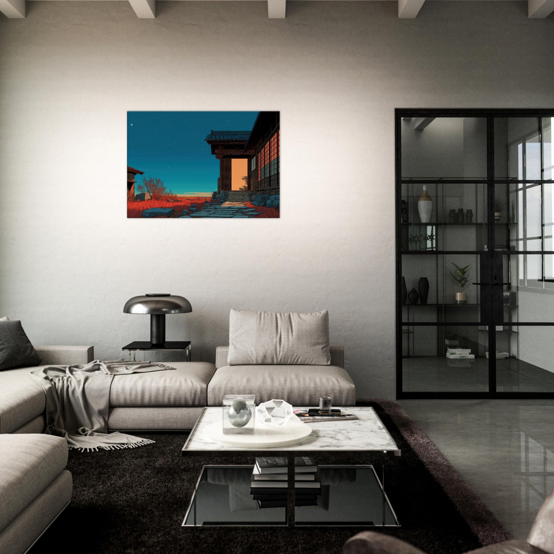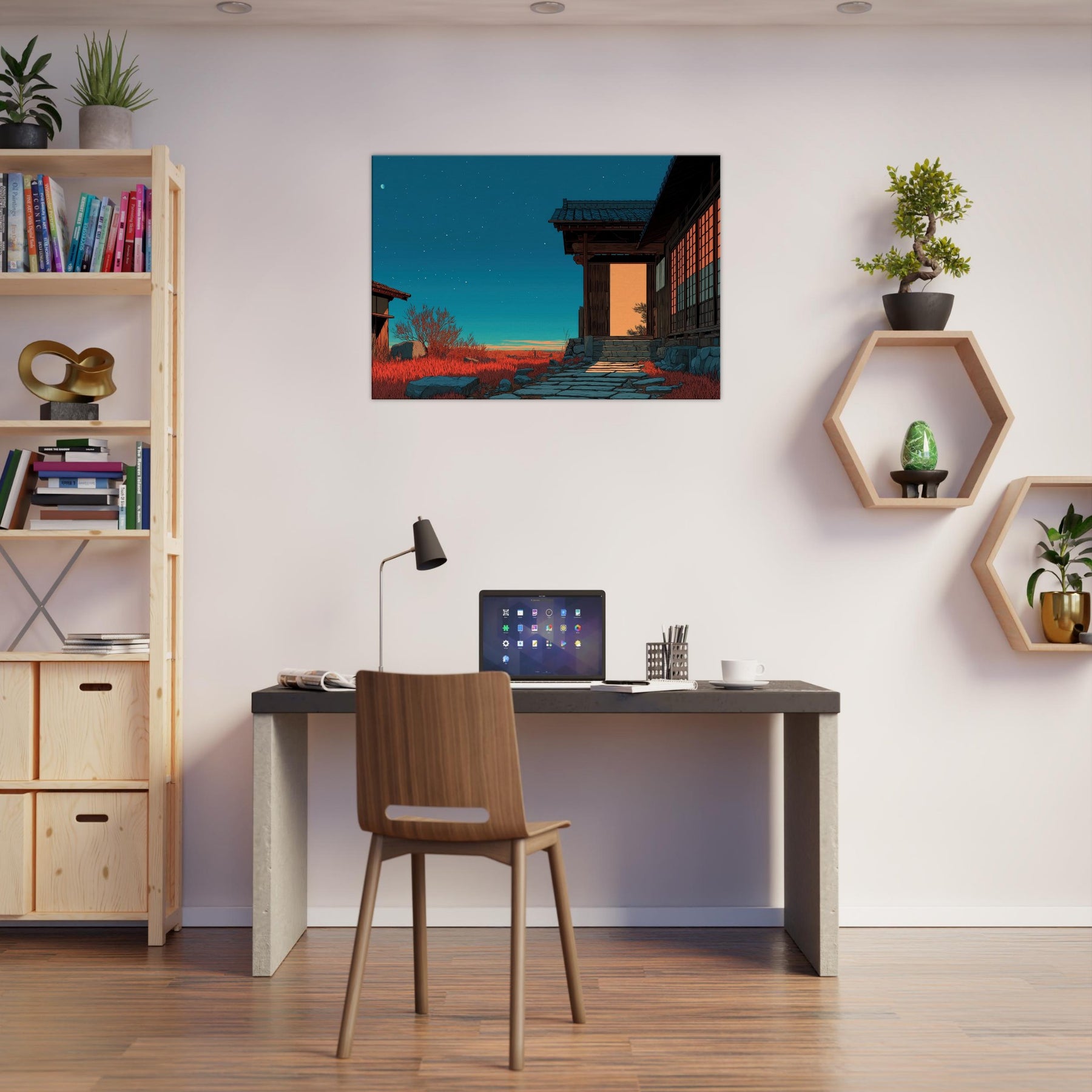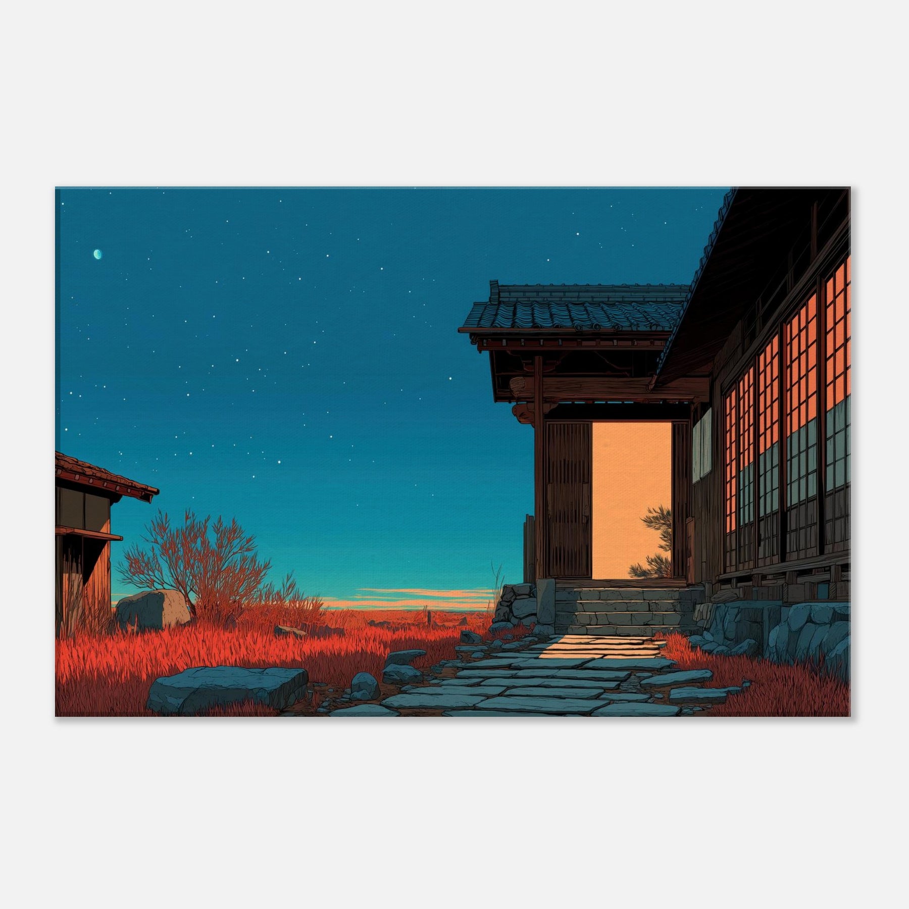 Step into a quiet, dream washed street where Japanese Houses unfold like a memory in motion. This surreal composition drifts across a twilight , where the warm doorway glows as if inviting the viewer to step inside and listen to the wind through wooden lattices. The vibrant red grasses and starlit sky create a tranquil tension that lingers in a living room, lifting conversations and quiet evenings with a sense of otherworldly intimacy. A doorway to memory, a horizon of calm.
