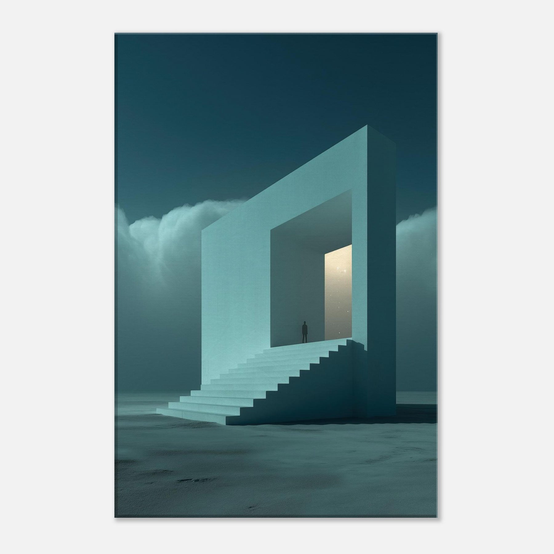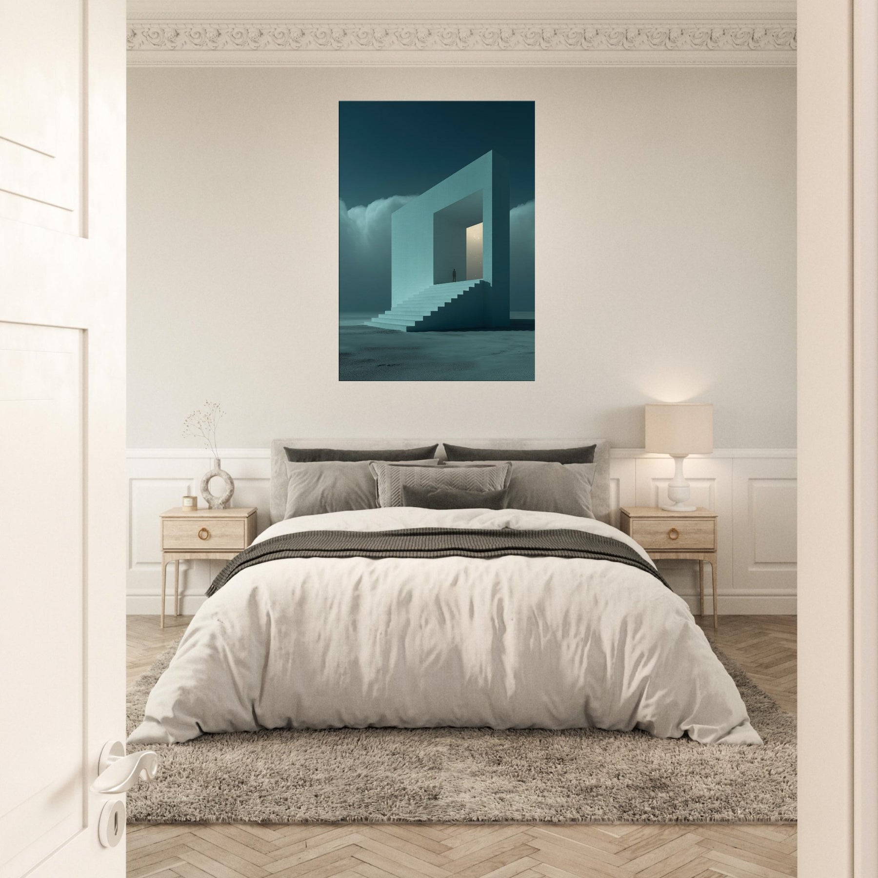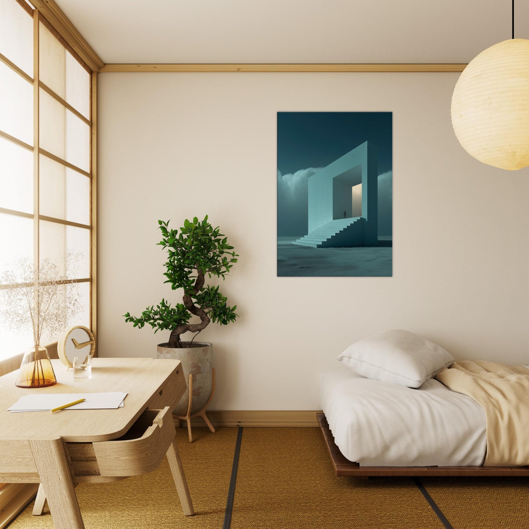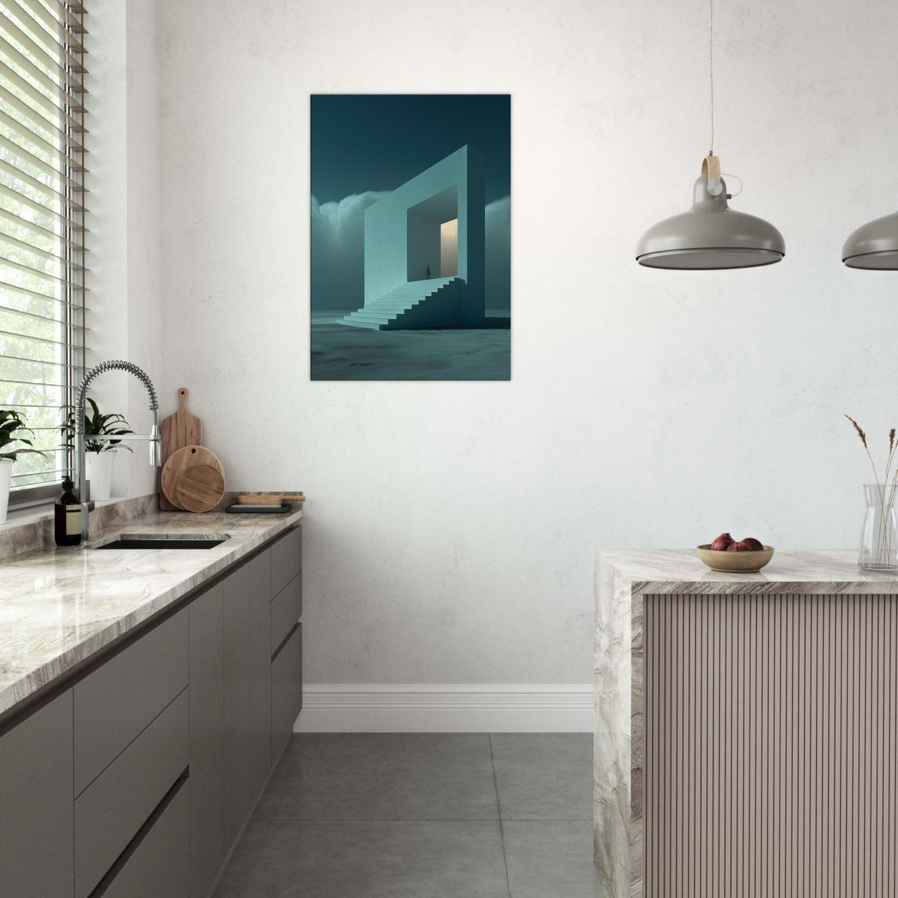 Staircase Switchback suspends you between dream and city, where a monumental frame opens to a distant glow. The composition blends architecture with a surreal hush, inviting quiet exploration as a lone figure steps into the warm light. Its clean geometry and cool palette give a sense of infinity, turning walls into windows and rooms into landscapes. This piece anchors a living space with atmosphere, elevating everyday moments into a curated, contemplative sanctuary.
