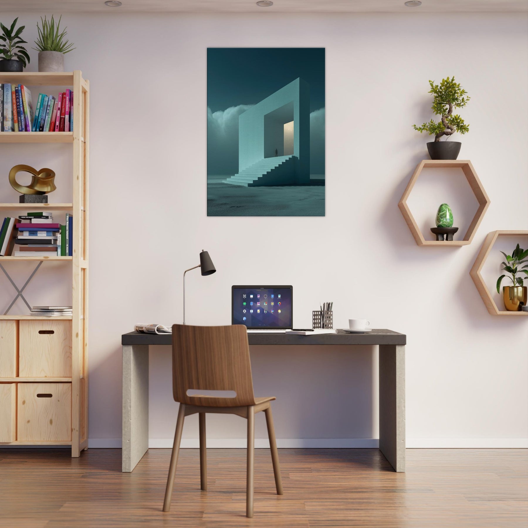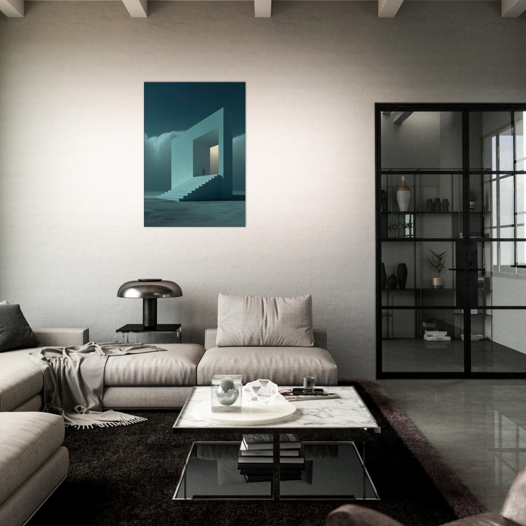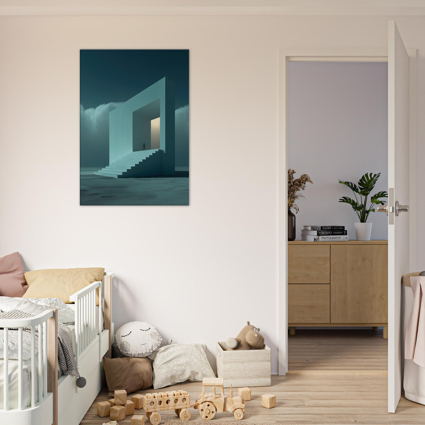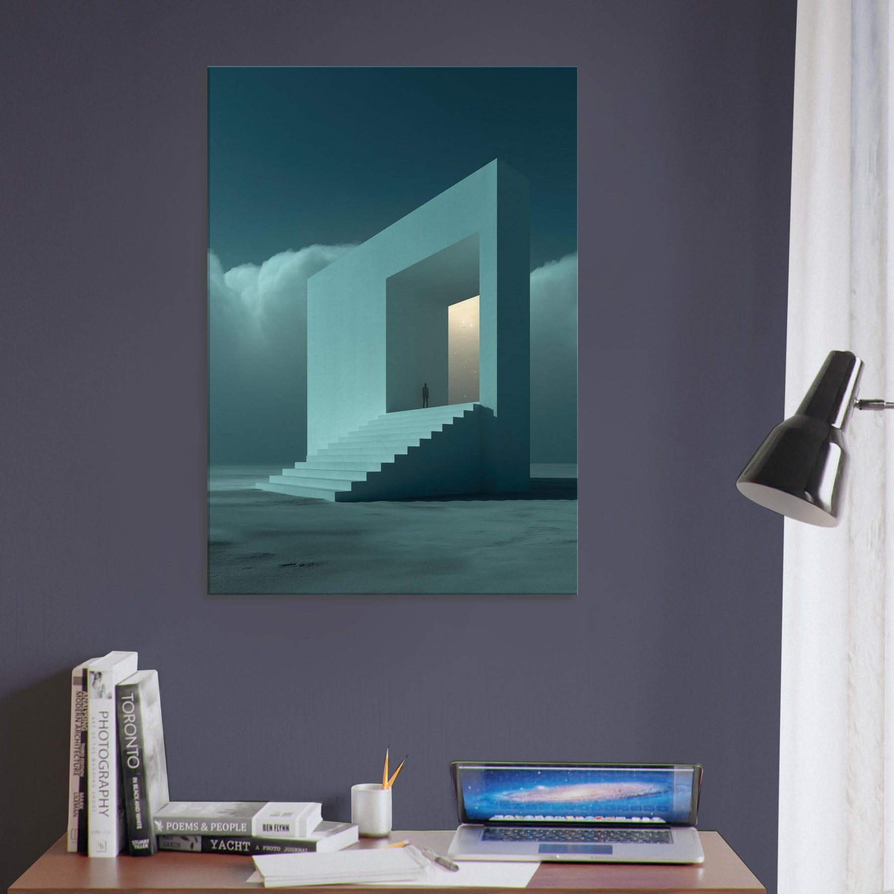 Staircase Switchback suspends you between dream and city, where a monumental frame opens to a distant glow. The composition blends architecture with a surreal hush, inviting quiet exploration as a lone figure steps into the warm light. Its clean geometry and cool palette give a sense of infinity, turning walls into windows and rooms into landscapes. This piece anchors a living space with atmosphere, elevating everyday moments into a curated, contemplative sanctuary.