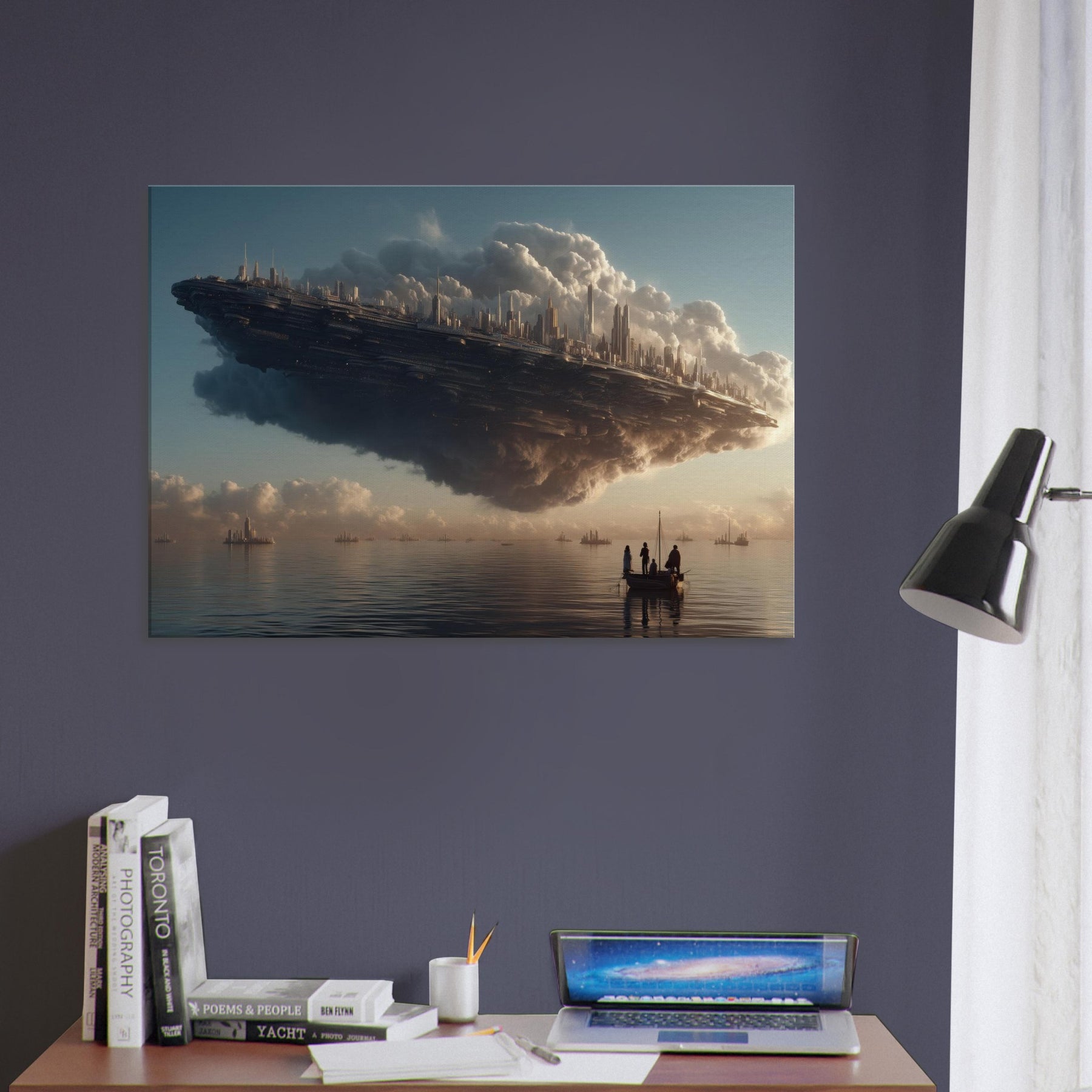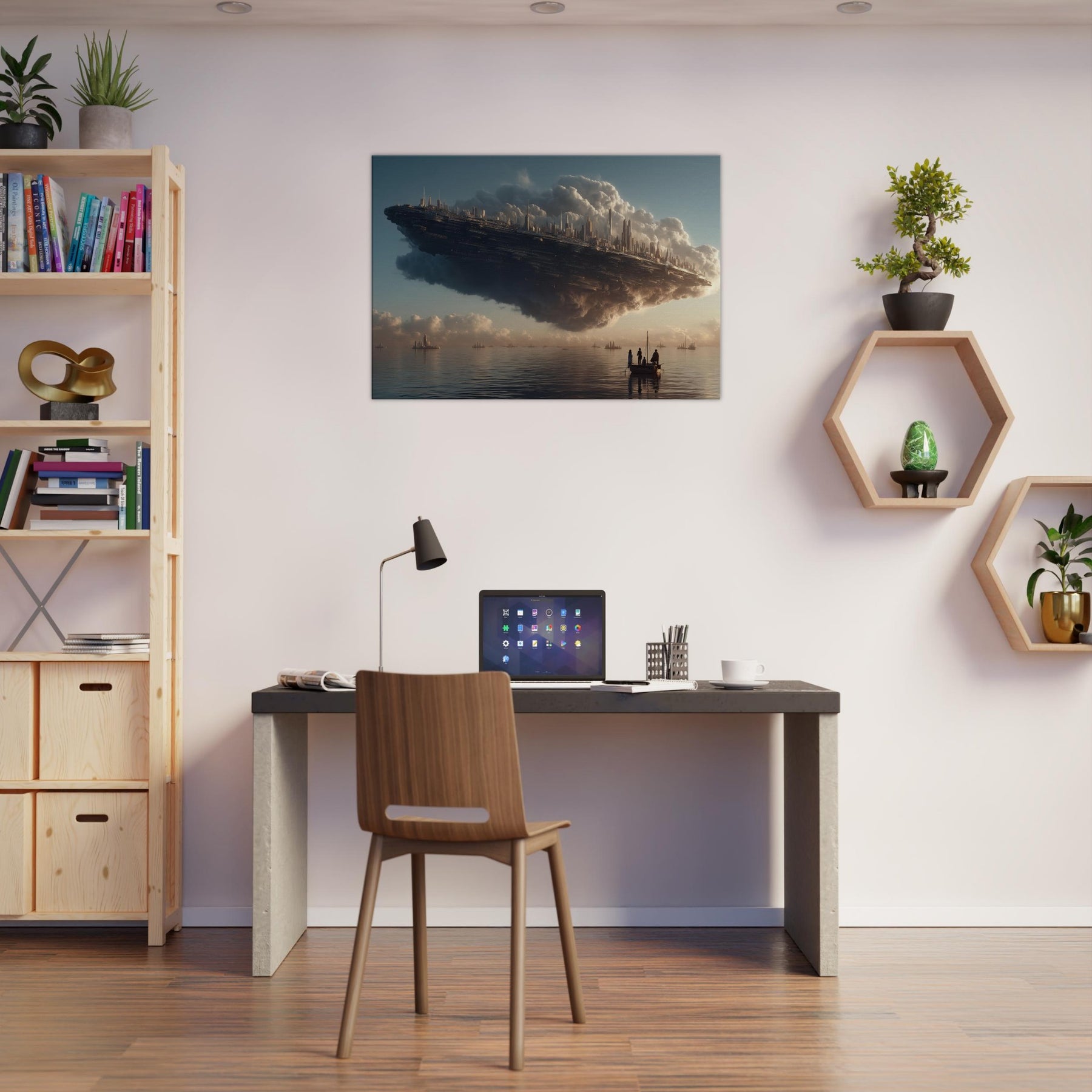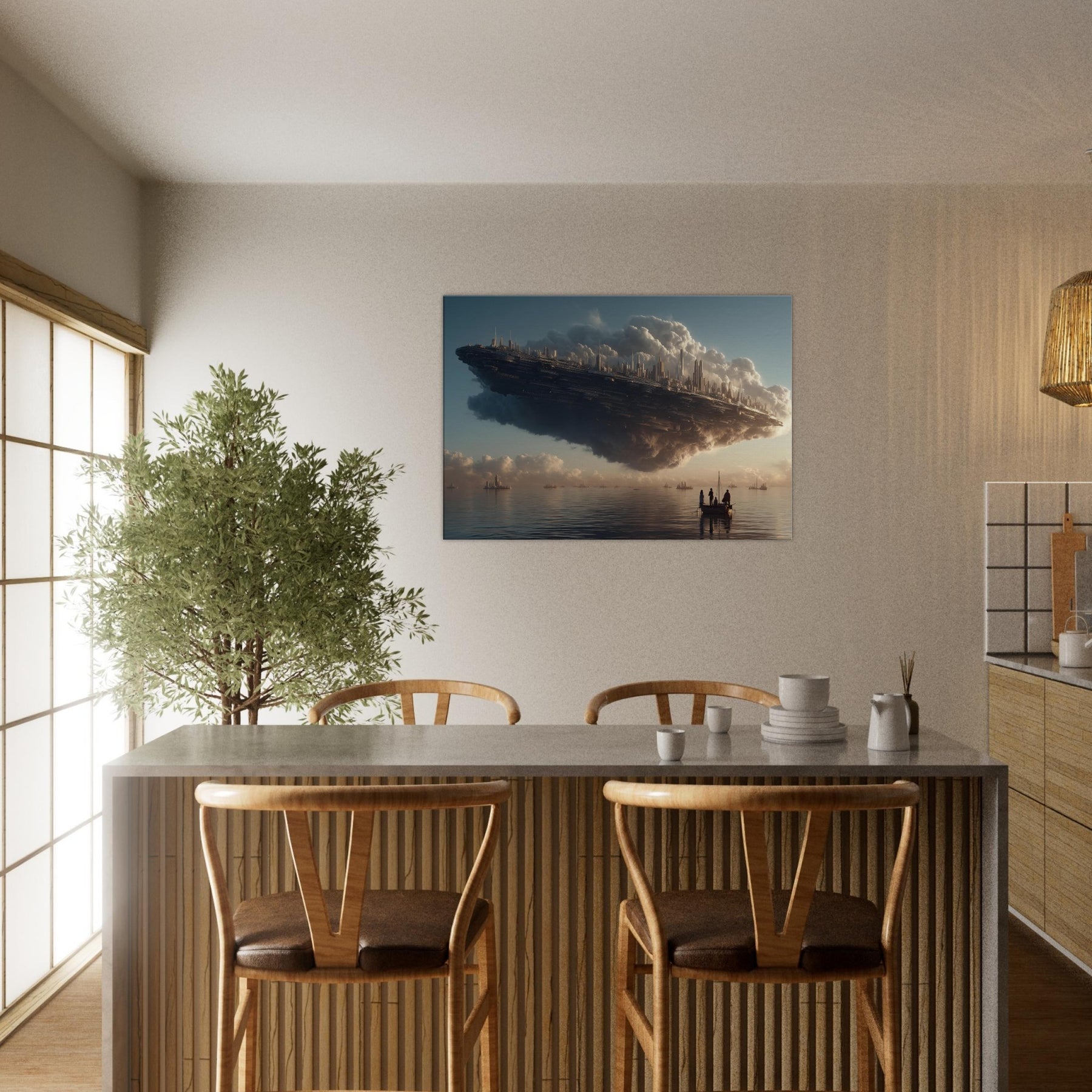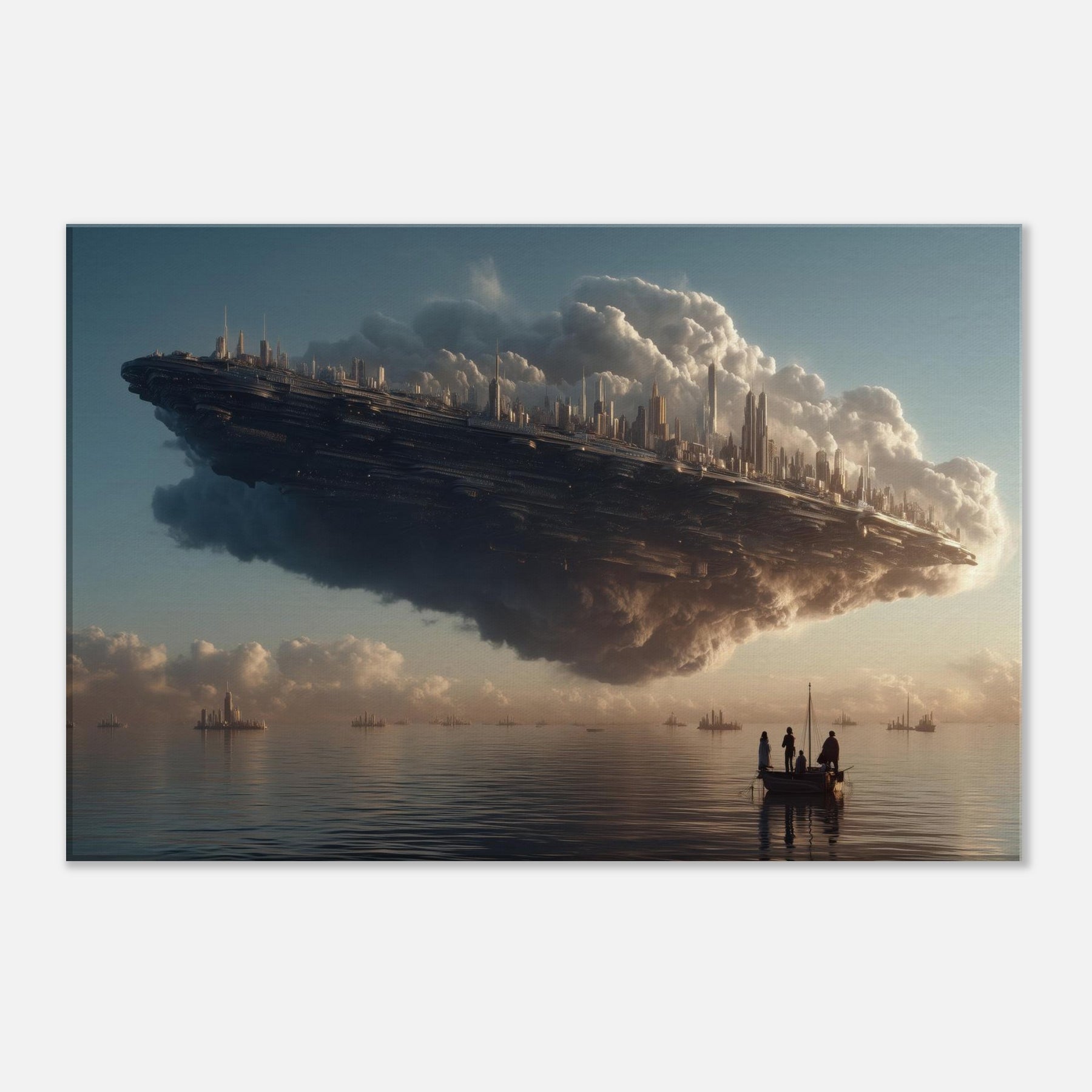 Let the Floating City in the Sky hover into your living room, a dreamlike harbor where alabaster clouds cradle a gleaming metropolis. This surreal vision breathes a quiet grandeur into any space, inviting slower breaths and longer glances. The soft, glowing silhouettes pair with warm light to cast contemplative shadows across walls and furniture. Hang it above a sofa or desk to awaken imagination, spark conversation, and turn everyday evenings into a voyage between myth and memory.
