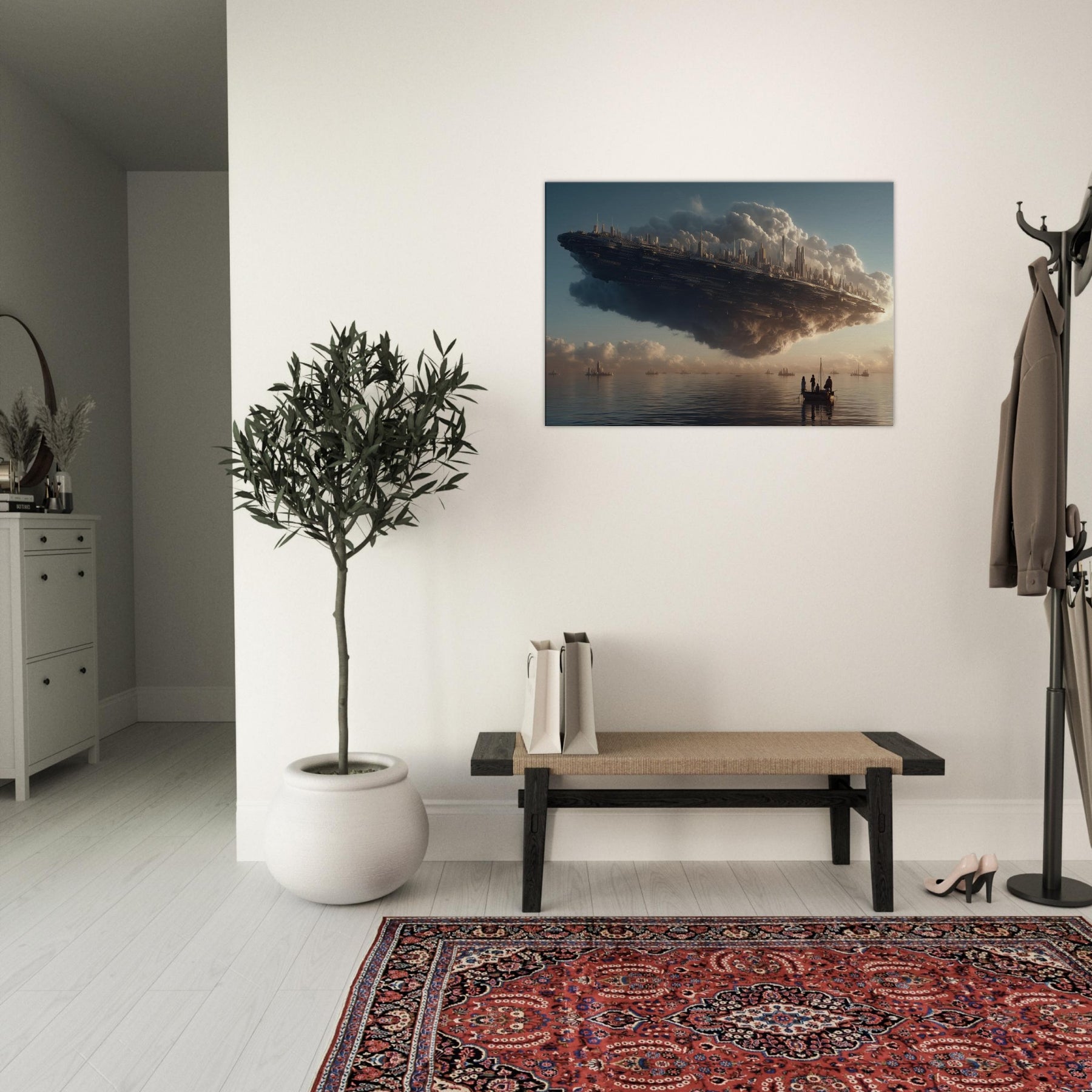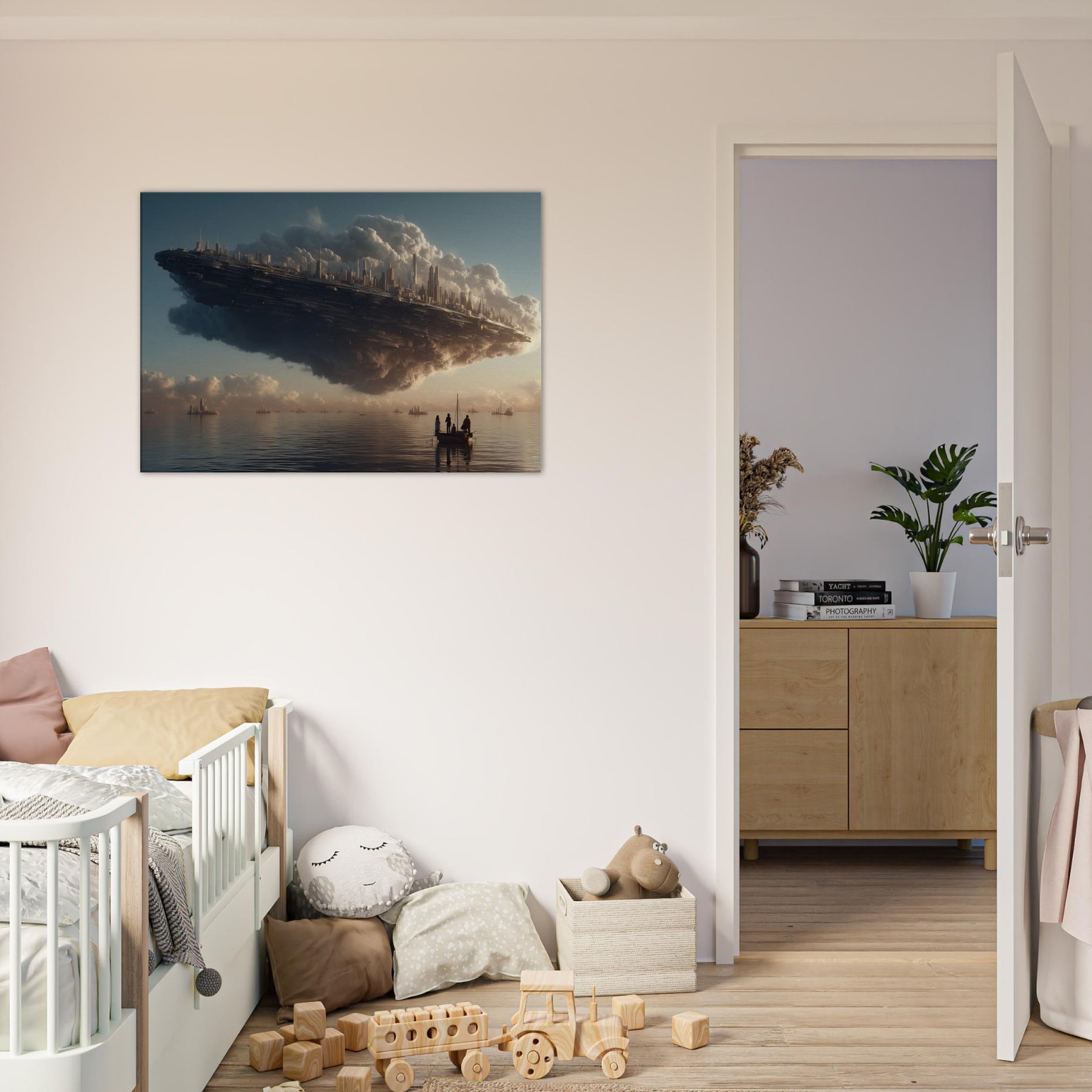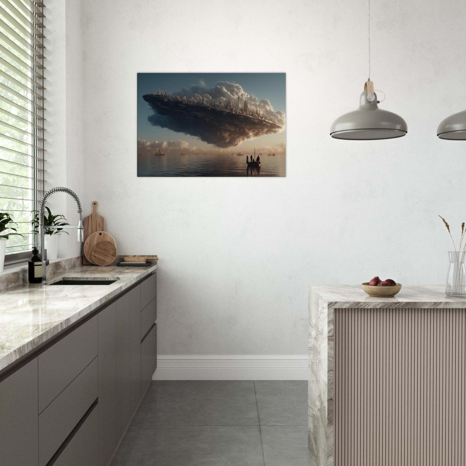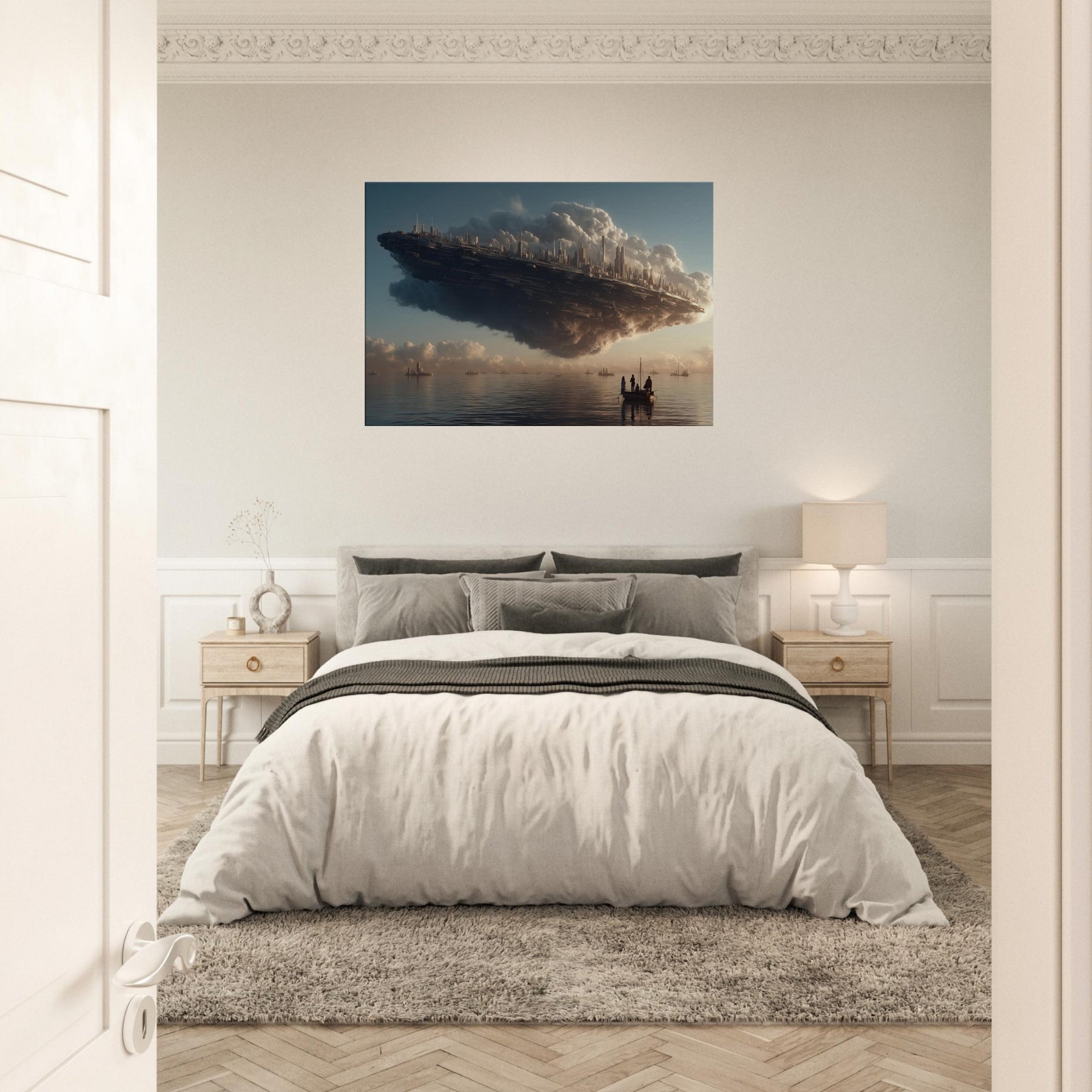Let the Floating City in the Sky hover into your living room, a dreamlike harbor where alabaster clouds cradle a gleaming metropolis. This surreal vision breathes a quiet grandeur into any space, inviting slower breaths and longer glances. The soft, glowing silhouettes pair with warm light to cast contemplative shadows across walls and furniture. Hang it above a sofa or desk to awaken imagination, spark conversation, and turn everyday evenings into a voyage between myth and memory.