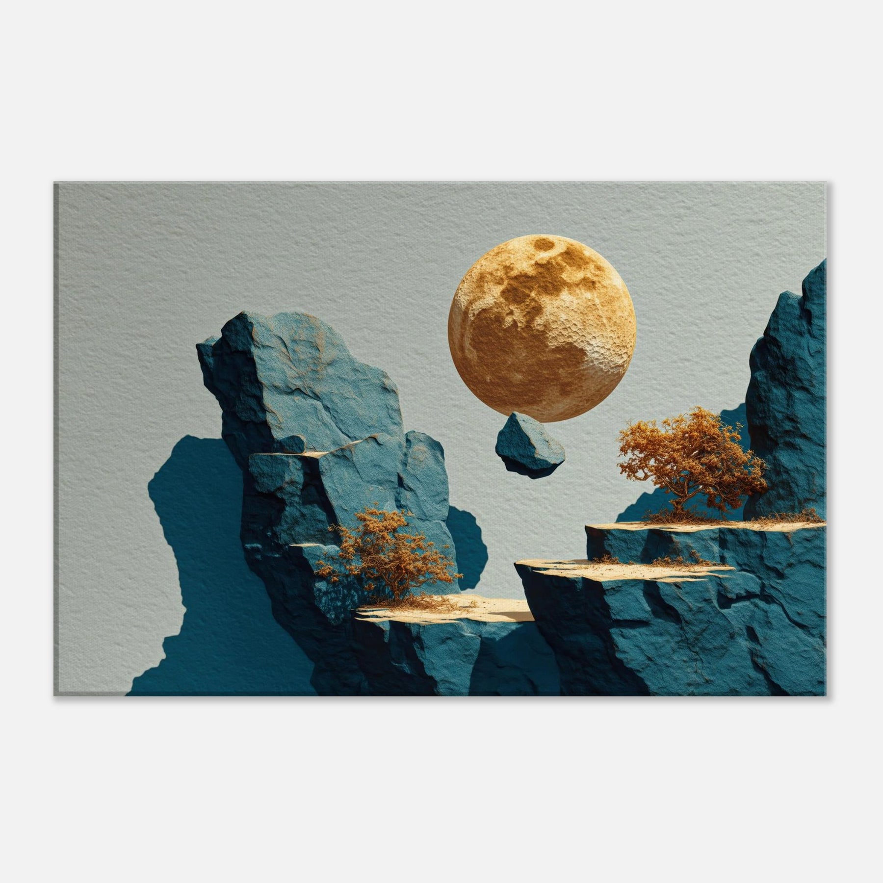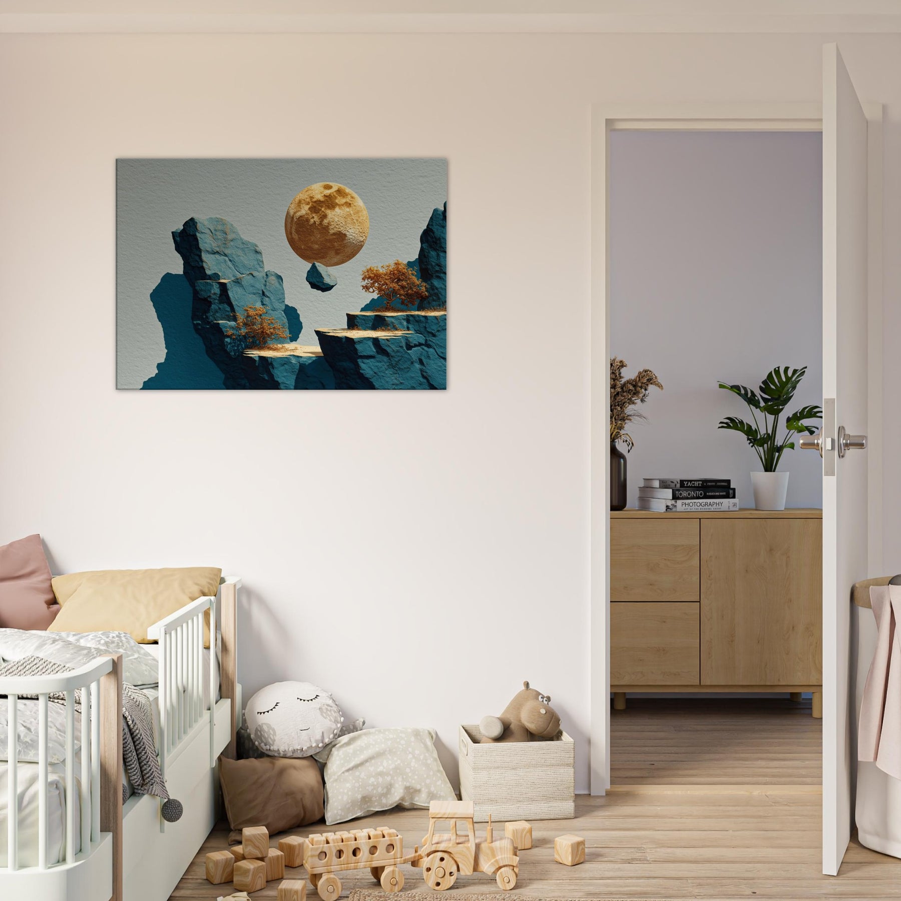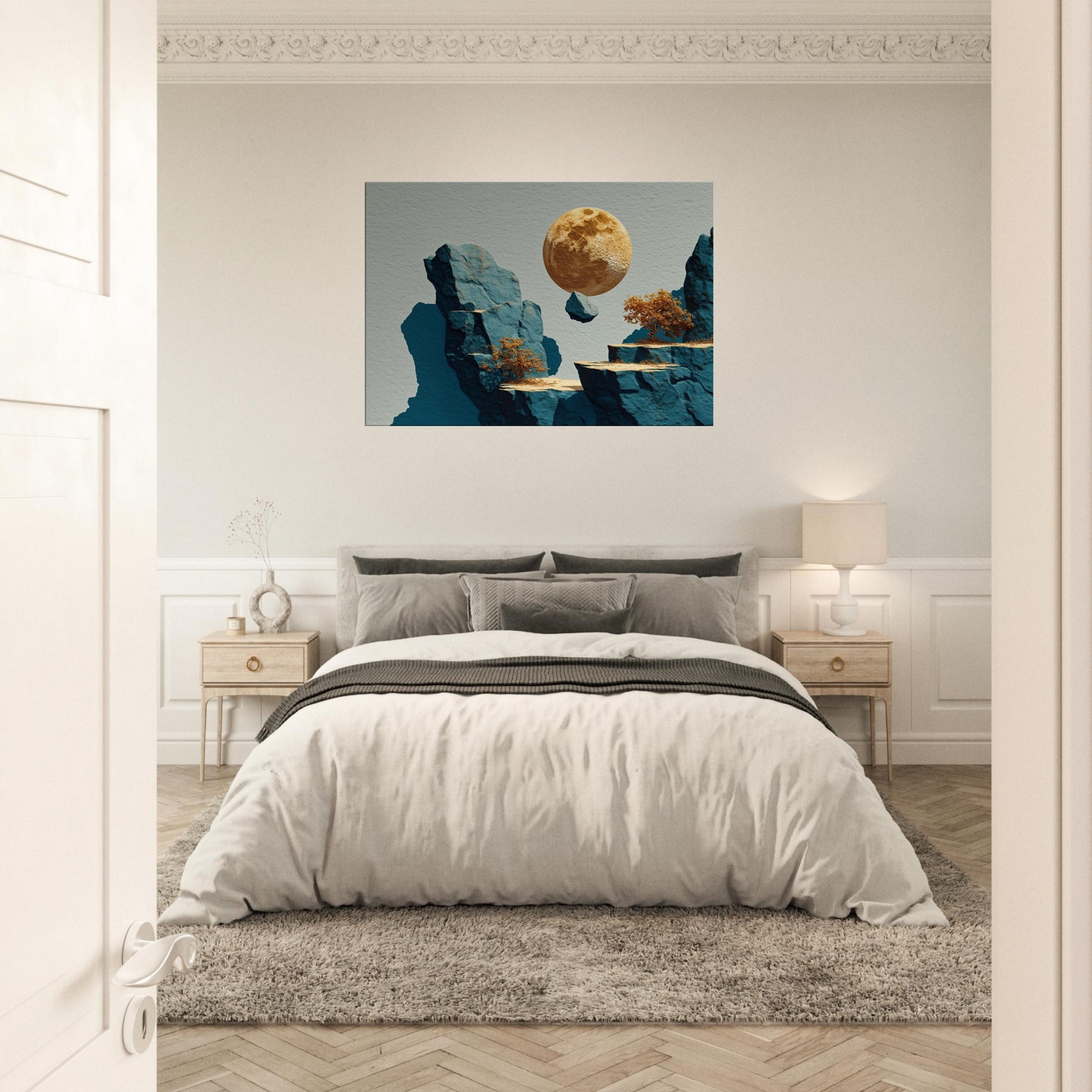 Step into a scene where the Cliffs rise like ancient sentinels beneath a honeyed celestial orb. The palette blends storm blue rock with warm ochre light, inviting a quiet breath into any room. A floating stone and sparse trees carve a that feels both distant and intimate, turning your living space into a horizon you can walk through. Hang this piece where daylight meets dusk, and let the mood shimmer between memory and dream as you pause, study, and imagine.