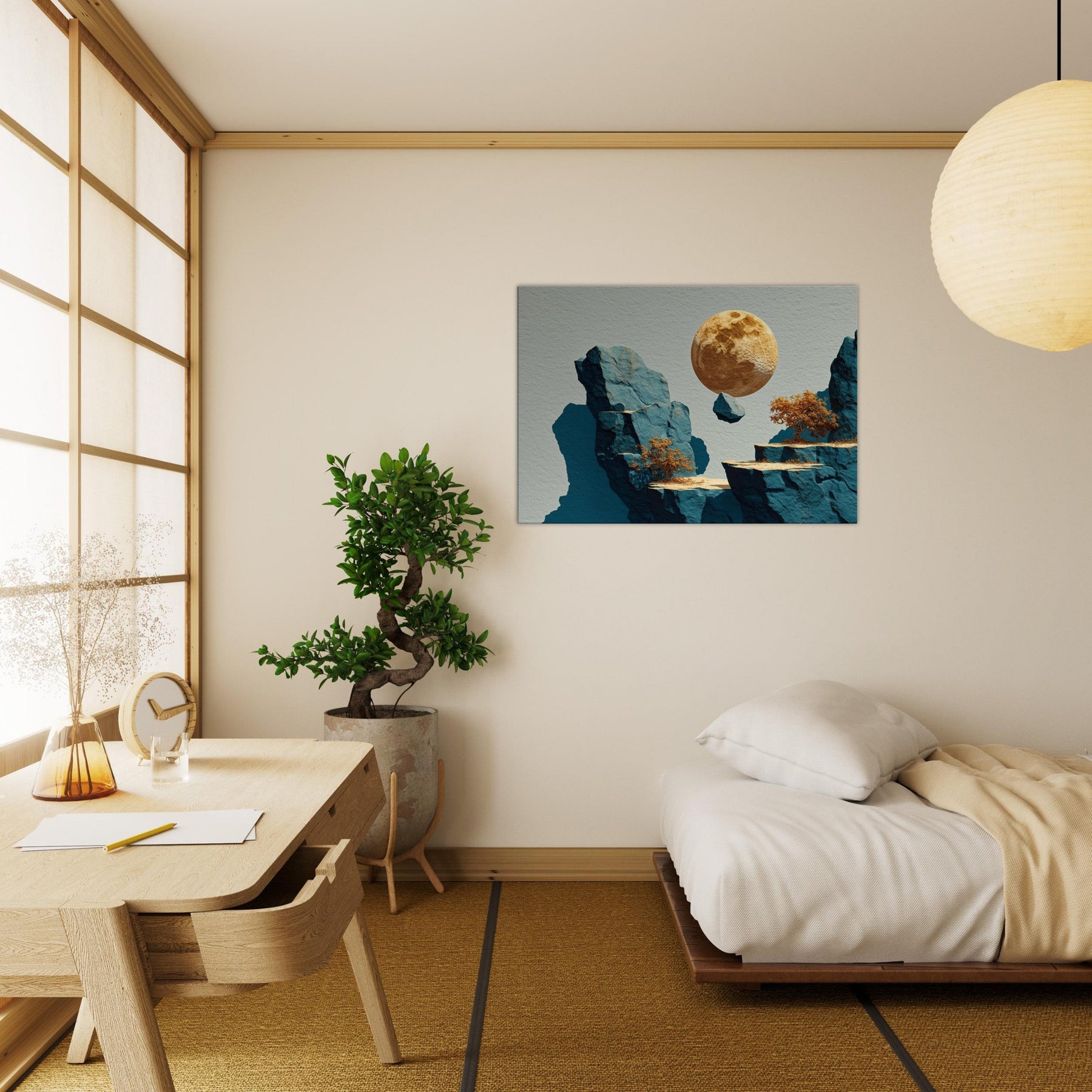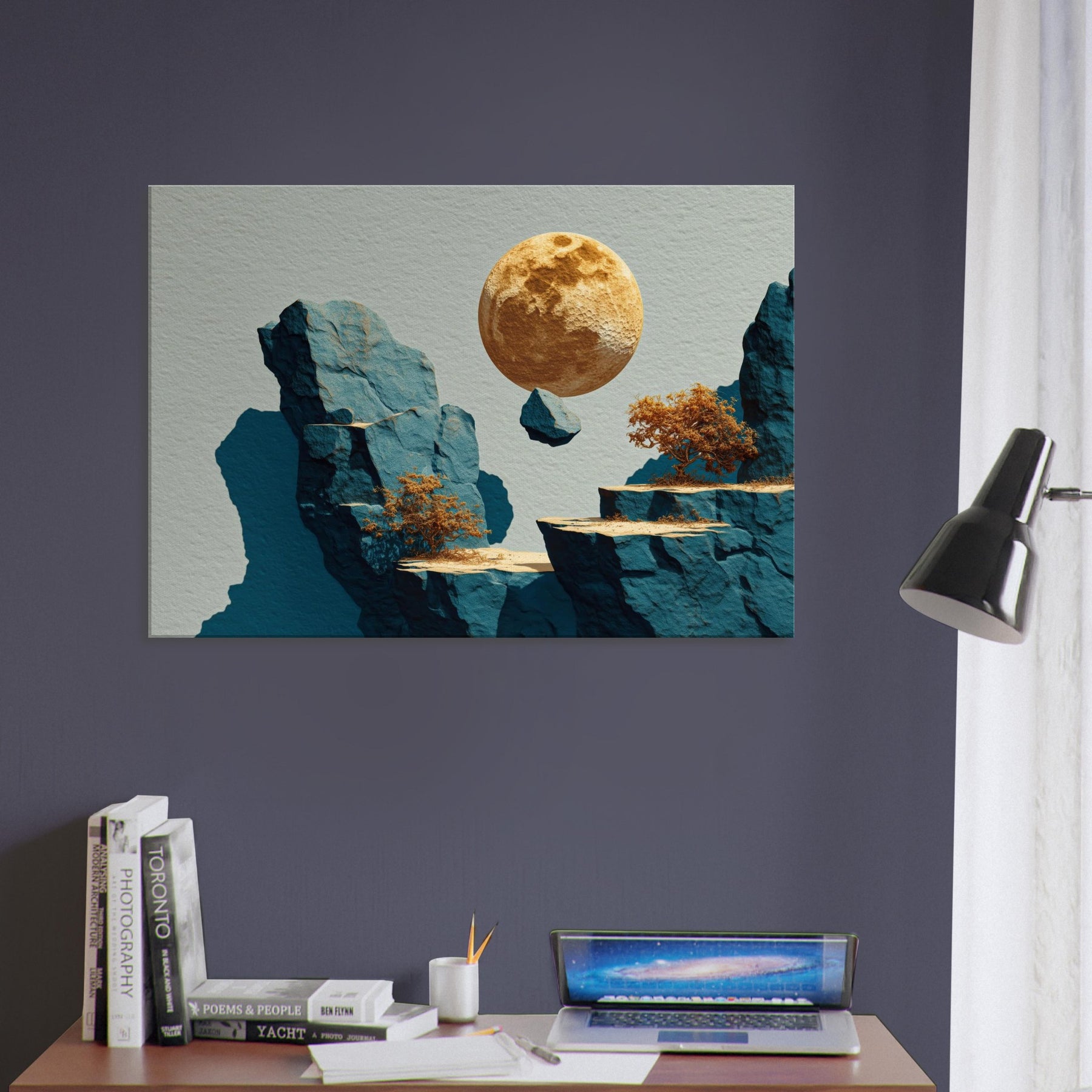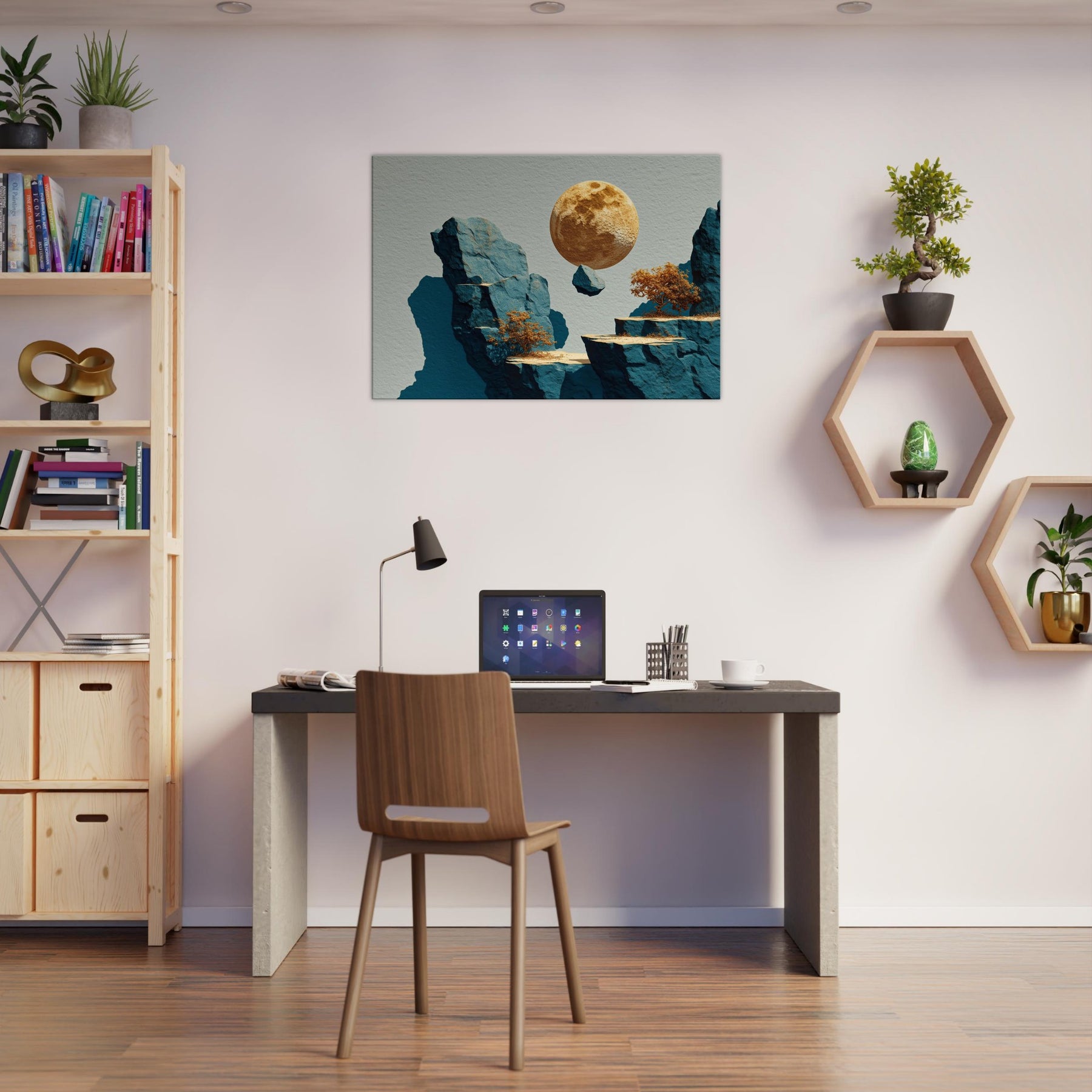 Step into a scene where the Cliffs rise like ancient sentinels beneath a honeyed celestial orb. The palette blends storm blue rock with warm ochre light, inviting a quiet breath into any room. A floating stone and sparse trees carve a that feels both distant and intimate, turning your living space into a horizon you can walk through. Hang this piece where daylight meets dusk, and let the mood shimmer between memory and dream as you pause, study, and imagine.