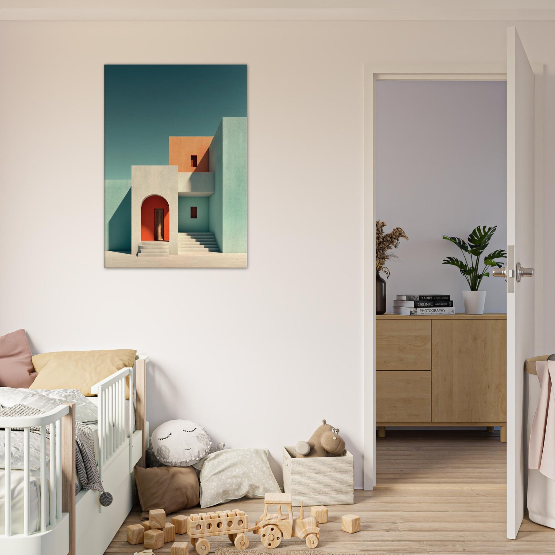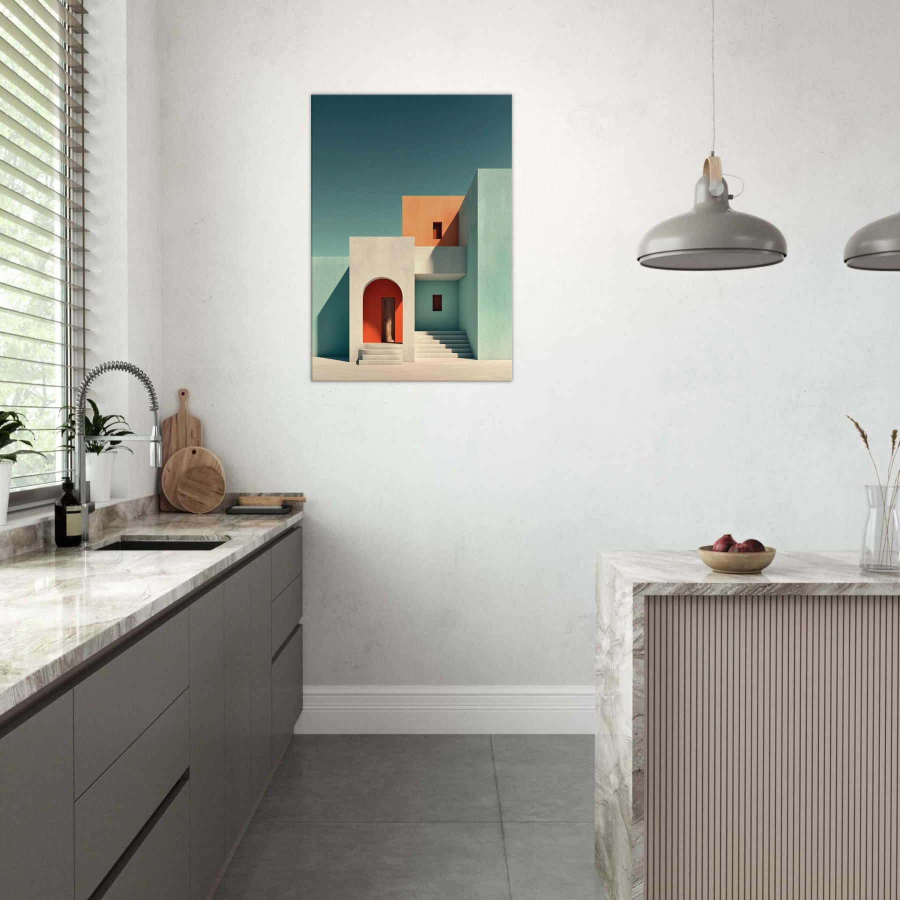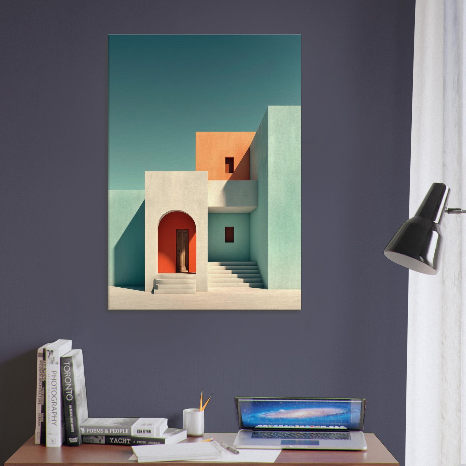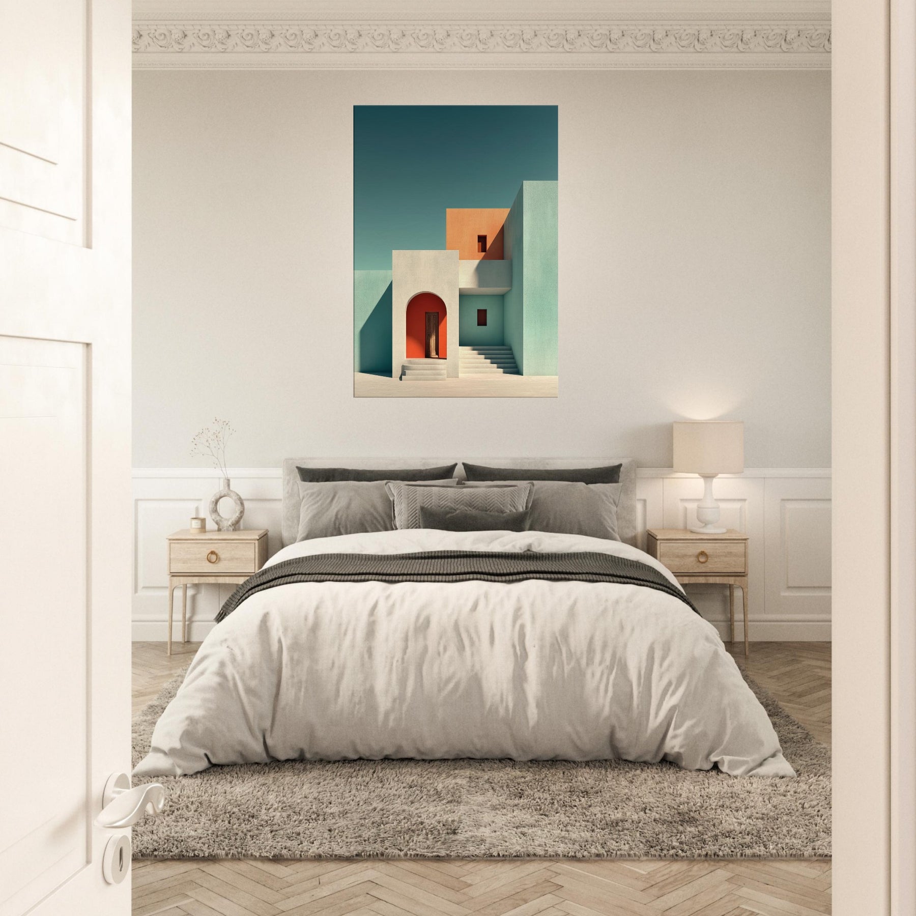 Santorini unfolds in a dreamlike architecture of pastel blocks and soft light, where staircases float and doorways prefer silence to speech. This surreal composition invites the eye to wander through sun warmed walls, a coral doorway, and cool turquoise shadows, evoking the sea kissed calm of an island afternoon. Printed as wall art, it lends a refined, cinematic atmosphere to any living space, turning a room into a tranquil horizon of color, texture, and memory.